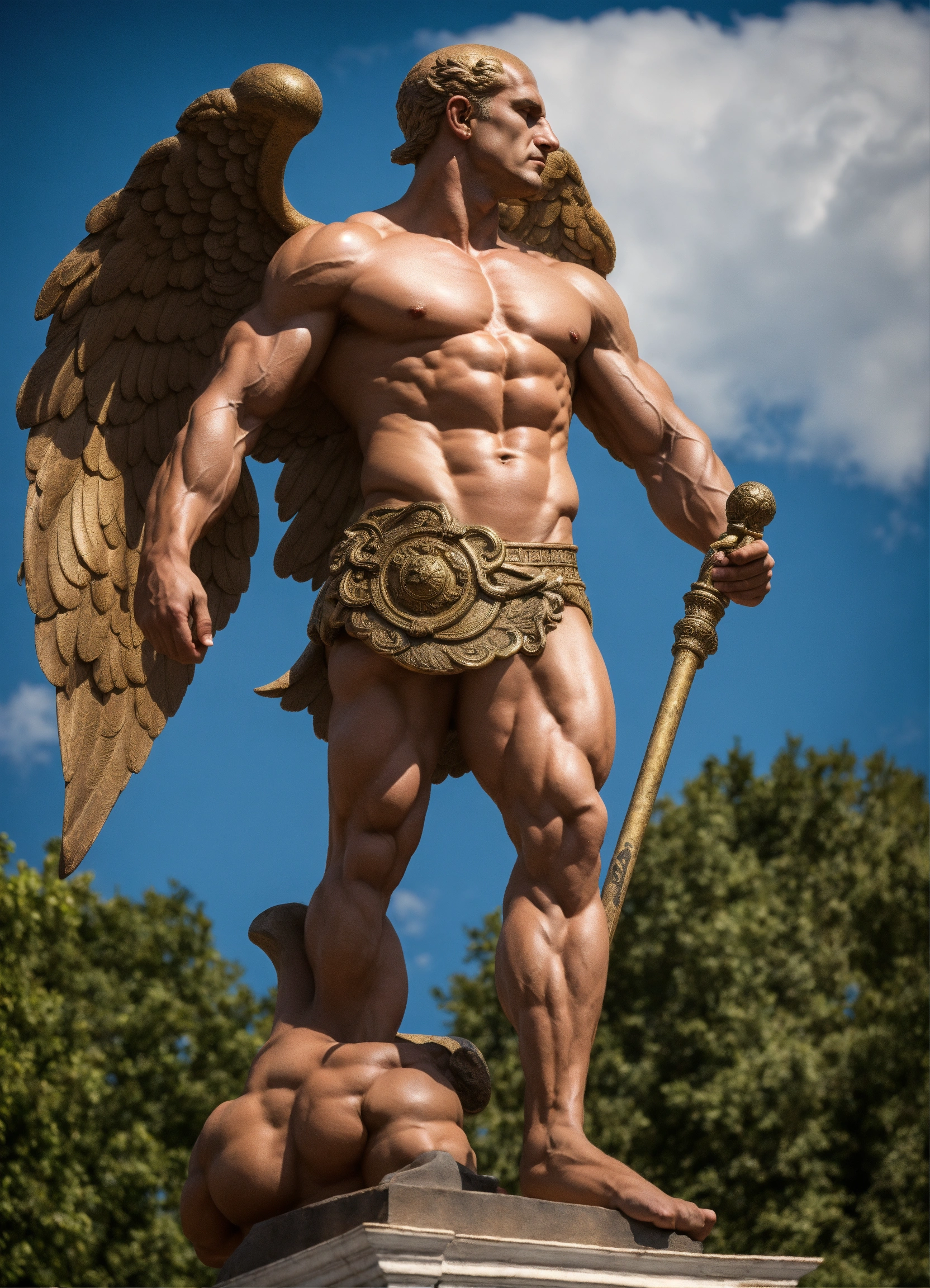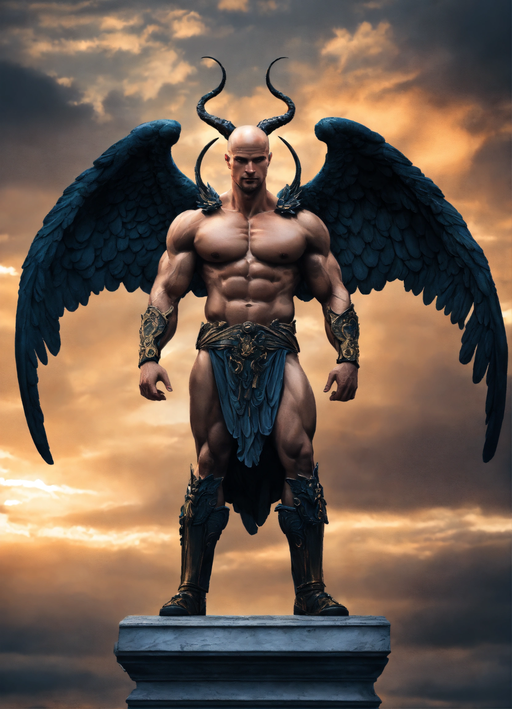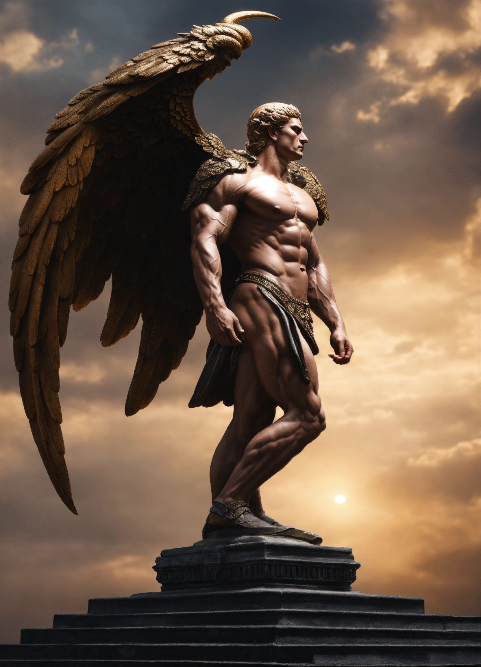 Yevgeny prigozhin as greek statue of demon with wings and very muscular body in profile, photorealistic
