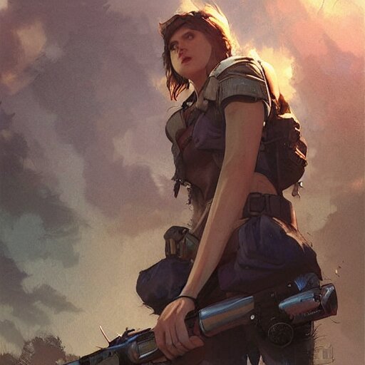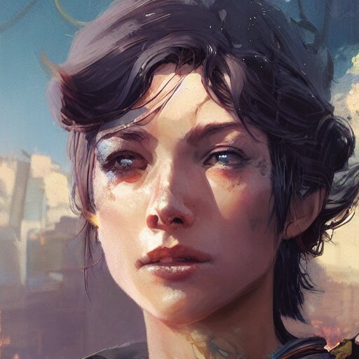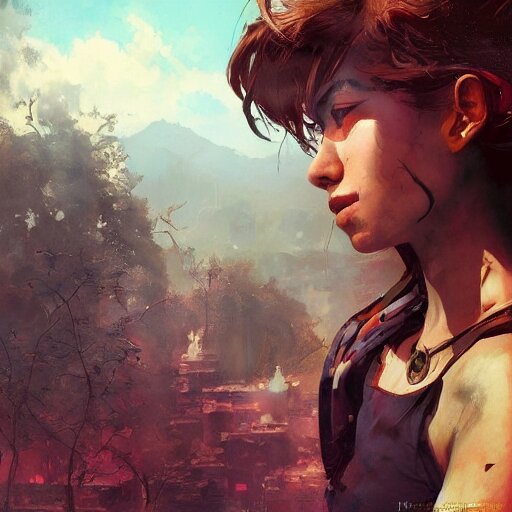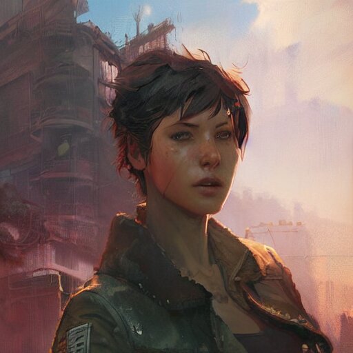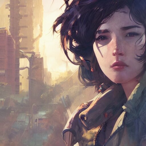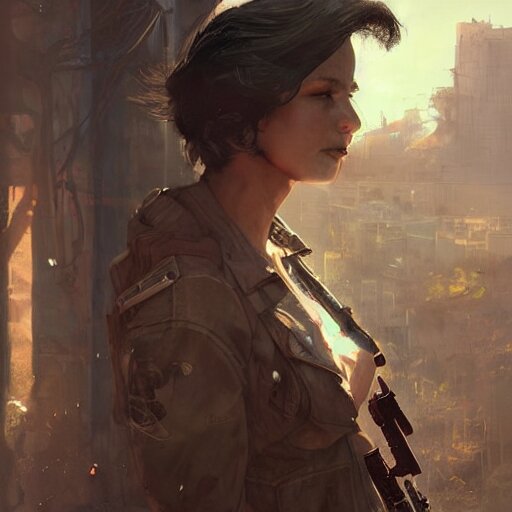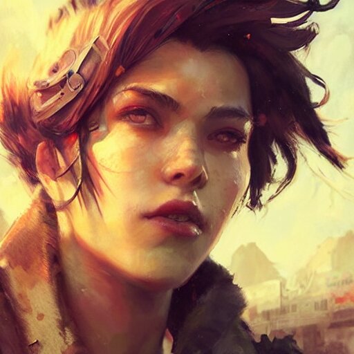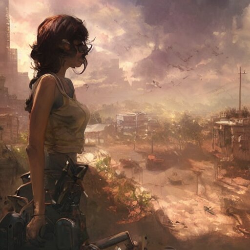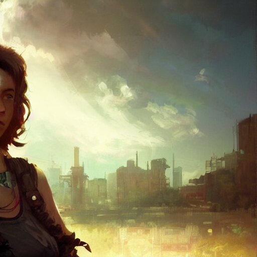 Fallout 5, charismatic beautiful rugged brunette female protagonist, portrait, outdoors tropical cityscape, atmospheric lighting, painted, intricate, volumetric lighting, beautiful, daytime, sunny weather, few clouds, sharp focus, deep colours, ultra detailed, art by krenz cushart and wenjun lin