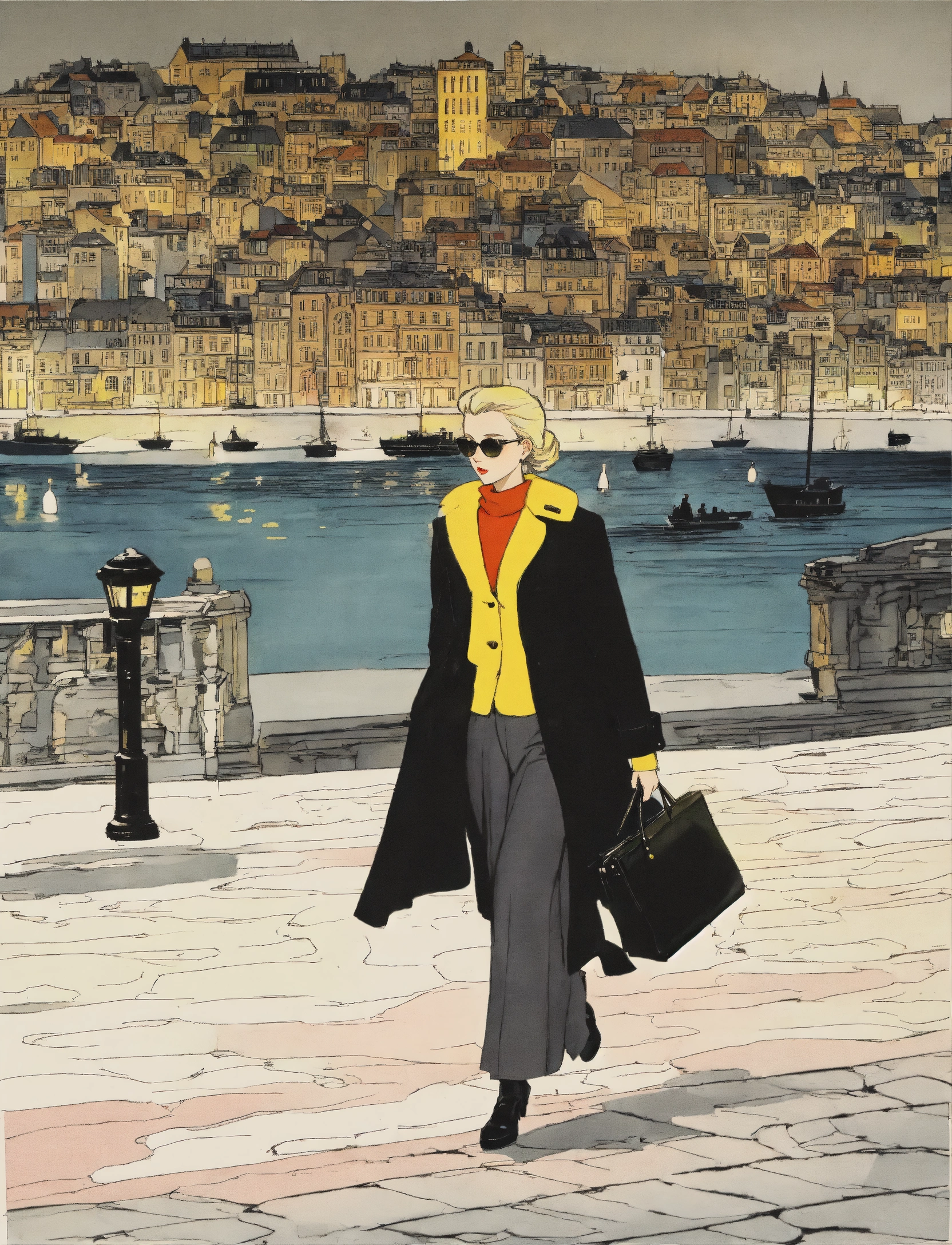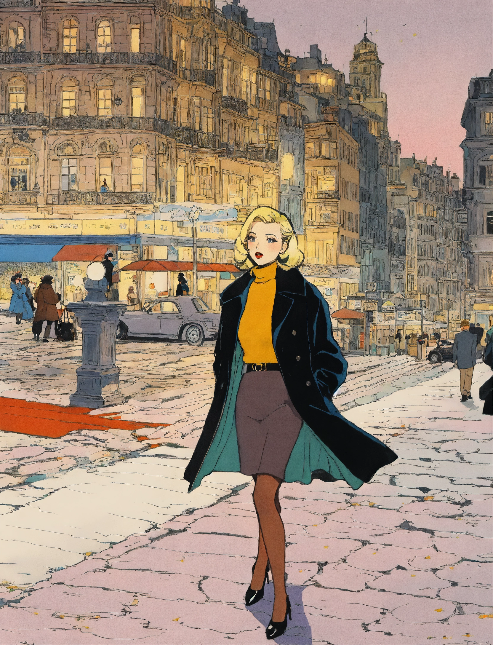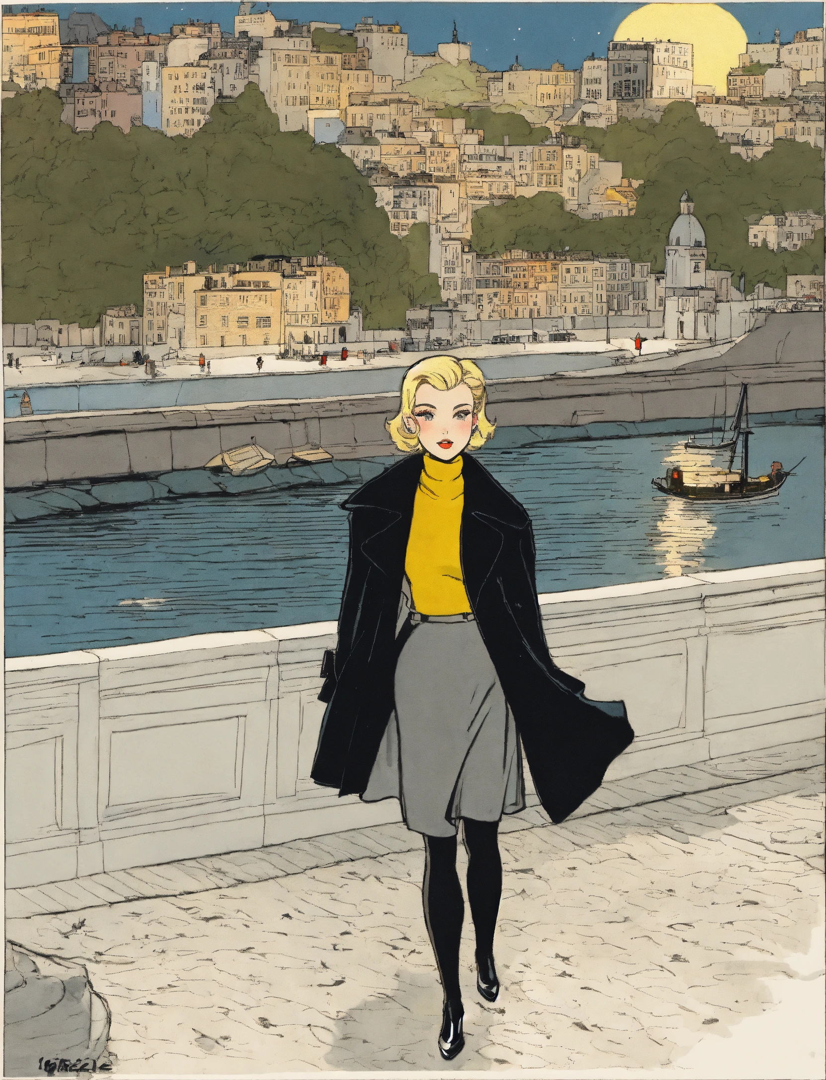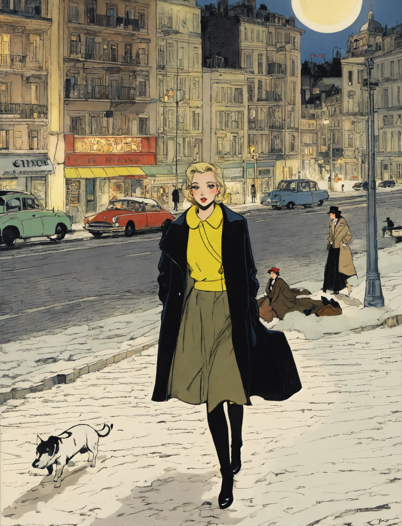 Illustration by herge of a city at night where grace kelly wears a black coat, city skyline, beautiful shading, black makeup, shiny glossy, dark night, (by herge1.2)