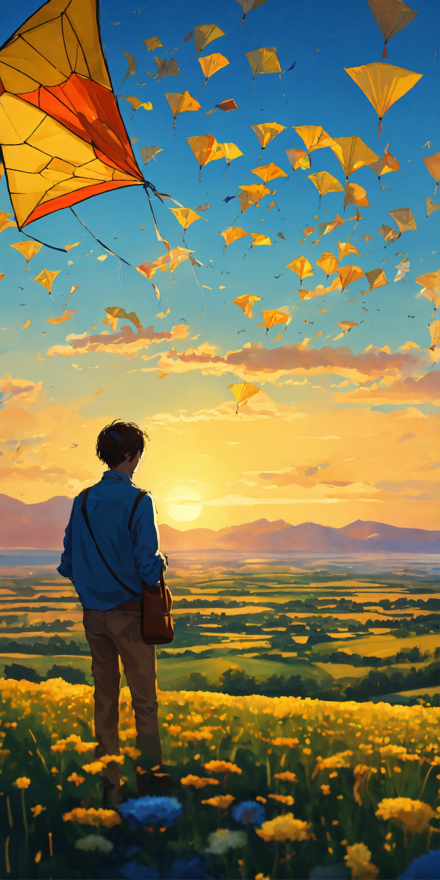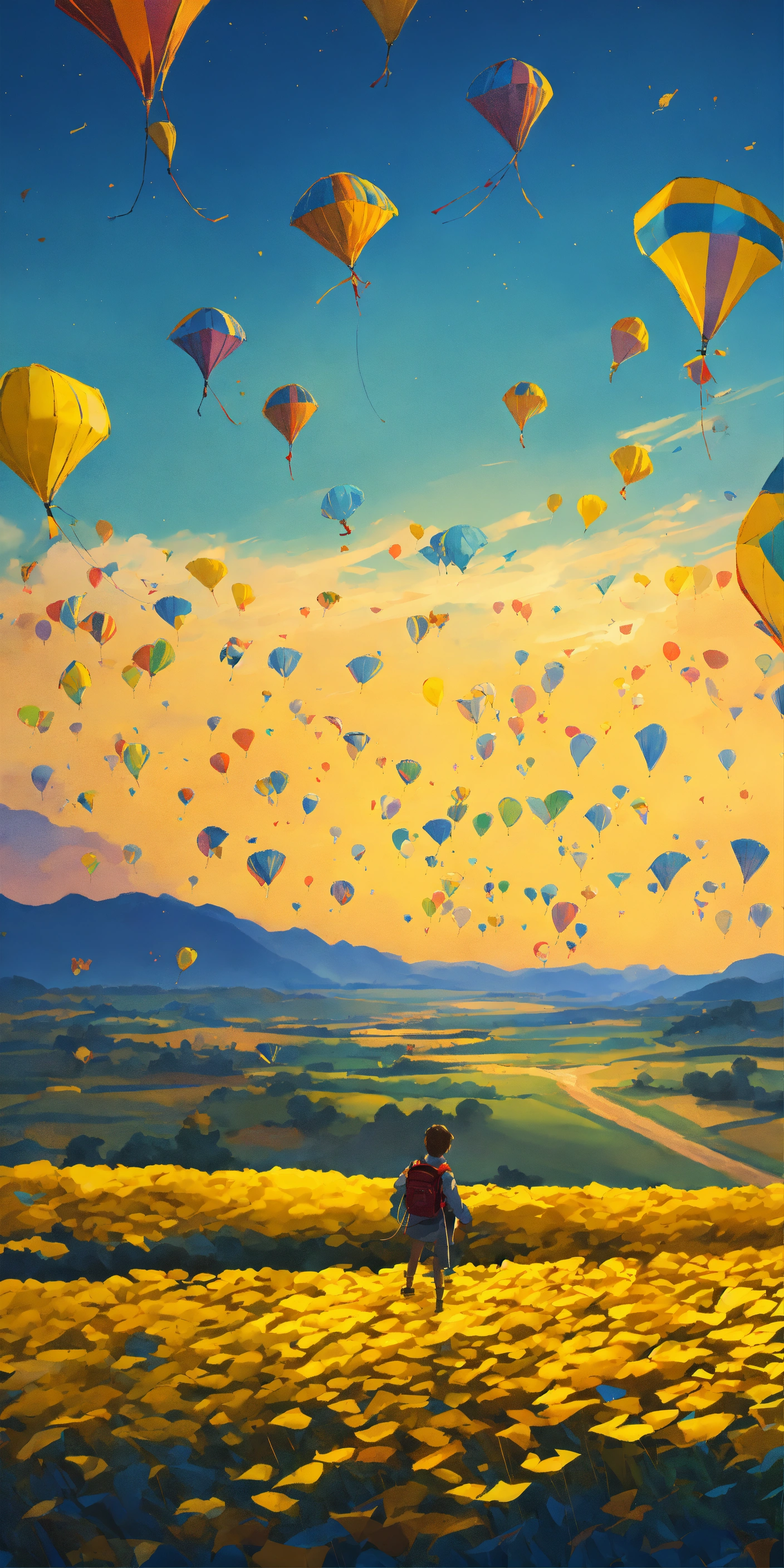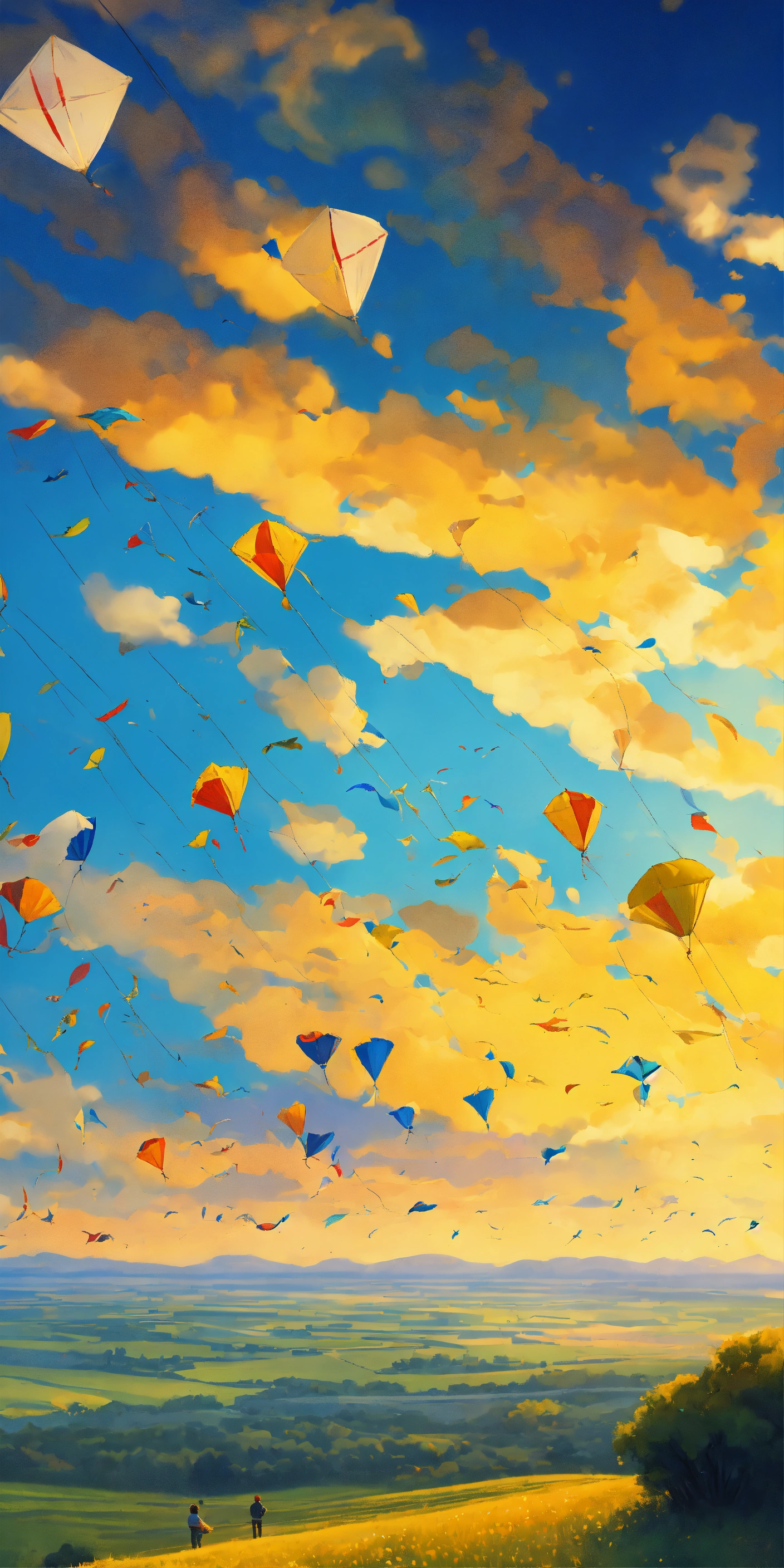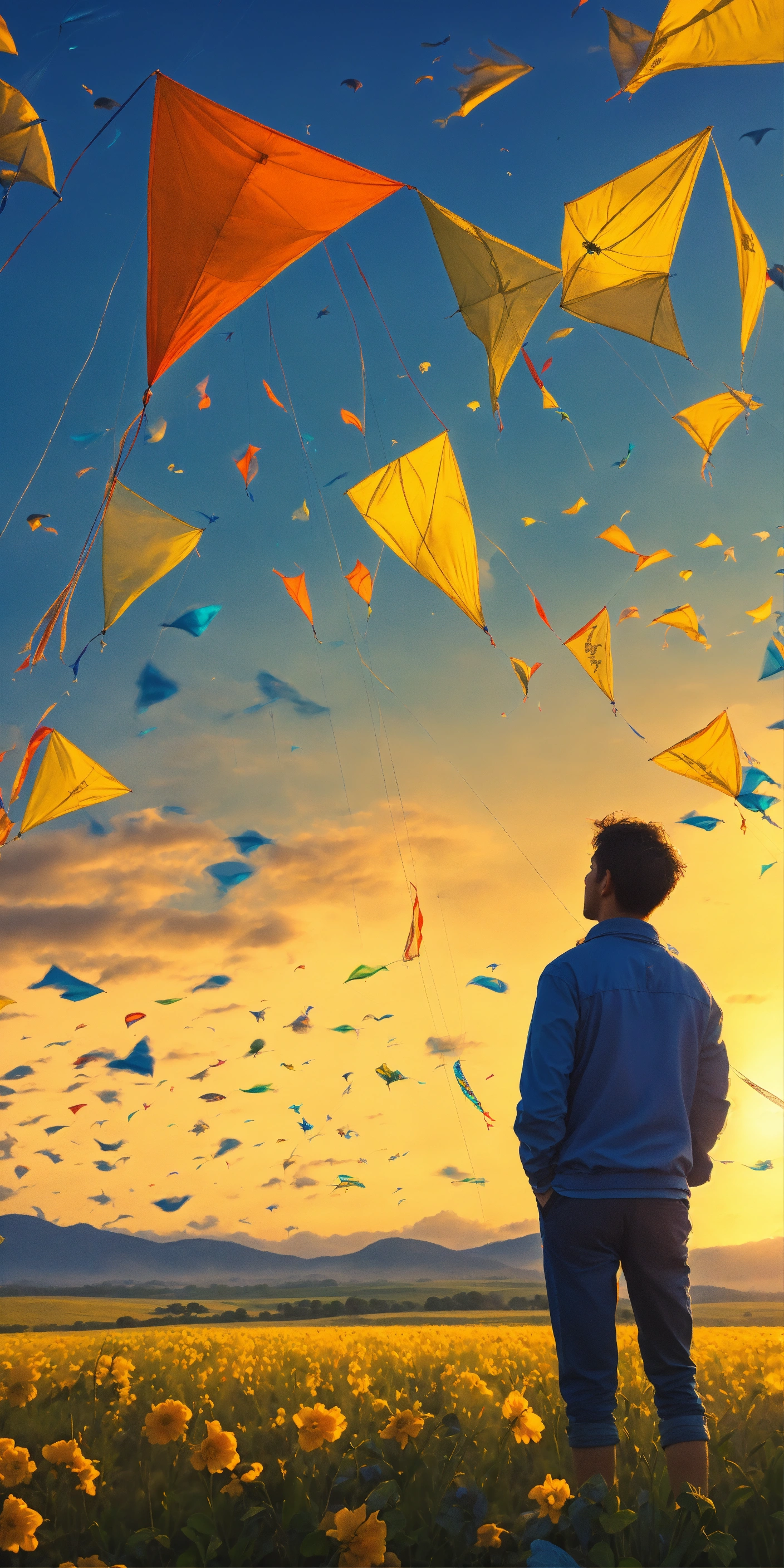 Somebody is gazing at thousands of kites in the deep blue evening sky. a vast countryside landscape with shades of yellow and blue, sharp and lifelike imagery in 4k quality