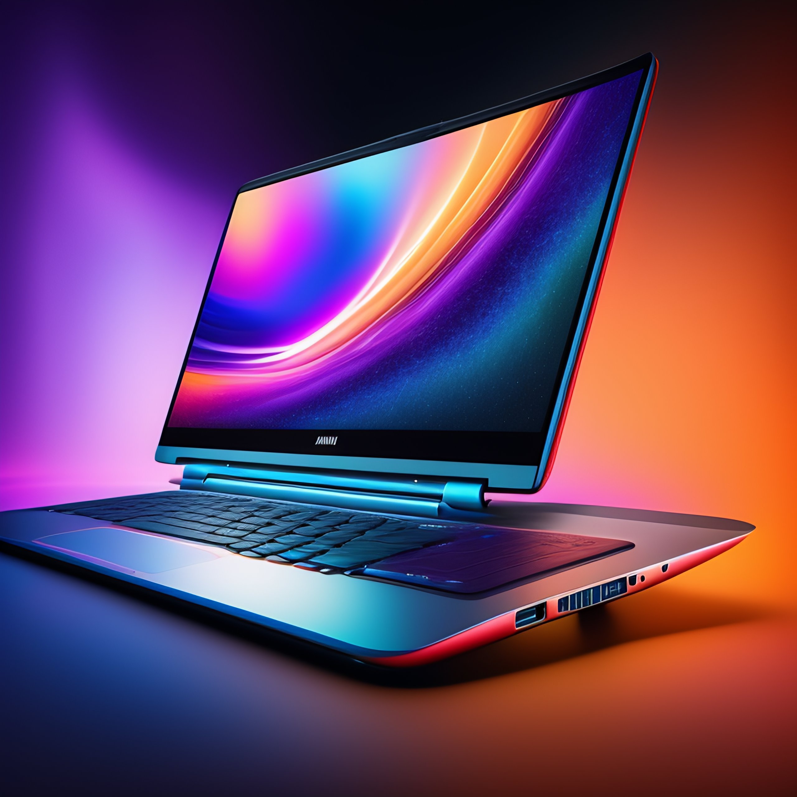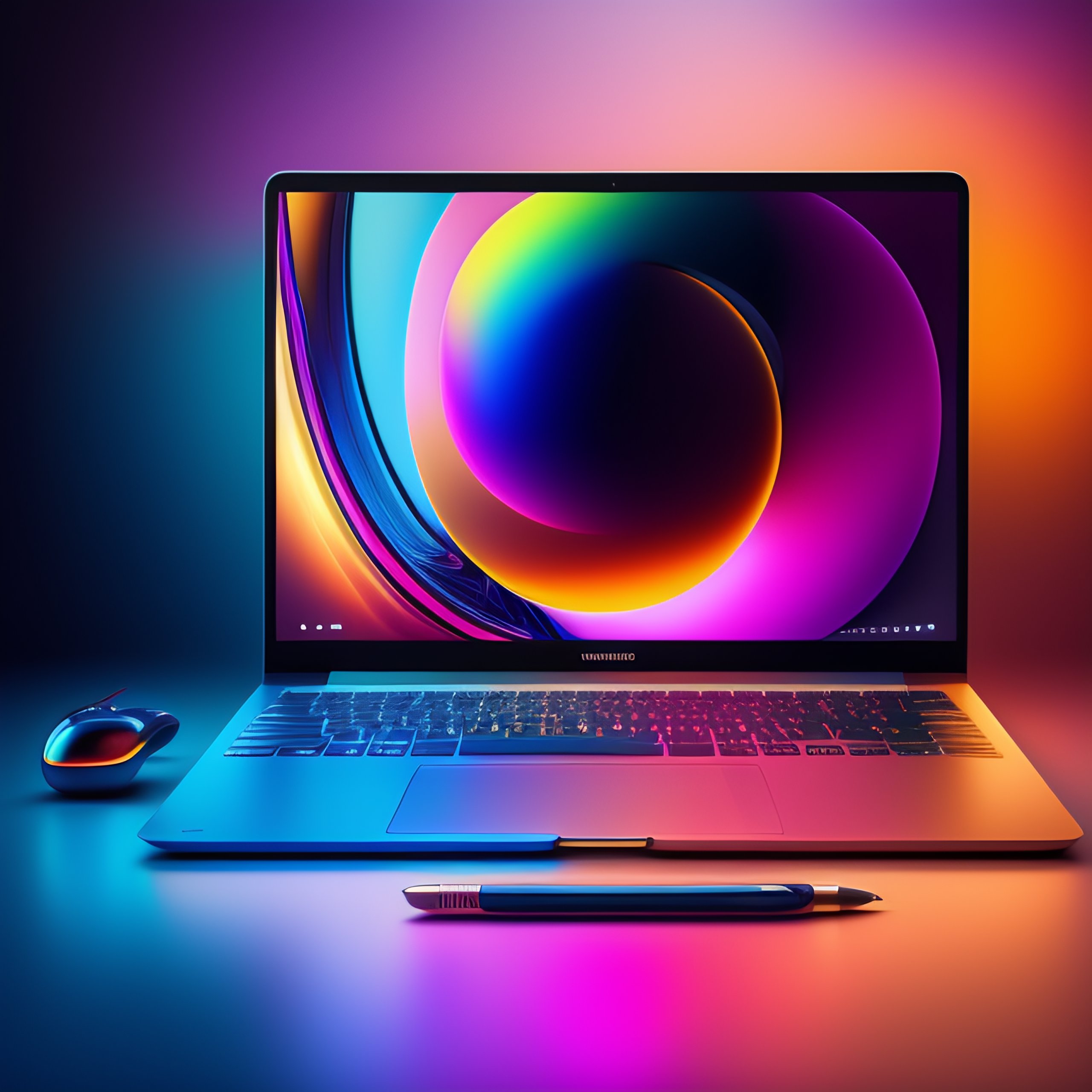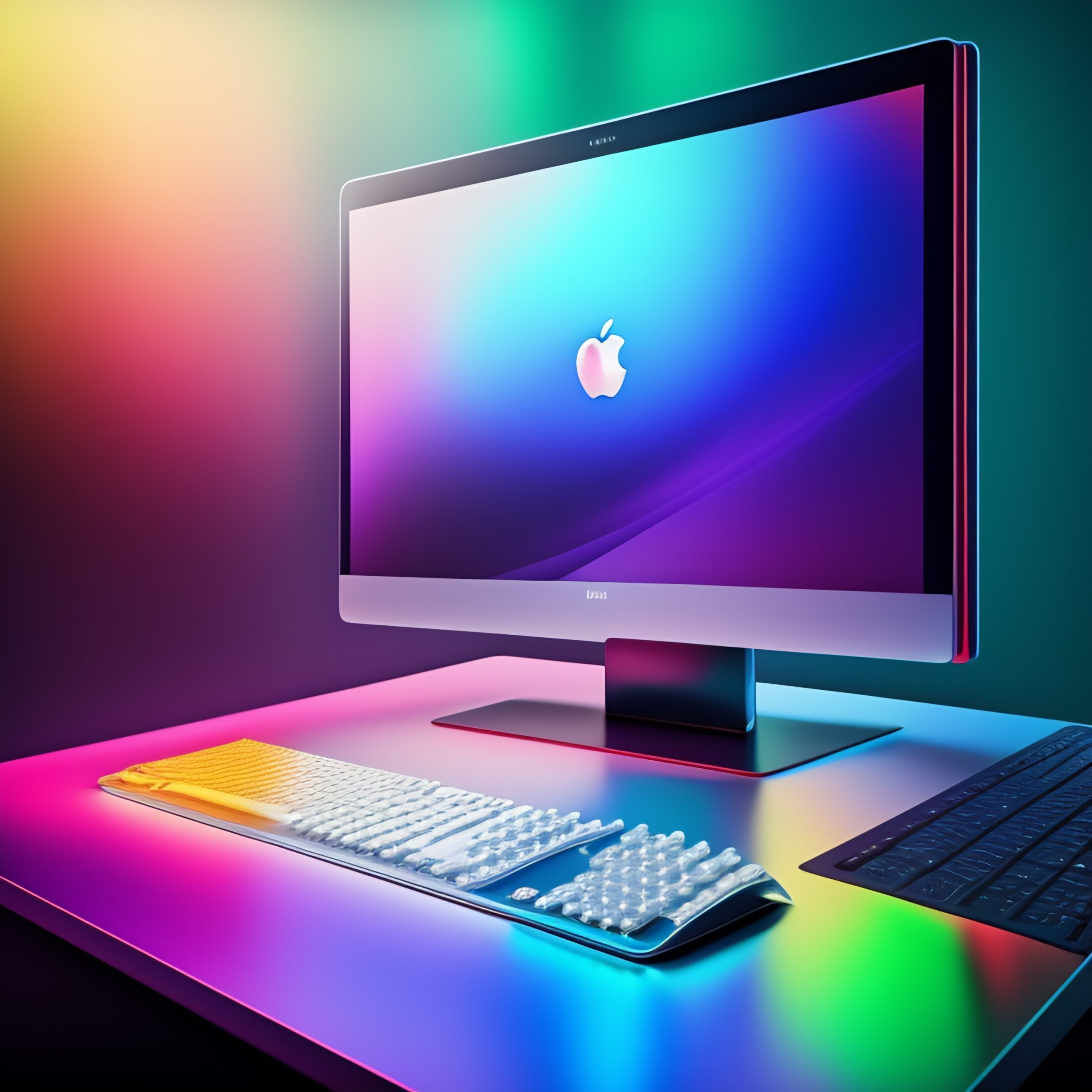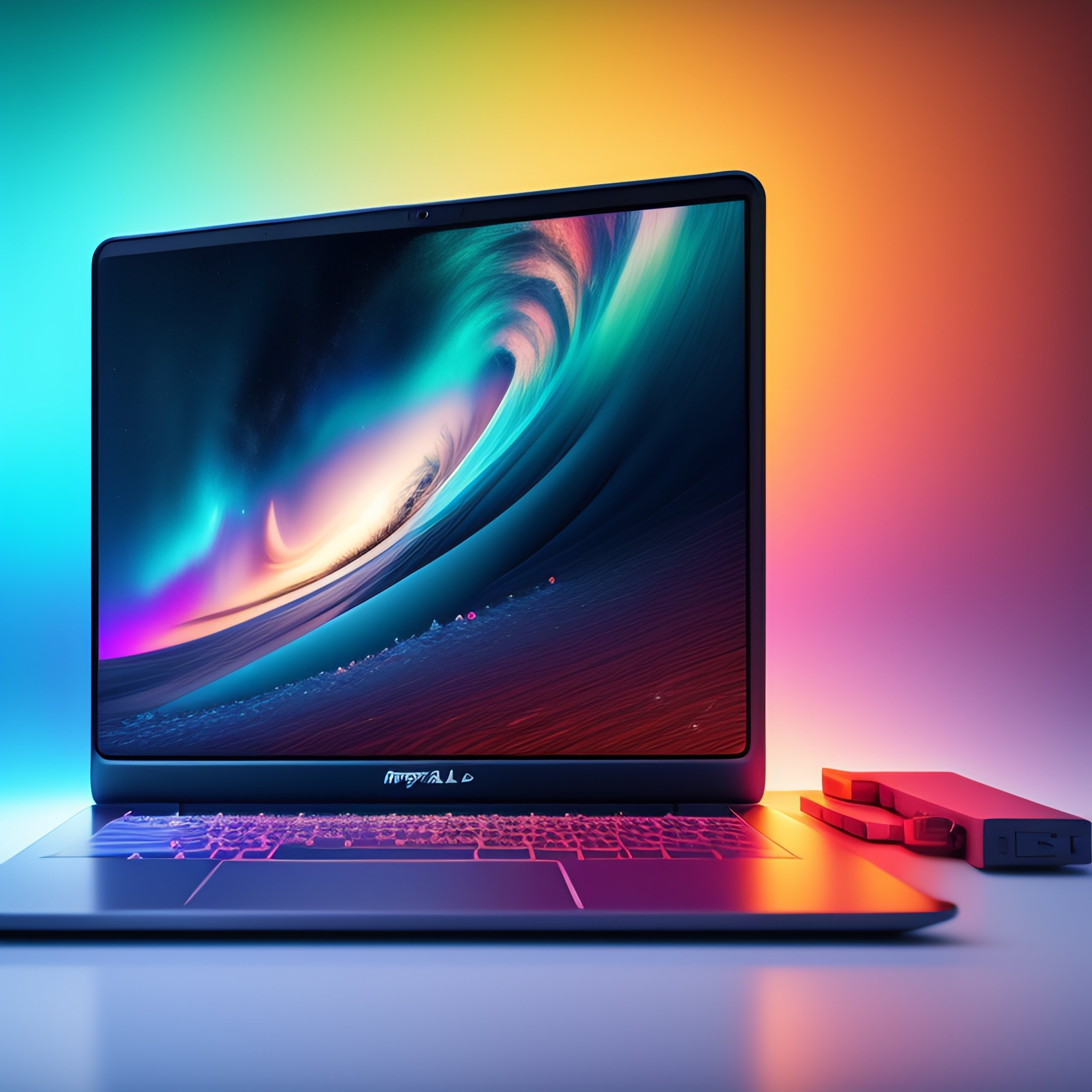 A futuristic cool laptop, hyperdetailed, hyper realistic, keyboard well arranged, alphabet well written, detail background, professional apple mac studio photshoot. cool colours.