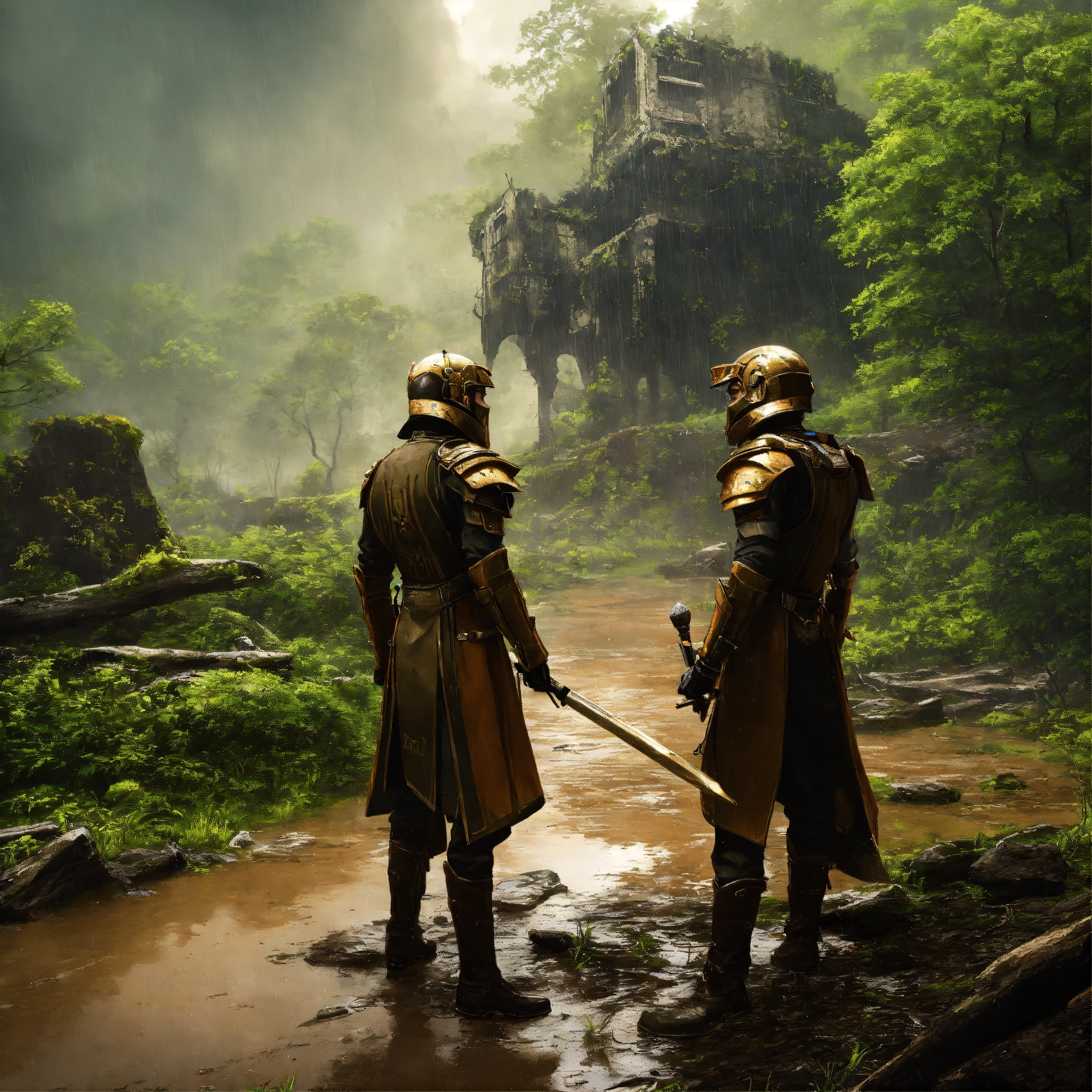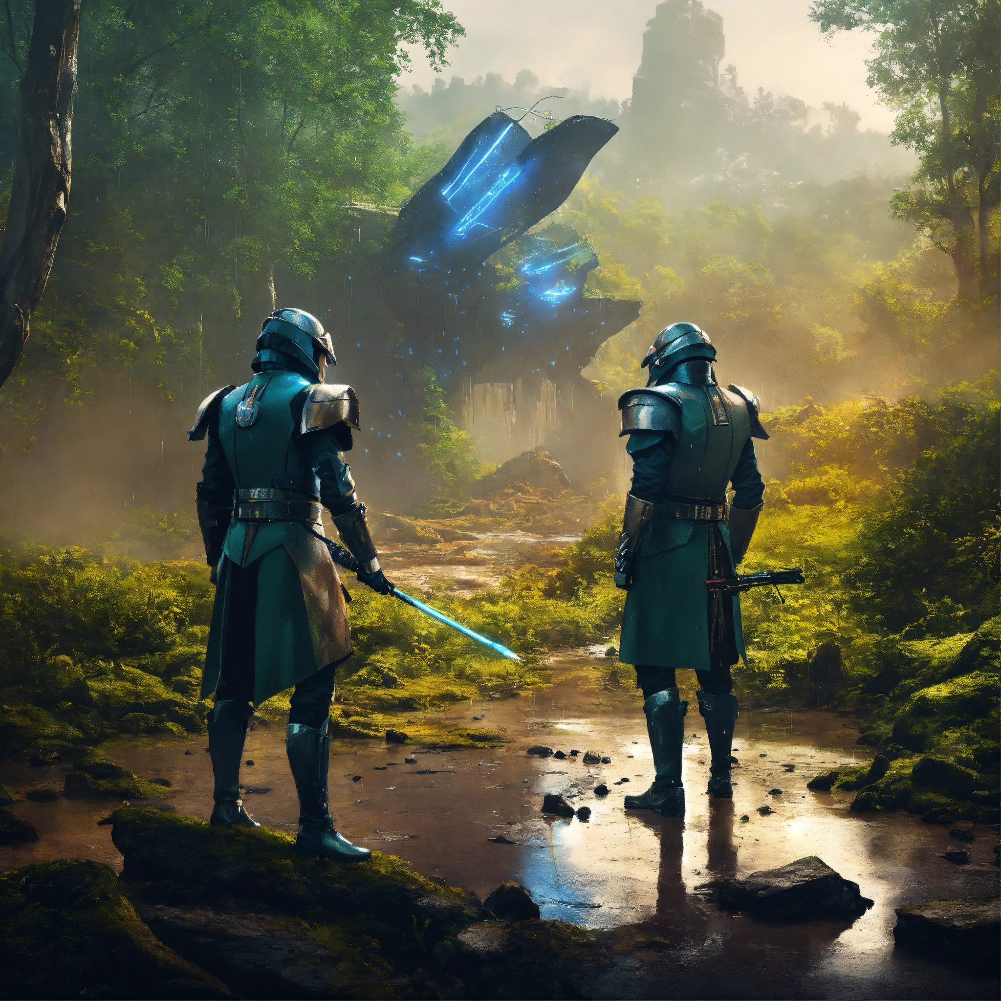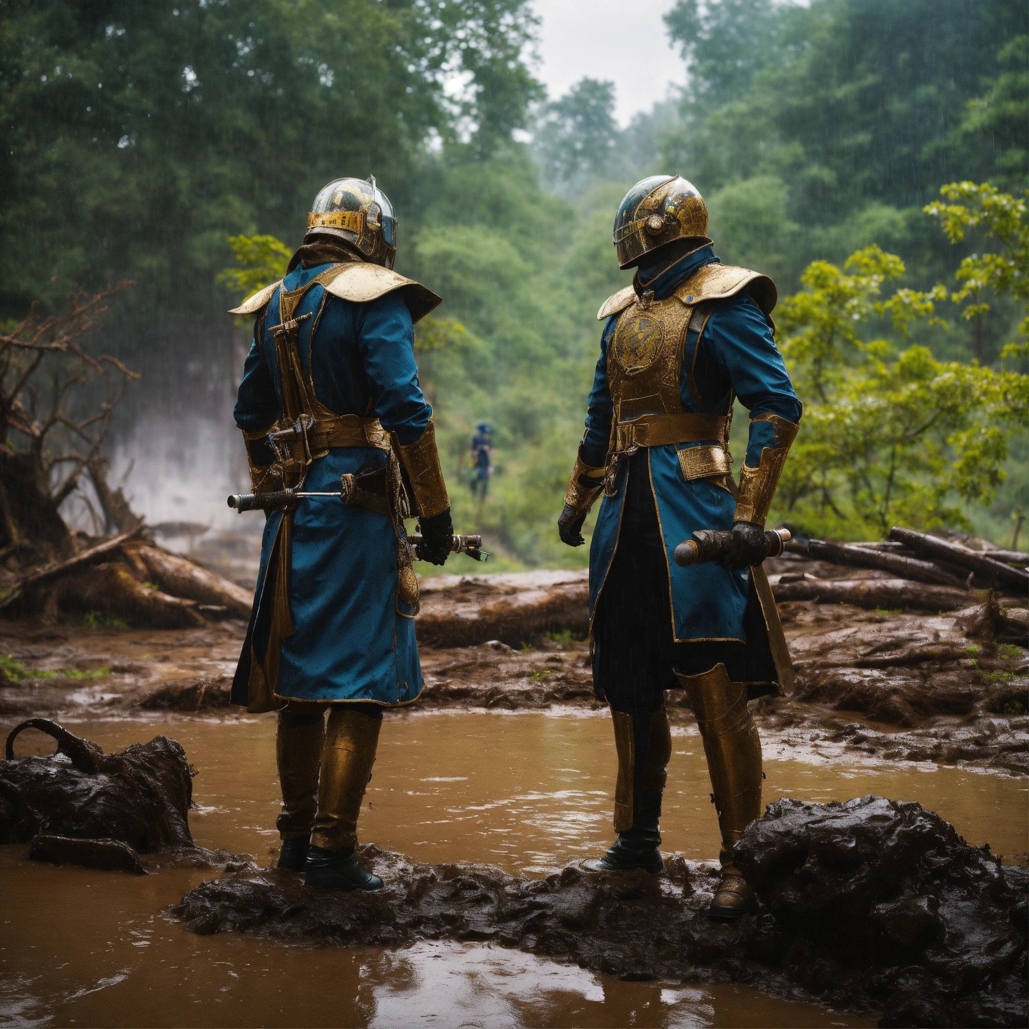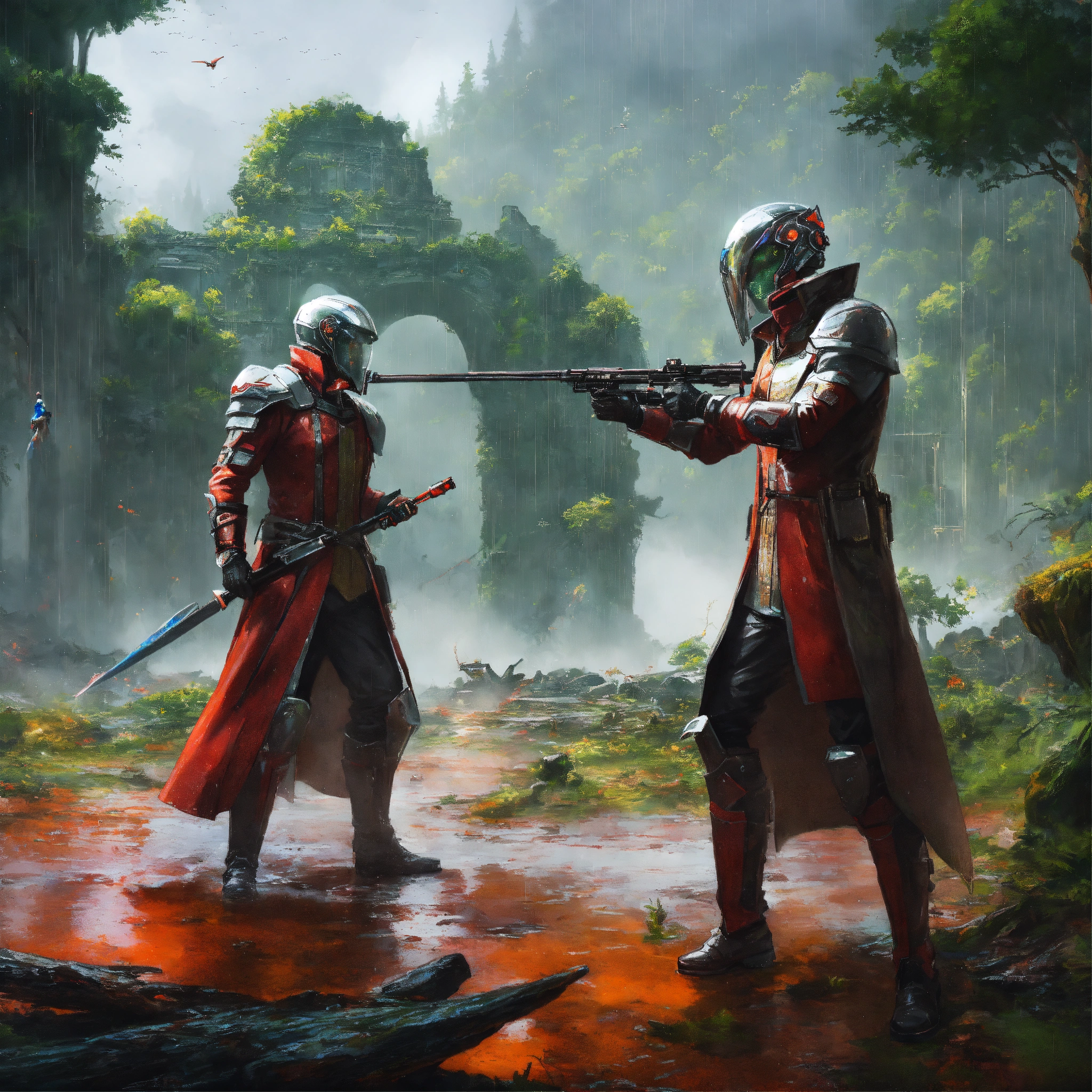 Two futuristic noblemen in futuristic uniforms duel in the rain and mud panting, nature, forest ruins in background