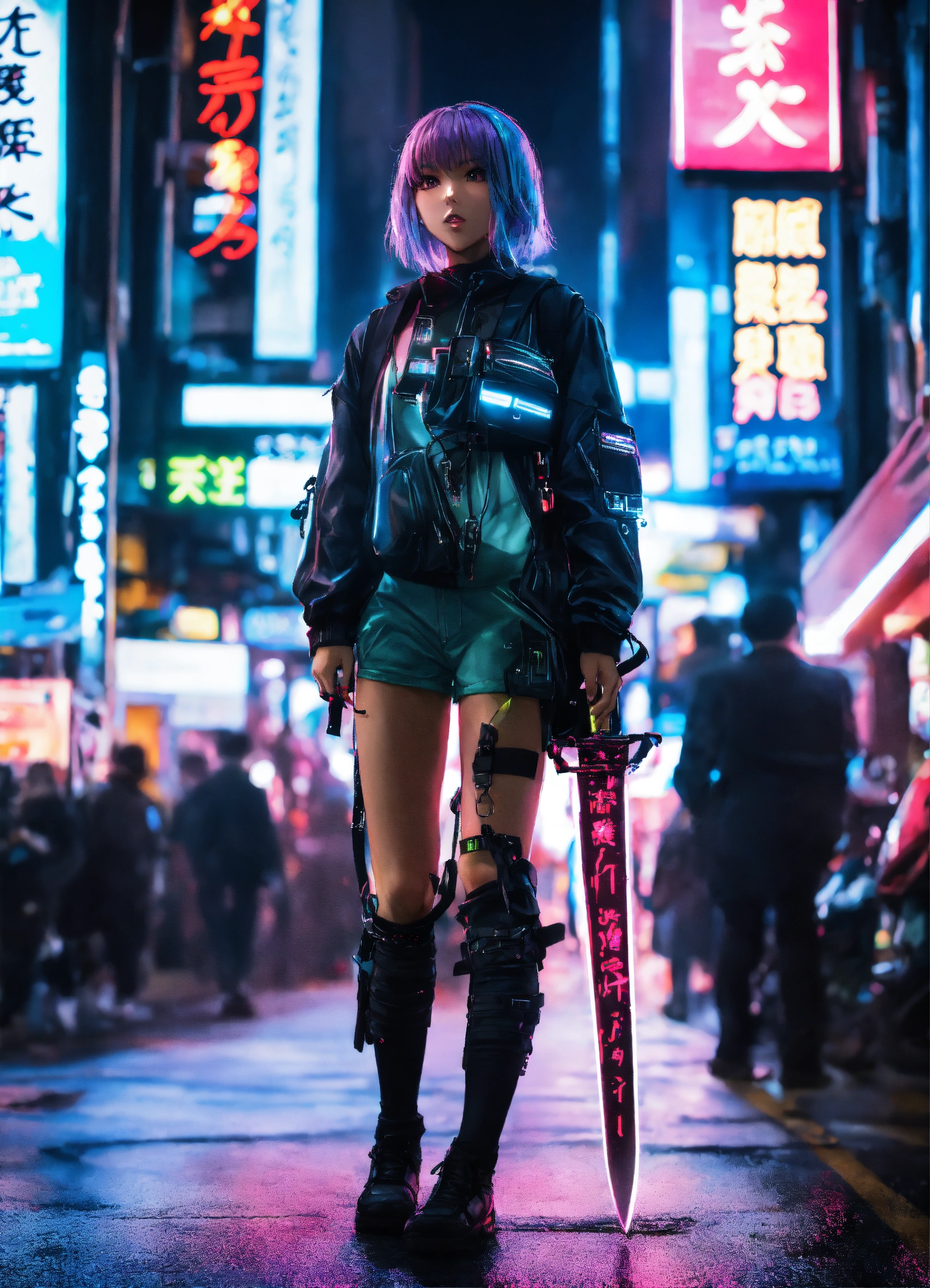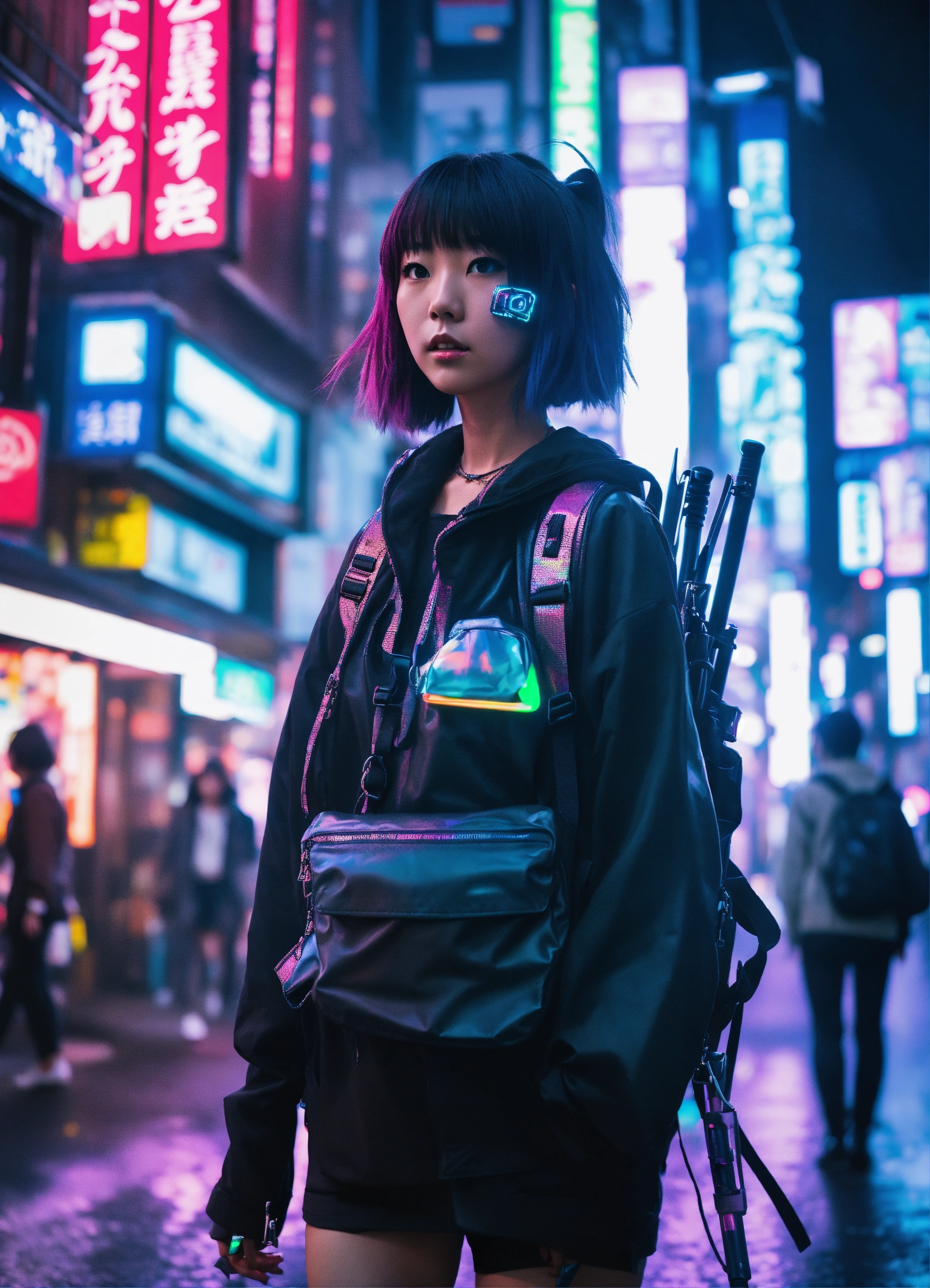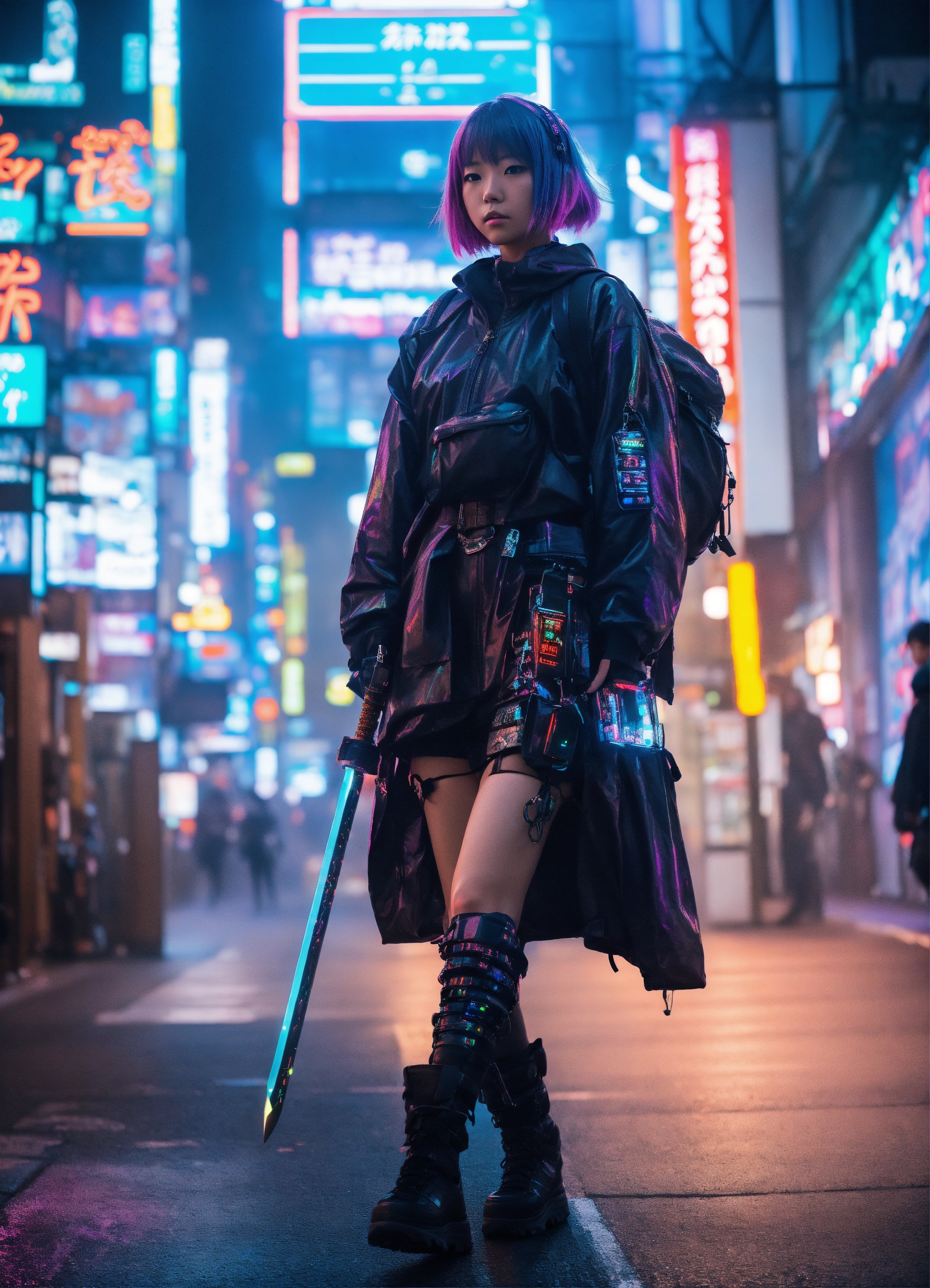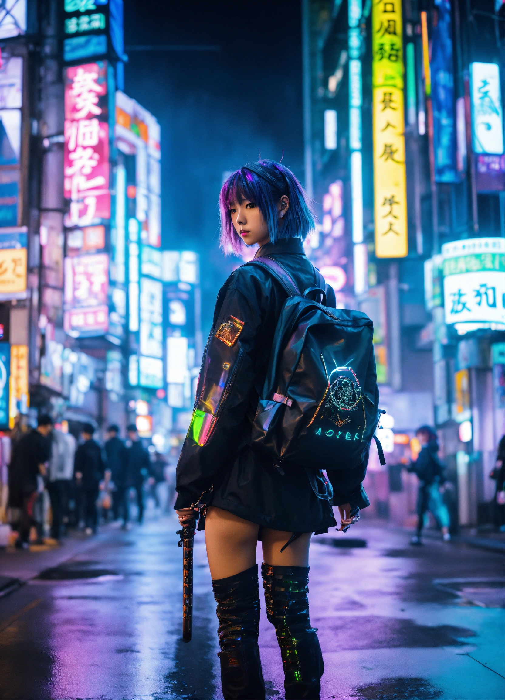 Cool looking japanese cyber punk anime girl walking in shinjuku on a misty night with neon holographic signs with a noir futuristic look carrying a backpack and sword