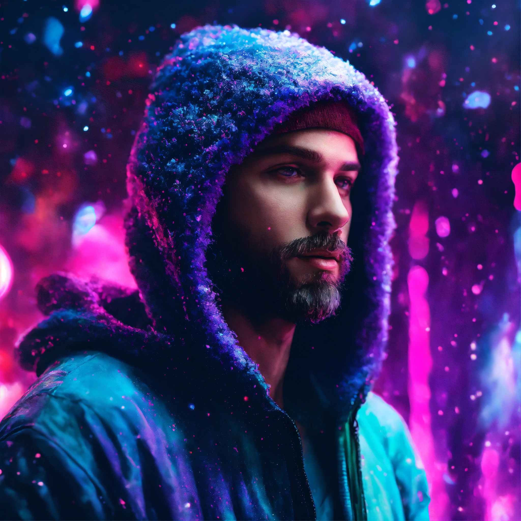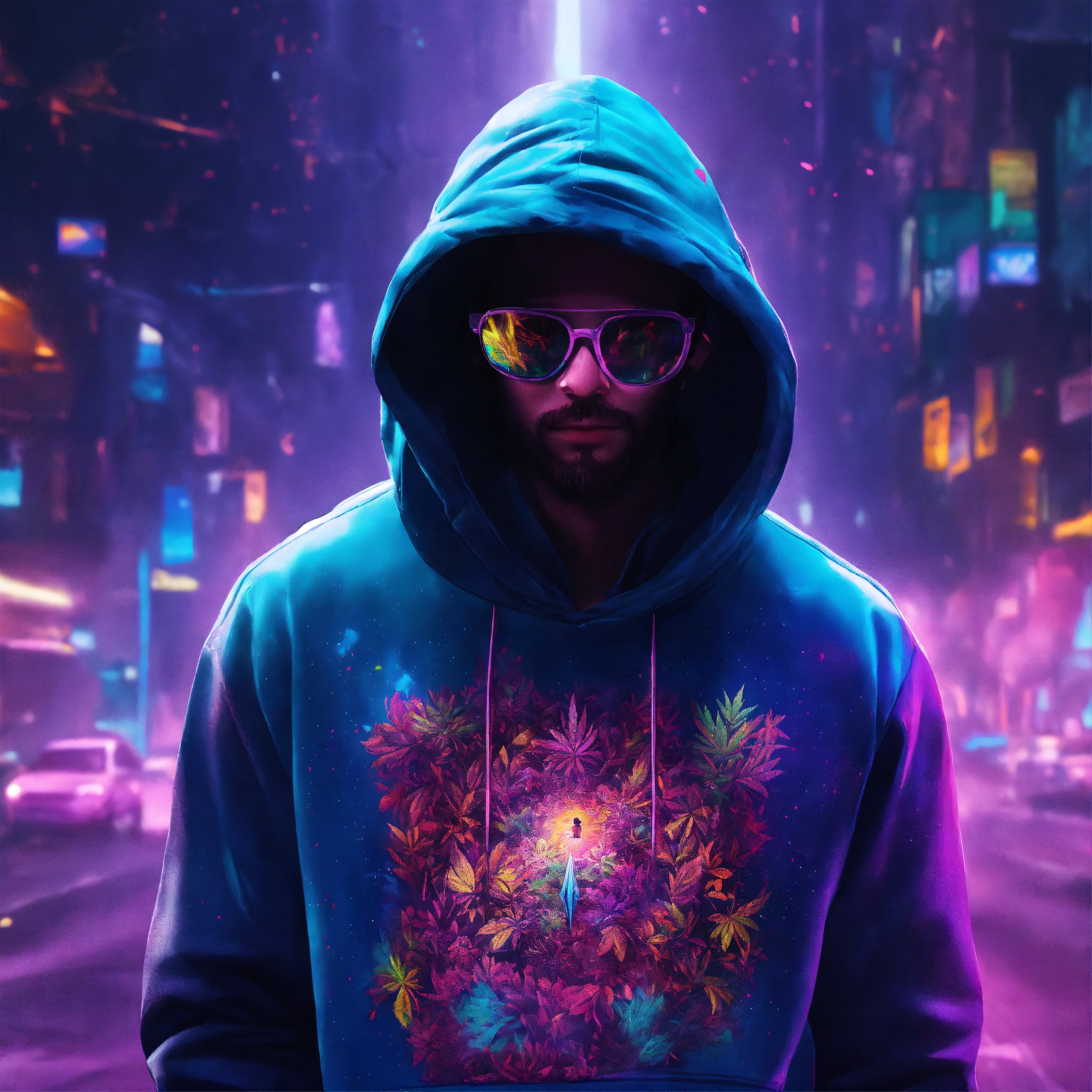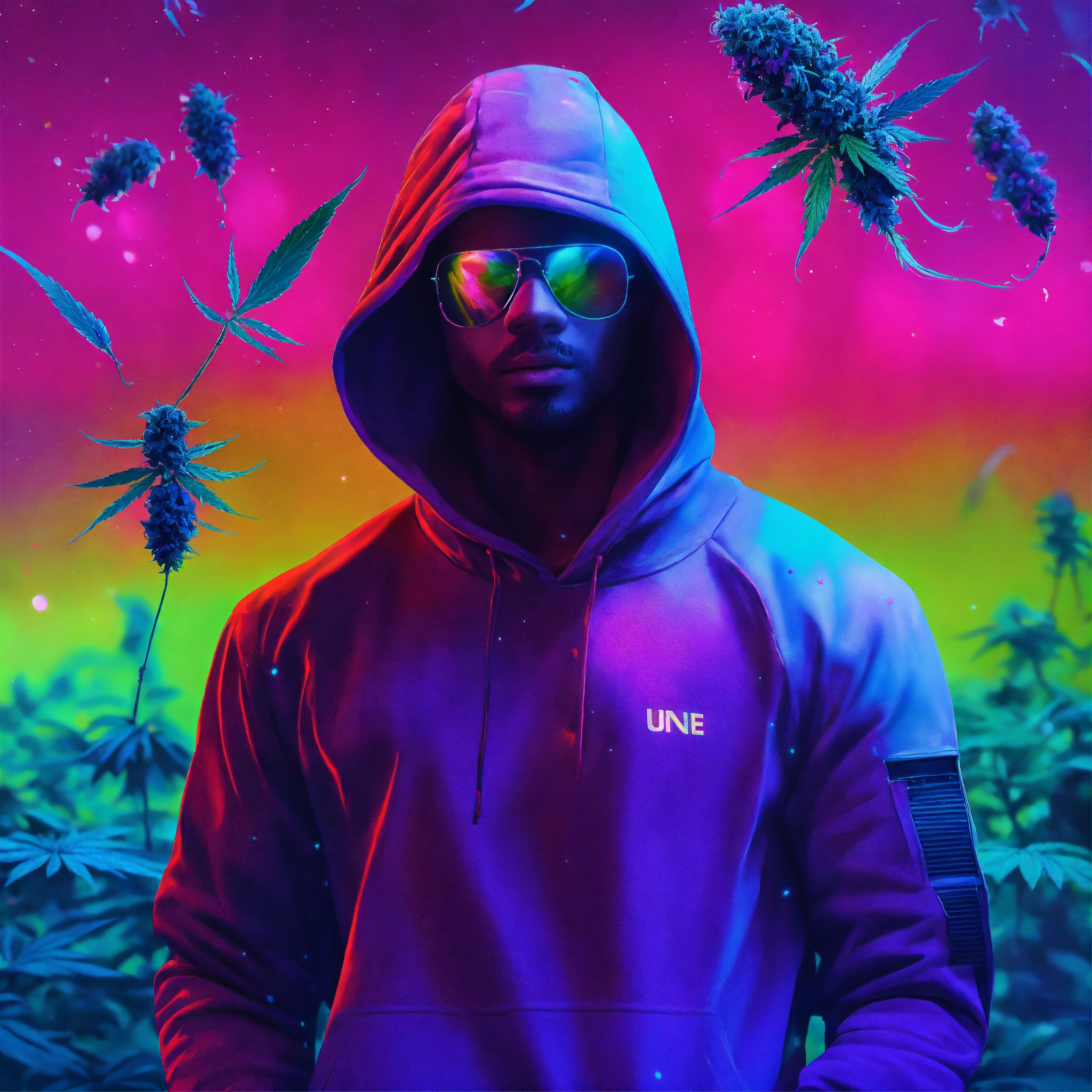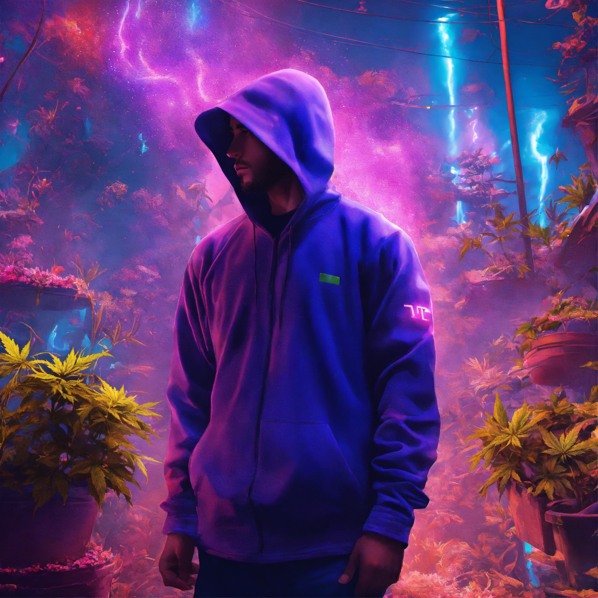 Un homme de dos avec une capuche, assez fin mais avec un dos musclé qui a un effet de bug autour de lui, un micro dans la main et un joint de cannabis dans l'autre. un univers assez galactique avec des couleurs entre violet, bleu et rose. cet homme est perdu dans un ghetto. un effet glitch qui ressemble aux jeux vidéos mais une image très réaliste.