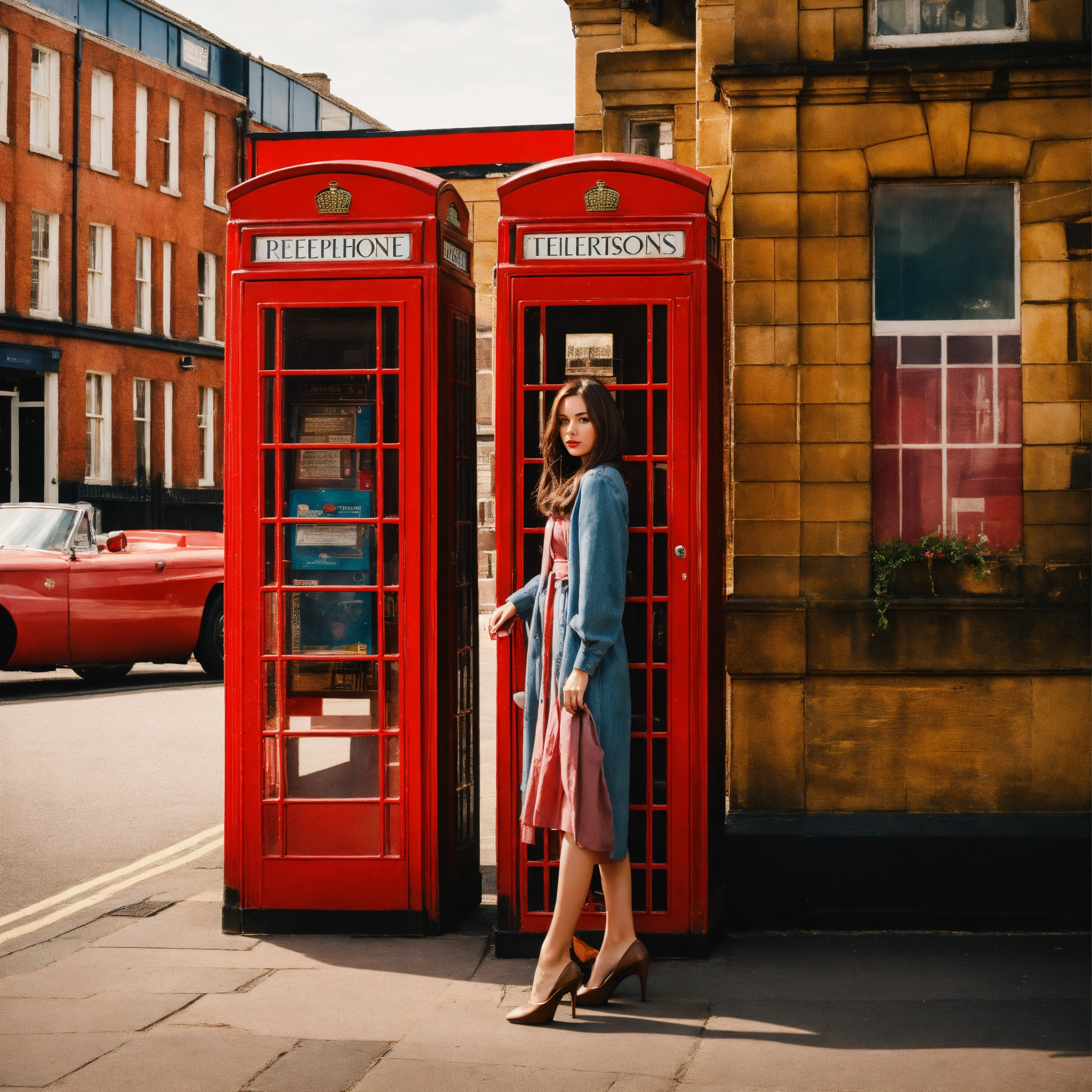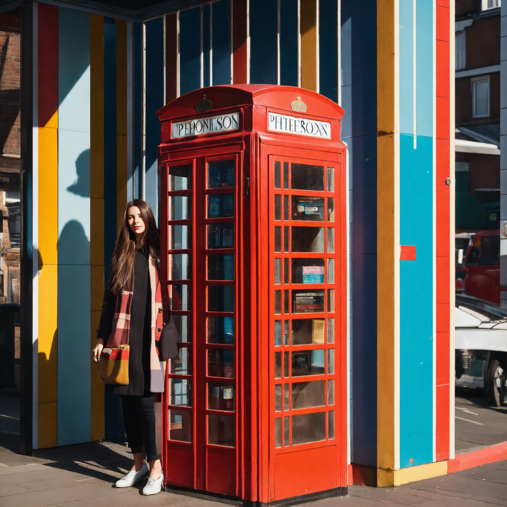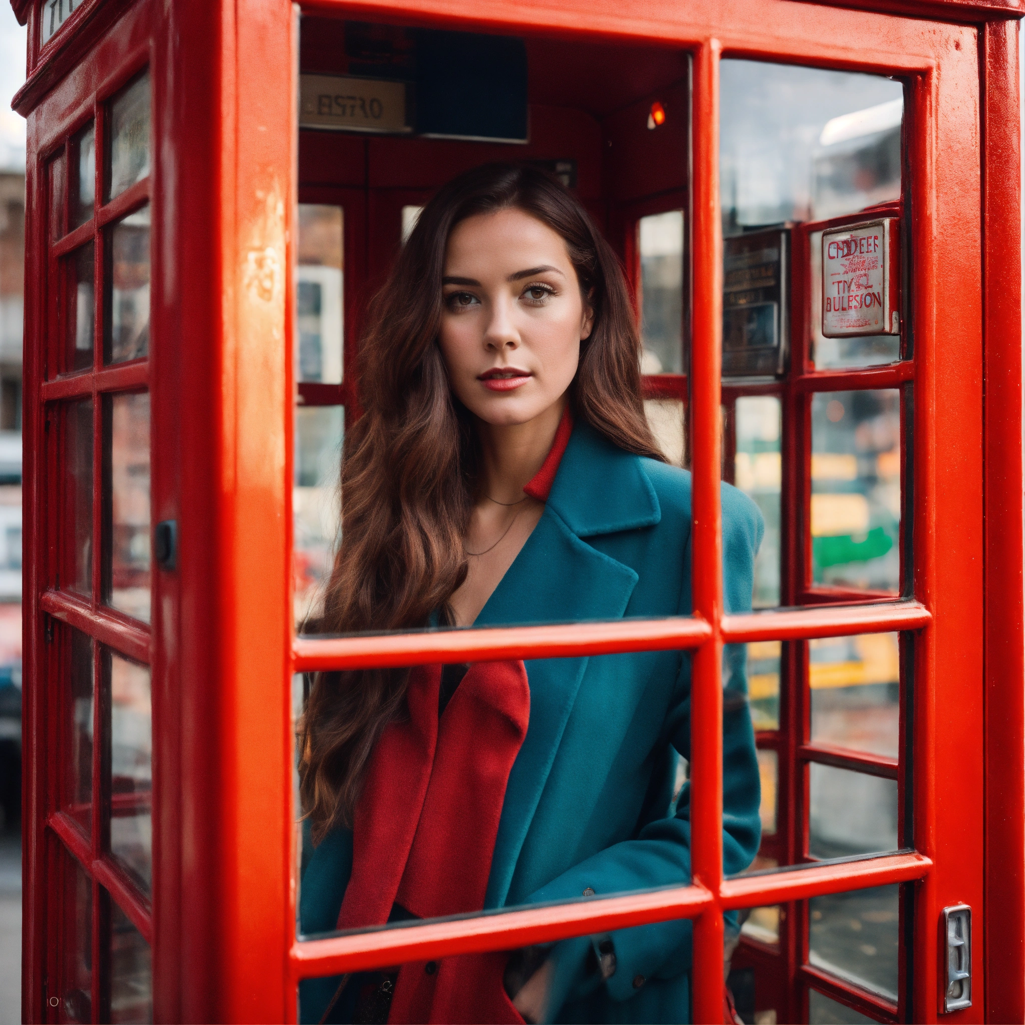 A photograph of a woman with long brown hair standing inside an english retro red phonebox, wes andersons asteriod city colour palette