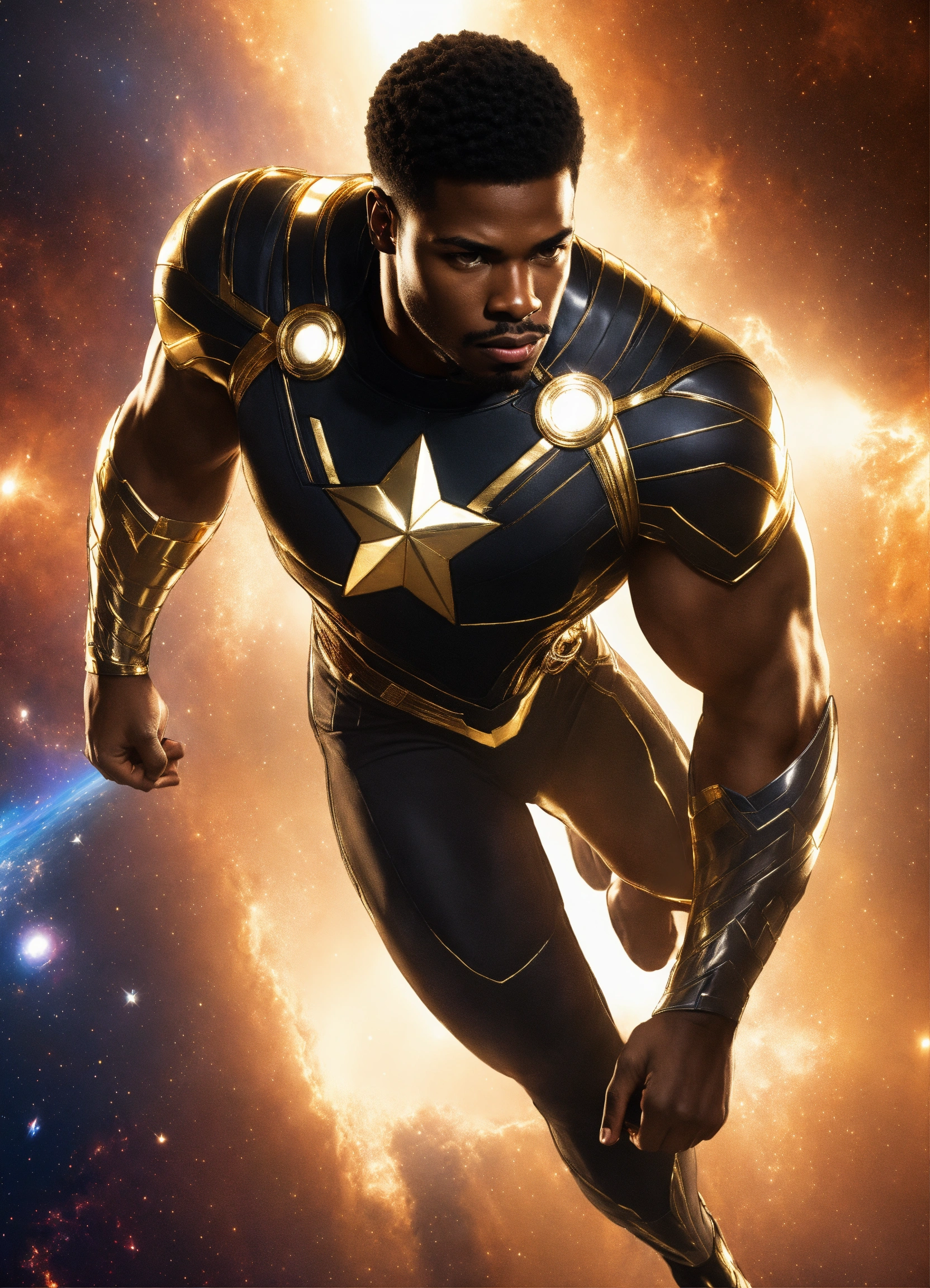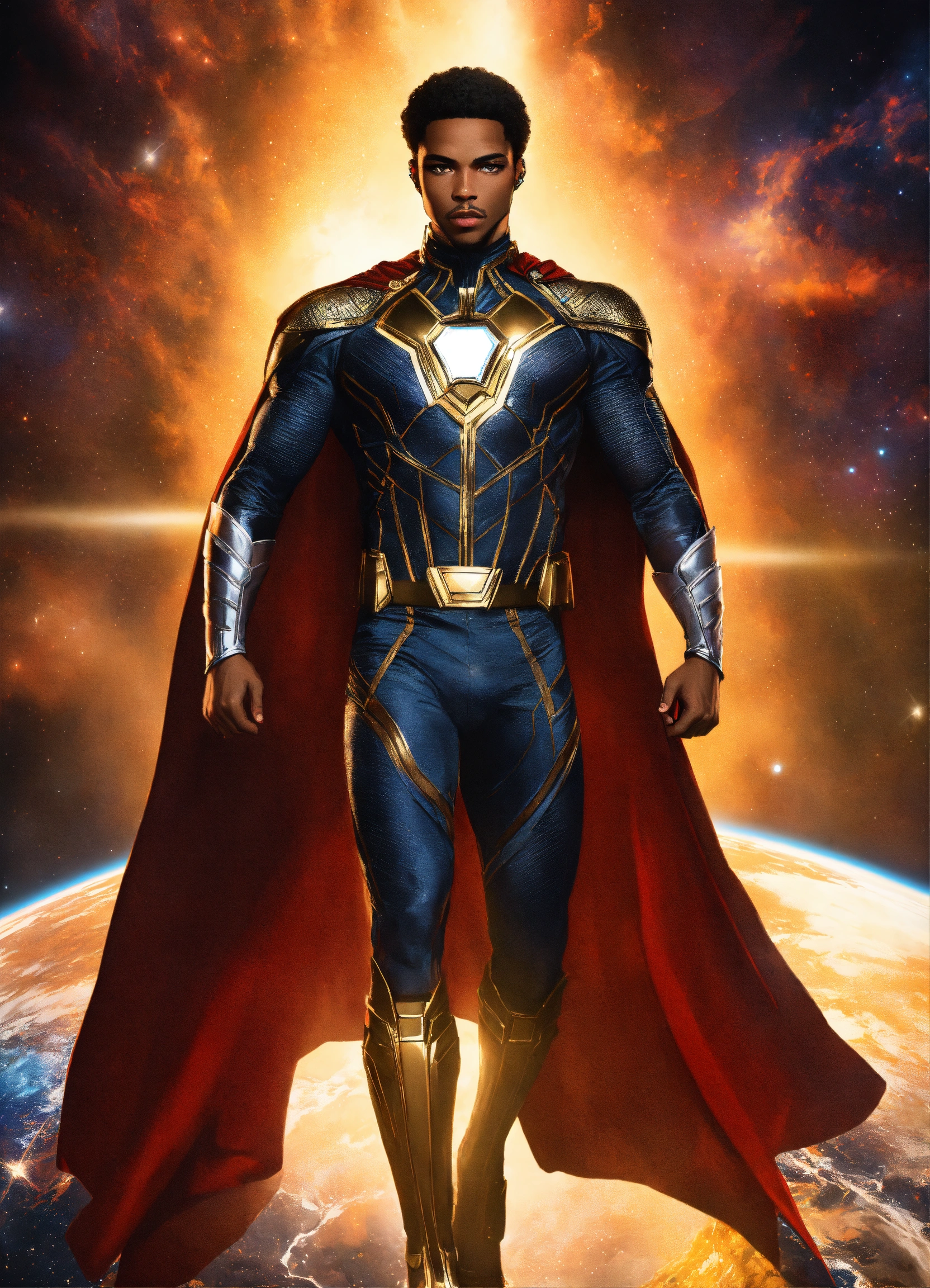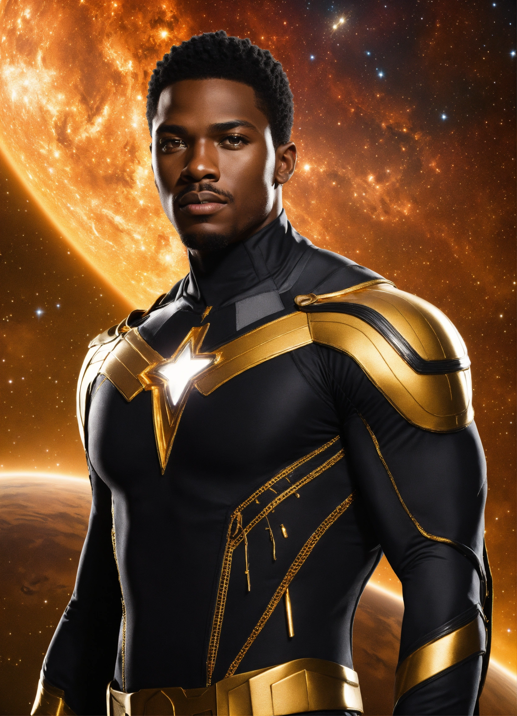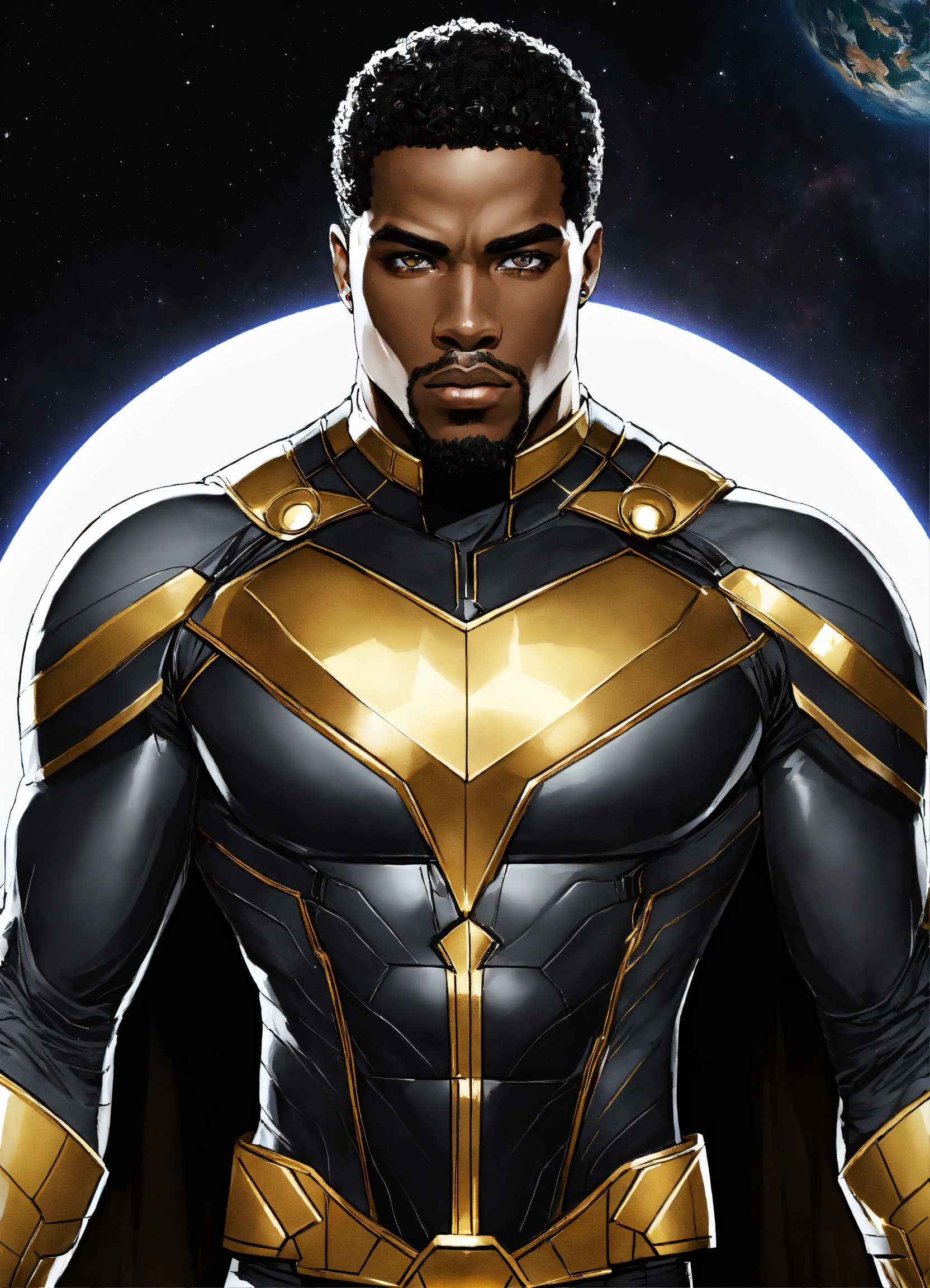Piercing hazel eyes, marvel, highly detailed, black, white, and gold sleek costume, full body, smooth, cape, muscular african american male, black hair, in space