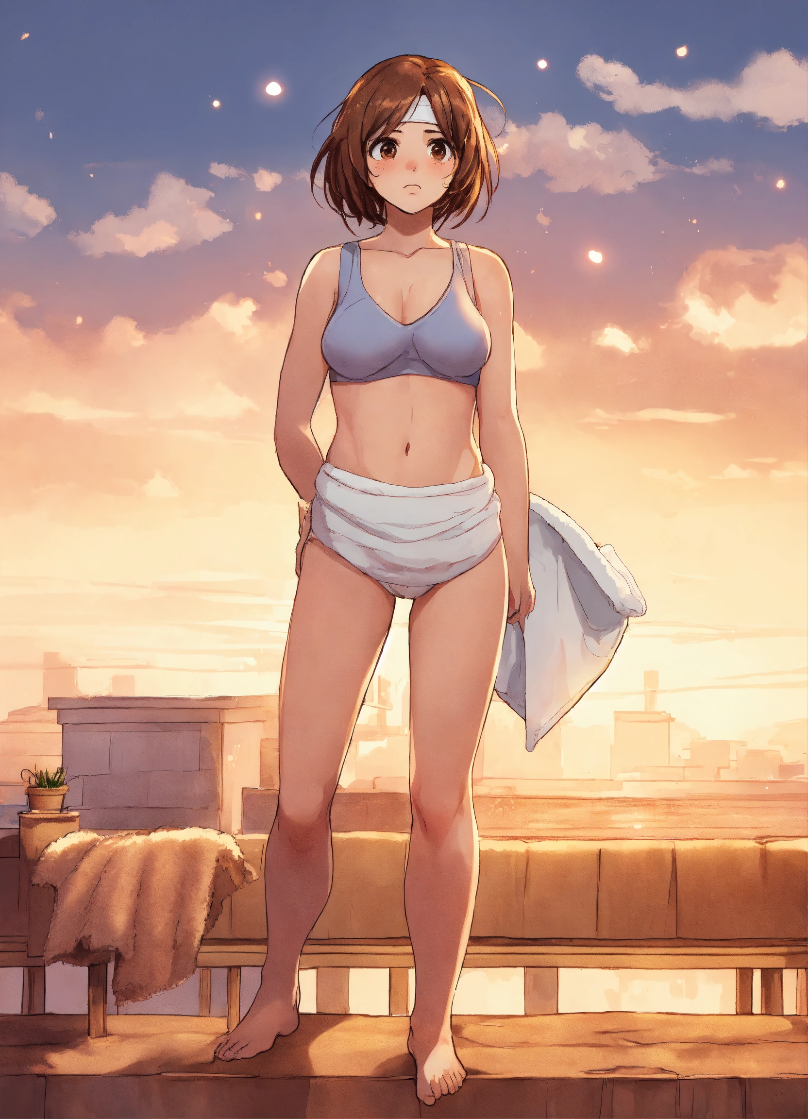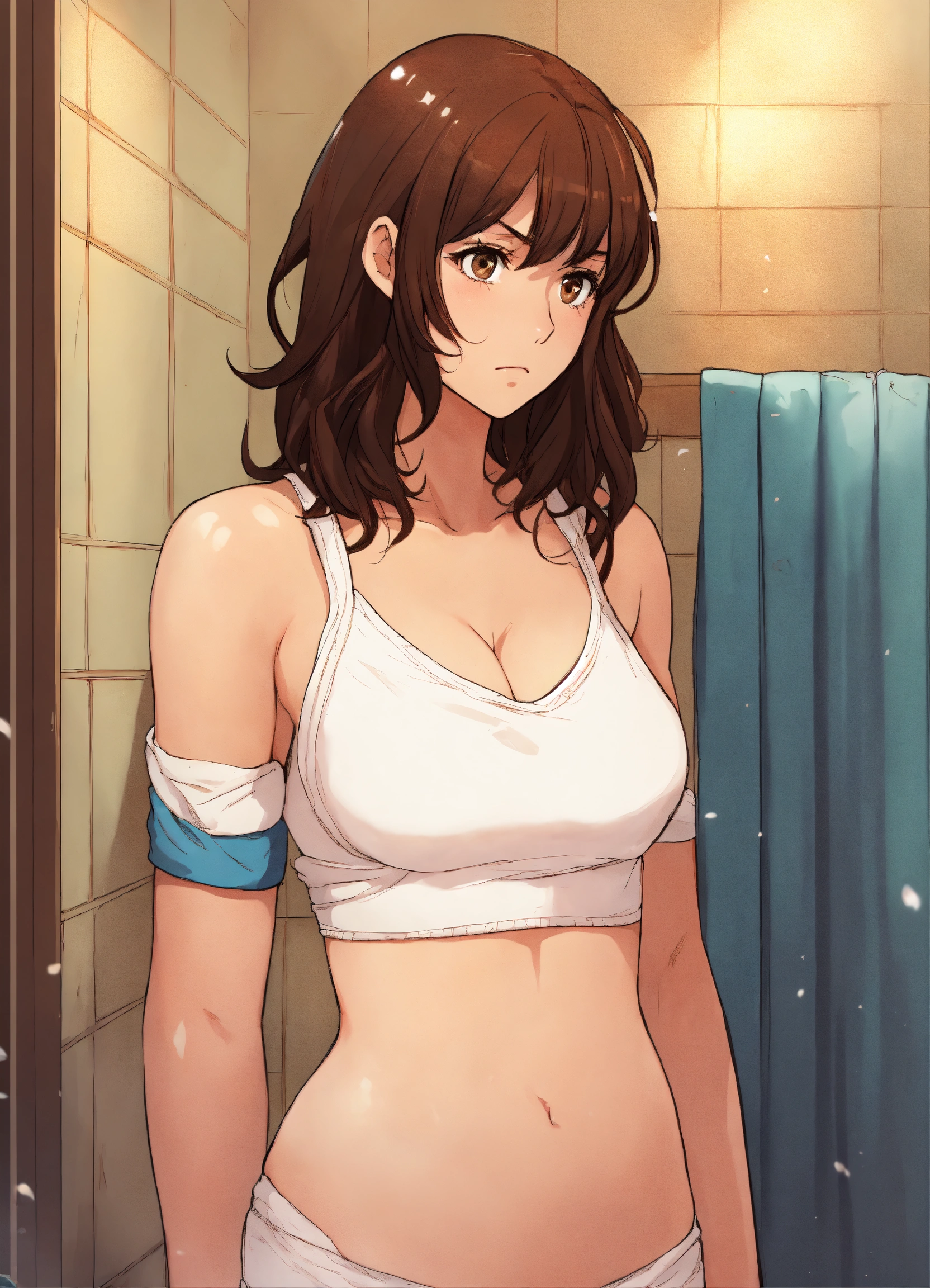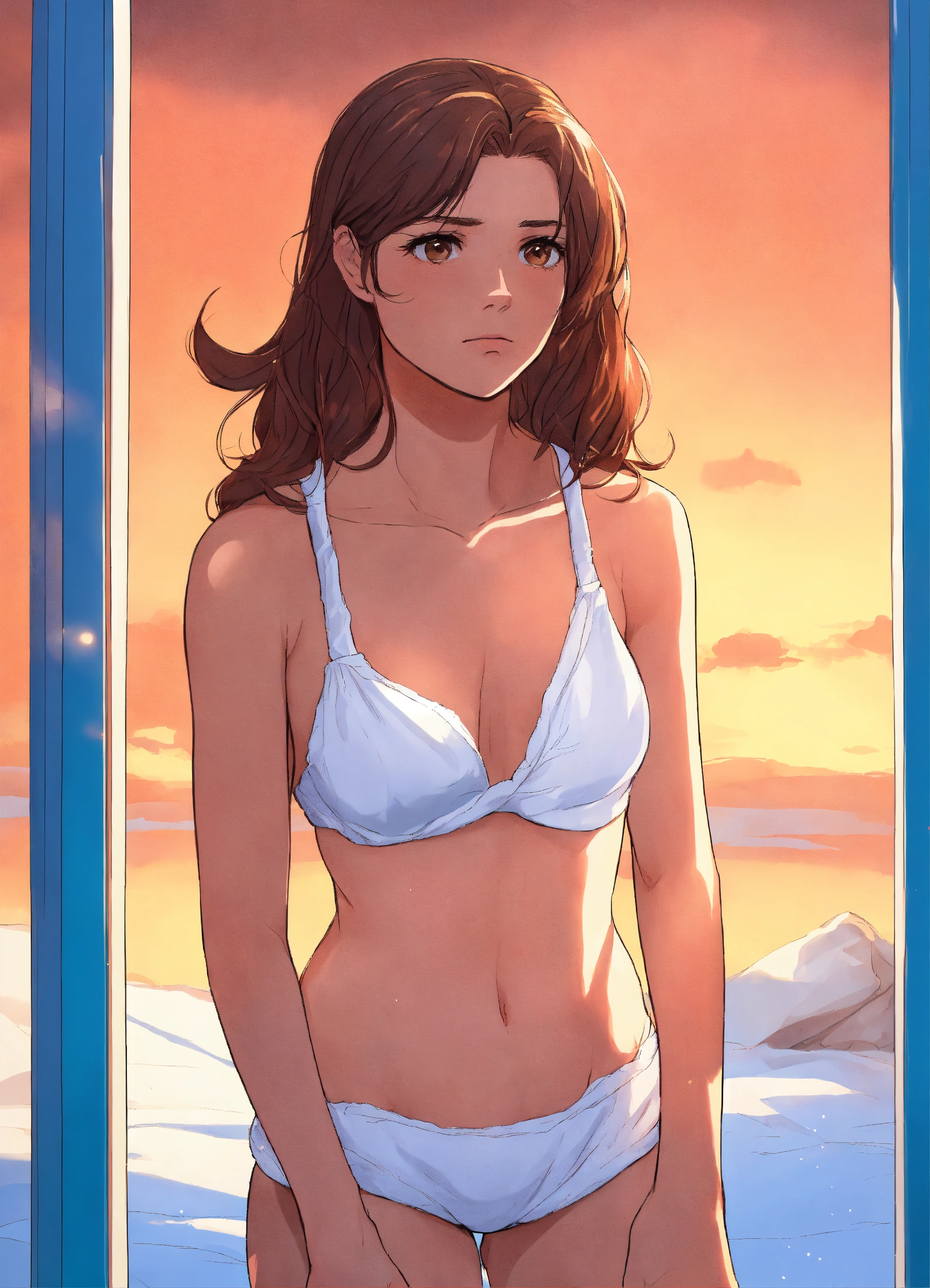 Comic character, sad, 19 years old, brown hair, brown eyes, holding a towel in front of her, white padded briefs, standing from behind, full body