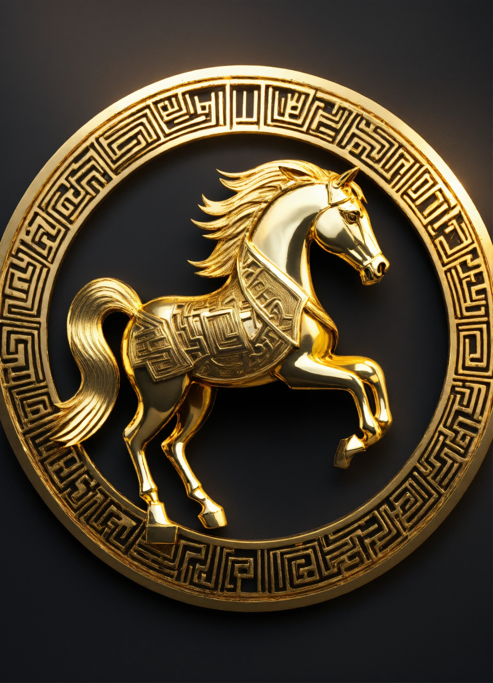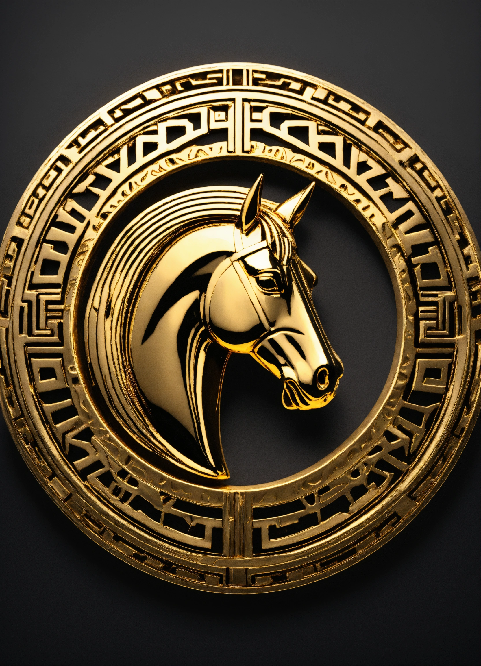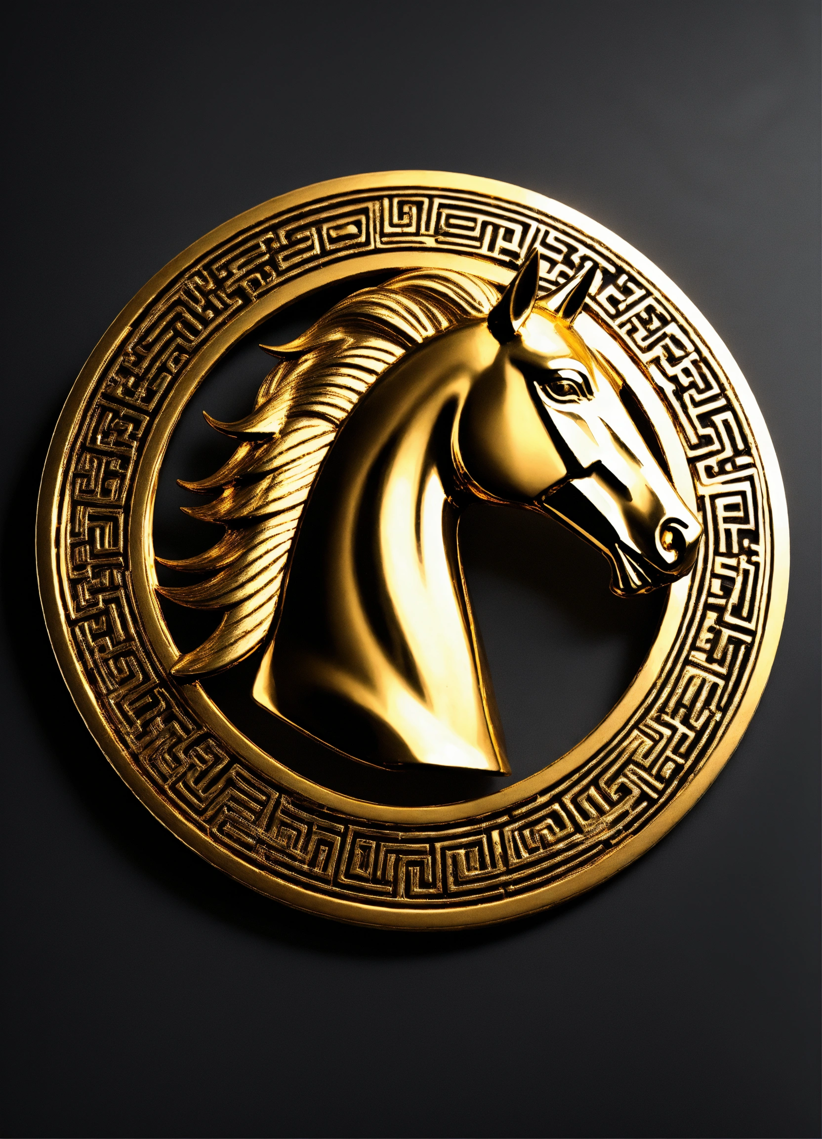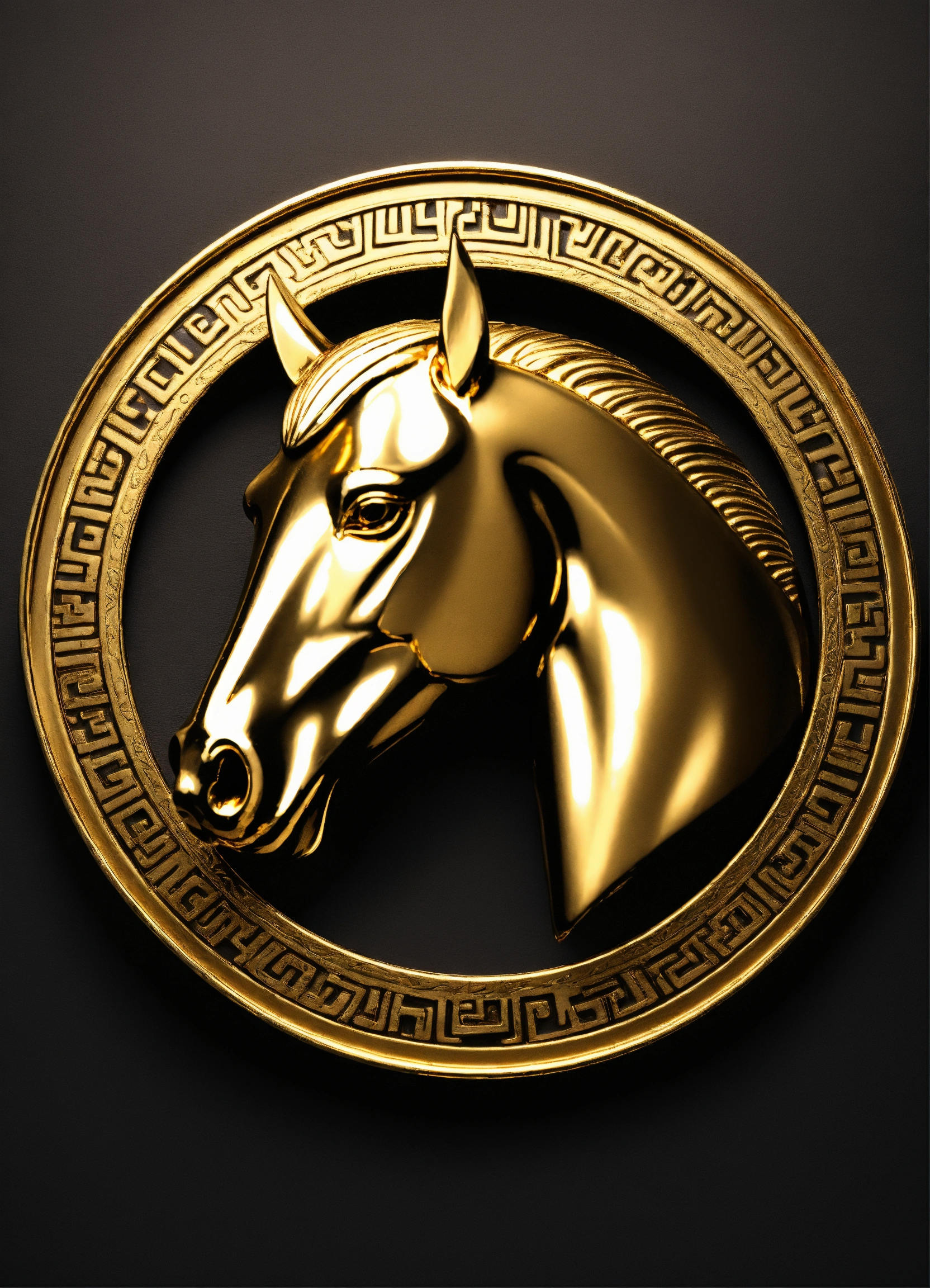 A golden metal horse head for a logo, contained within a metal circle with greek meander pattern, full shot, plain black background suitable for a png, unreal engine render, 8k