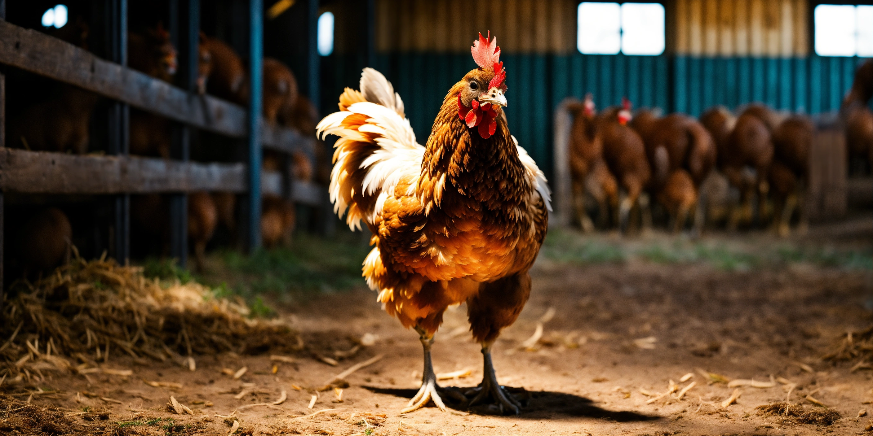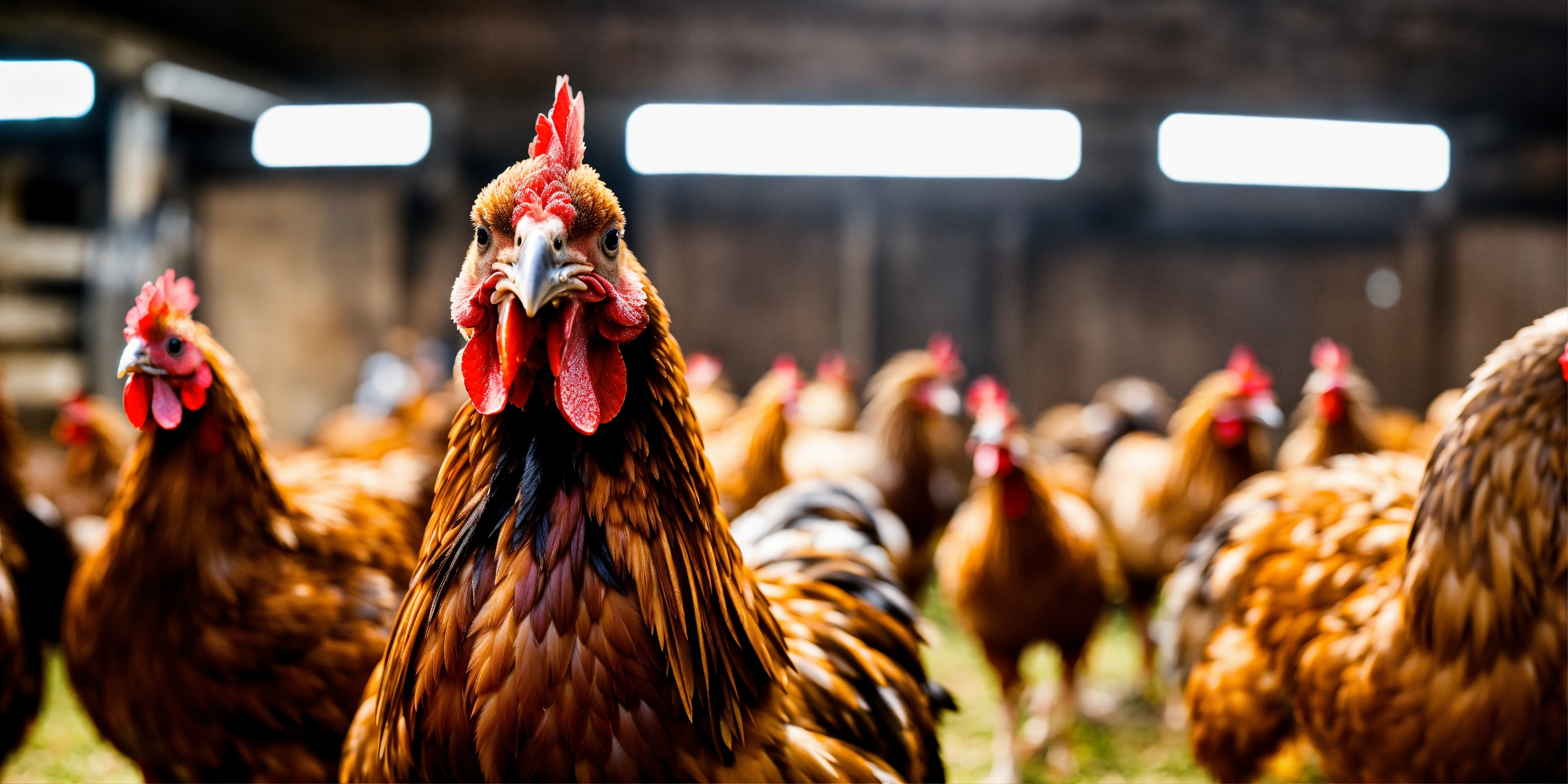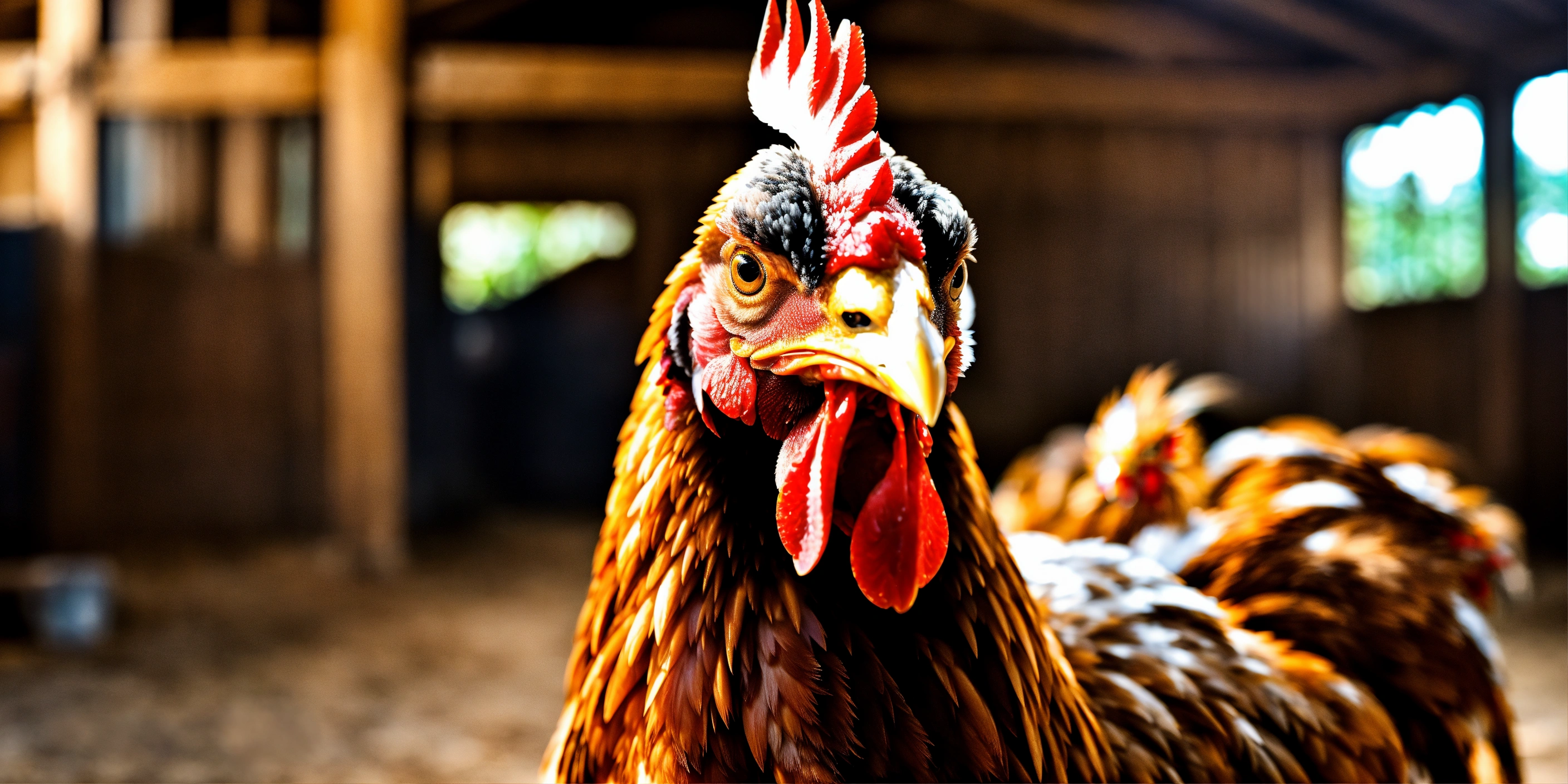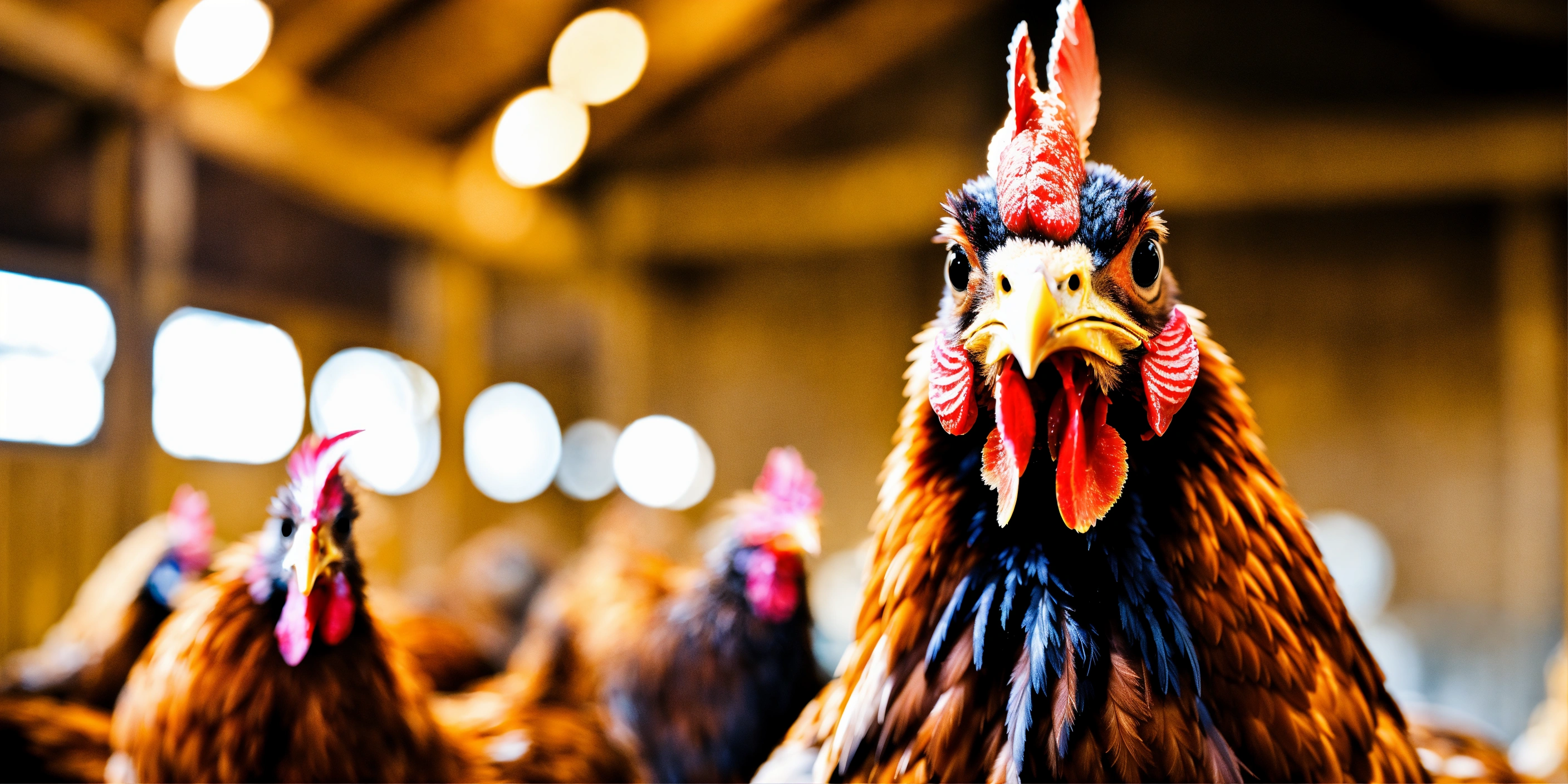 Photo of a chicken head looking into the camera standing in the middle of a large stable, high amount of blurred background