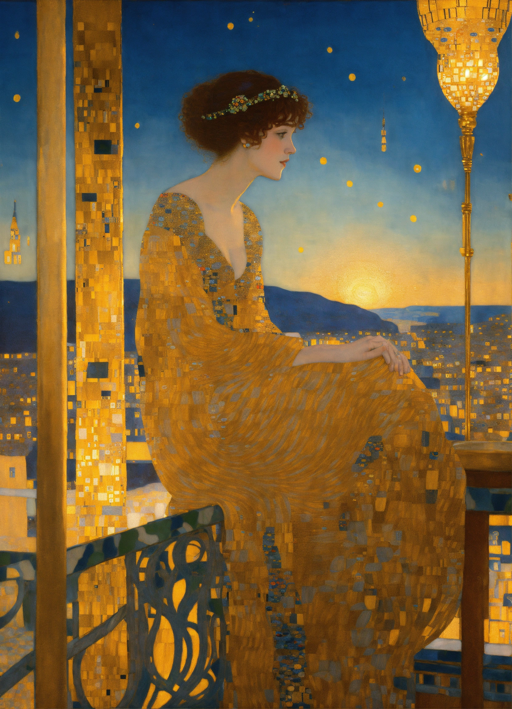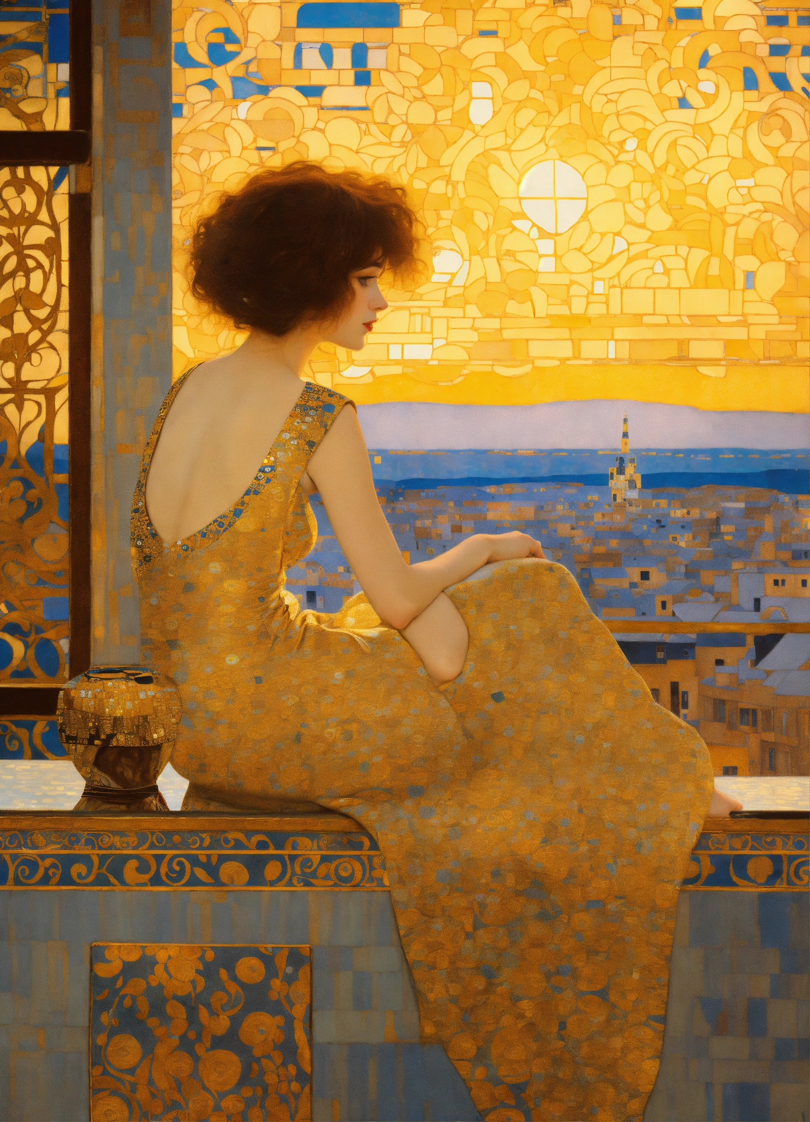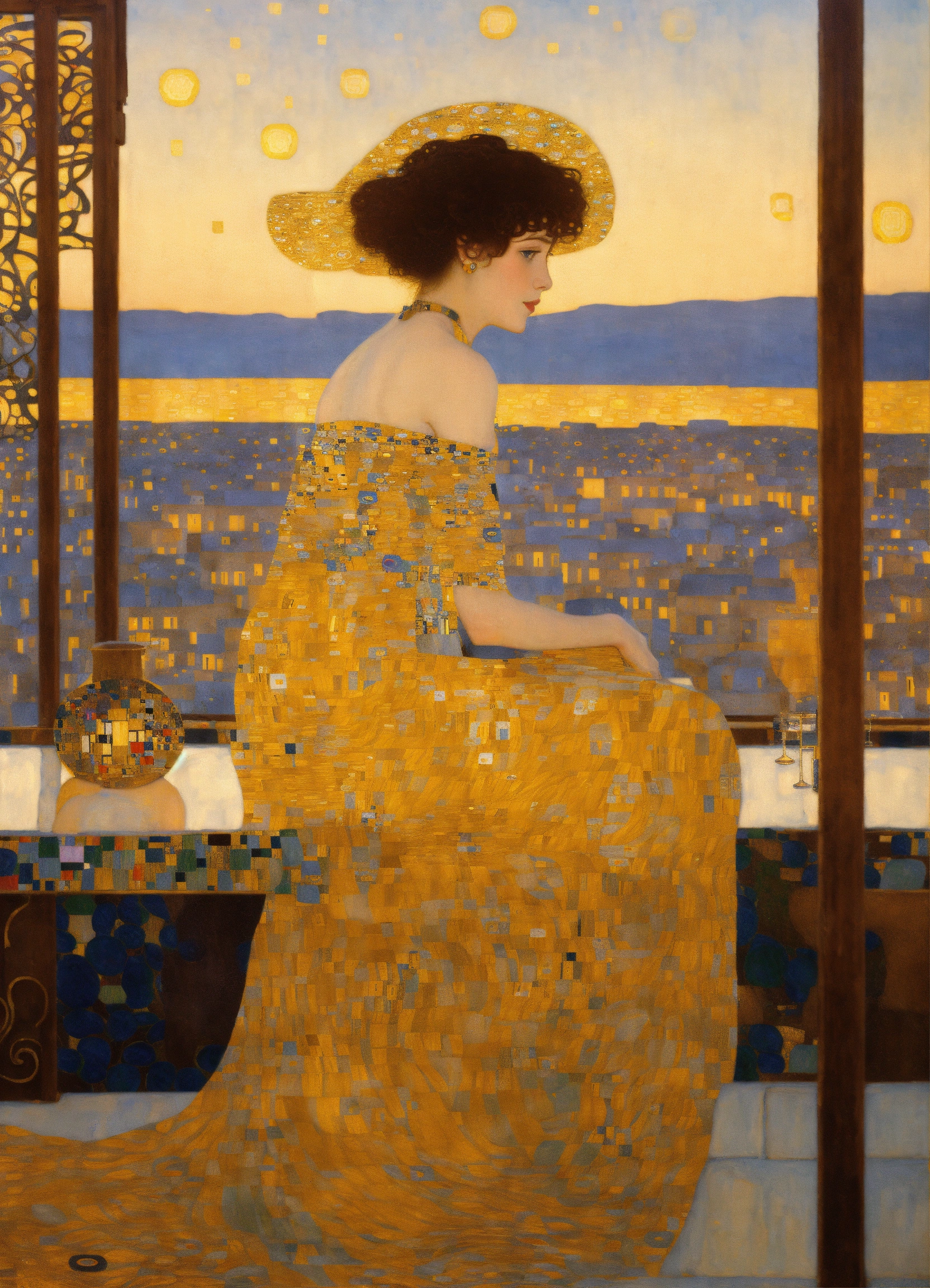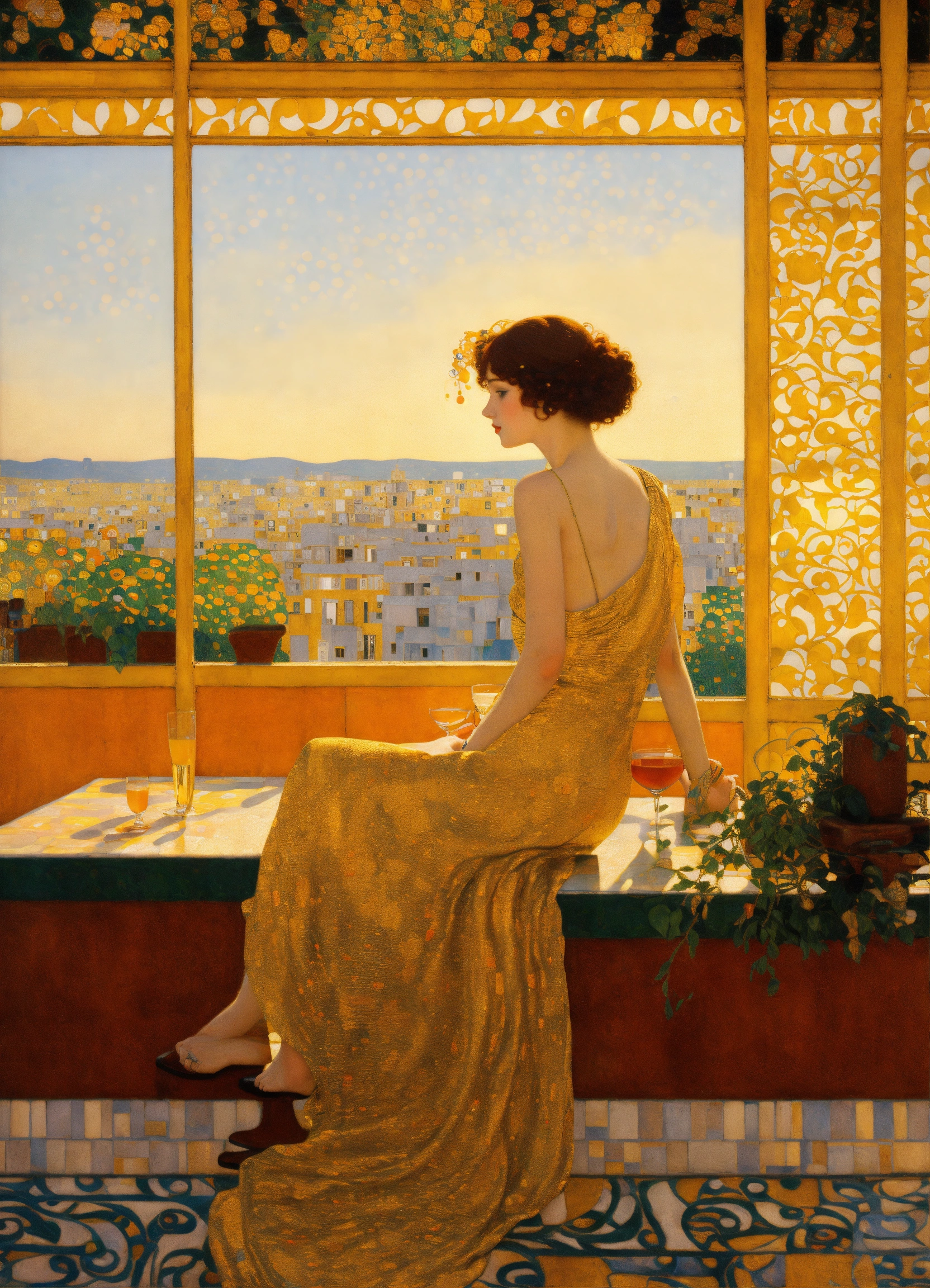 An elegant woman sitting in a bohemian rooftop bar with golden summer light, by gustav klimt art, deco art nouveau style, stunning intricate details.