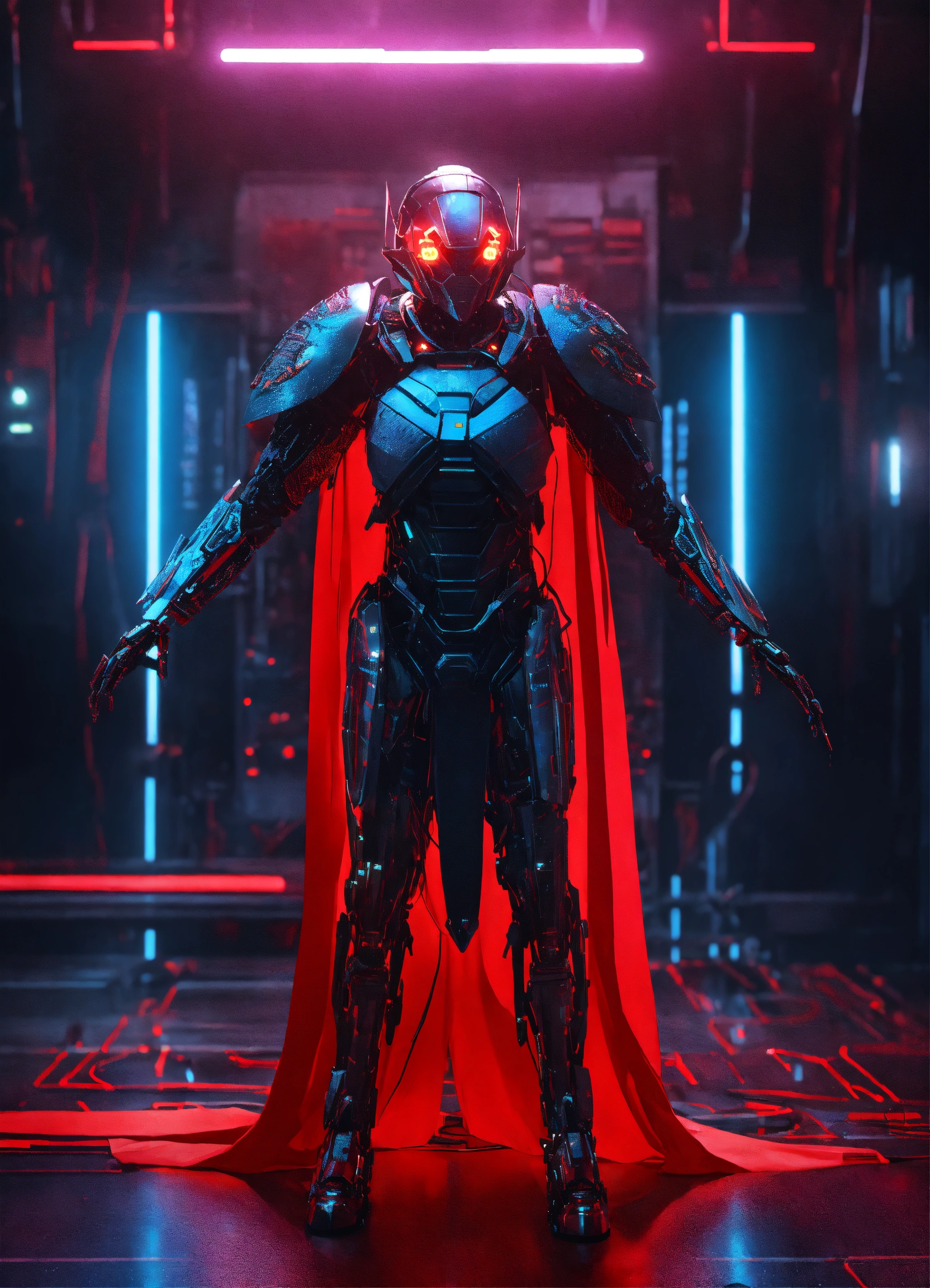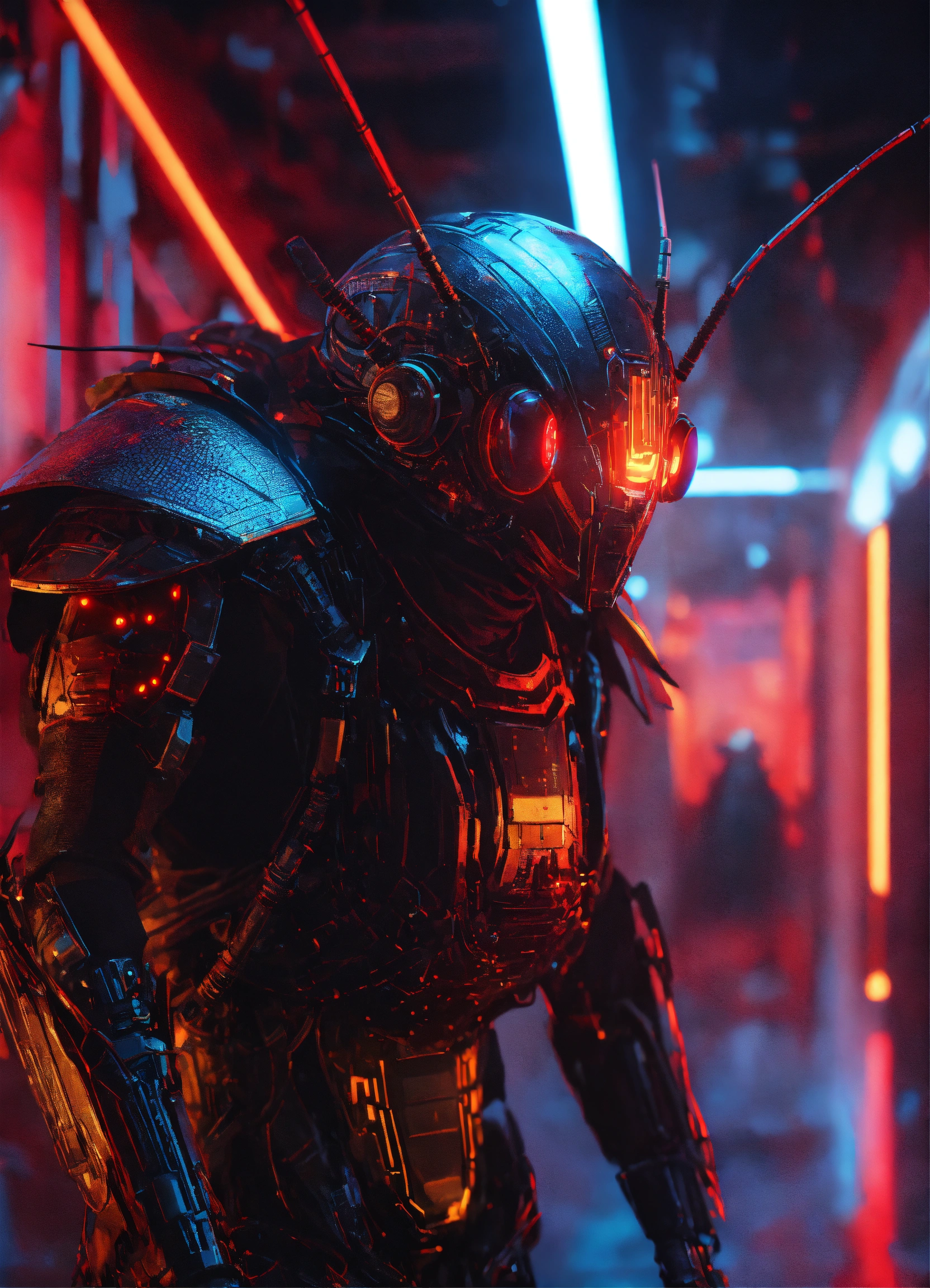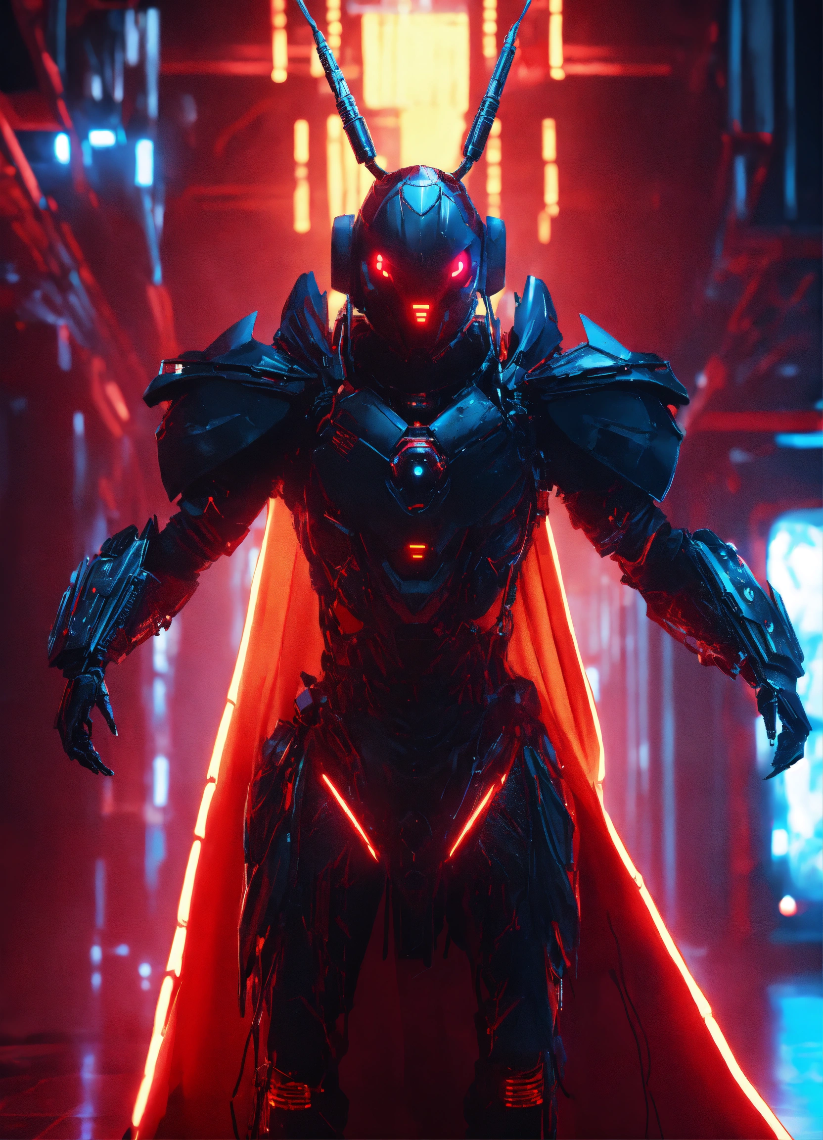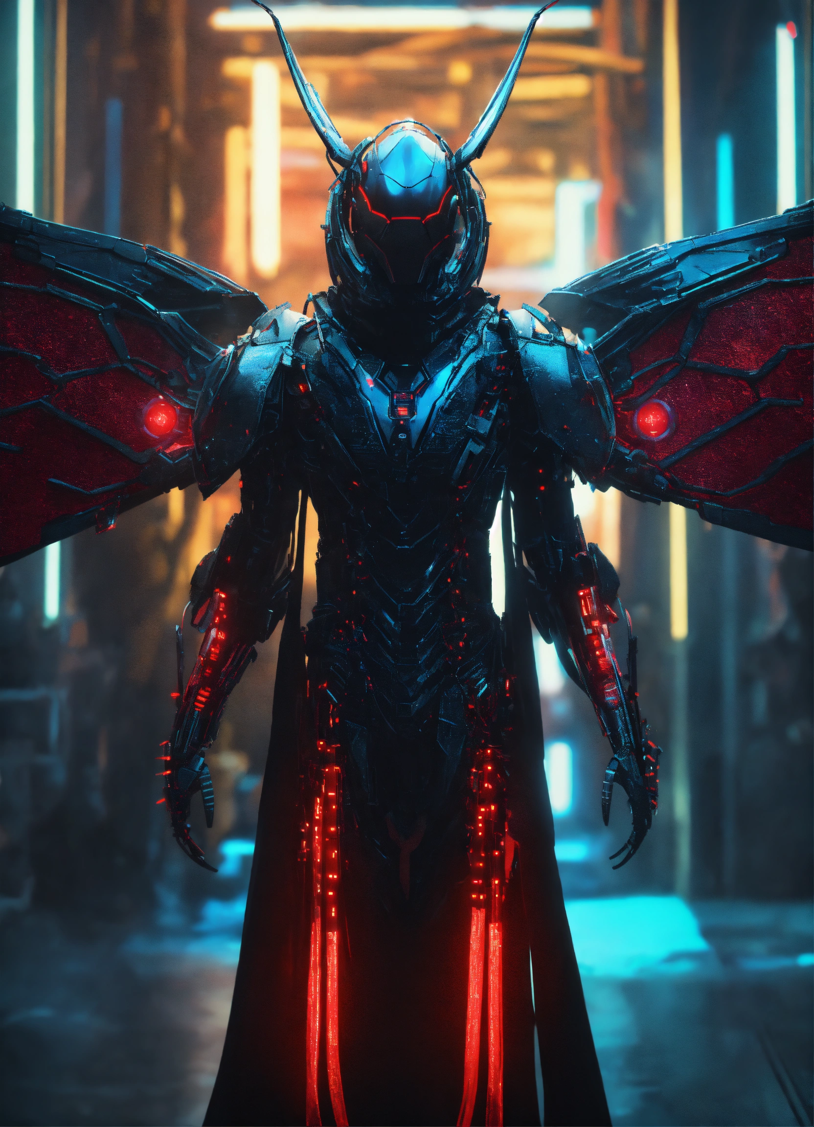 Zoom out of black cockroach faced humanoid with red glowing eyes, circuitry decor, and long draped down colorful cape like wings and hi-tech armored humanoid body, interrogating a creature in hi-tech futuristic dungeon, realistic, 8k