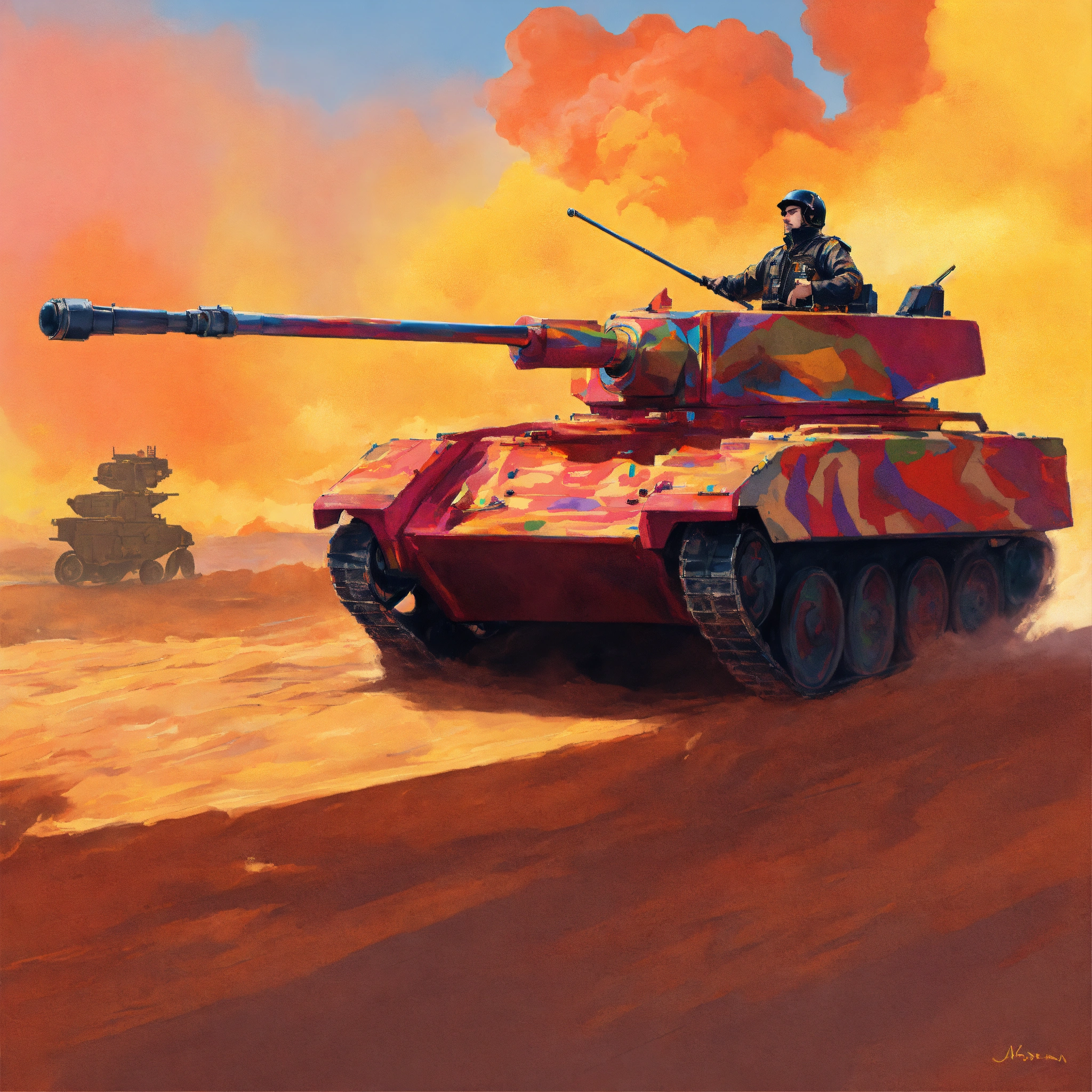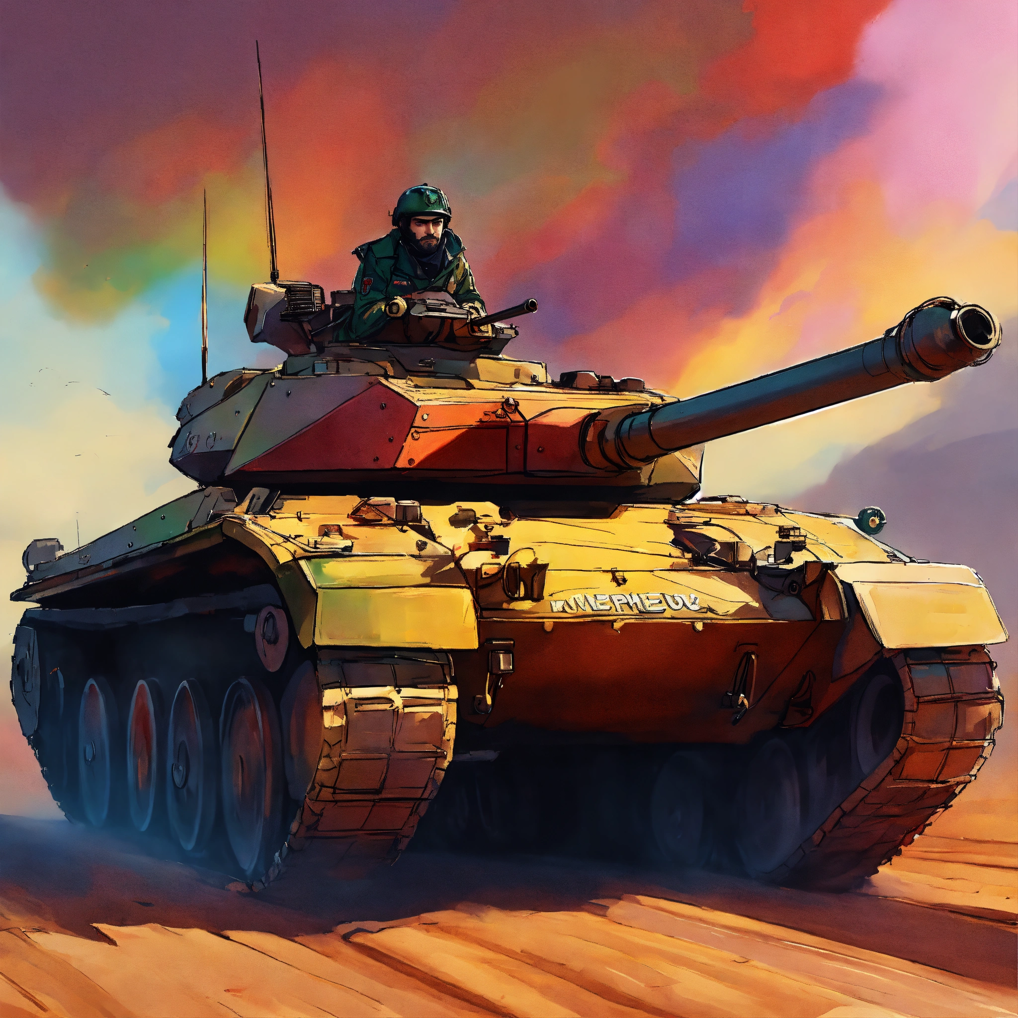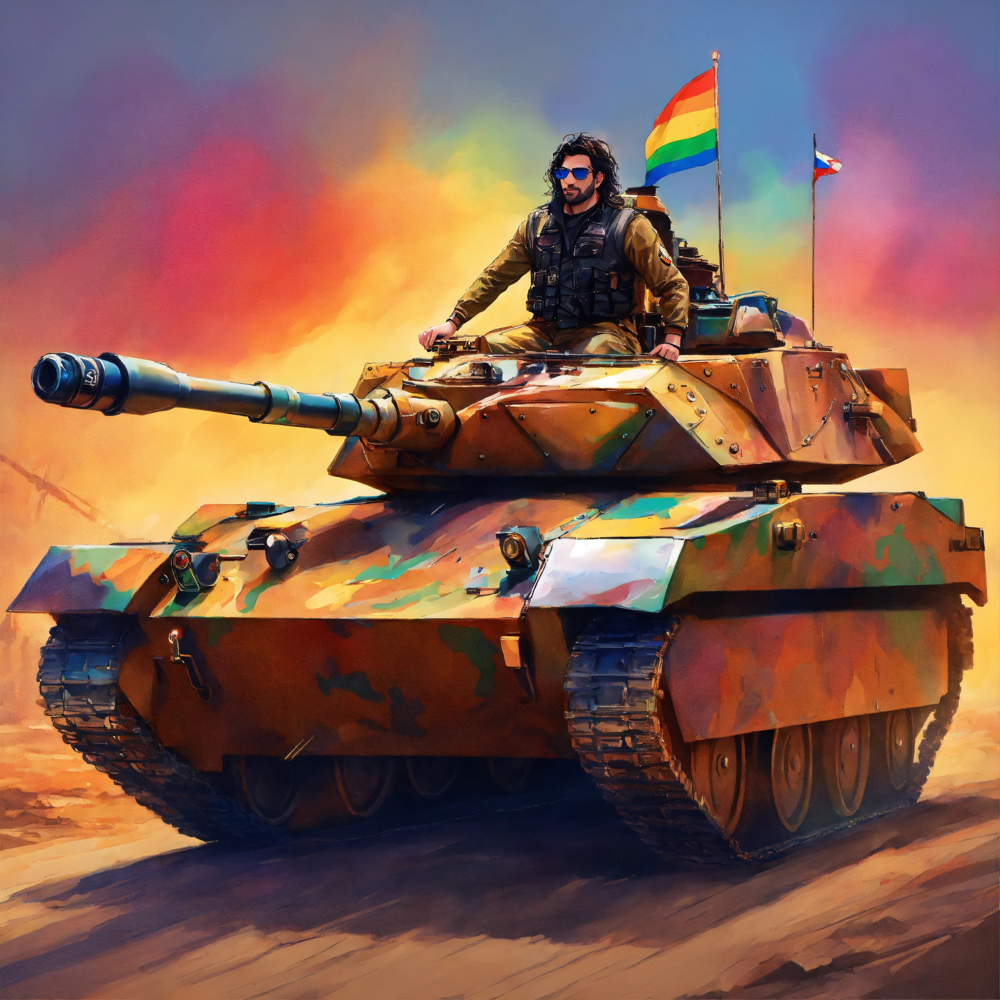 A picture of offer nissim riding a tank painted in the colors of pride
