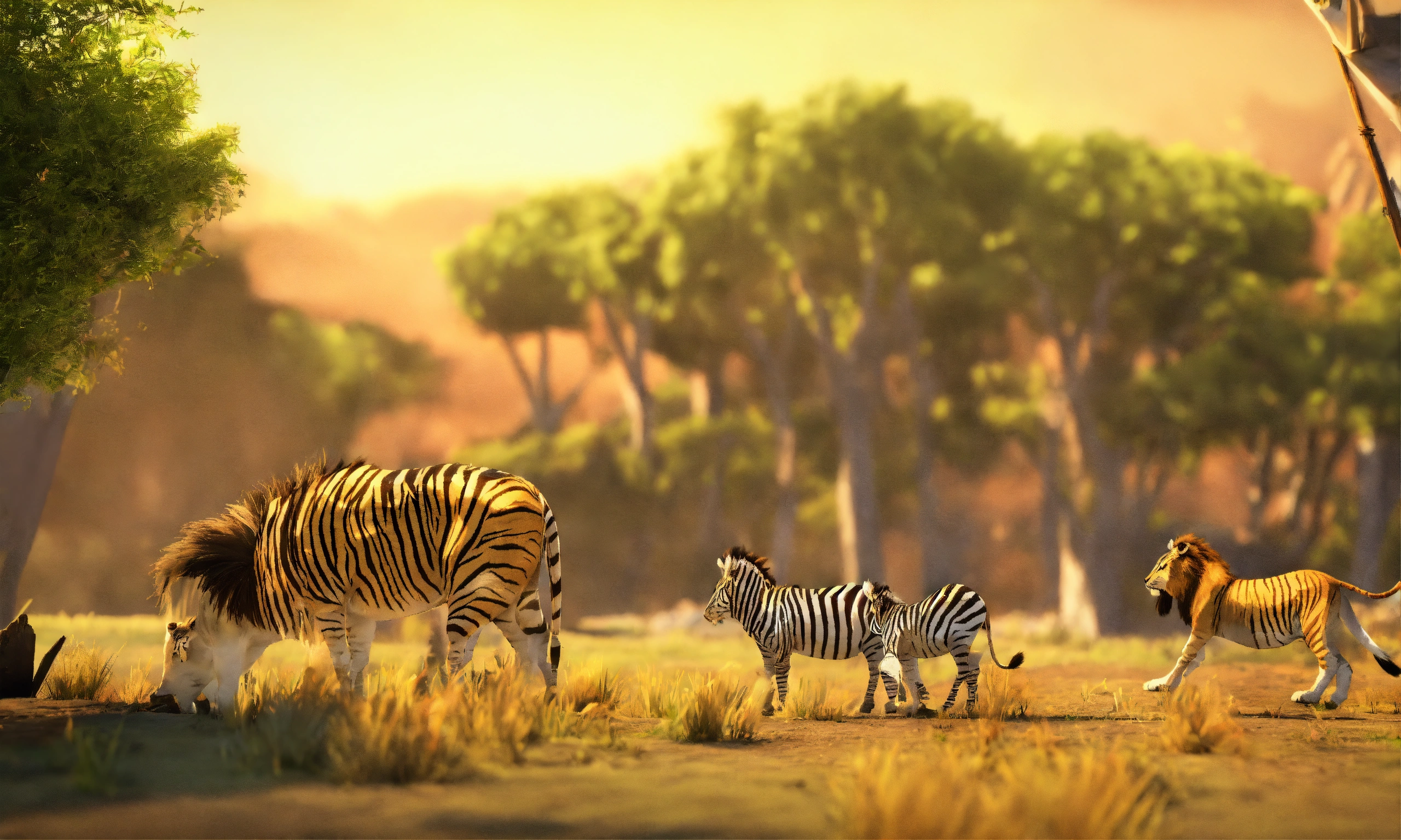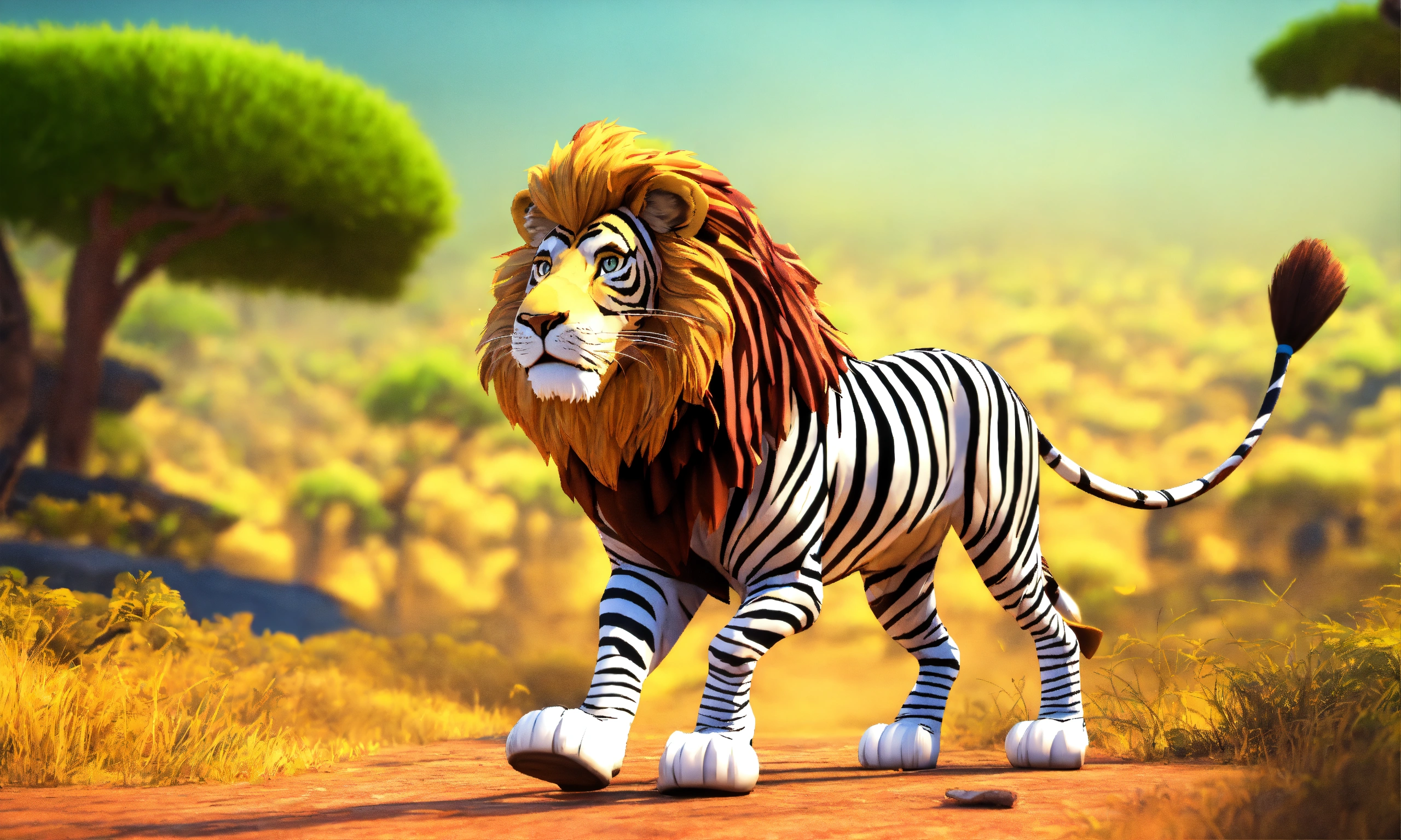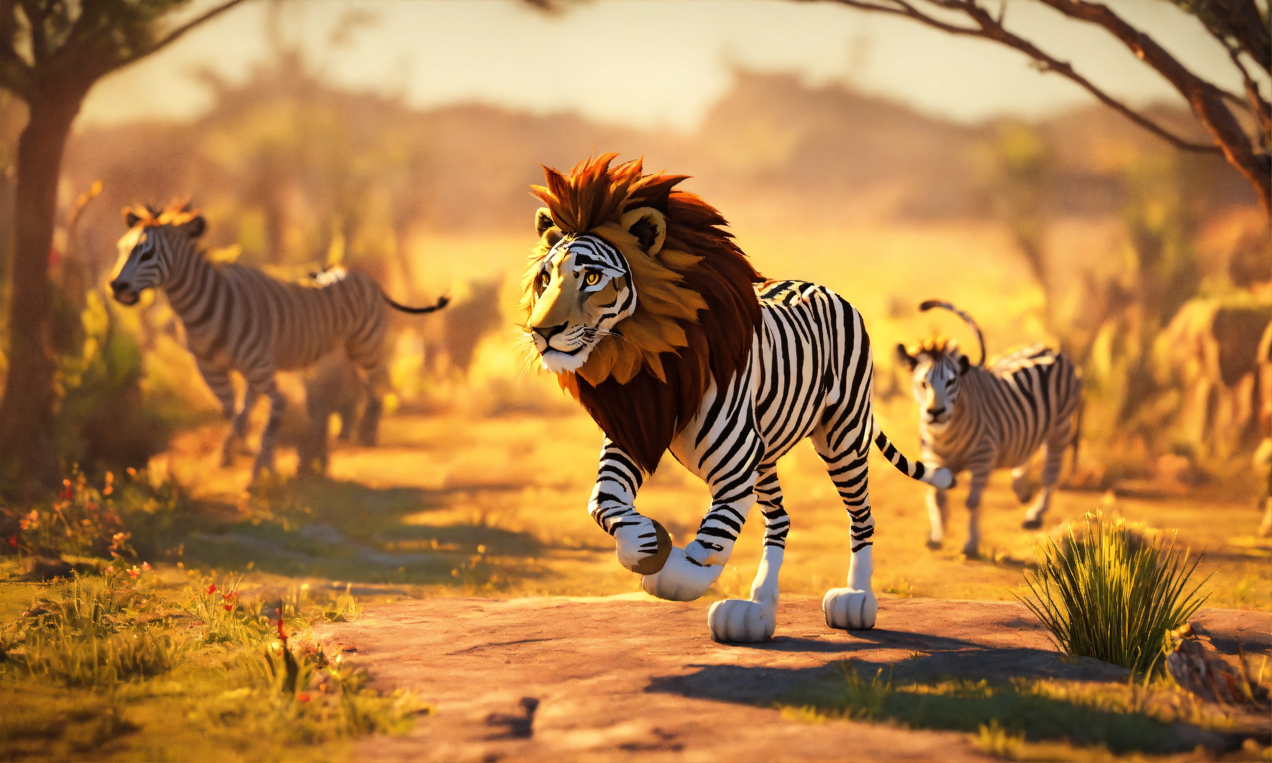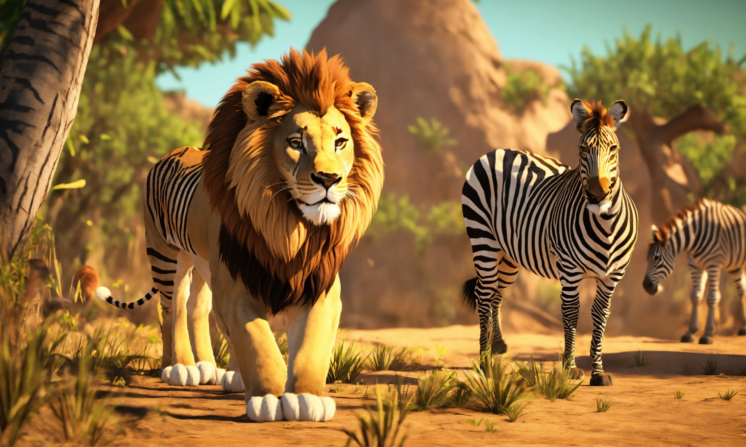 3d animation style cartoon lion hunting zebra