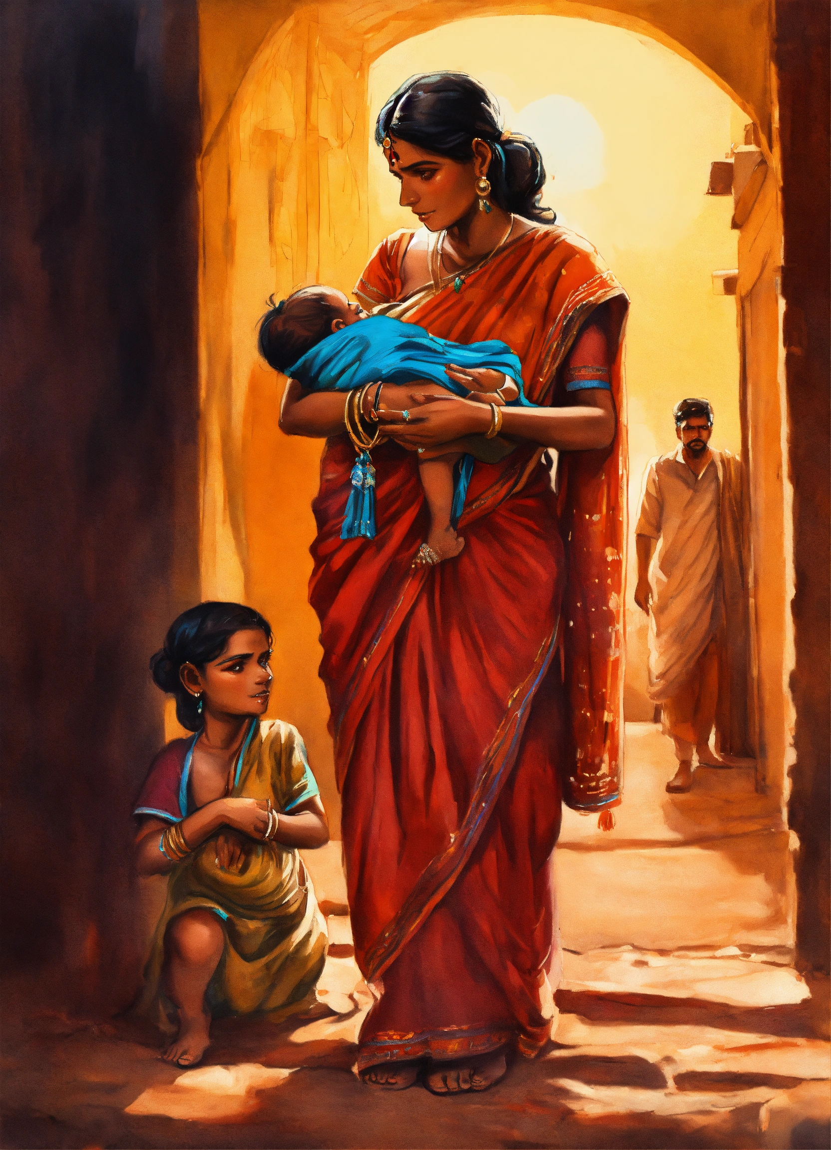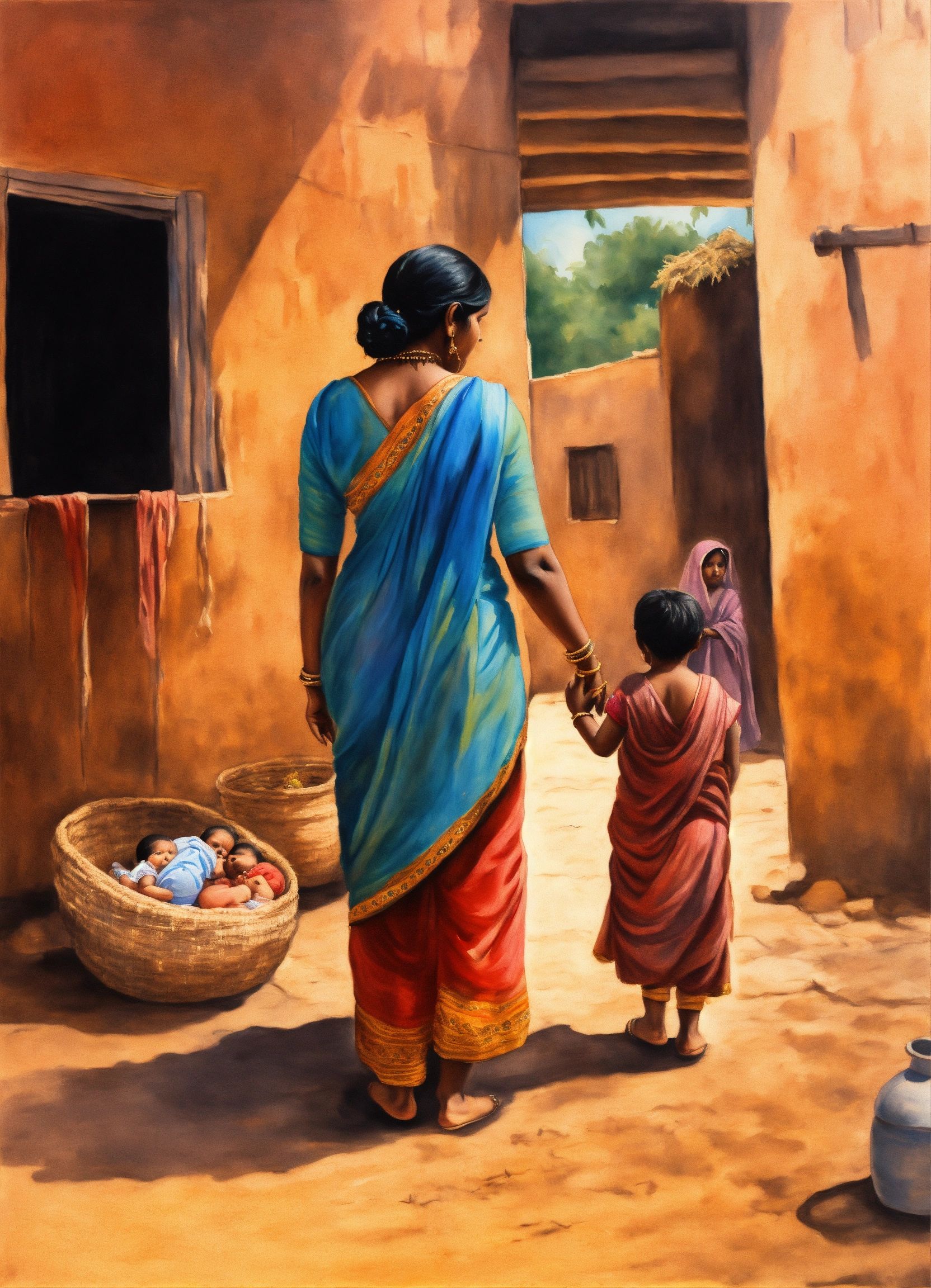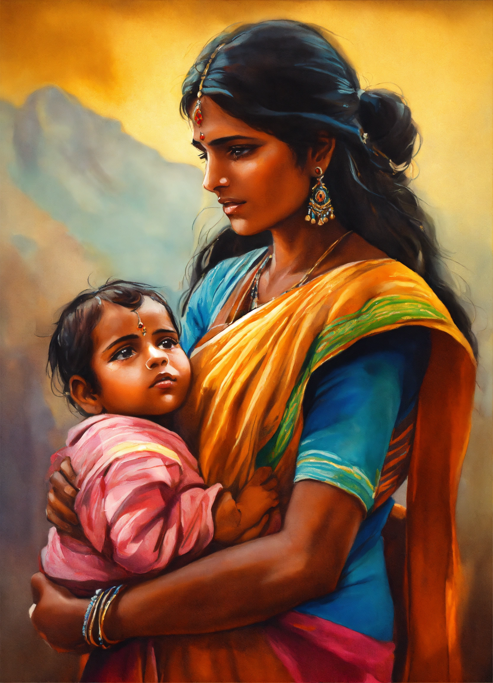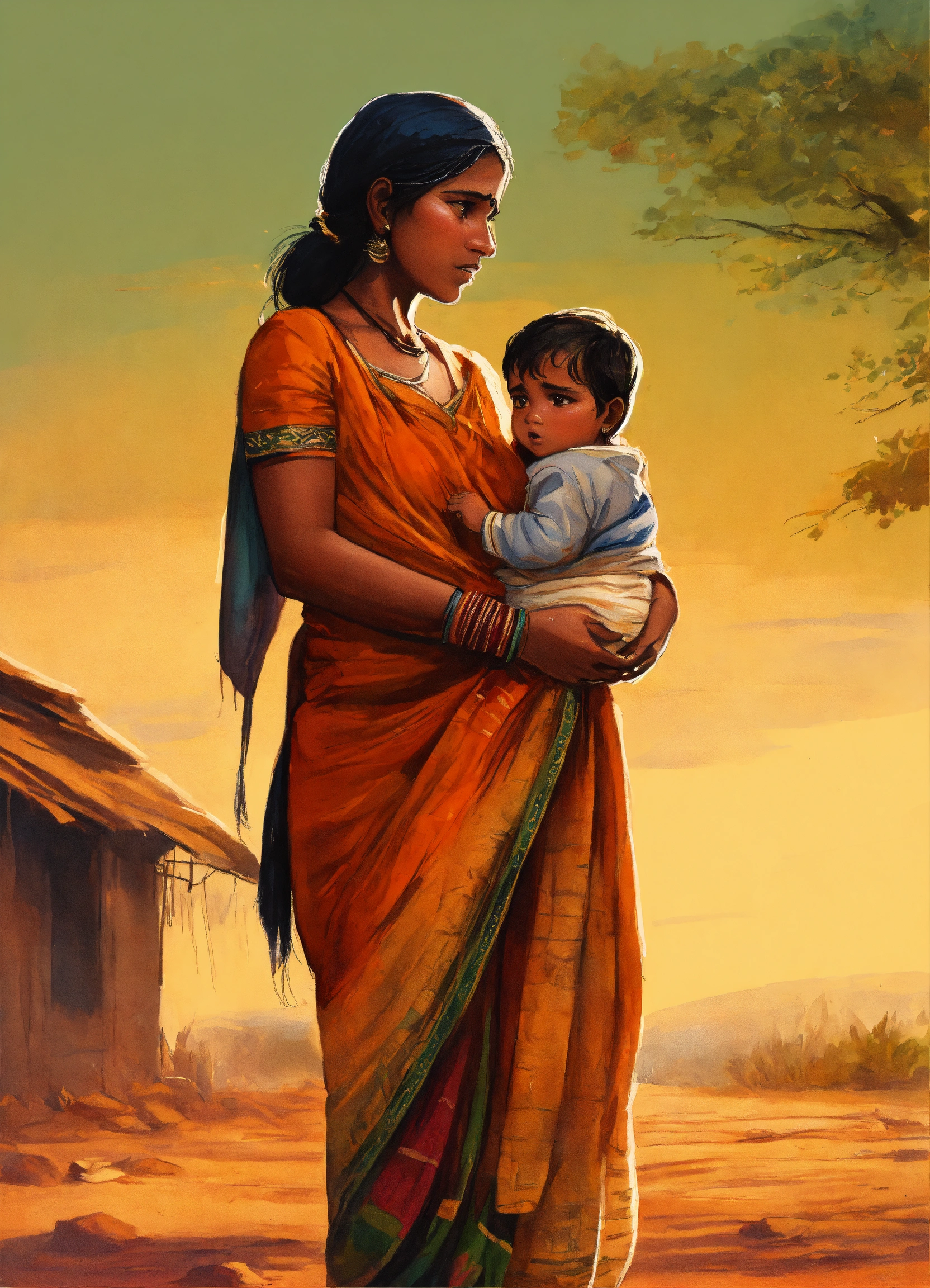 A hand drawn painting of a poor indian women who is about to deliver a baby, with her first boy child standing near her, 8k, sharp, detailed, vibrant, vivid