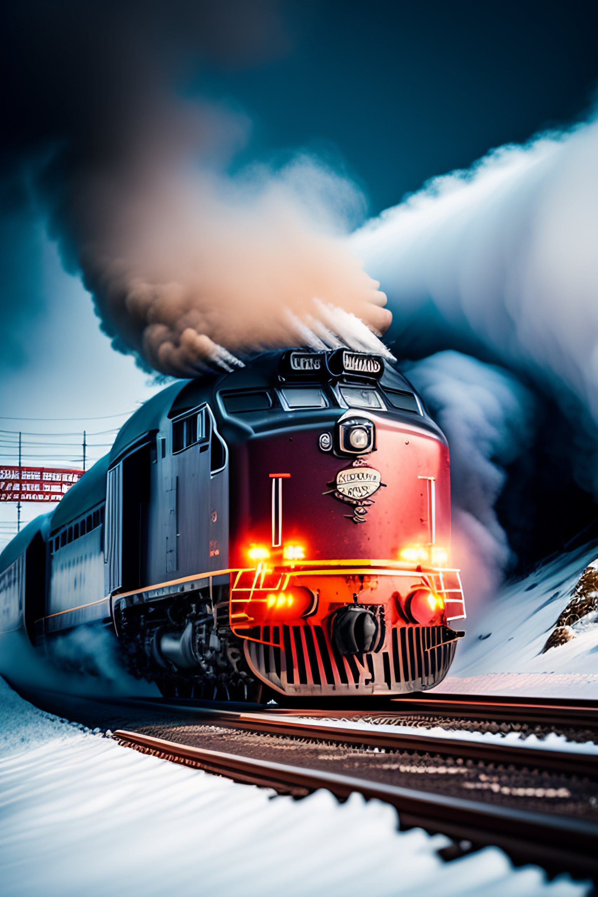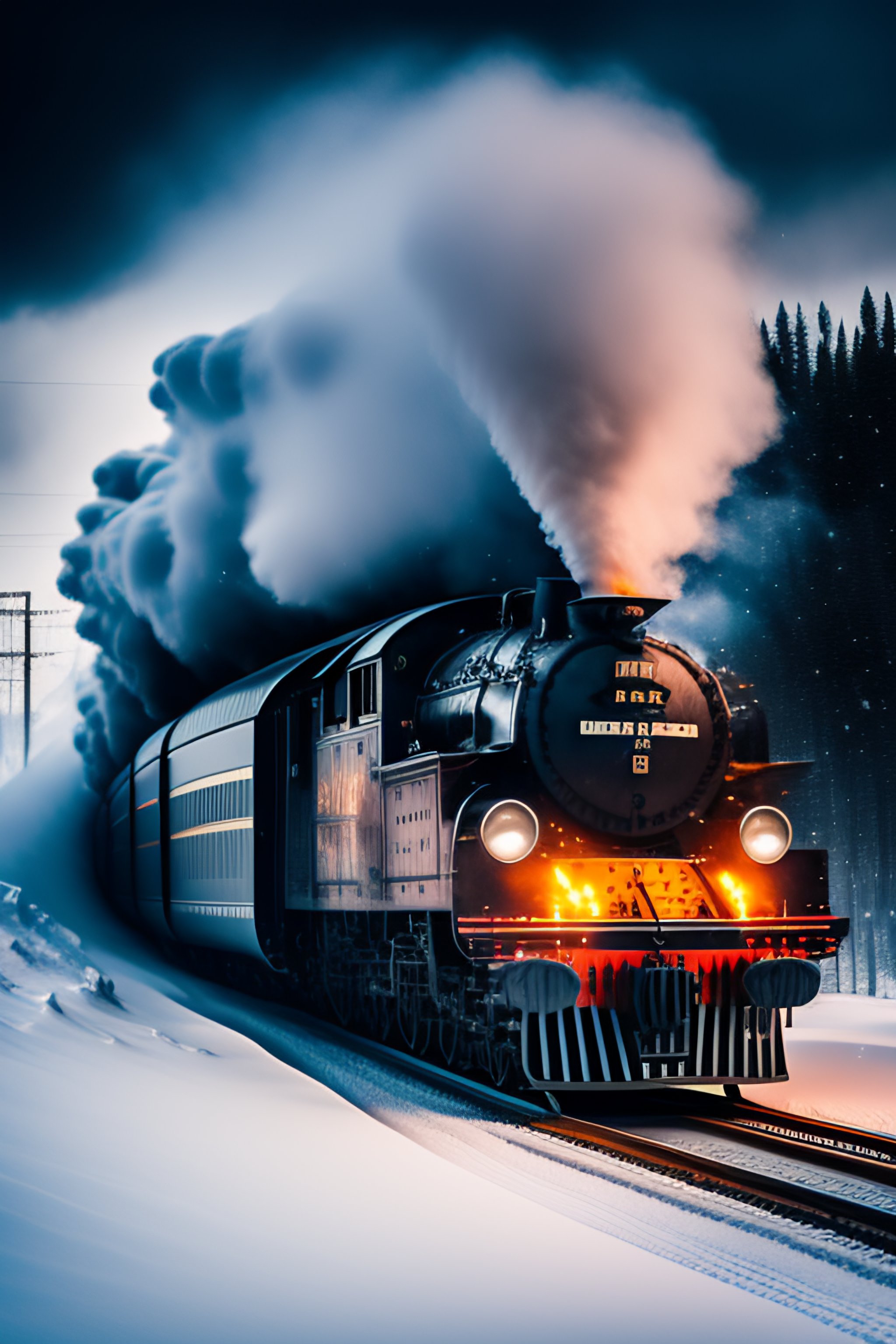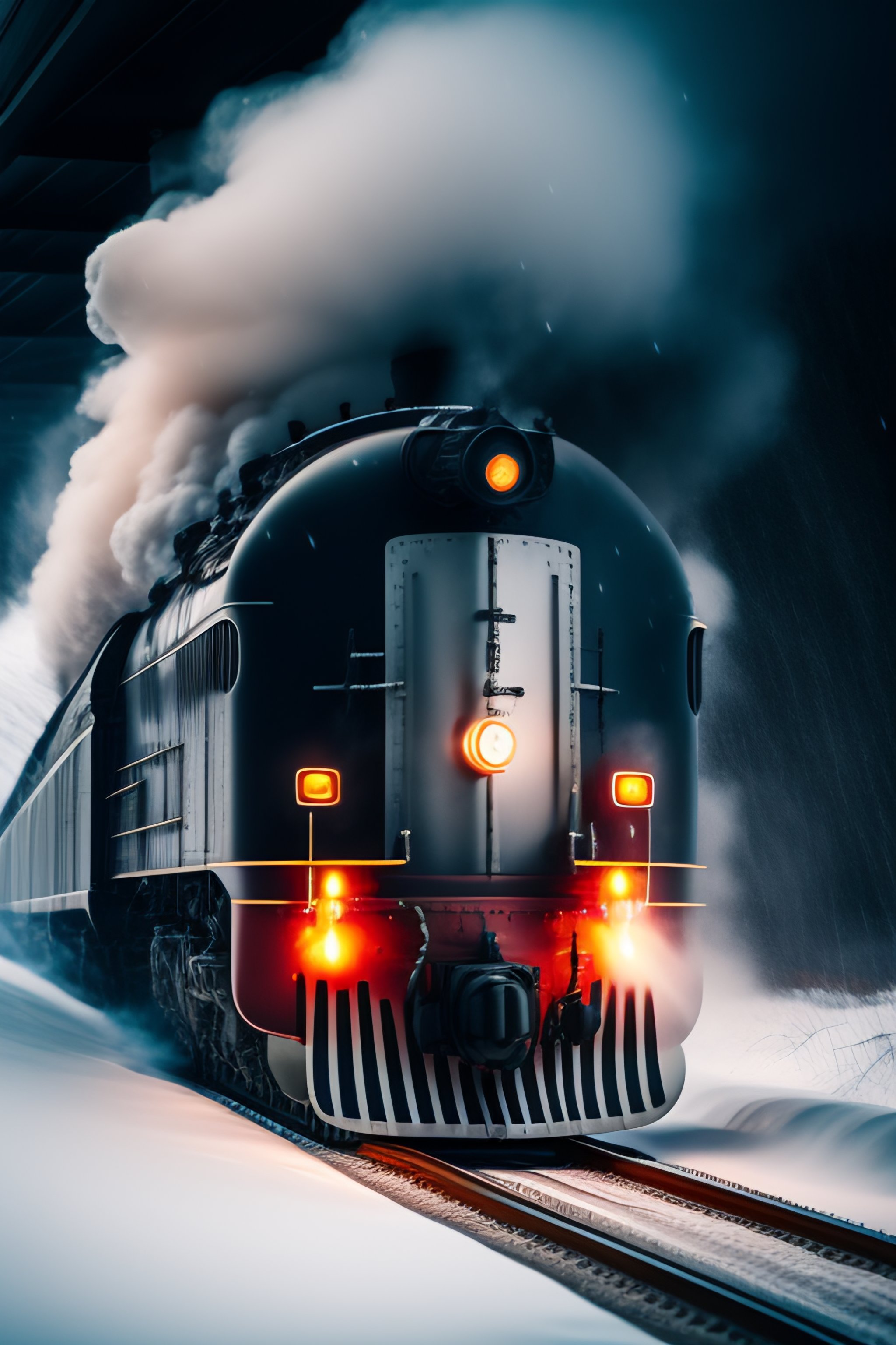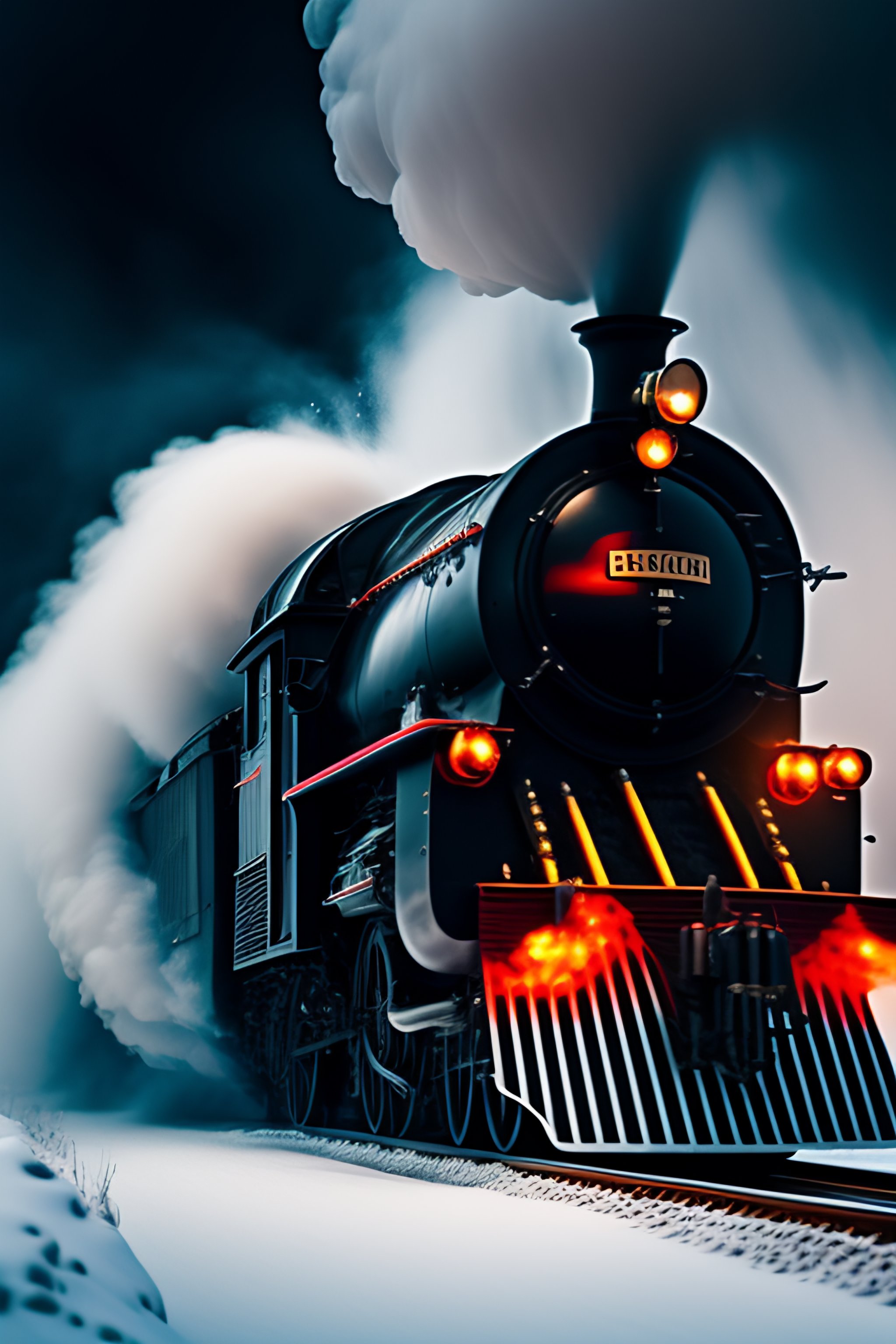 An old locomotive rushing through snow storm in high speed, white steam on the side, dark smoke with fire! from the pipes, dynamic angled shot, speed lines, fire particles and snowflakes everywhere