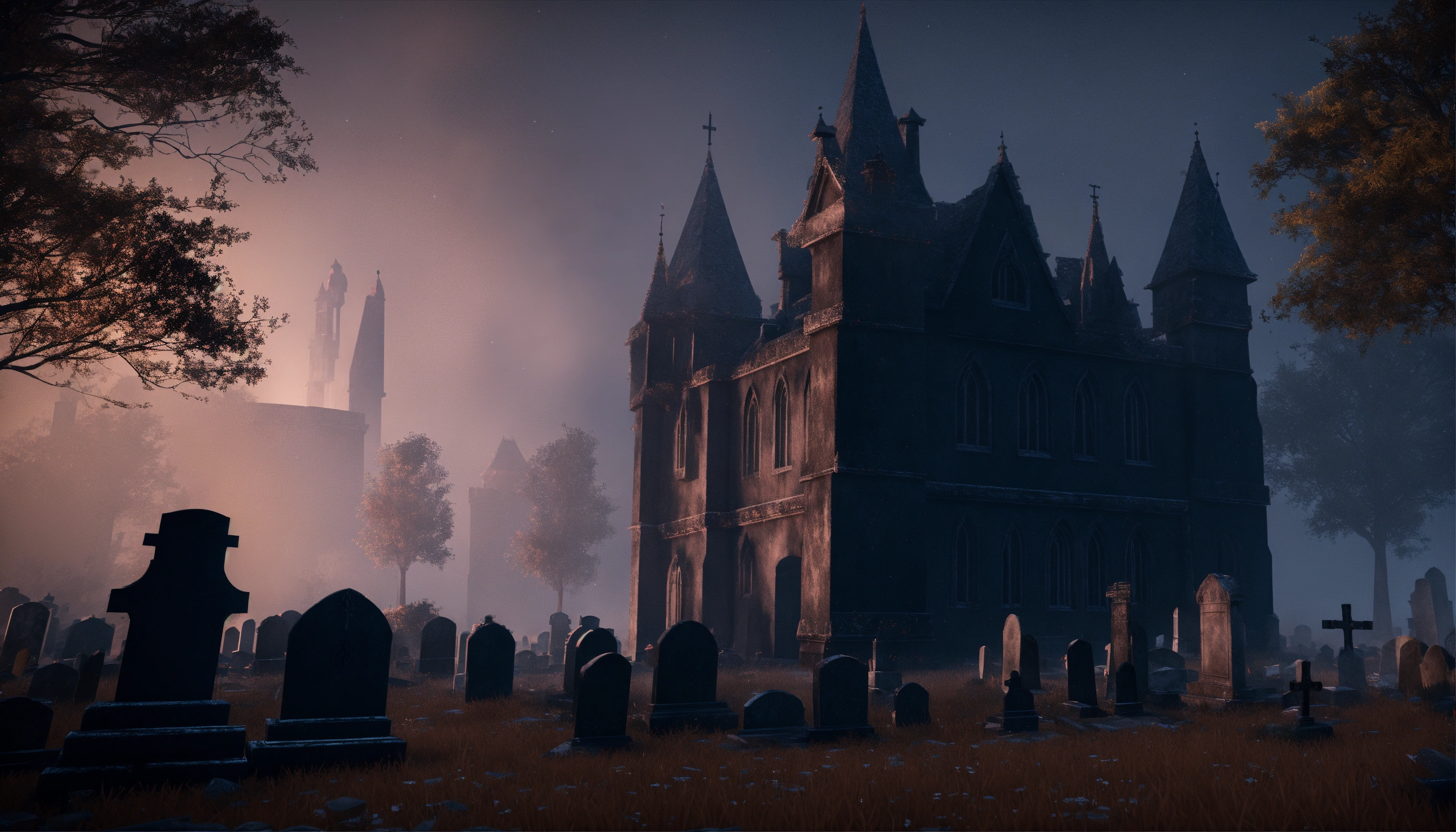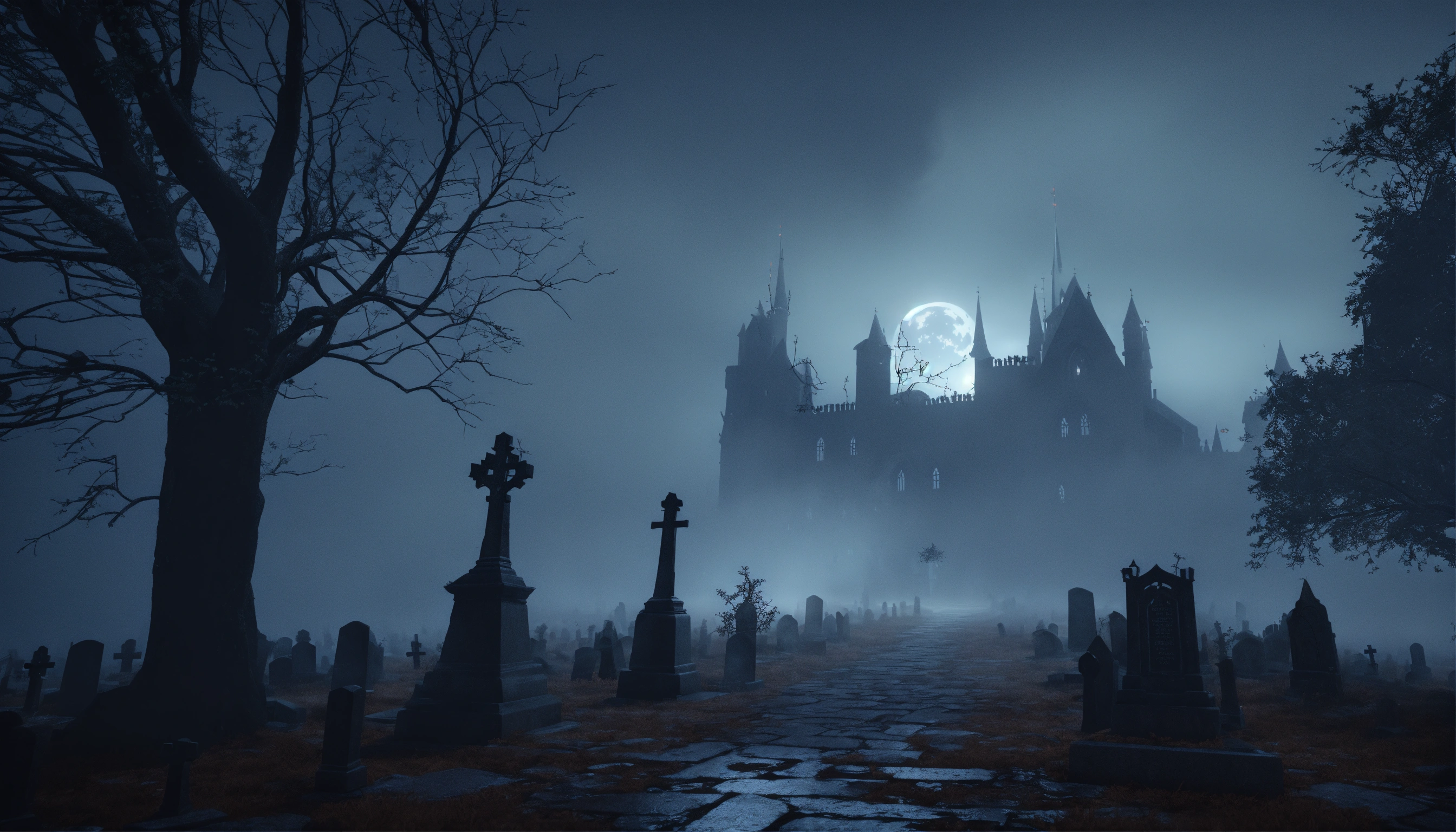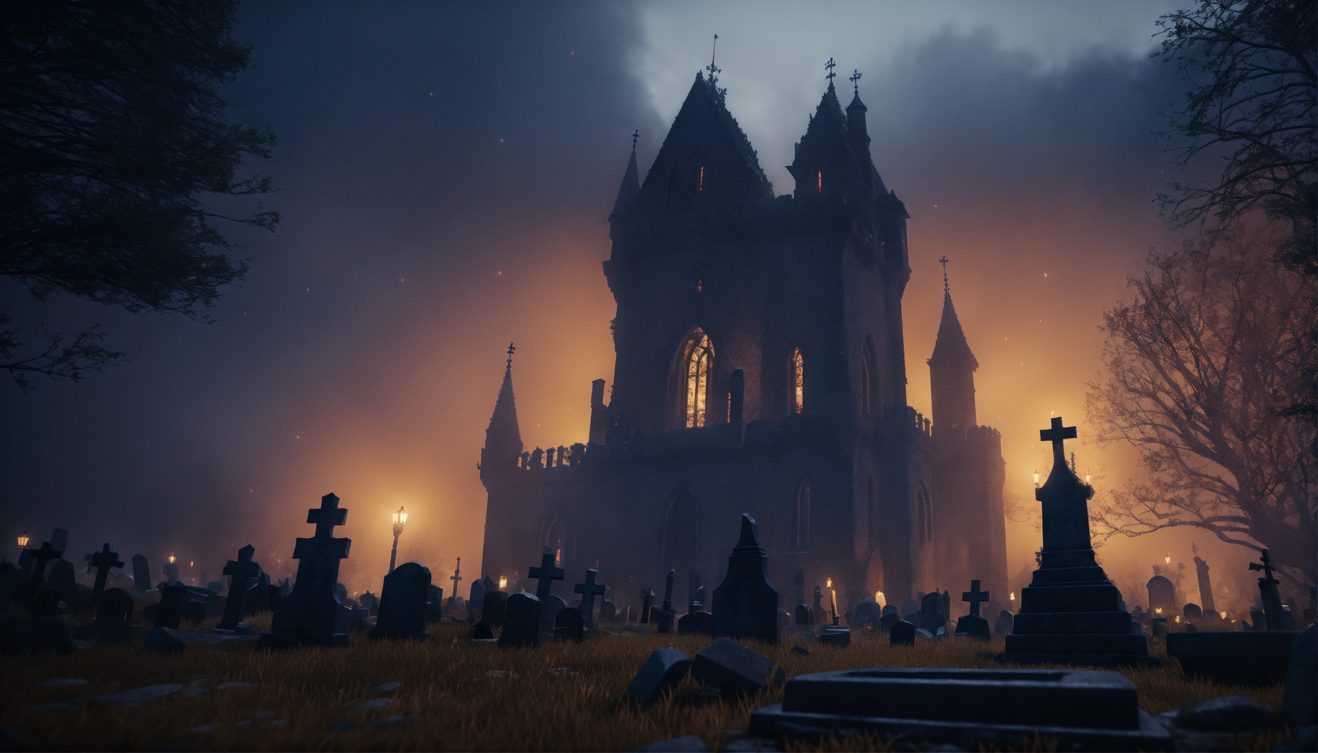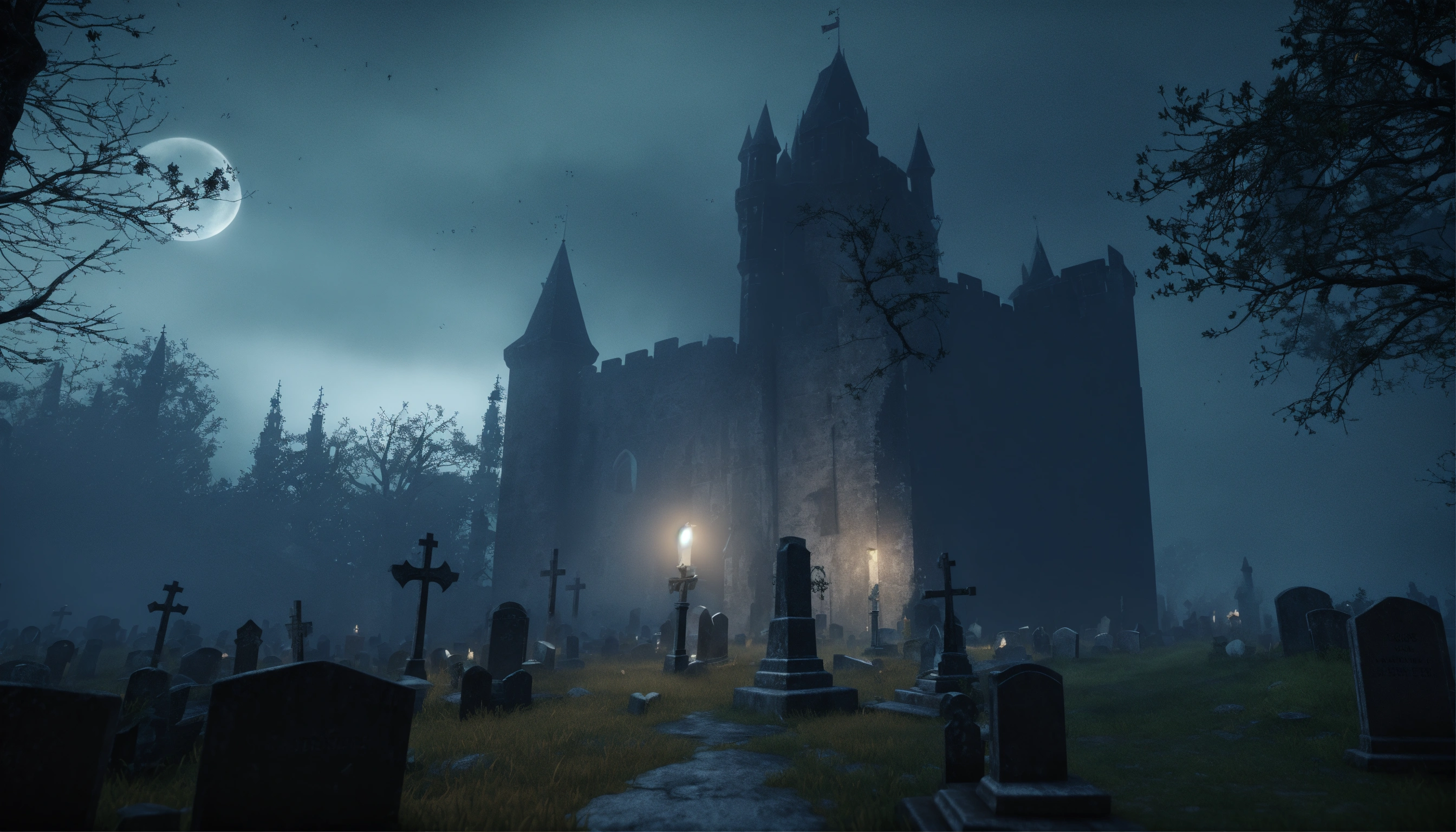 Graveyard, dark castle far away in the background, foggy, mystery, dark environment at night, 3d render, unreal engine 5