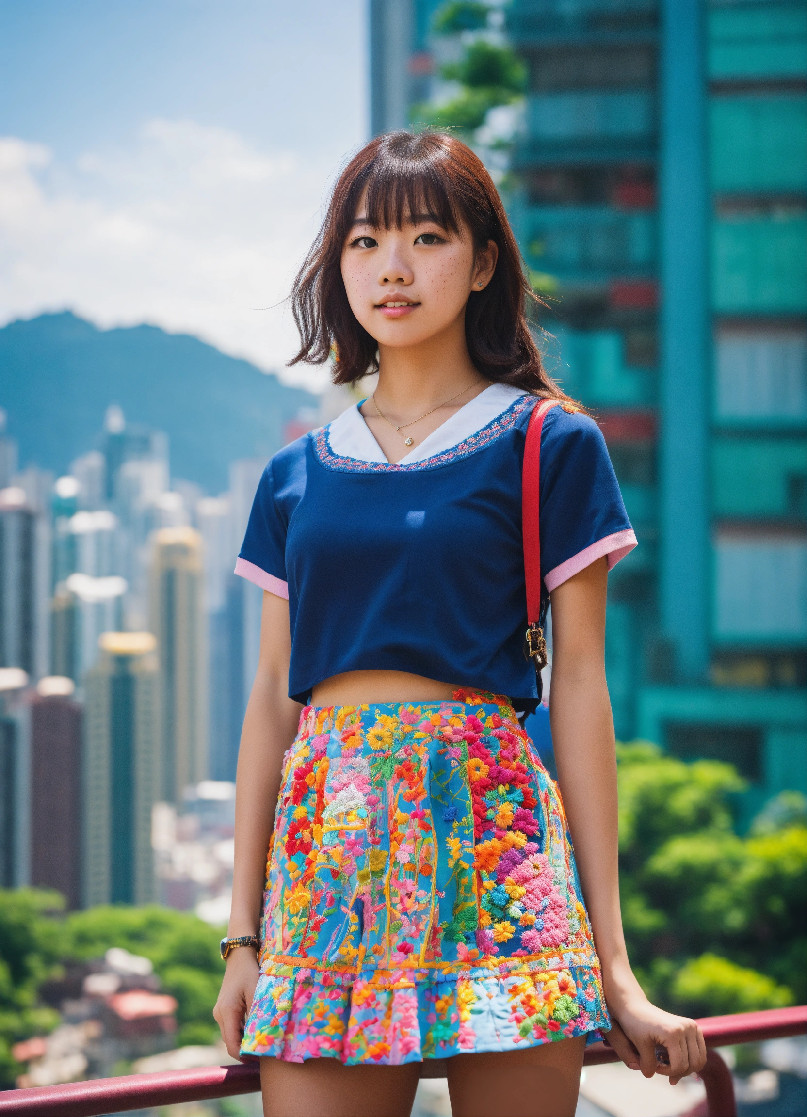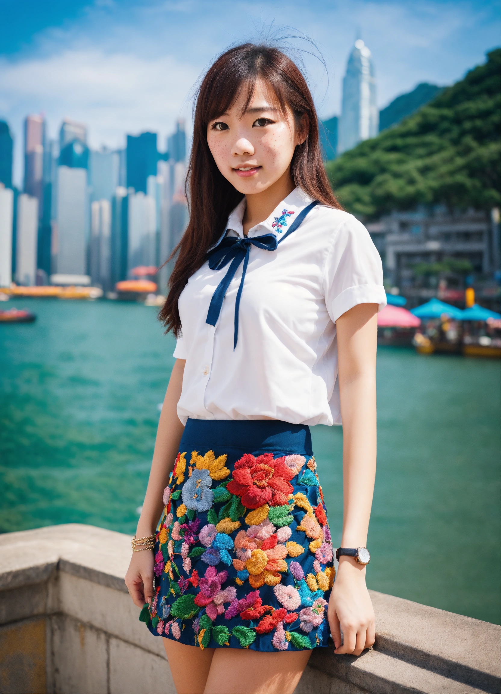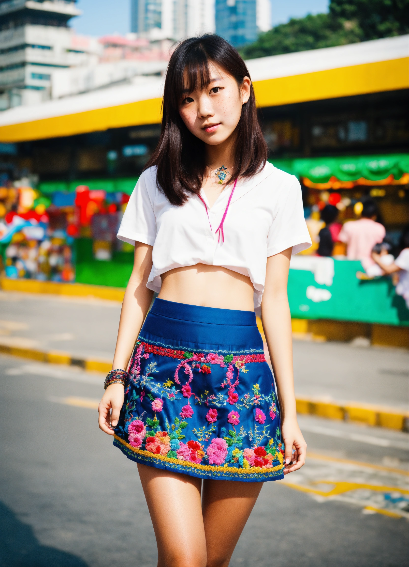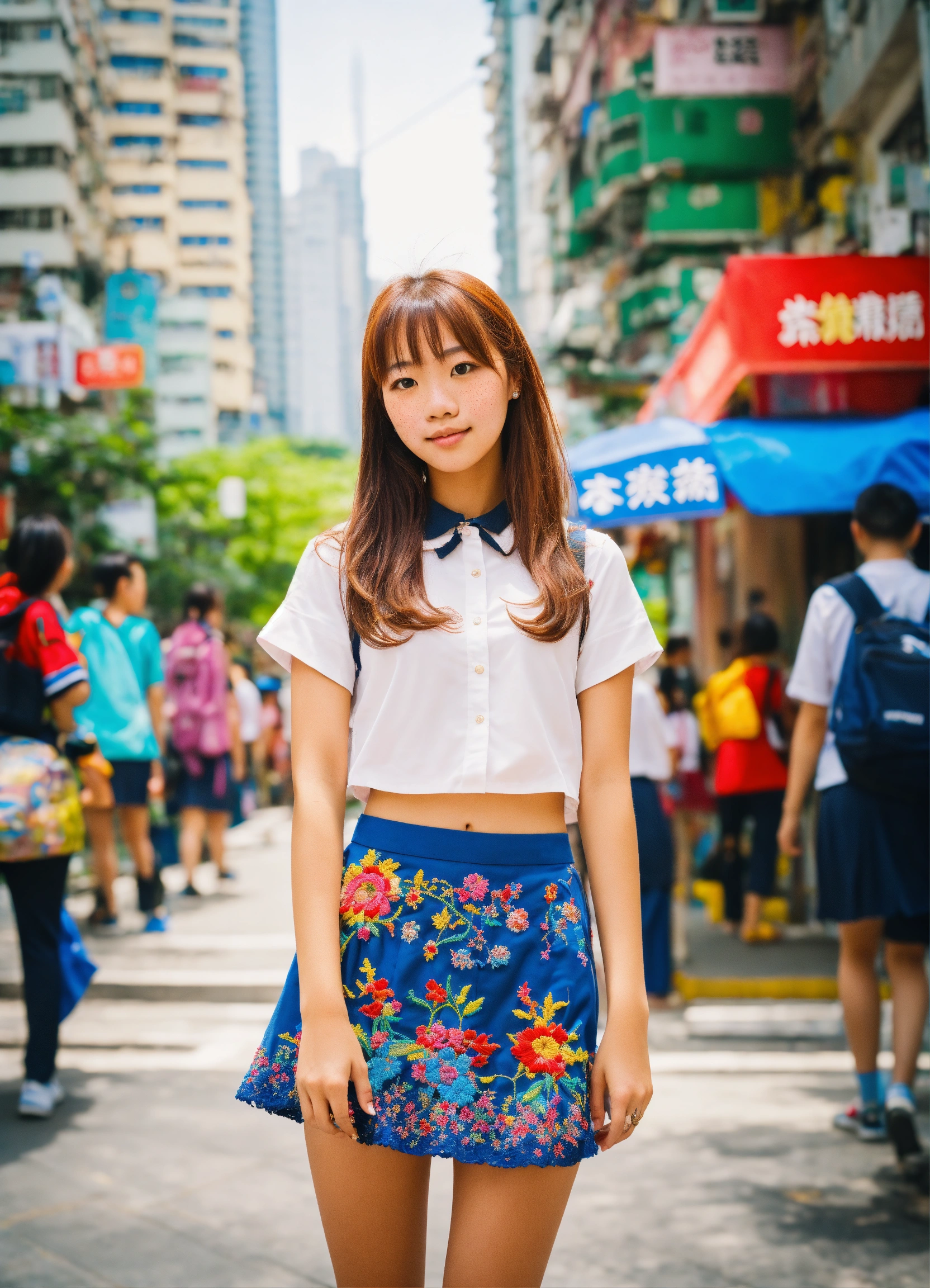 Front view, beautiful hong kong schoolgirl with freckles, pretty outlook, cutie face, shiny eyes, wearing a colorful, vibrant, detailed embroidered mini skirt, wide shot, low angle, sunny day, standing, city background