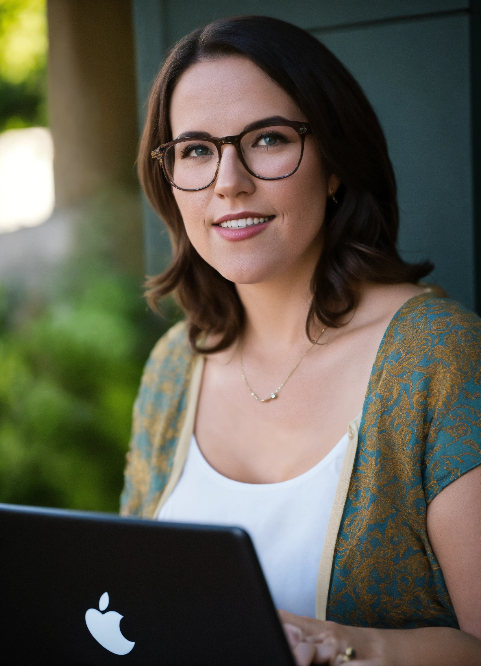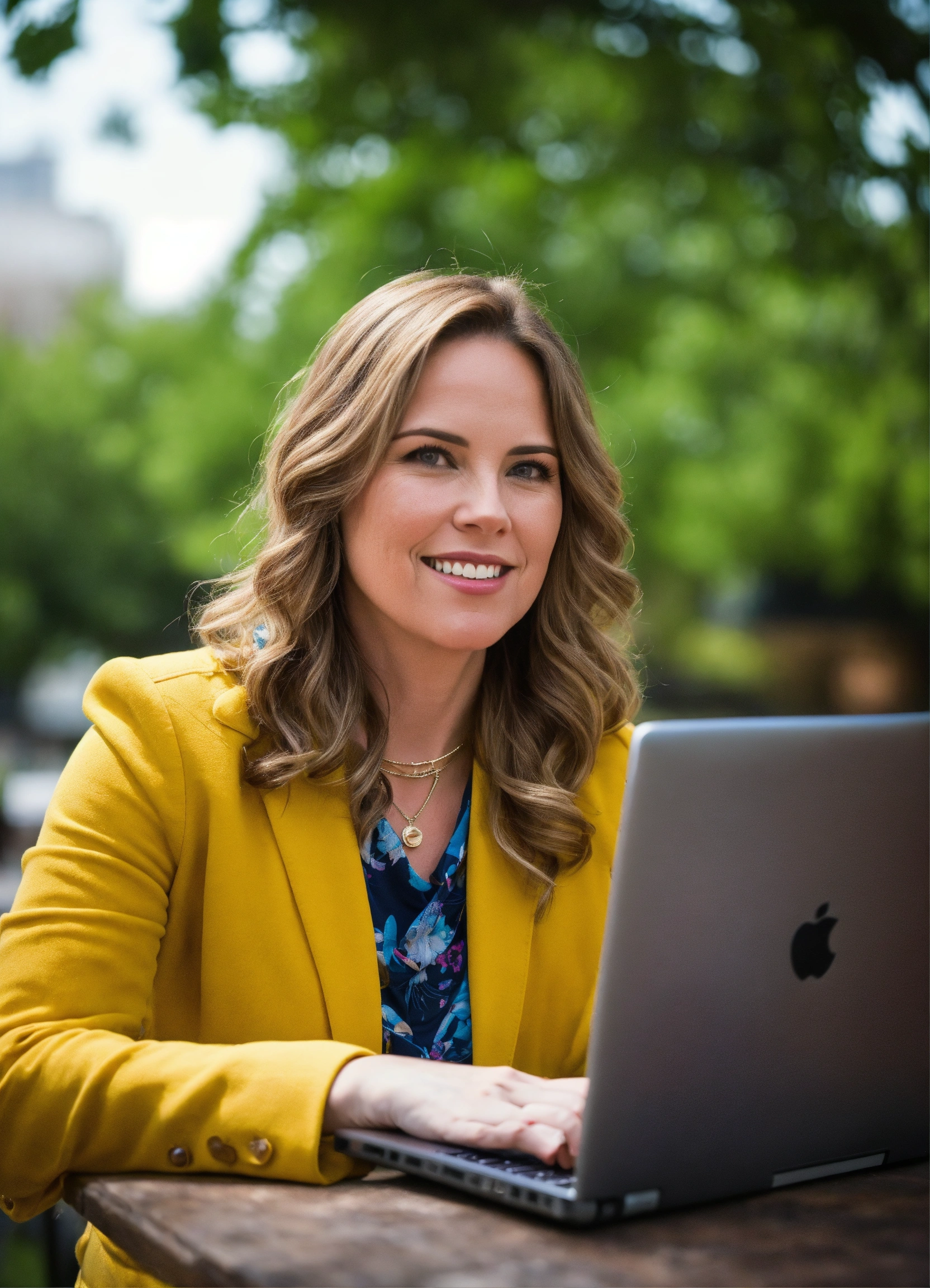 A 40 year old woman named jessica is passionate about gender equality, and regularly follows news and updates about these issues on social media. she also participates and engages in online discussions and forums about these issues, and engages with others who share her views or have different perspectives. jessica also uses social media to stay informed about events and campaigns related to the causes she cares about. she shares information about these events and campaigns with her followers, and encourages them to get involved. show her using the laptop. she does this from her outdoor patio.