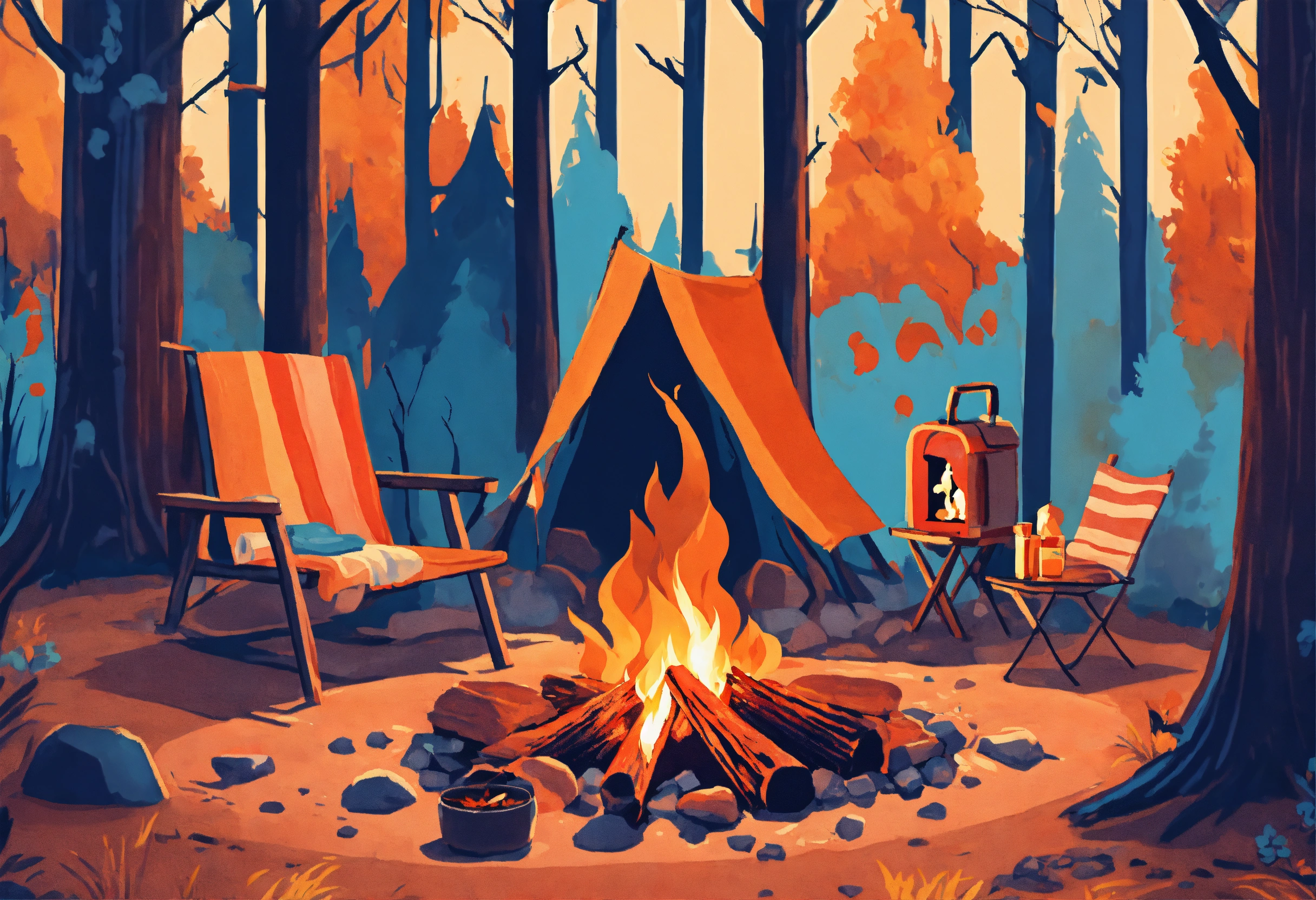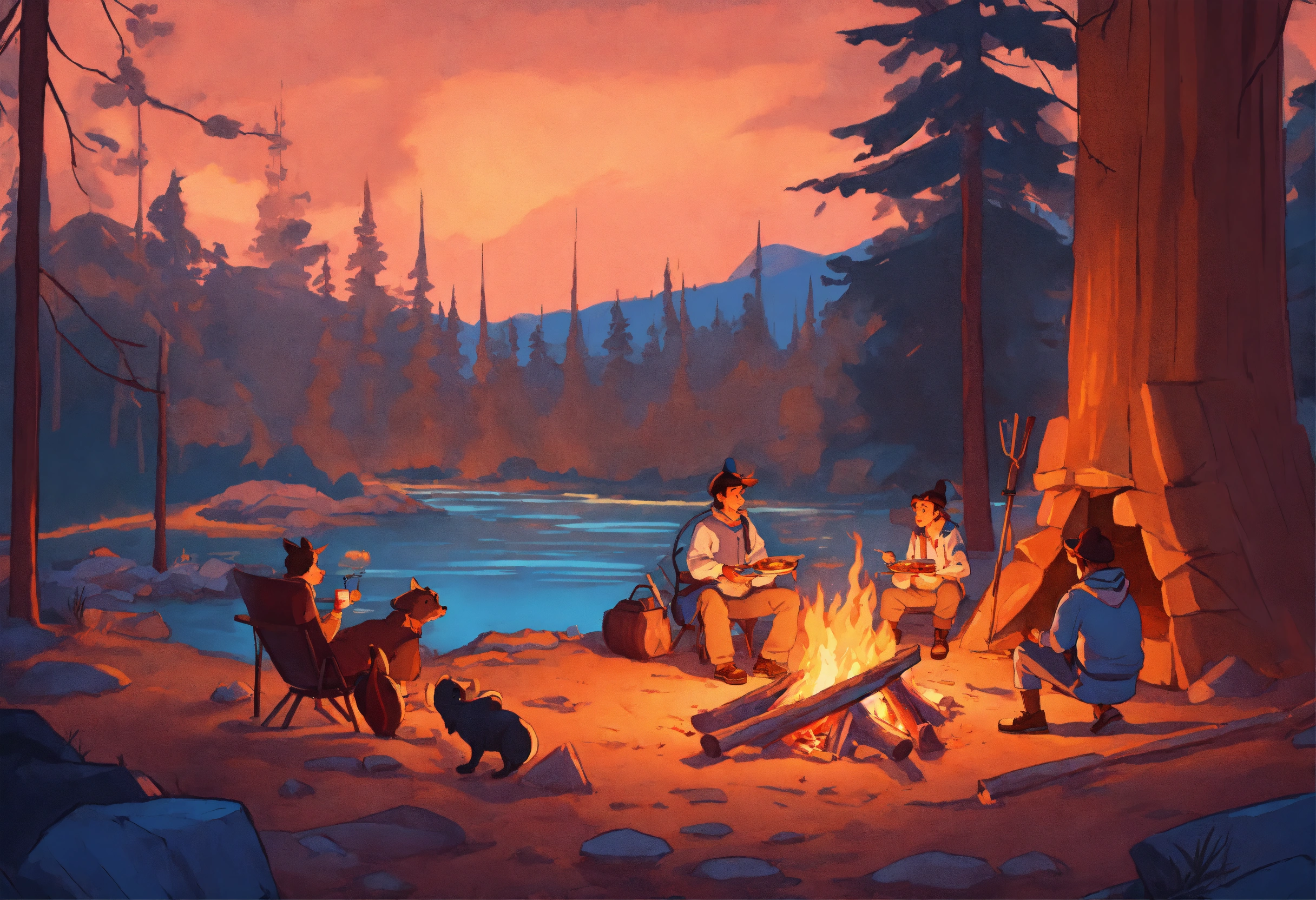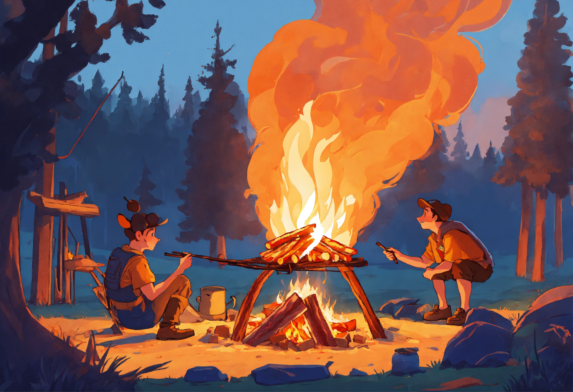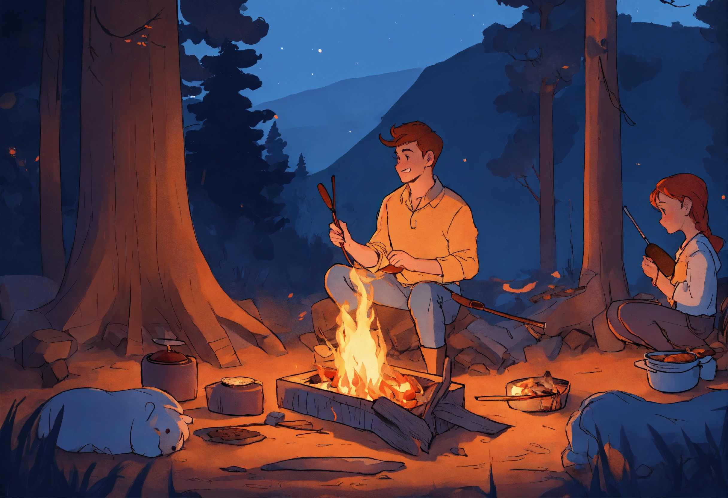 Long thin bacon cooks over campfire, authentic disney illustration and art, blue orange color palette