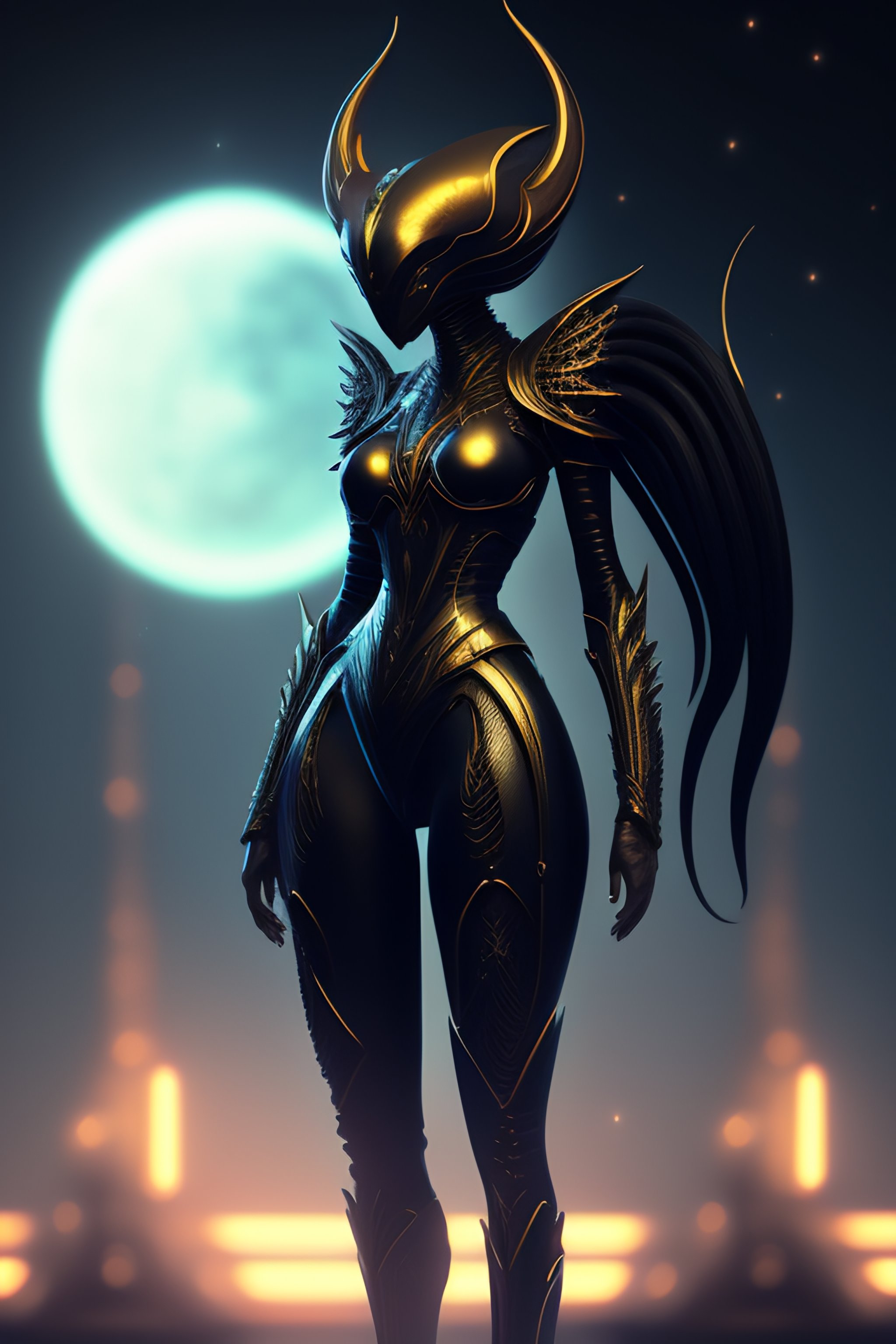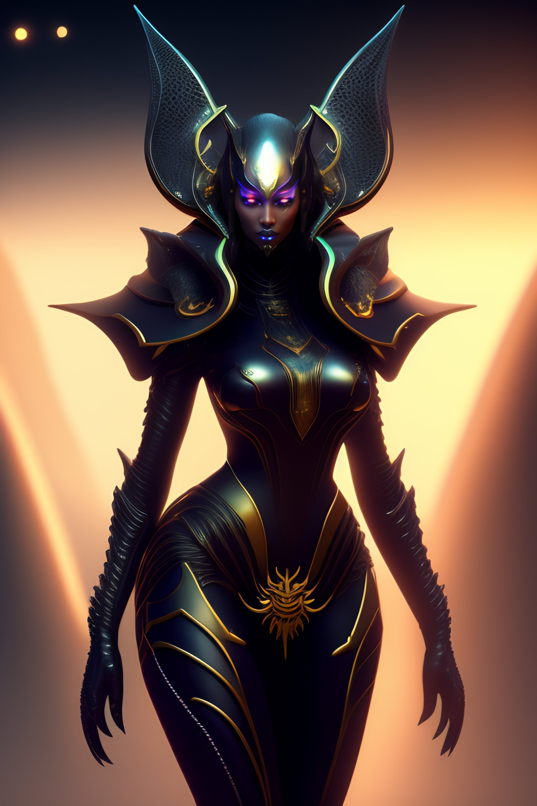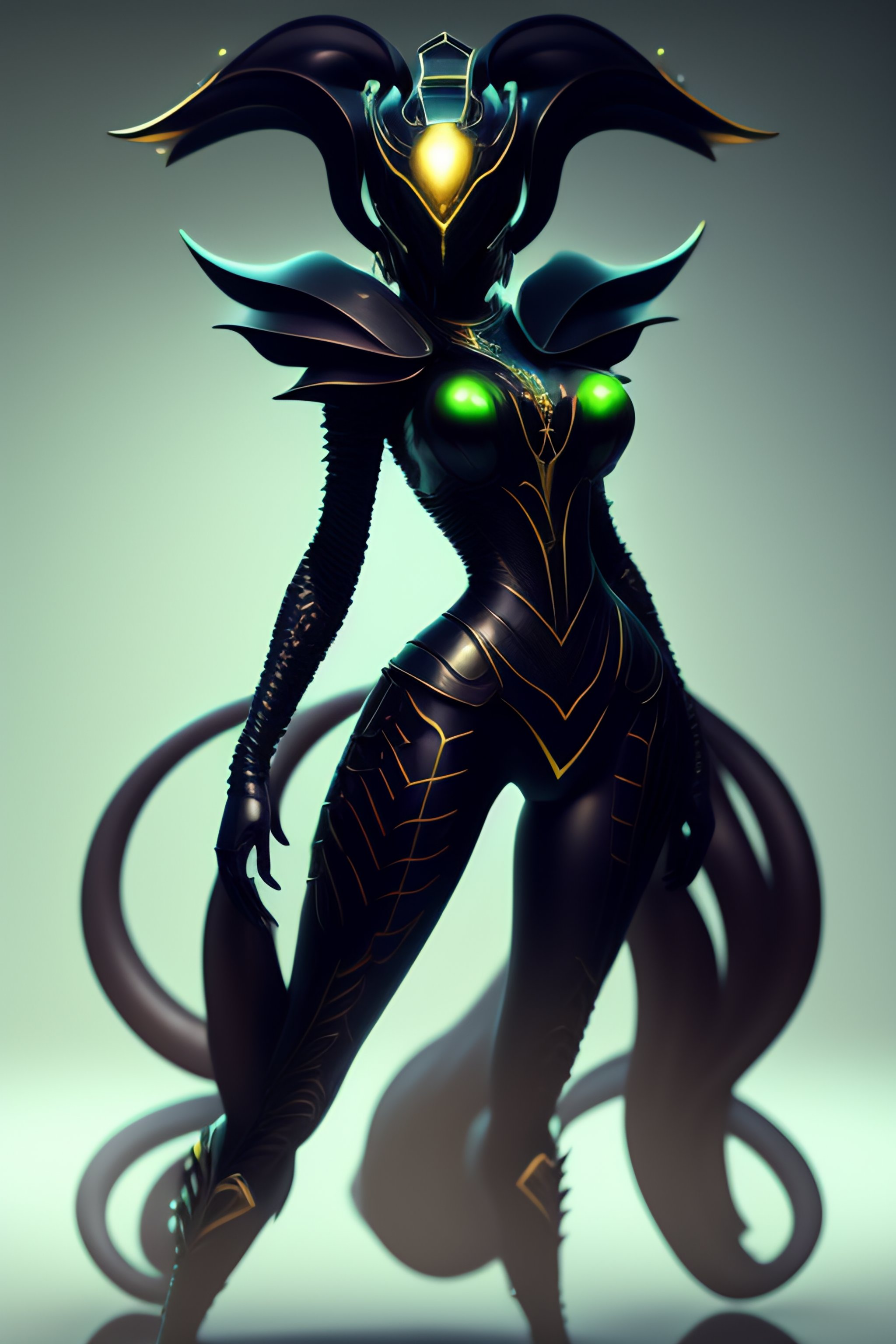 Alien female with six long spider legs, powerful jaws, beautiful and terrible, flexible body, long snake tail, luminous eyes, inspired by stellaris game and warframe, dark souls style
