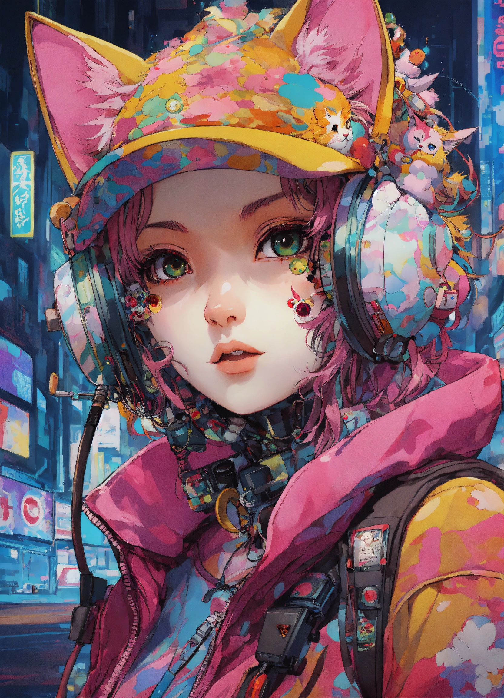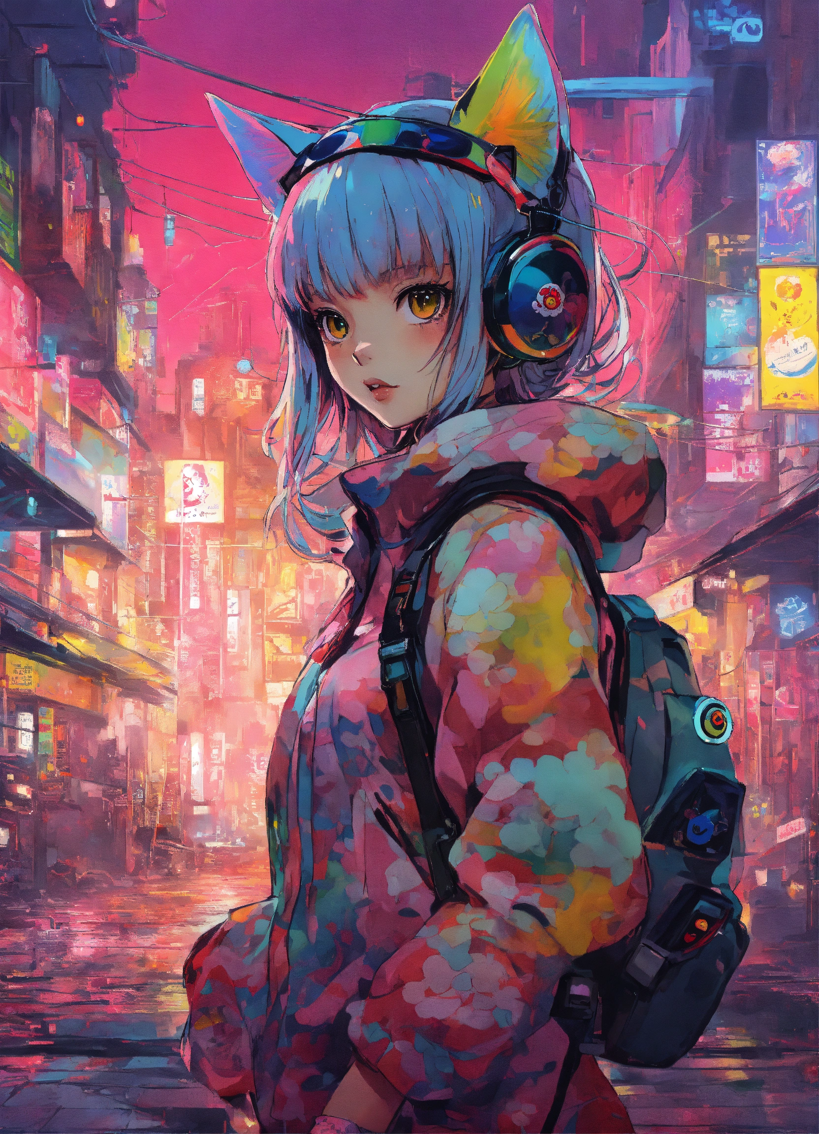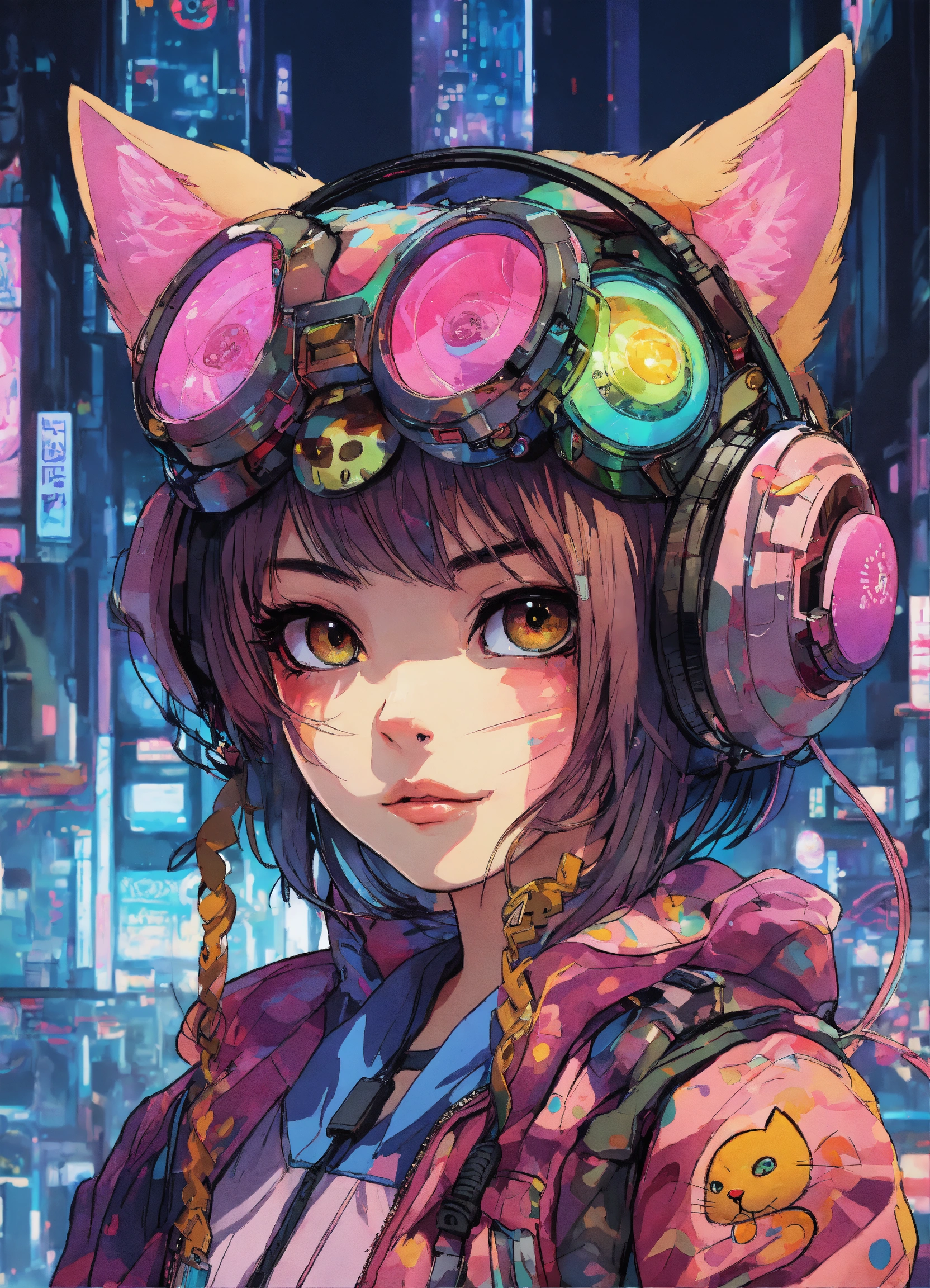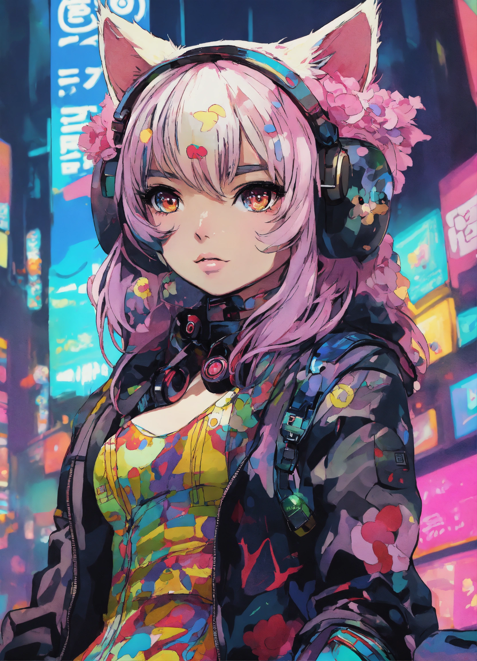 Abstract style anime art of a cat girl in cyberpunk, 4k, stunning intricate details, by takashi murakami.