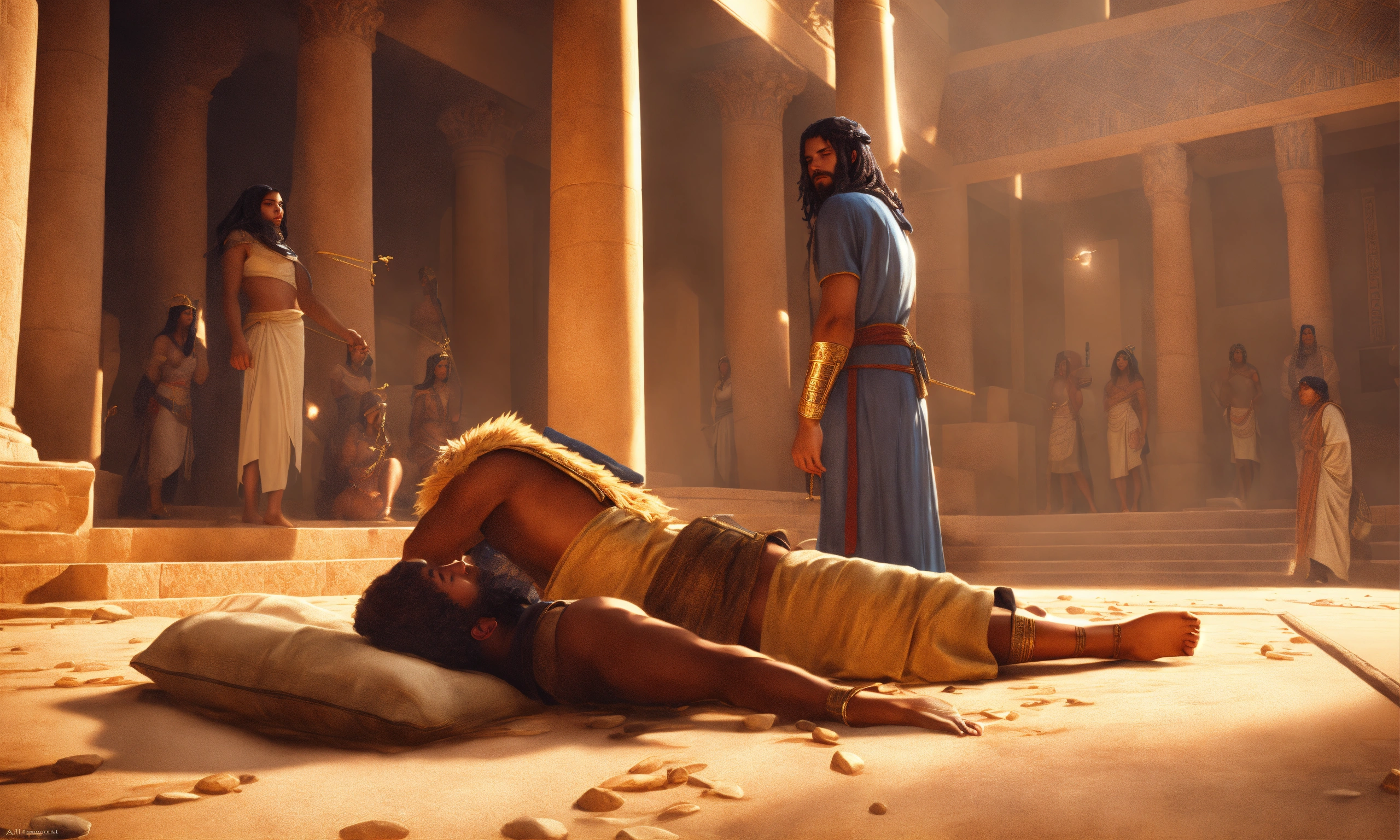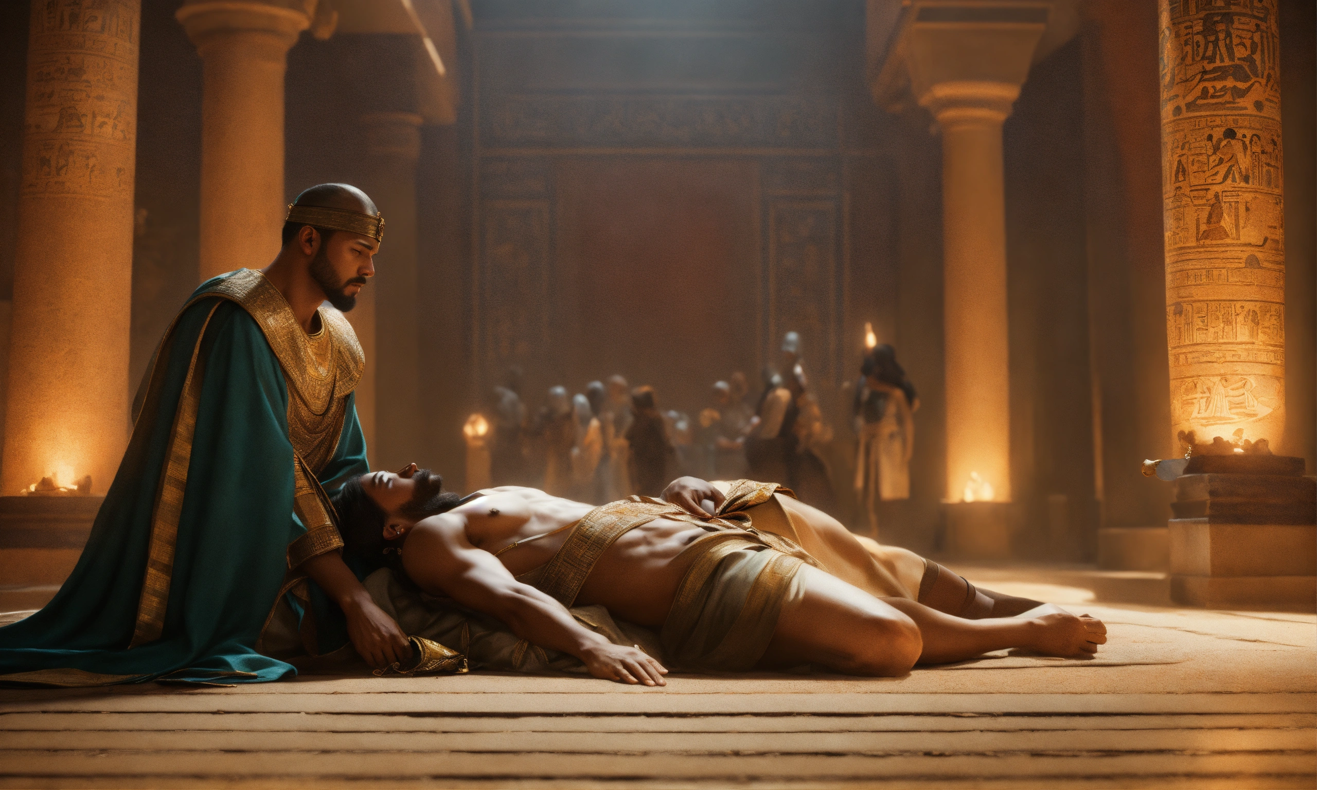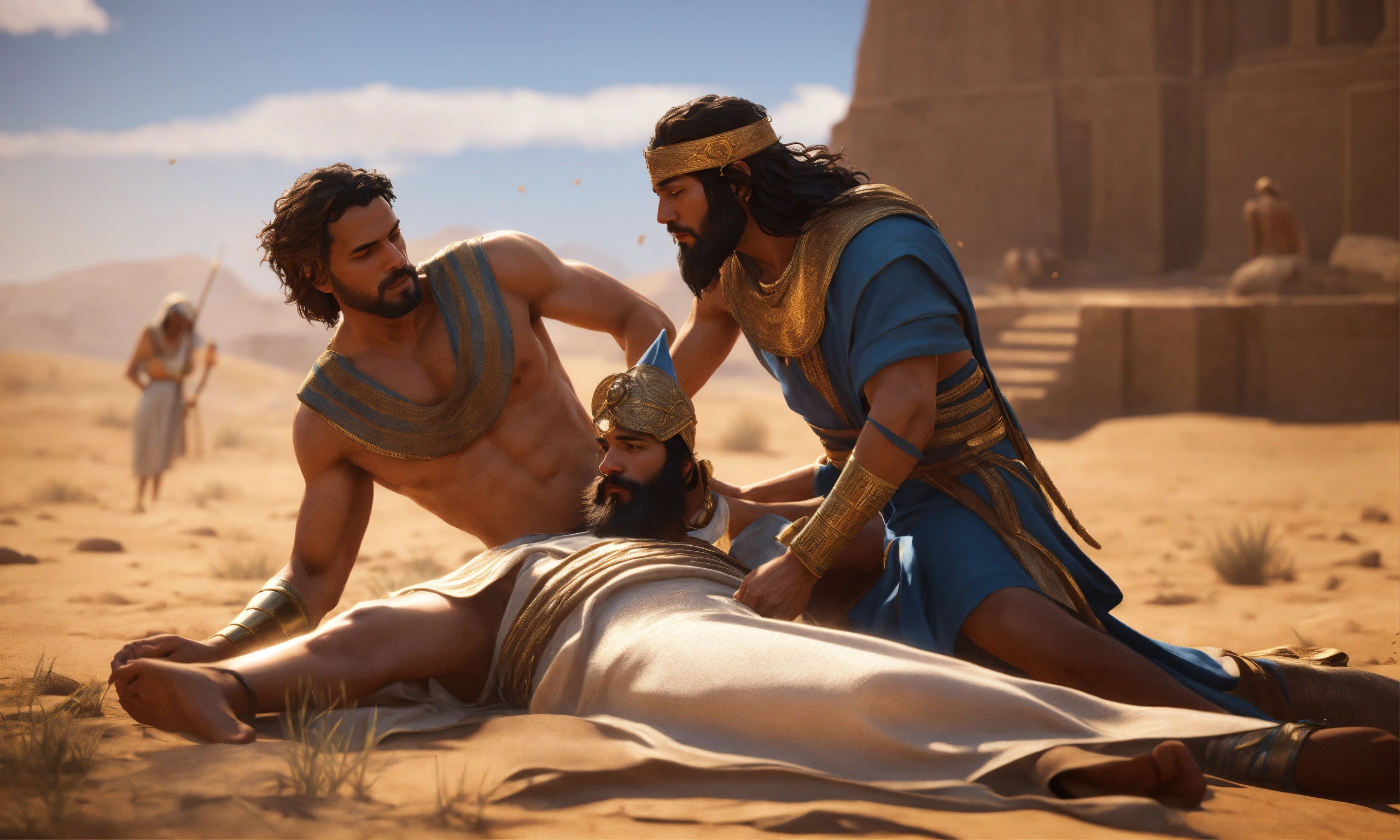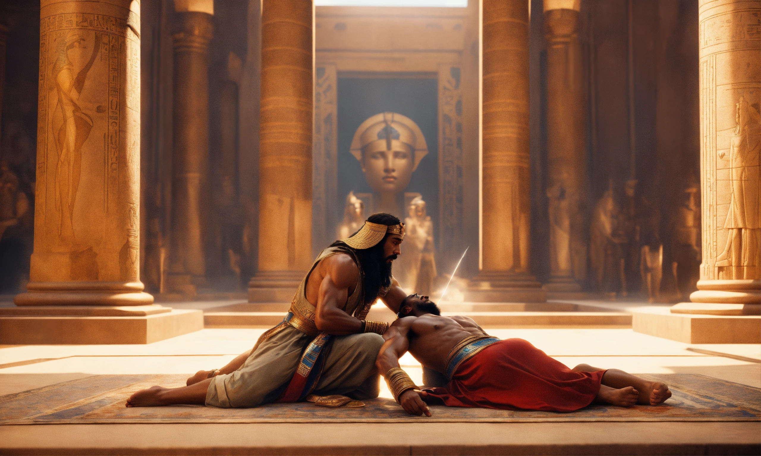 Moses doesn't let the man hit his brother, who is lying on the ground, in ancient egypt, cinematic lighting, complex, elegant, super highly detailed, art station, concept art, smooth, sharp focus, no blur, no dof, illustration extreme, unreal engine 5, photorealism, hd quality, 8k resolution, cinema 4d, 3d, beautiful, delicate, art by artgerm and greg rutkowski and alphonse mucha and loish and wlop