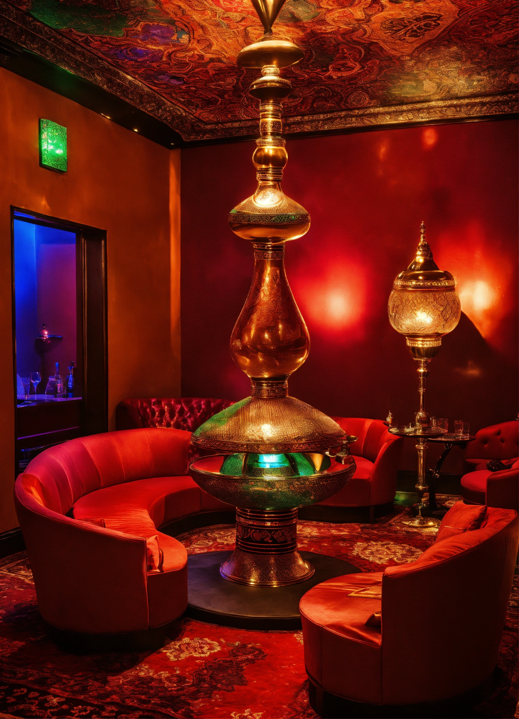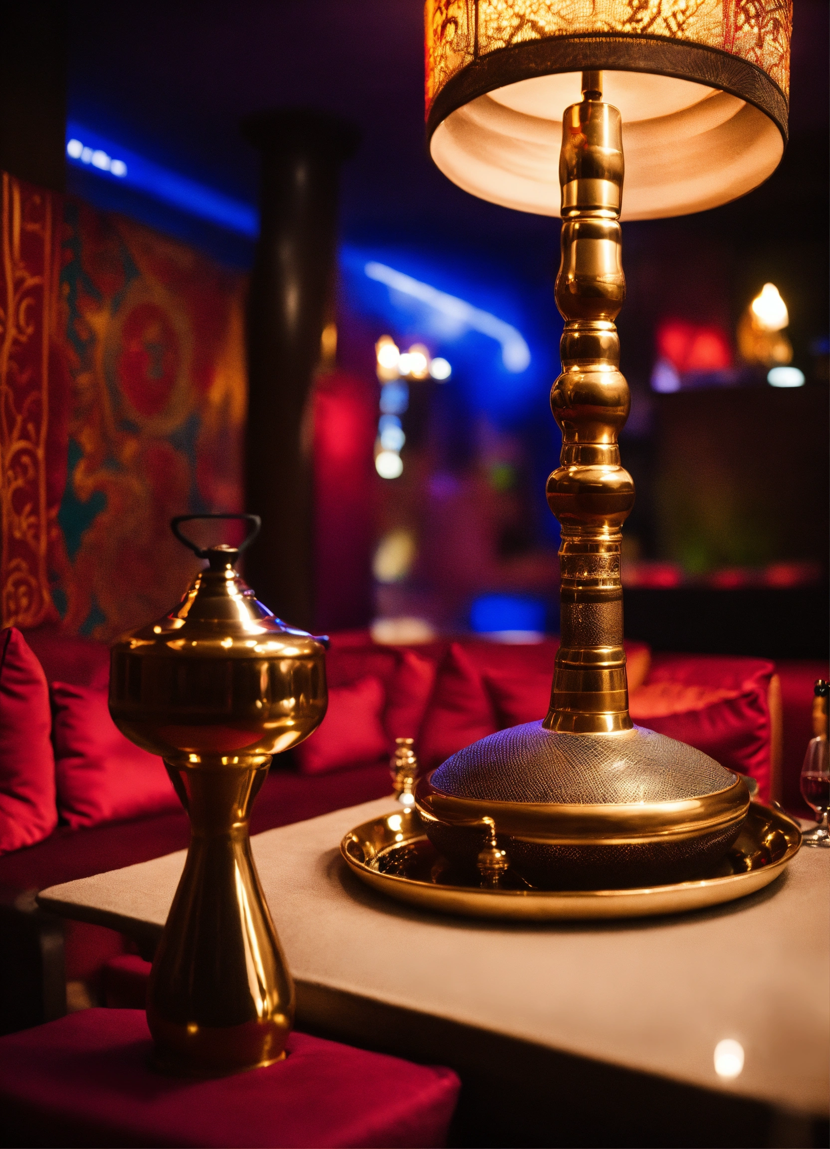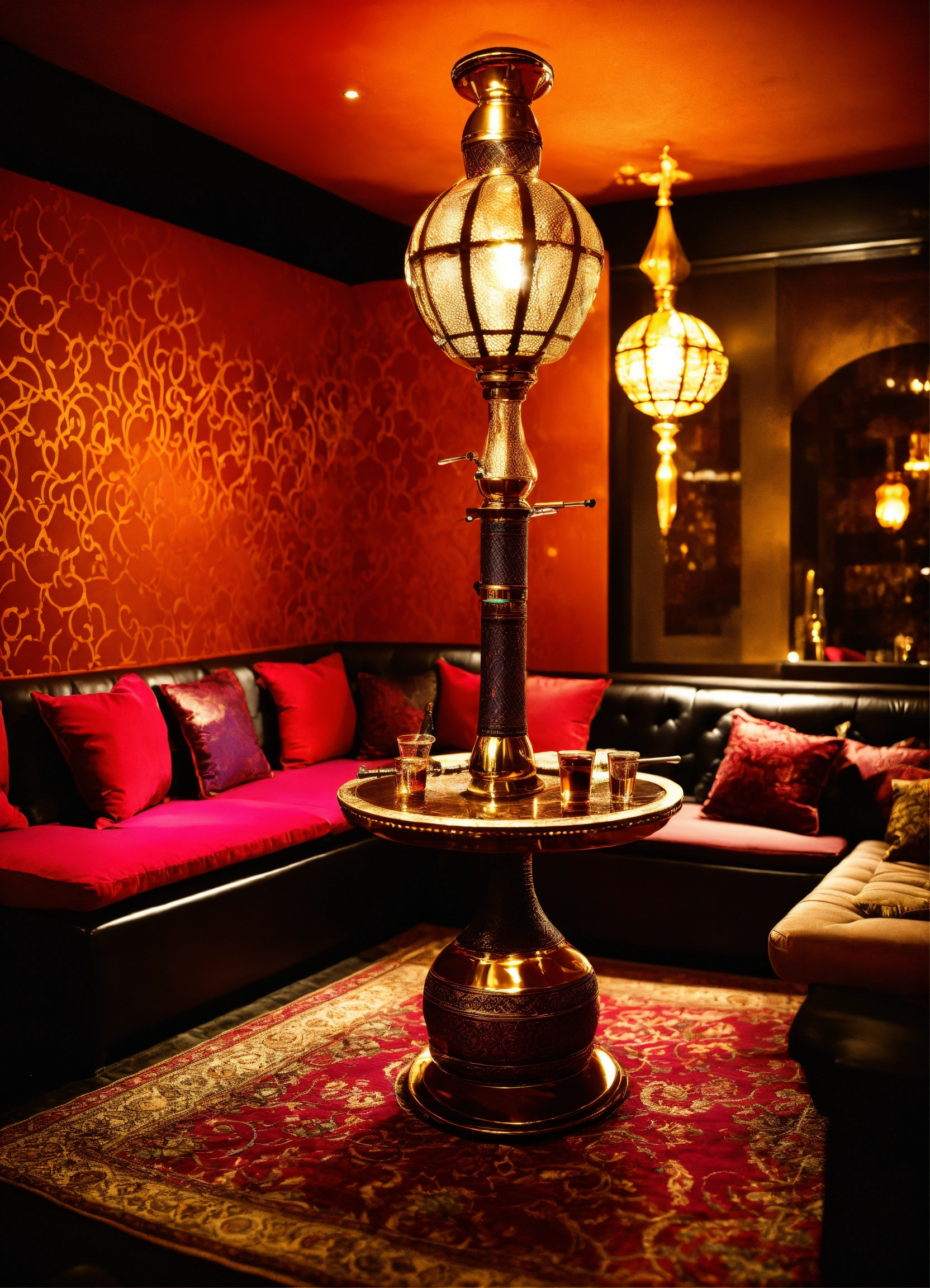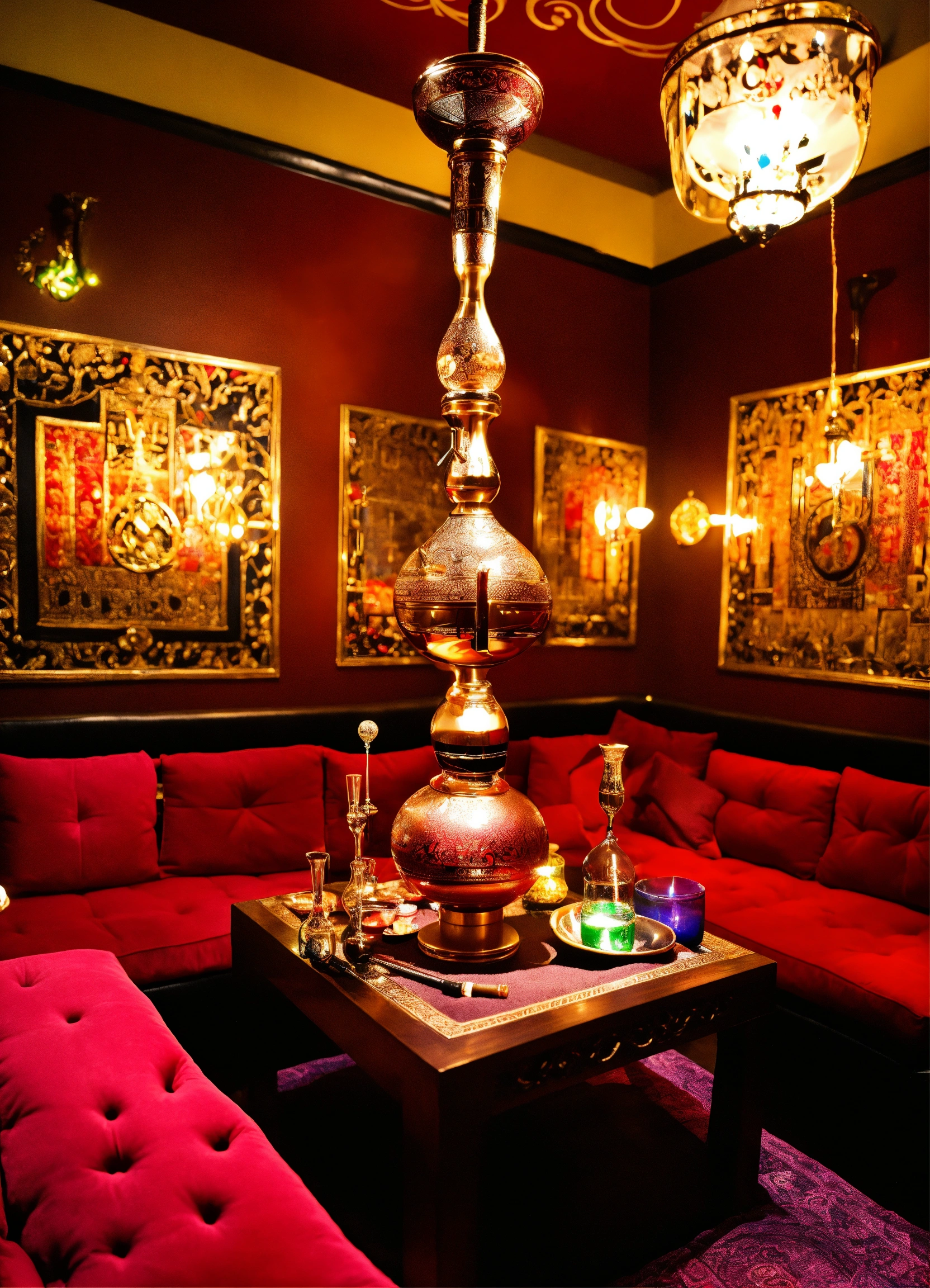 Shisha lounge, expensive shisha pipes, shisha table and cushions, affluent, rich, decadent, debauchery