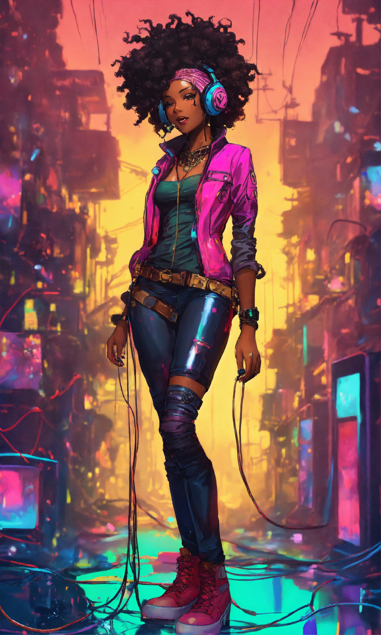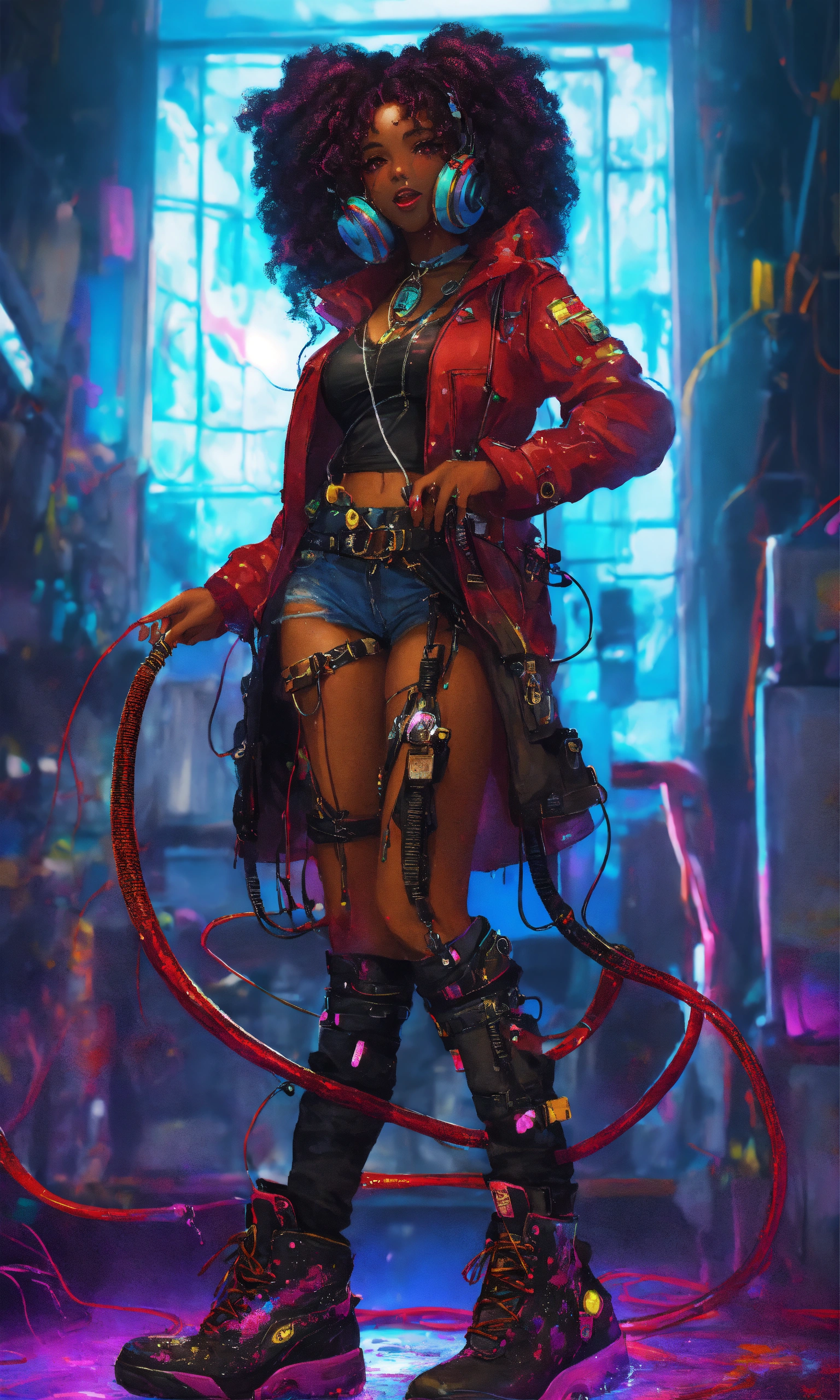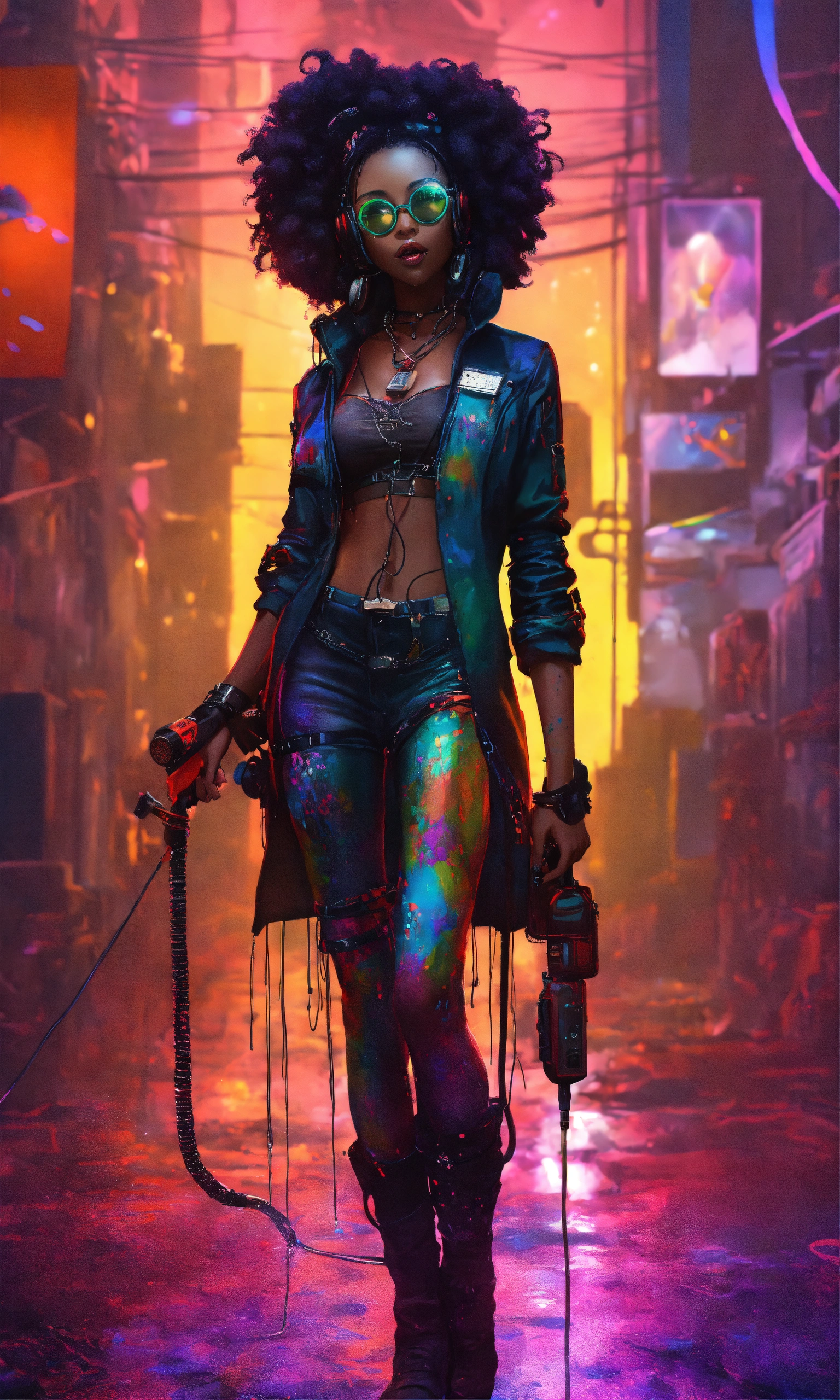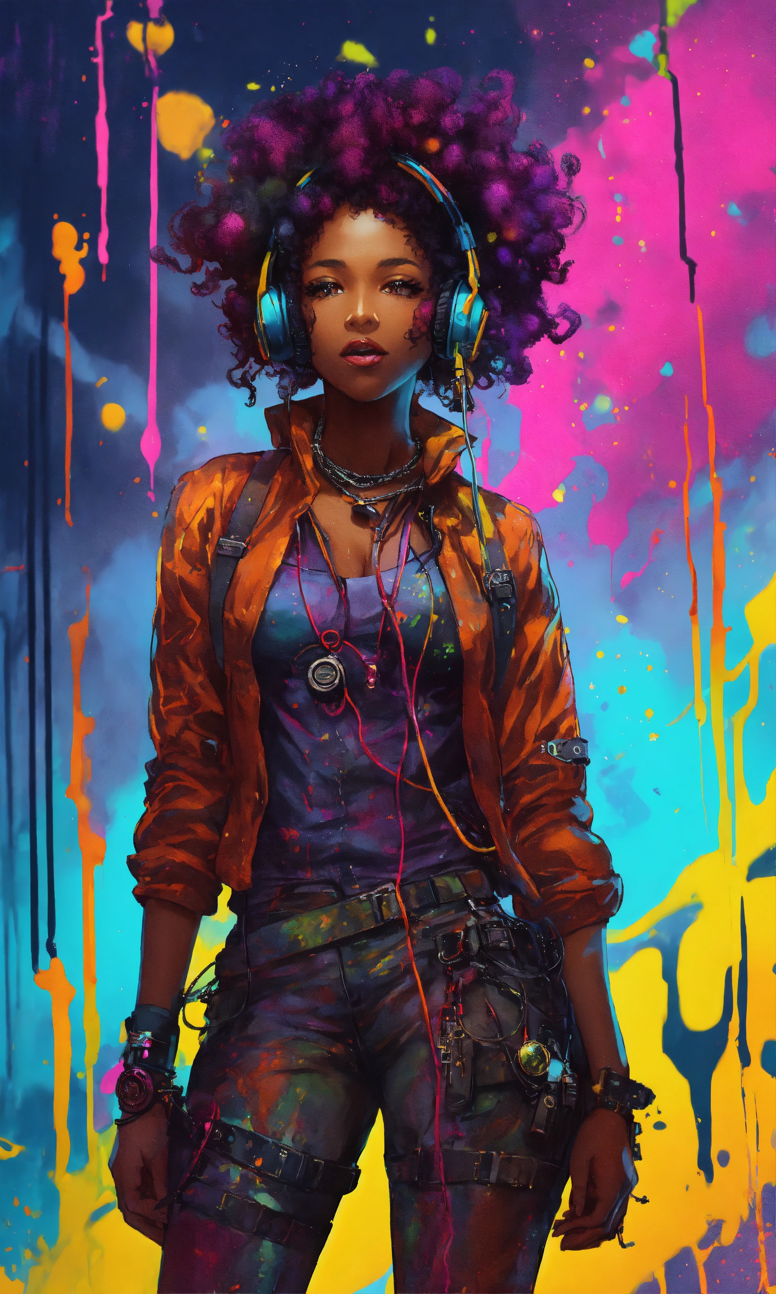 Full body rendition of a gothic-punk african american deep dark complexioned woman with curly coiled modern cut high top afro wearing vampyre steampunk gear themed drip paint headset. standing tangled in usb-c cables and hdmi cables..brightly colored paint splatters and drips in background. water condensation effect, photograph, intricate detail. rule of thirds. moe ghibli anime mashup