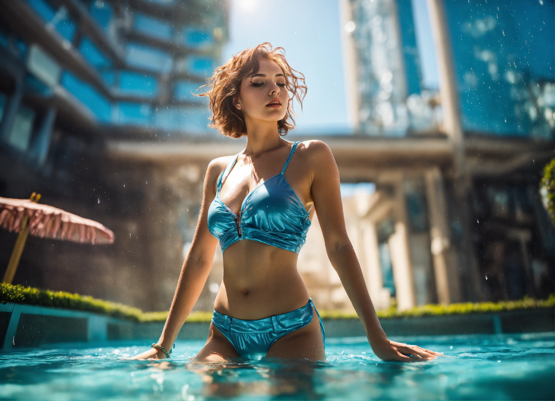 Worms eye view full body, photo, european girl sci-fi dream girl, futuristic, sunny weather, open shirt, wearing underwaee, 8k, make-up, falling in pool rain