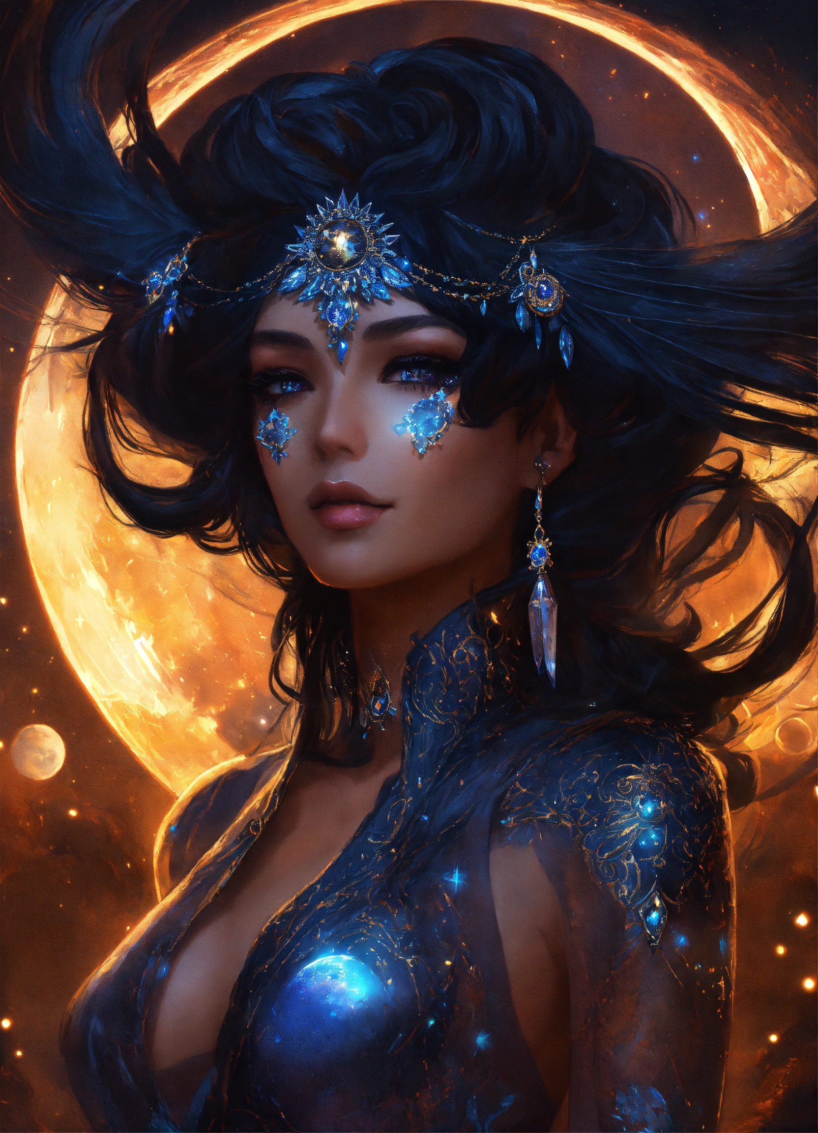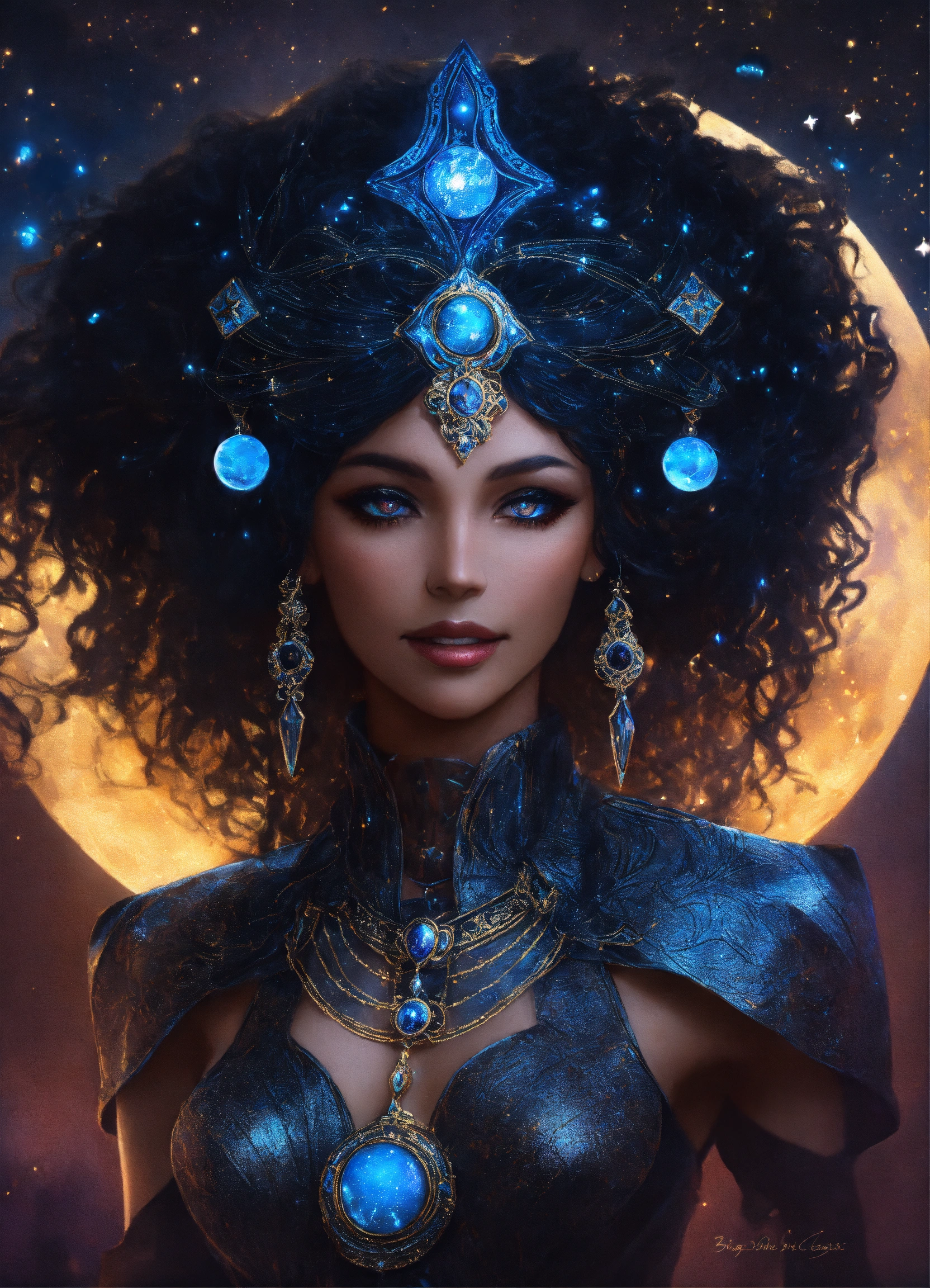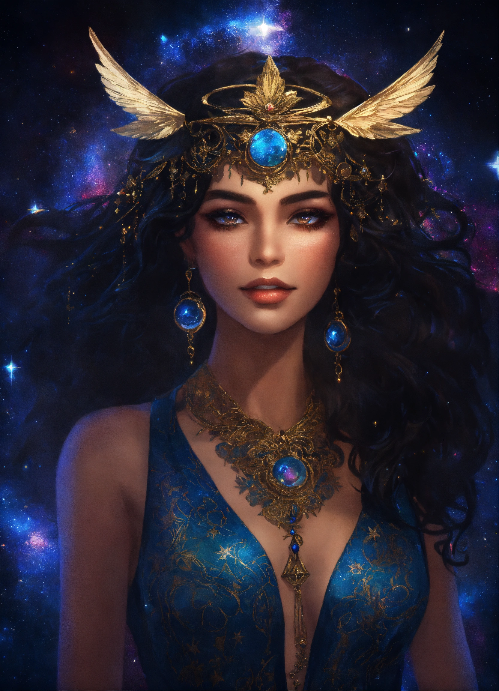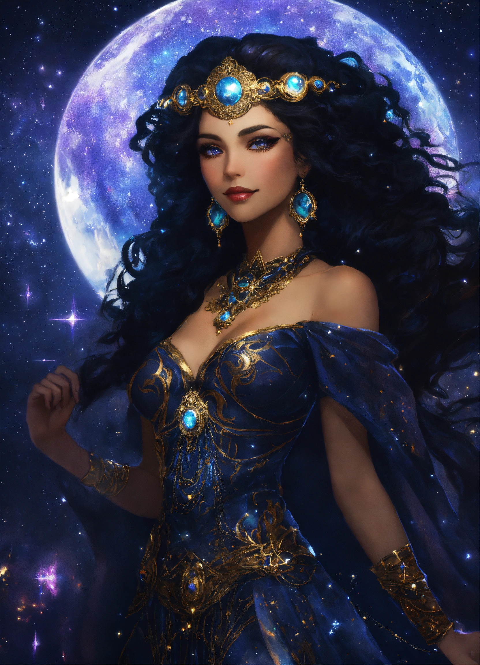 "nyx, goddess of the night", big cosmic black hair, noblewoman, smirk, fashionable, magic, stars, celestial, darkness, action, intricately detailed eyes, fantasy art