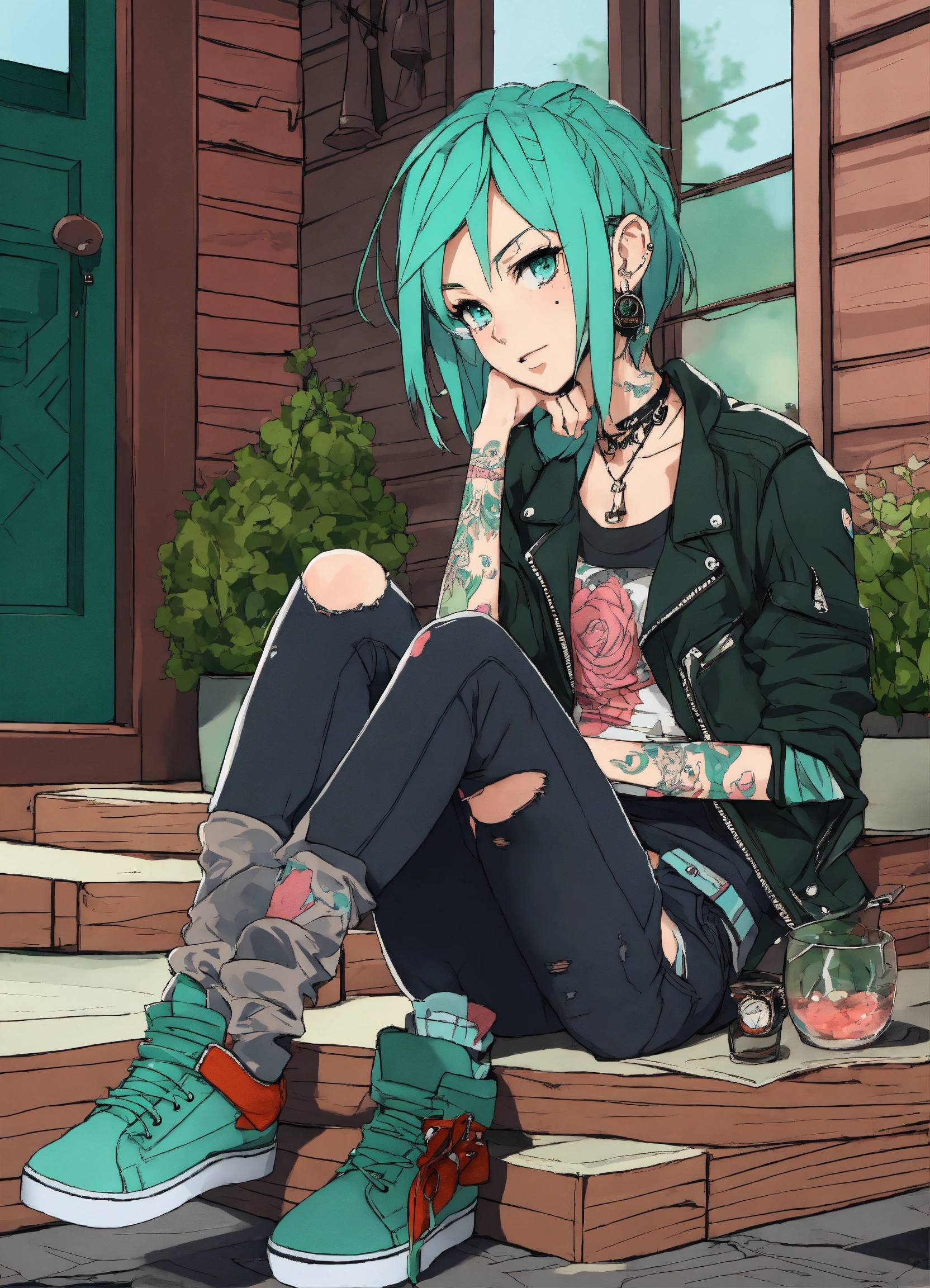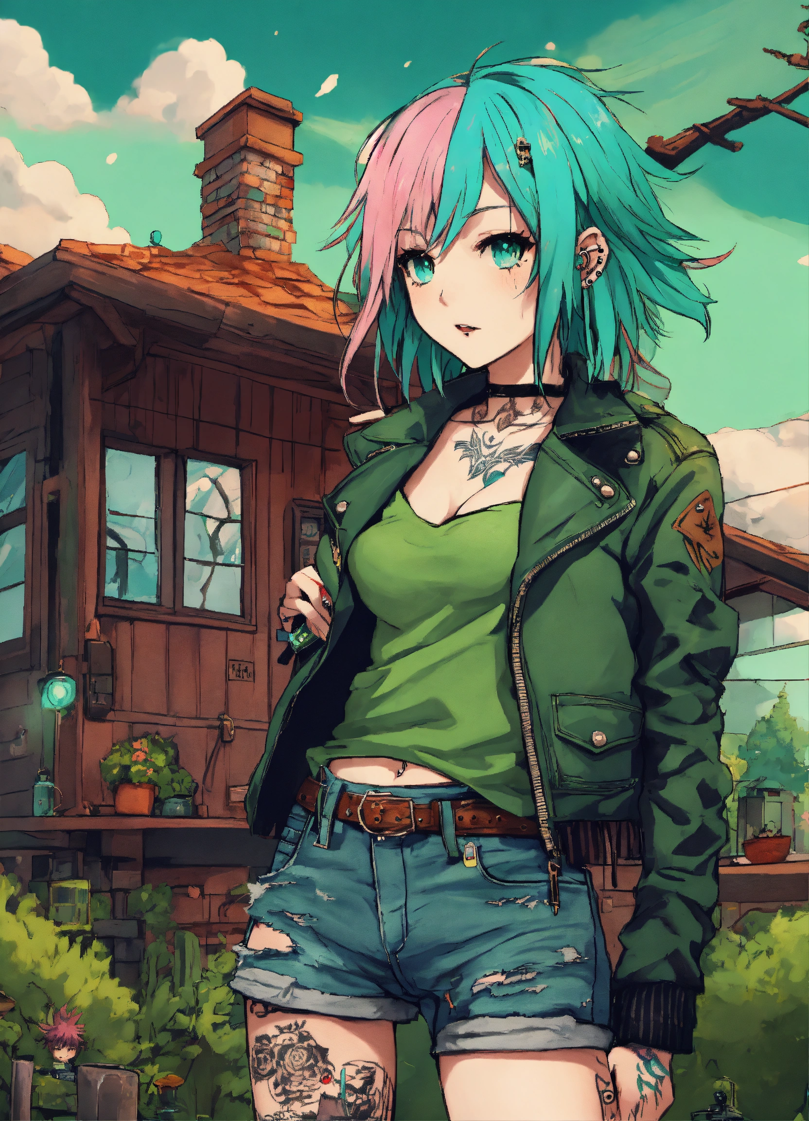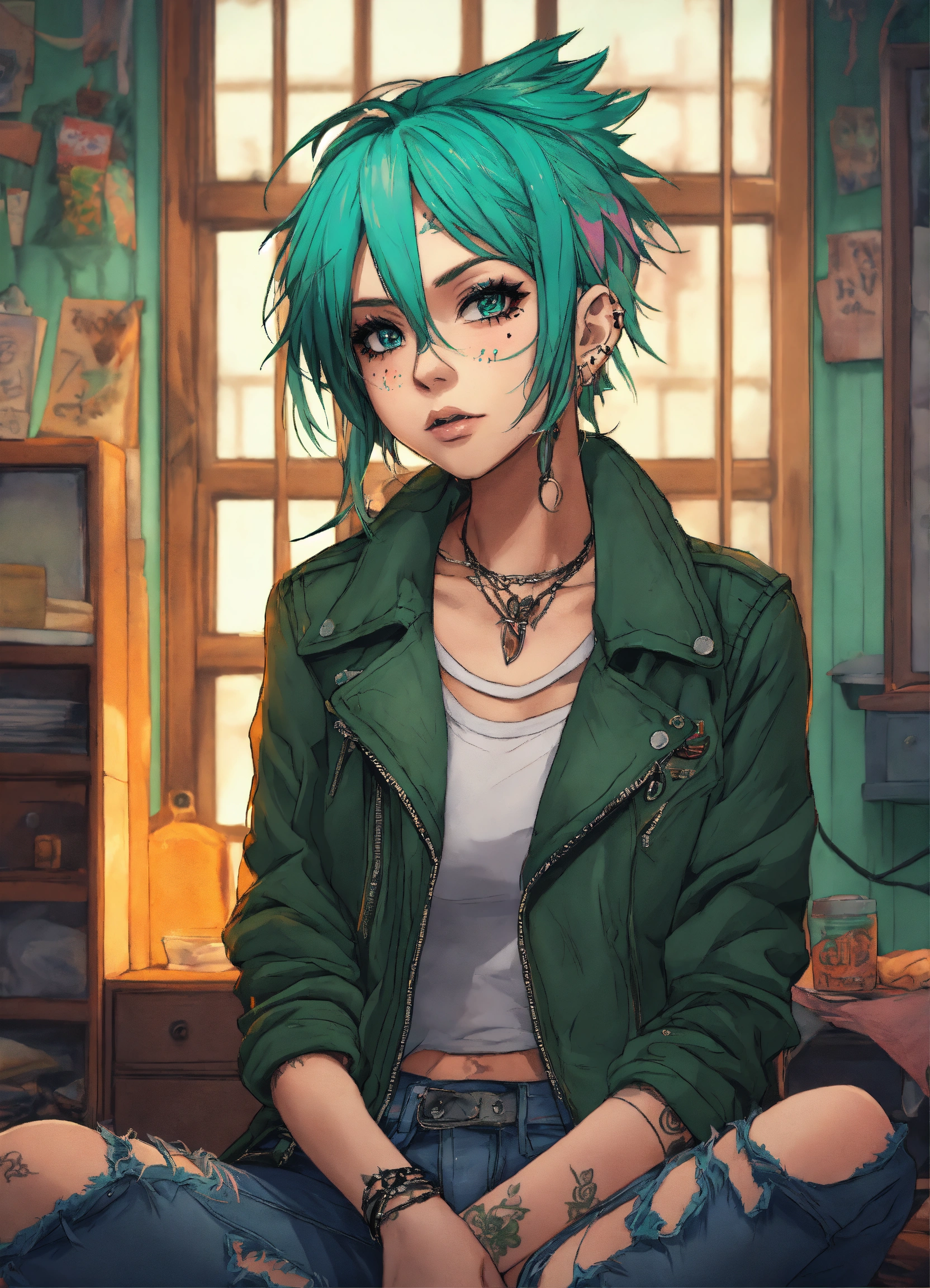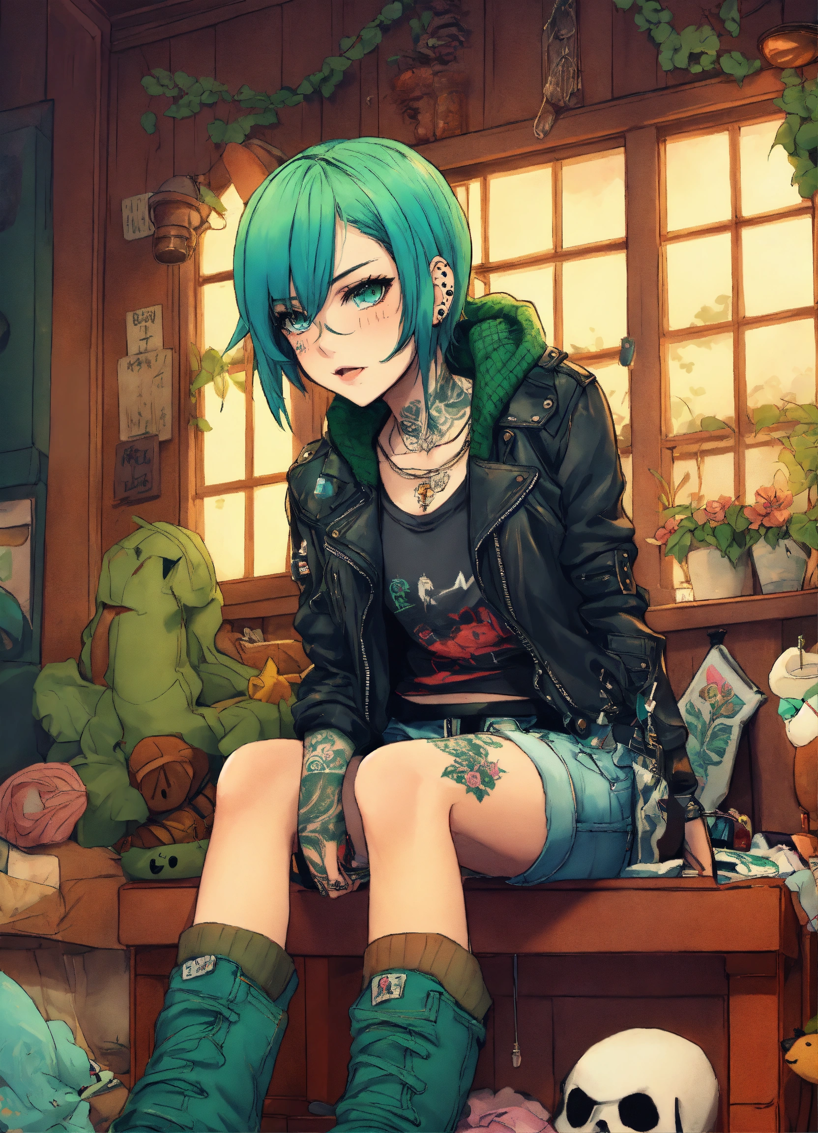 2d epic anime manga style, punk rock girl knitting at a cozy cottage, tattoos, piercings, half-shaved green hair, leather jacket, ripped jeans, aqua tone