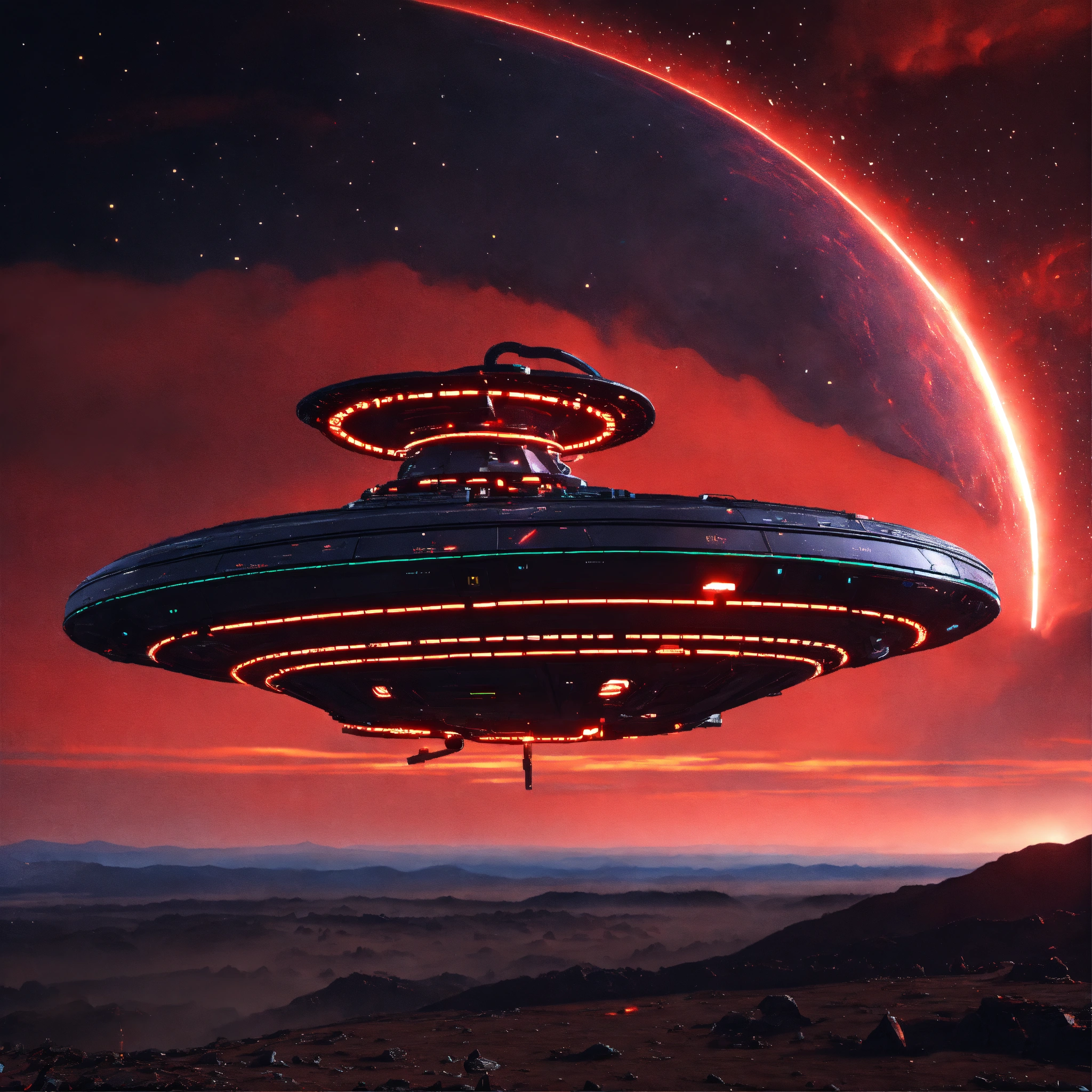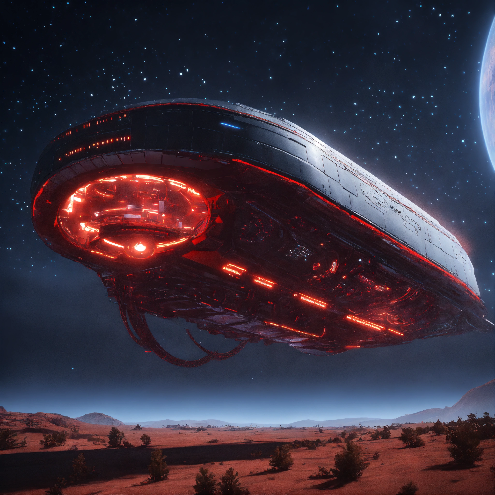 Long black worm like alien bio-robotic beam ship with red circuitry and markings appear in the sky from hyperspace, realistic, 8k, unreal engine, pixar