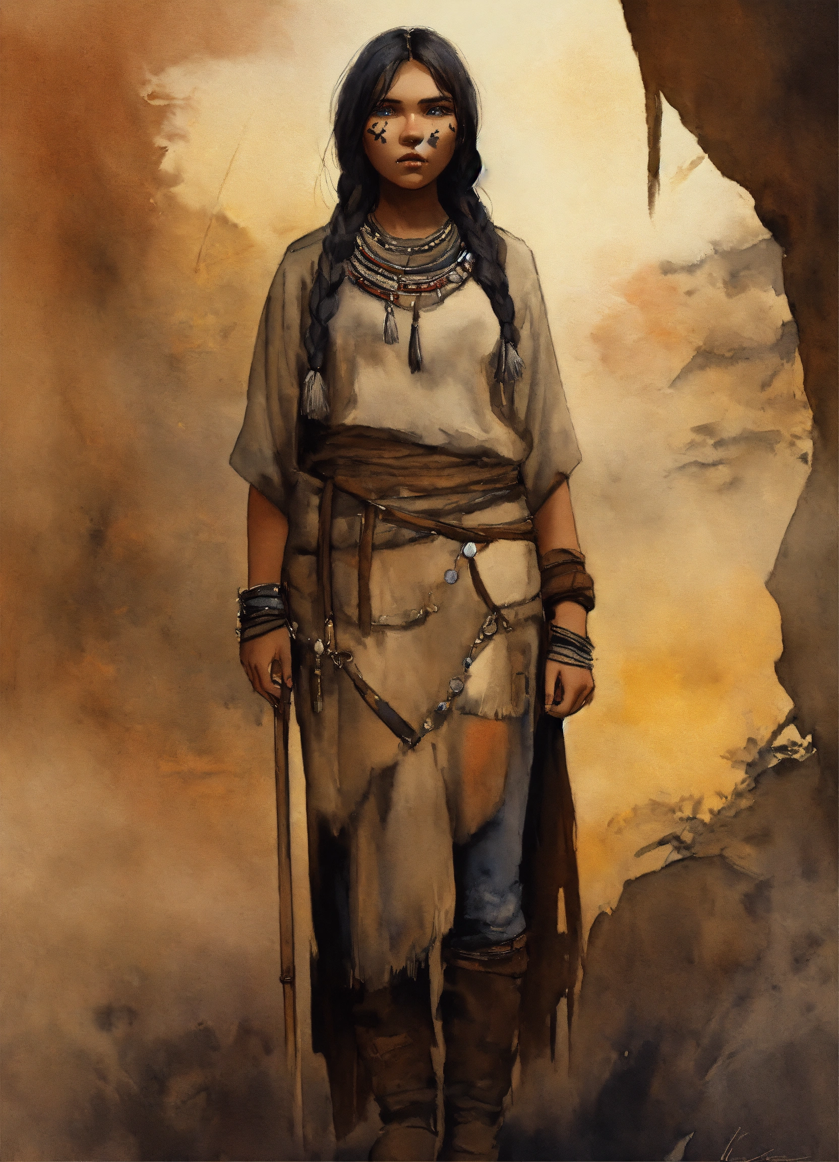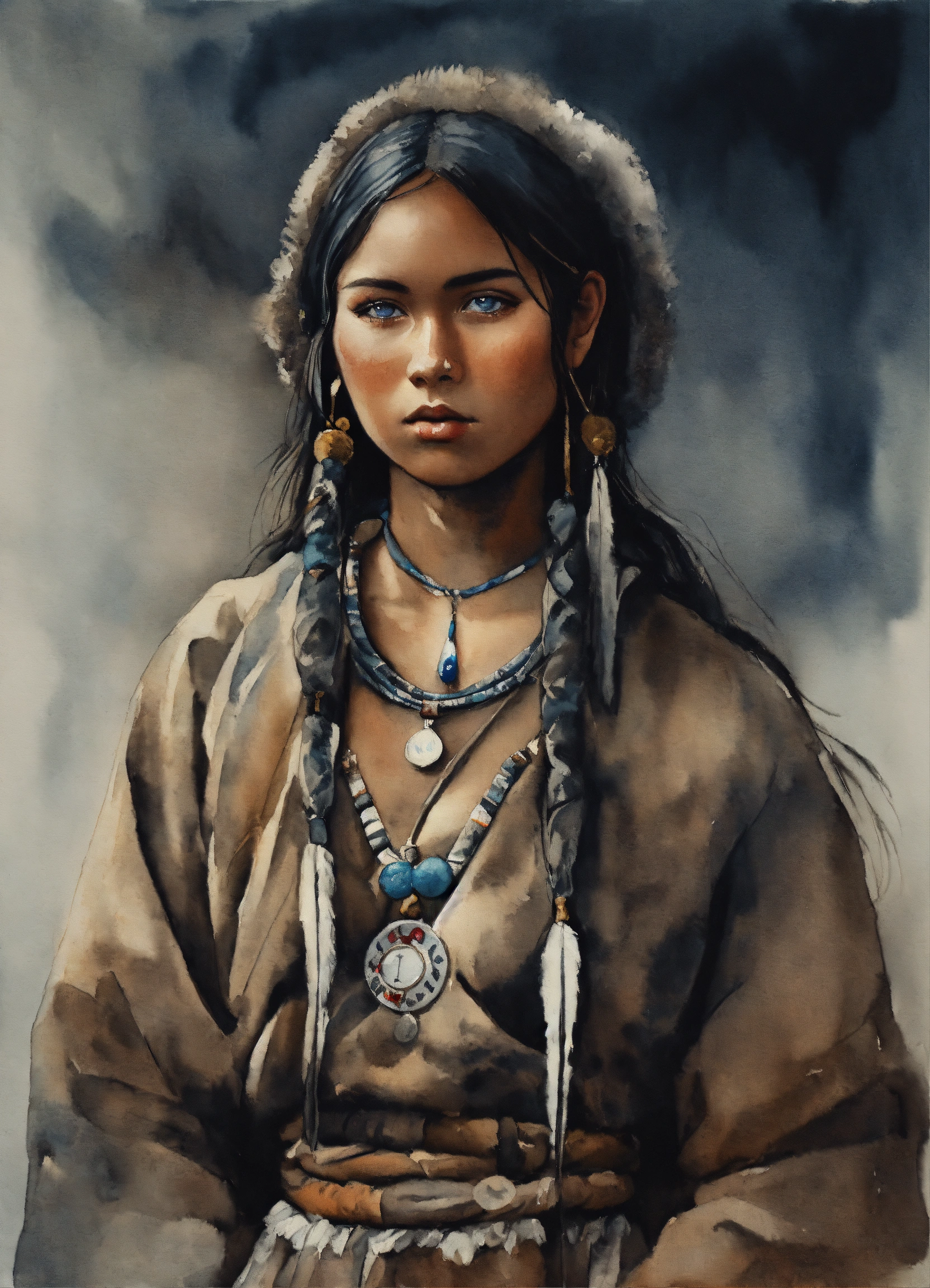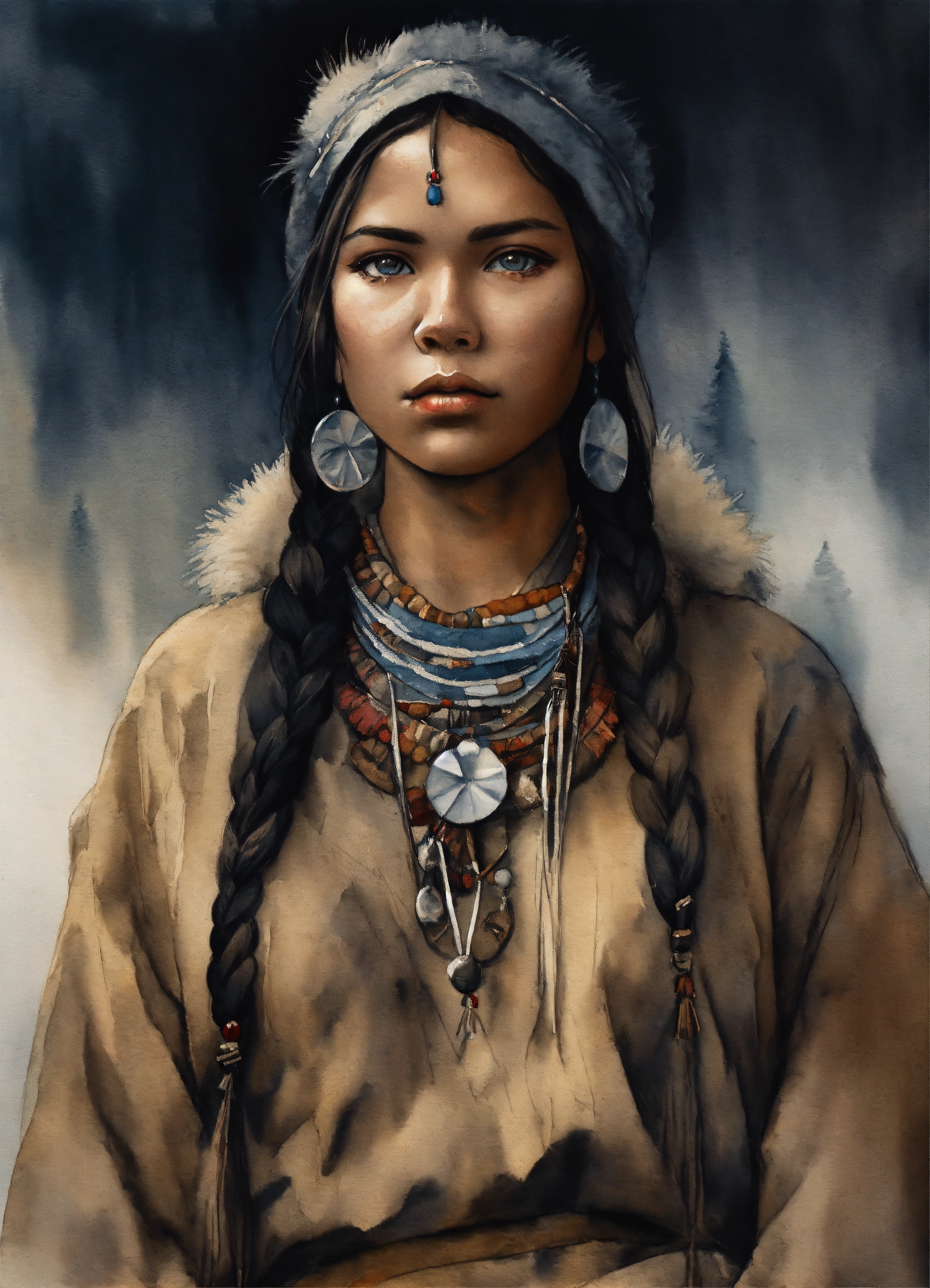 Illustration by tom björklund of a siberian "aboriginal" woman by 18 years old with piercing eyes wearing arctic paleolithic clothing. full body illustration in the artstyle of tom björklund, watercolor painting, dark hues, gloomy and depressing, masterpiece.