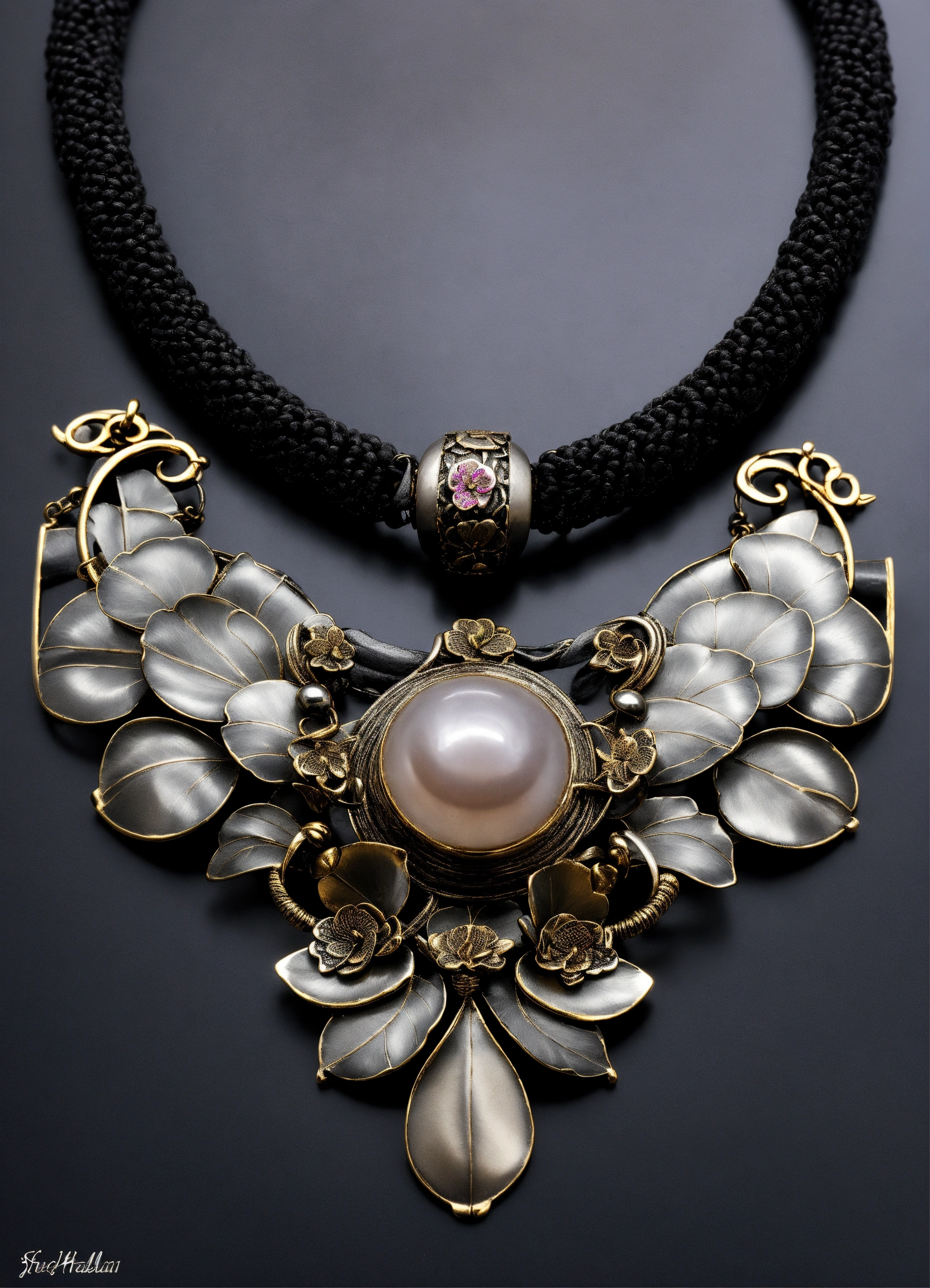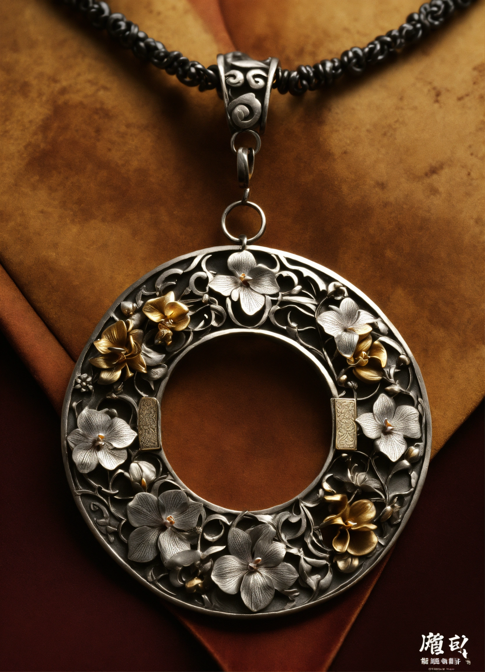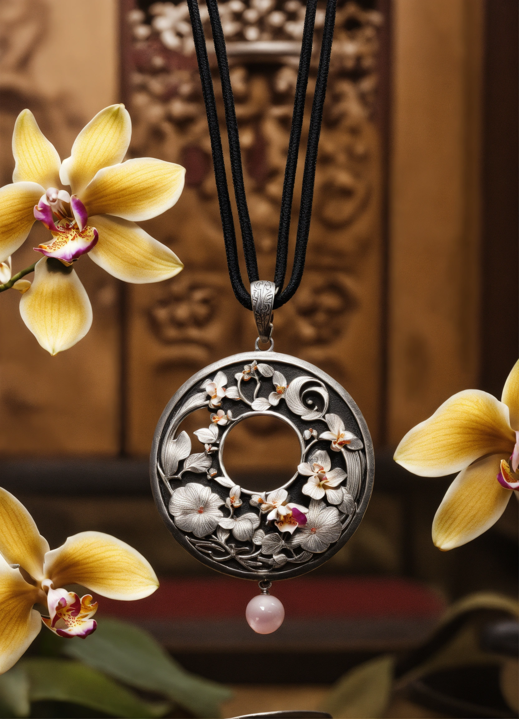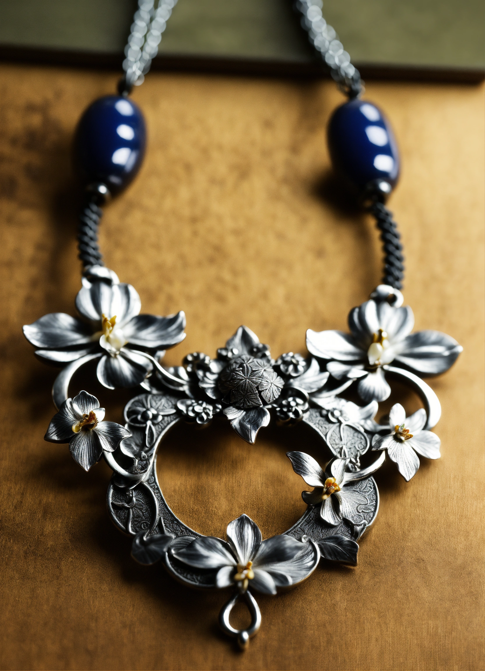 Edo period necklace, ford hallam style, orchid motif, shibuichi, tsuba, iron, silver, silver material, highly detailed, artstation, concept art, sharp focus