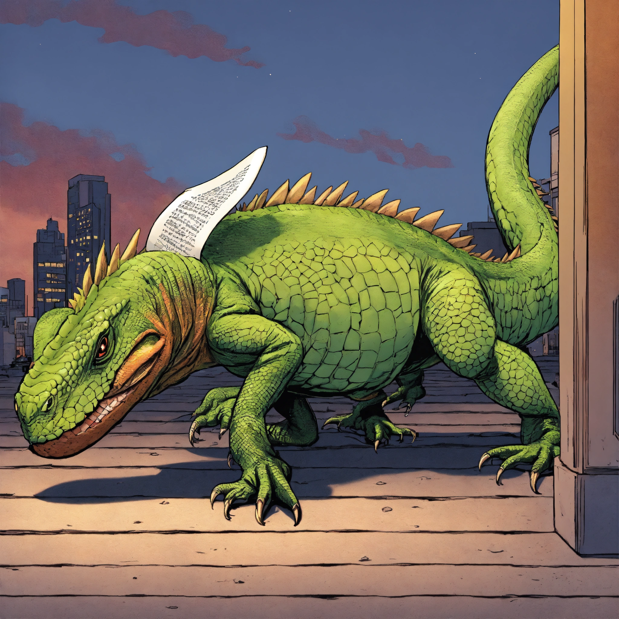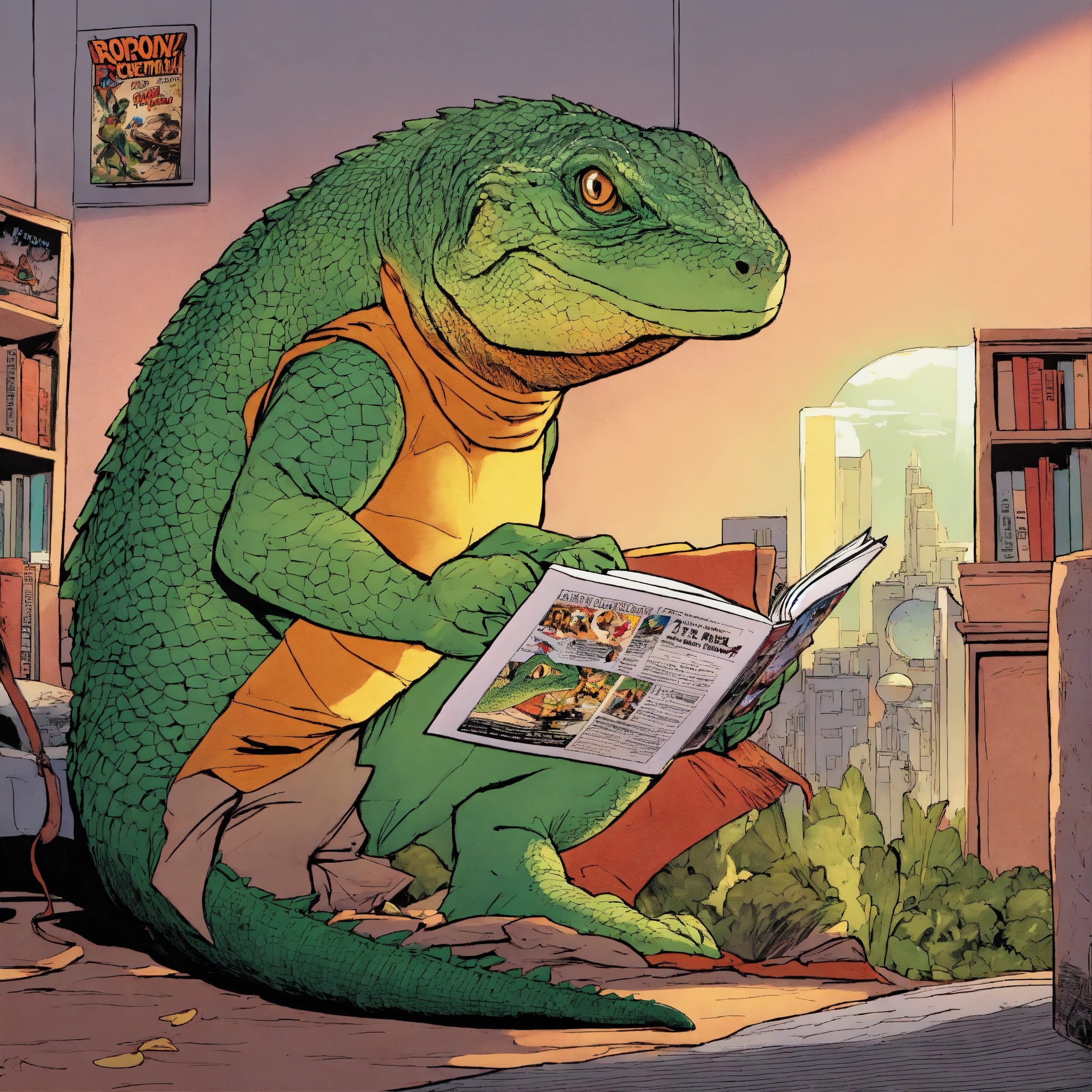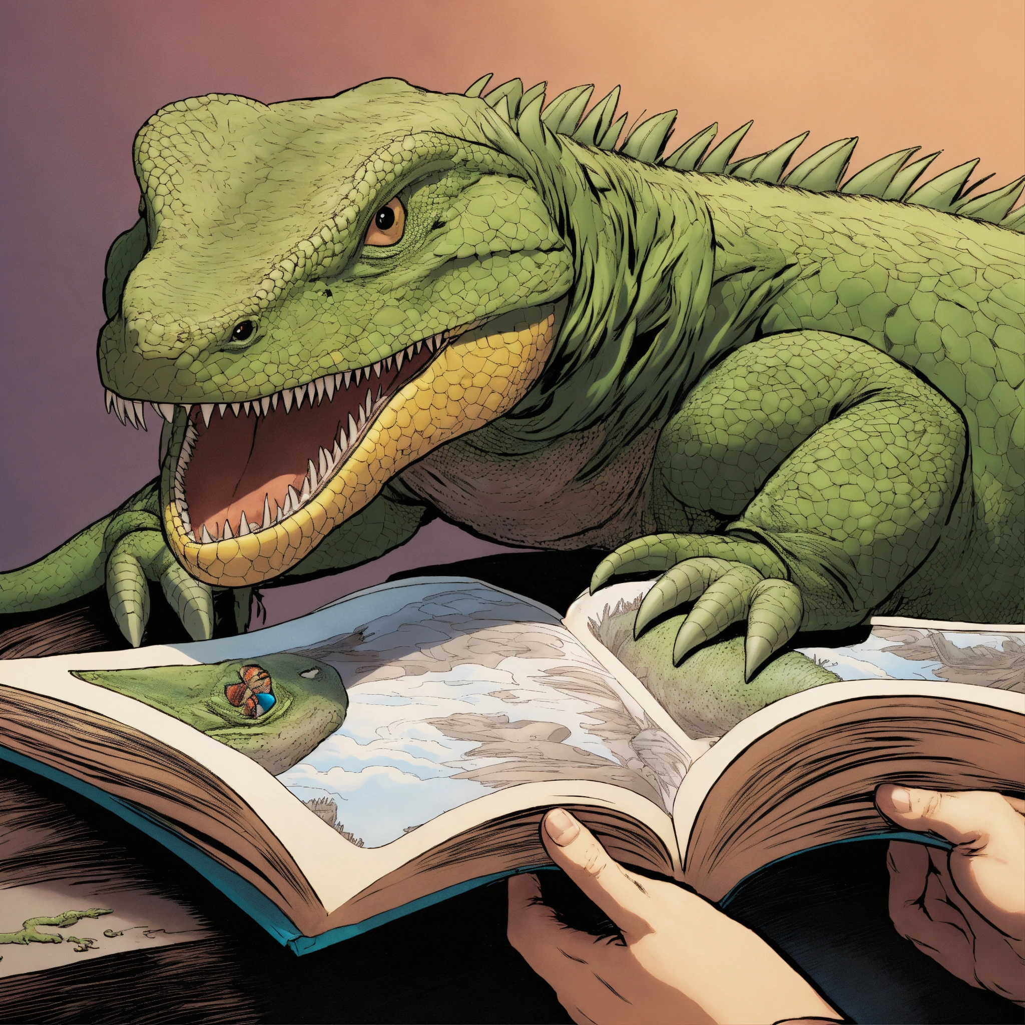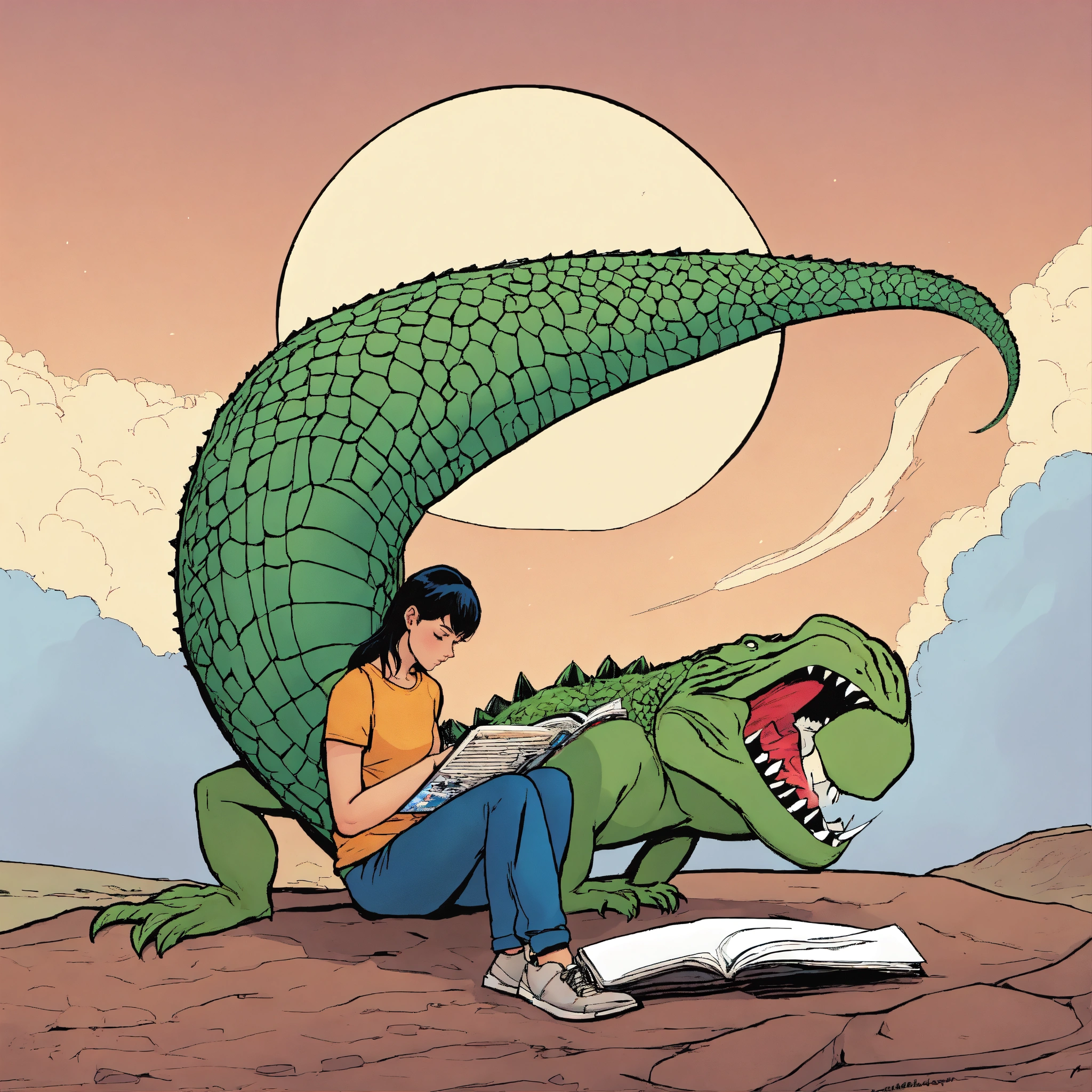 Person reading a comic book with a giant lizard tail starting to come out of the comic book