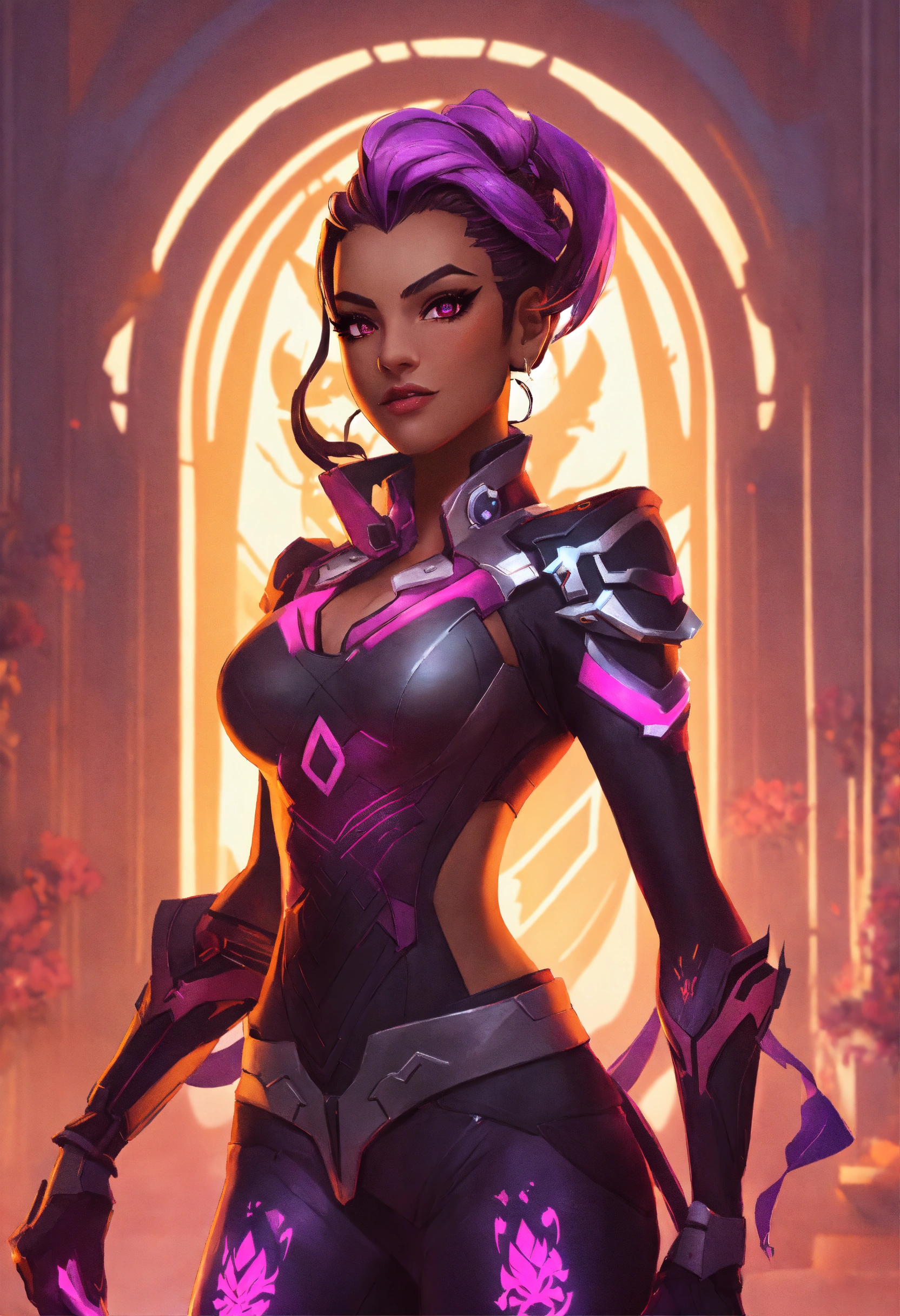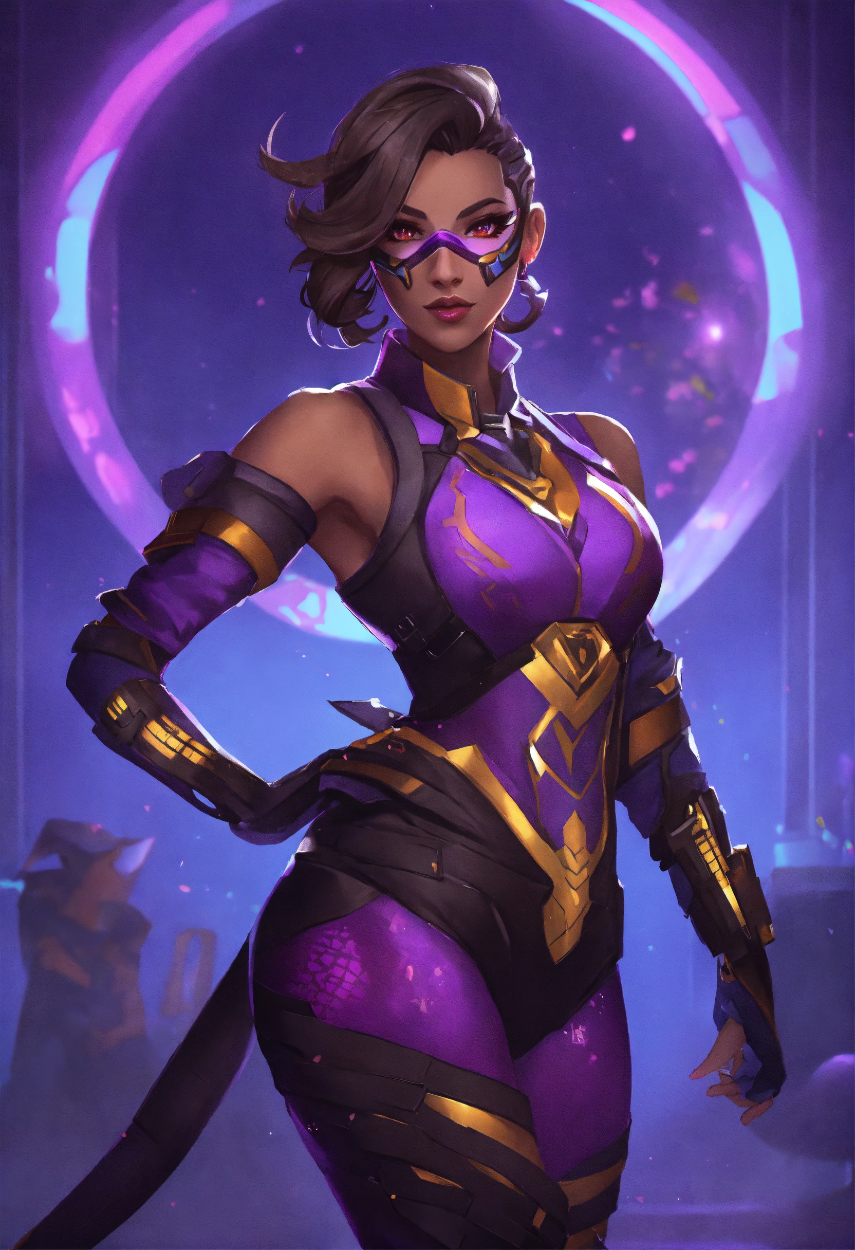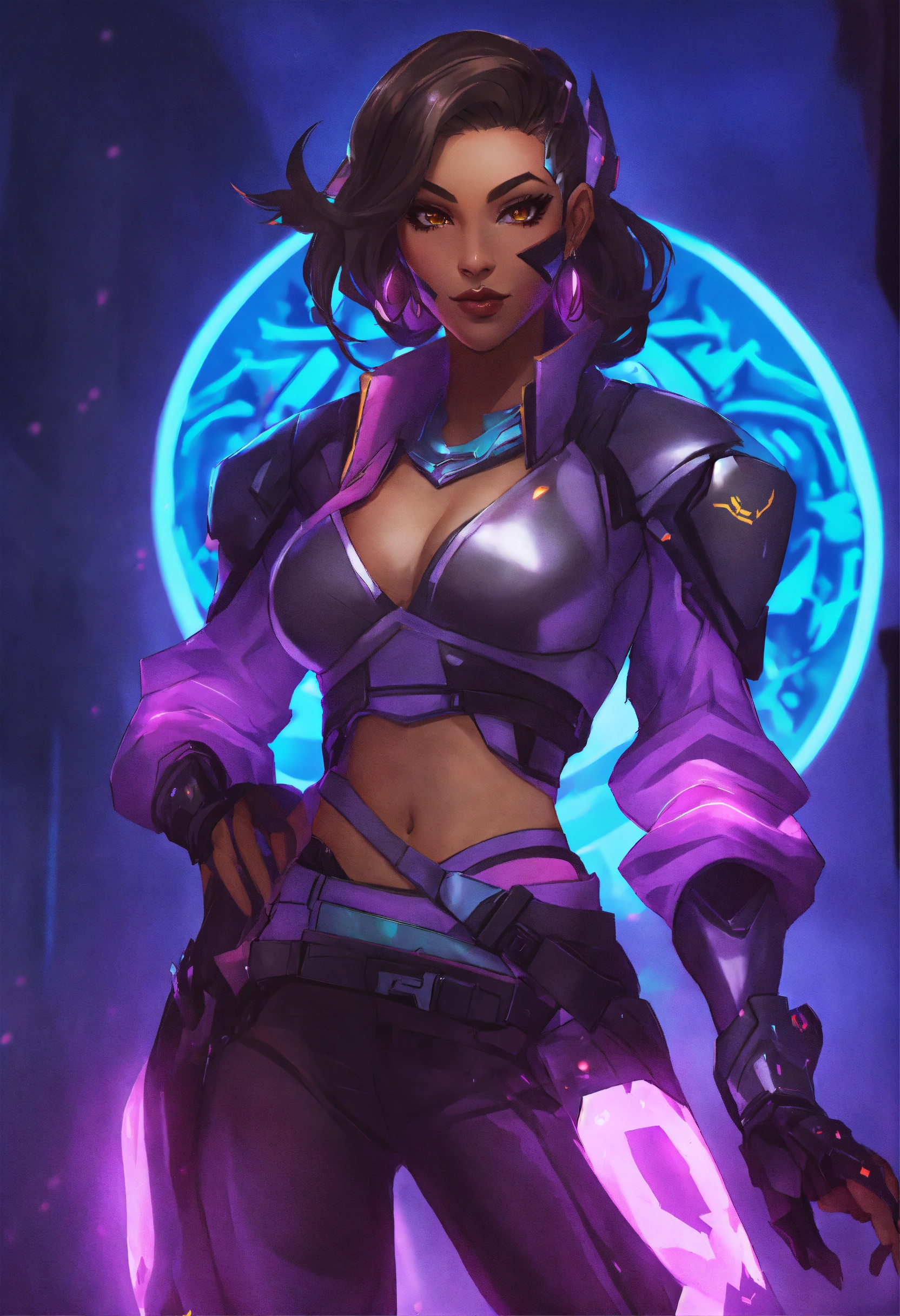 Sombra from overwatch as a anthropomorphized scorpion, crop top glowing eyes, goddess, elegant, fullbody view, wide shot