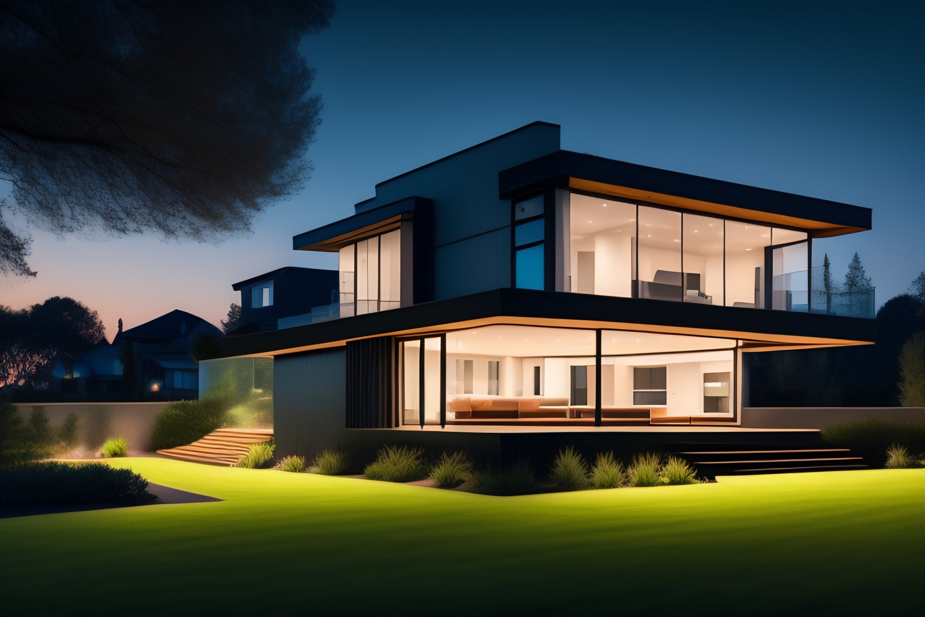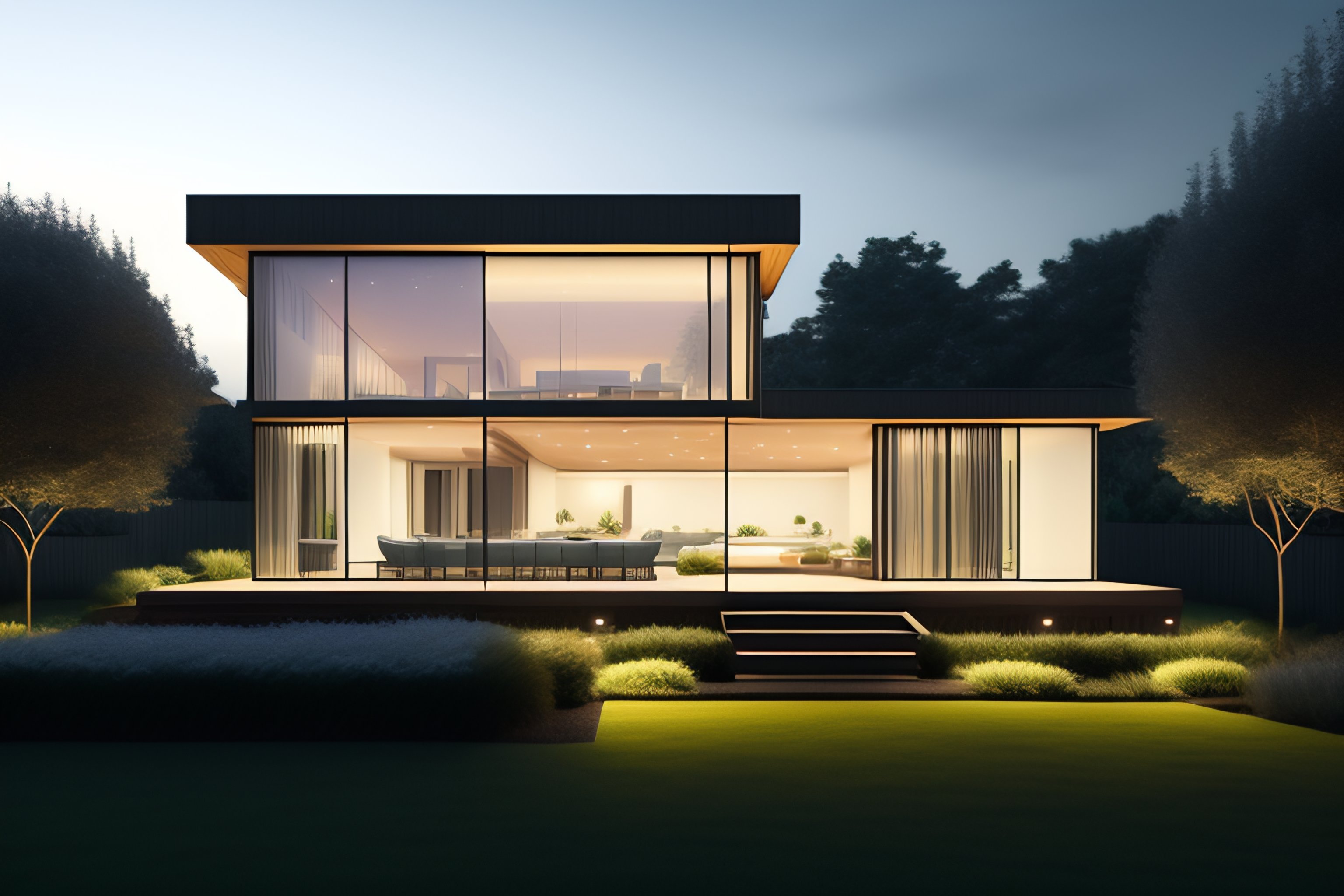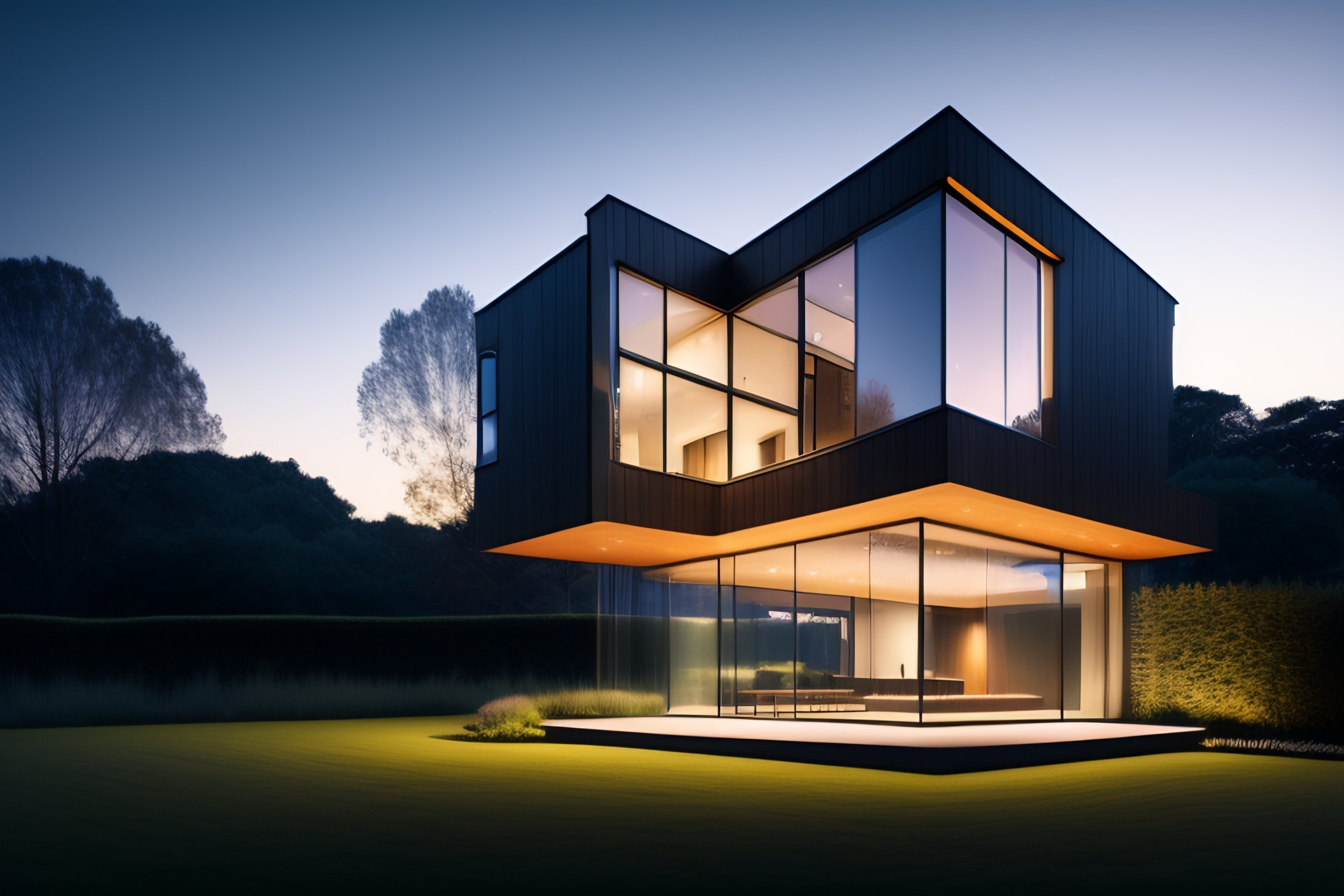 Evening lighting, warm light in the windows, night sky, architectural rendering, modern architecture, multi-family house, lawn with bushes, trees in the foreground