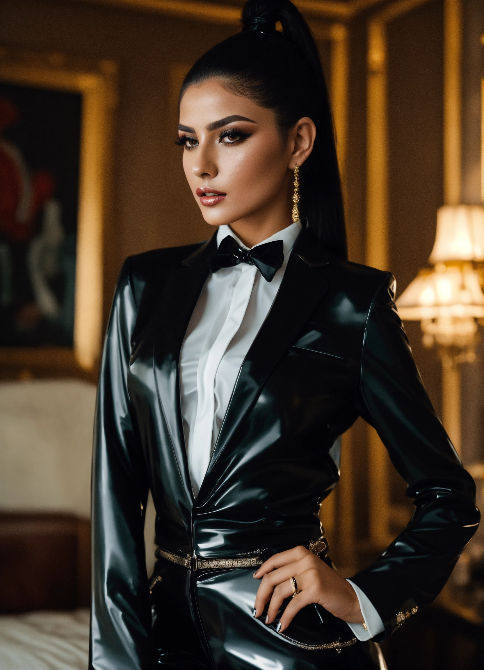 Stunning arab iran seductress woman fashion model, black straight high ponytail, black pvc latex business suit, black blazer and pants, white shirt and black tie, makeup, mansion room