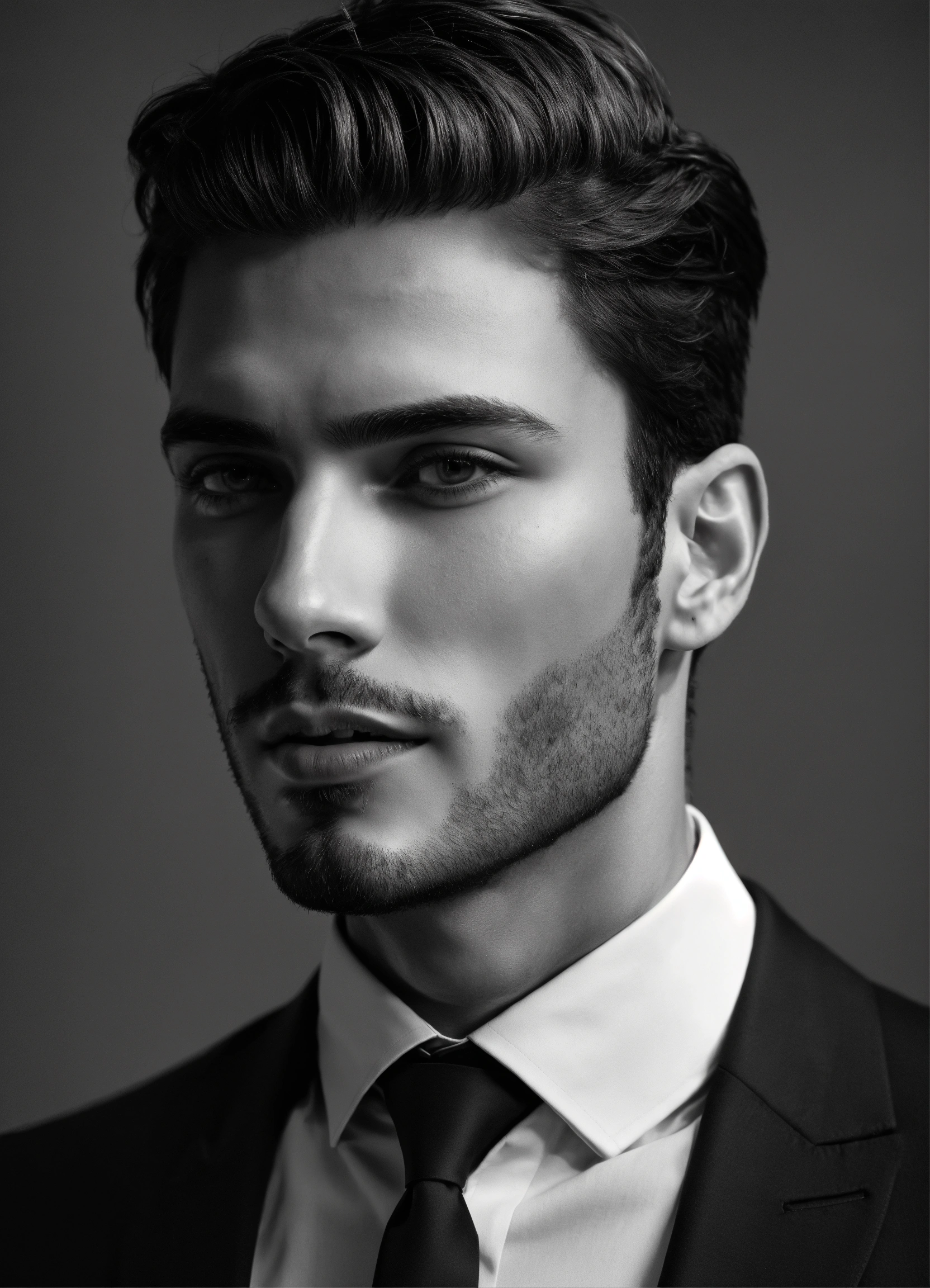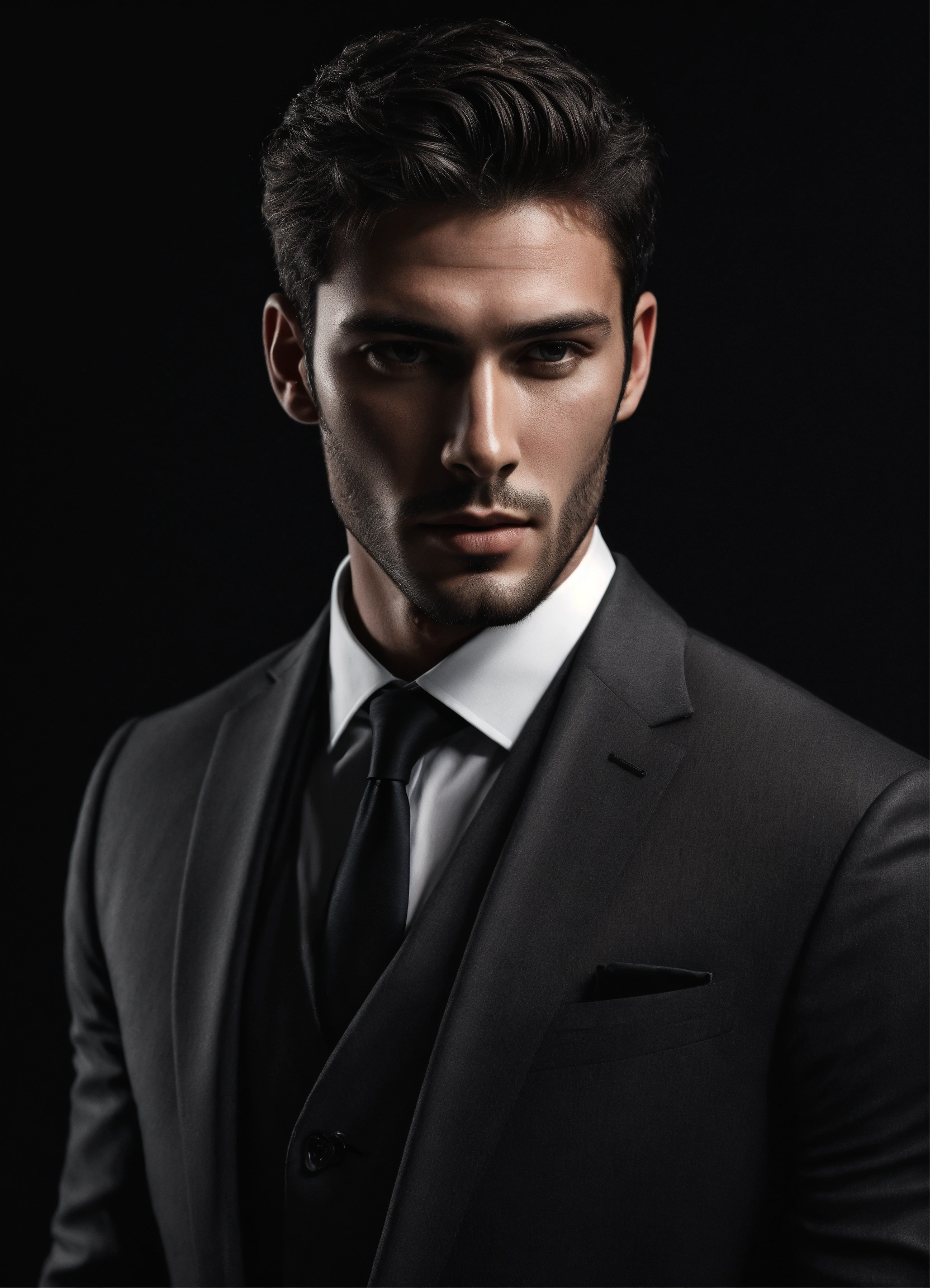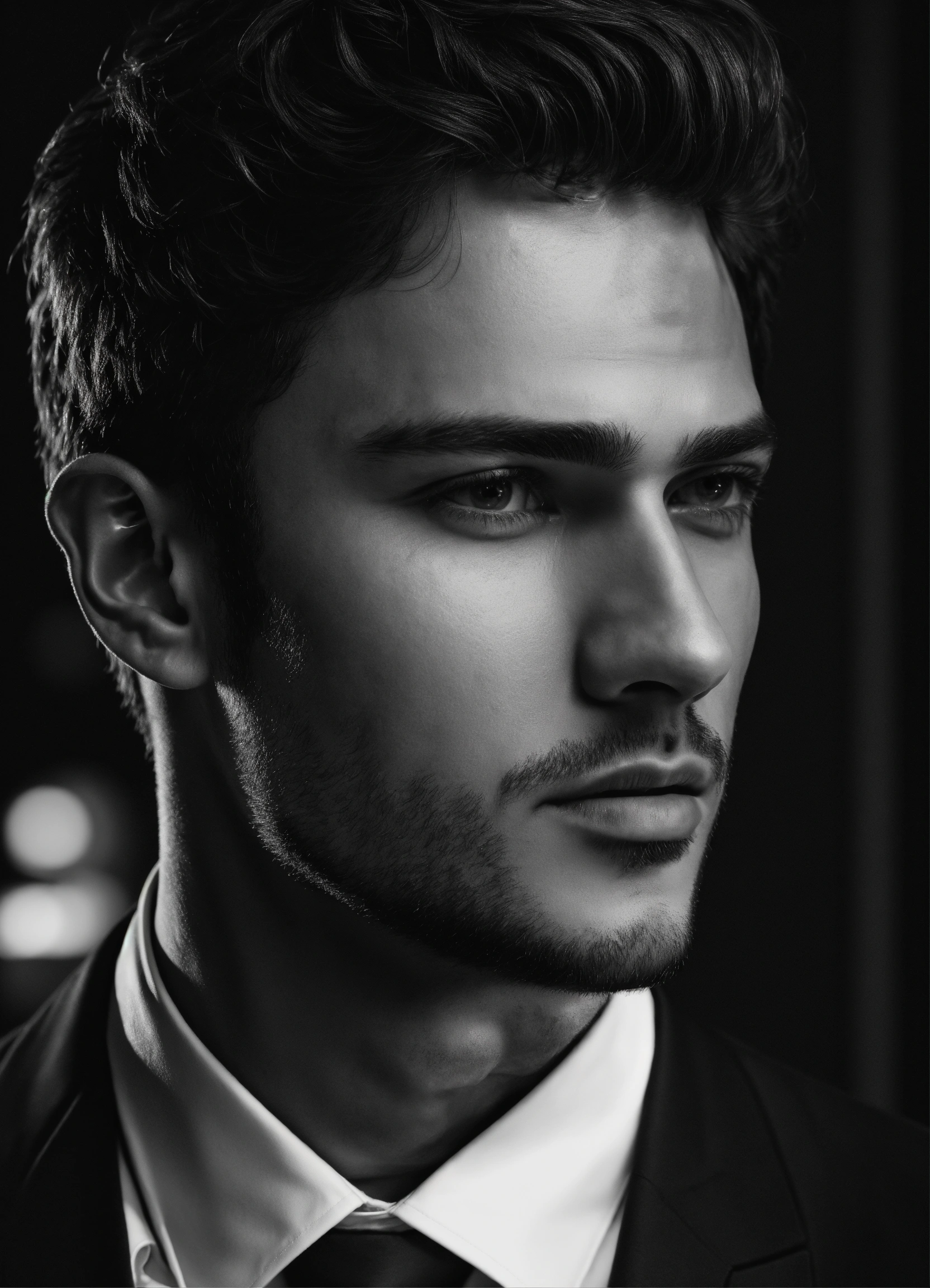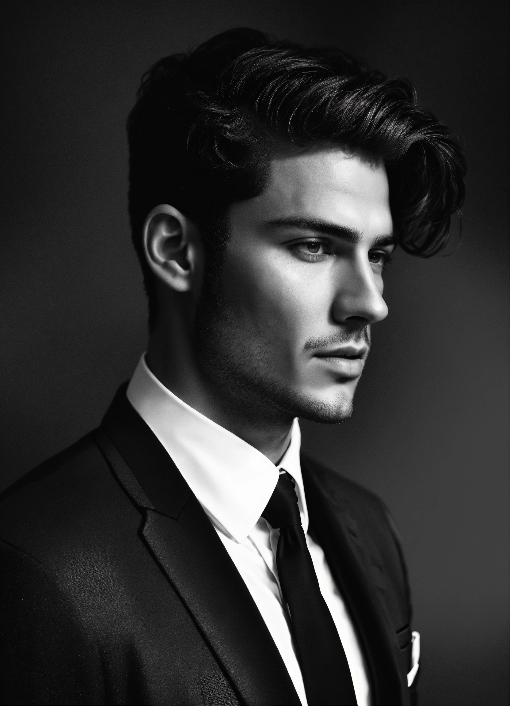 Photo of an italian male model, black and white, photorealistic, poster, not painted, very detailed faces, skin with pores, 4 k, position from left to right, model looking from left to right over his shoulder, dark suit, black plain background, skin not smoothed, face from left to right