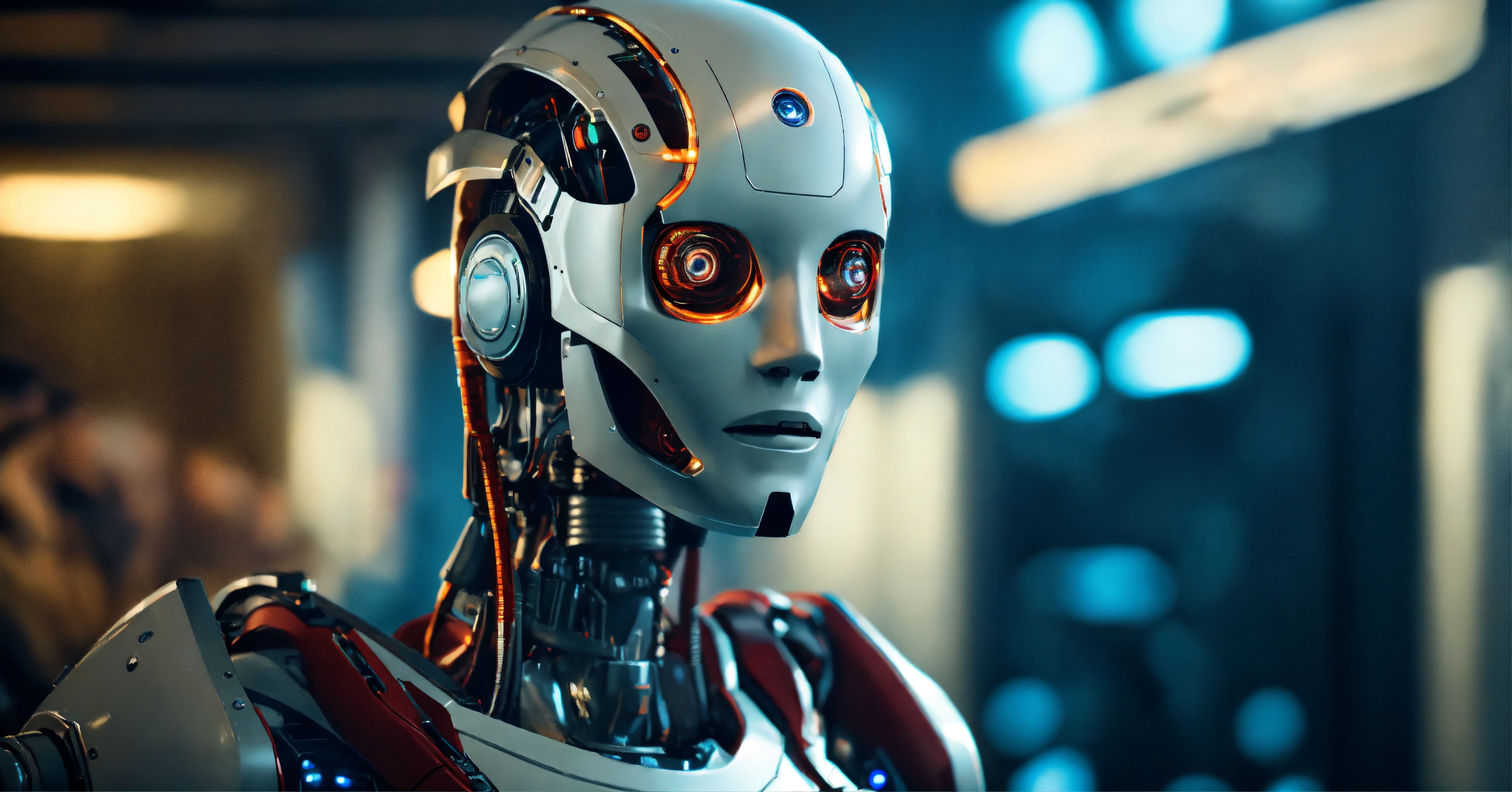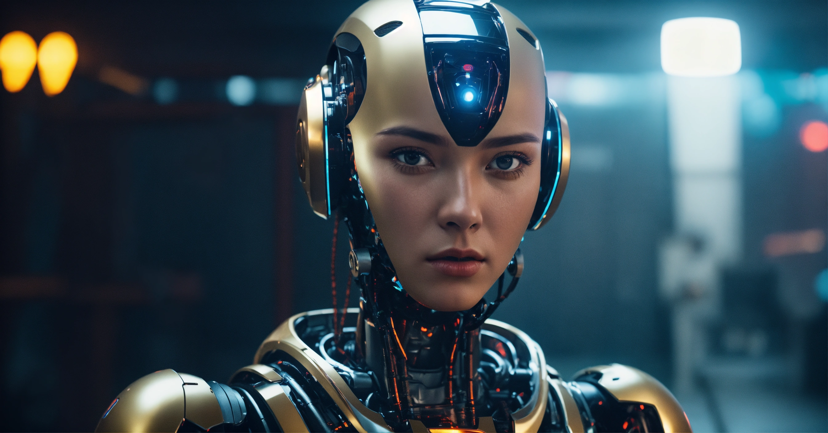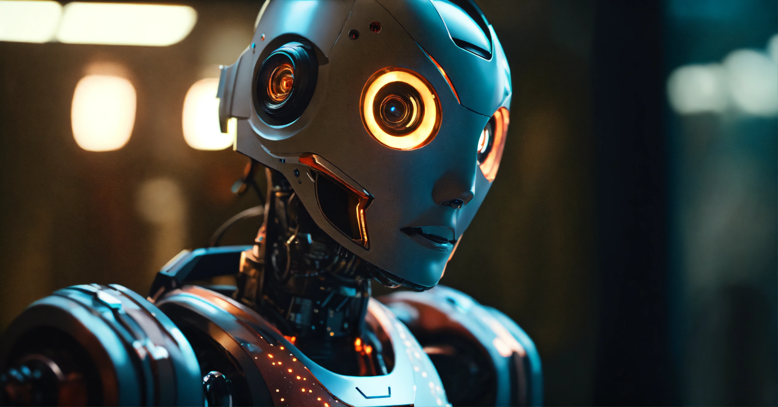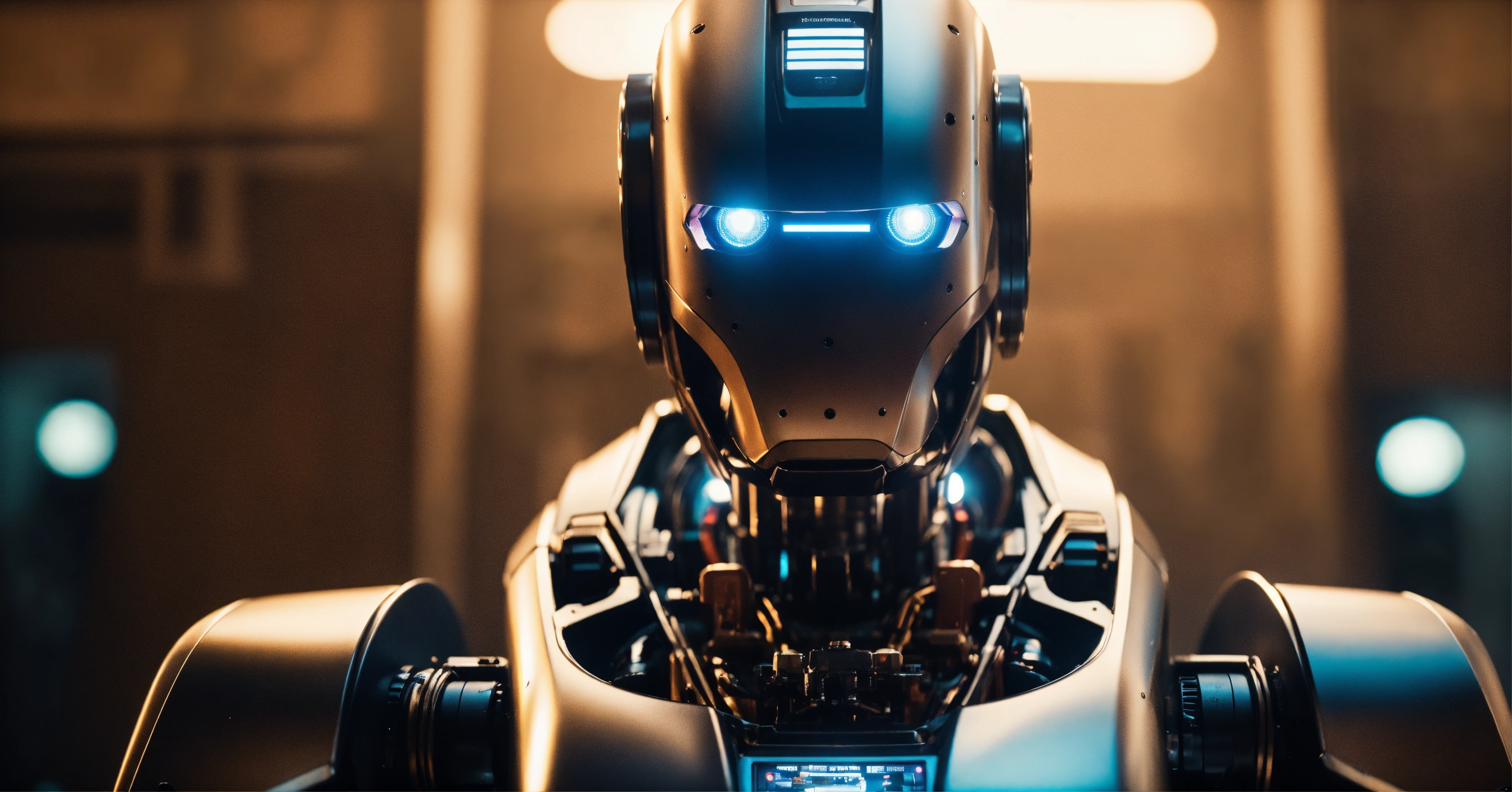 Ai robot looking at camera, high quality photo, cinematic shot, cinematic, realistic, film grain, volumetric light, imax, photorealistic, hyperdetailed textures, sharp focus, studio photo, epic scene