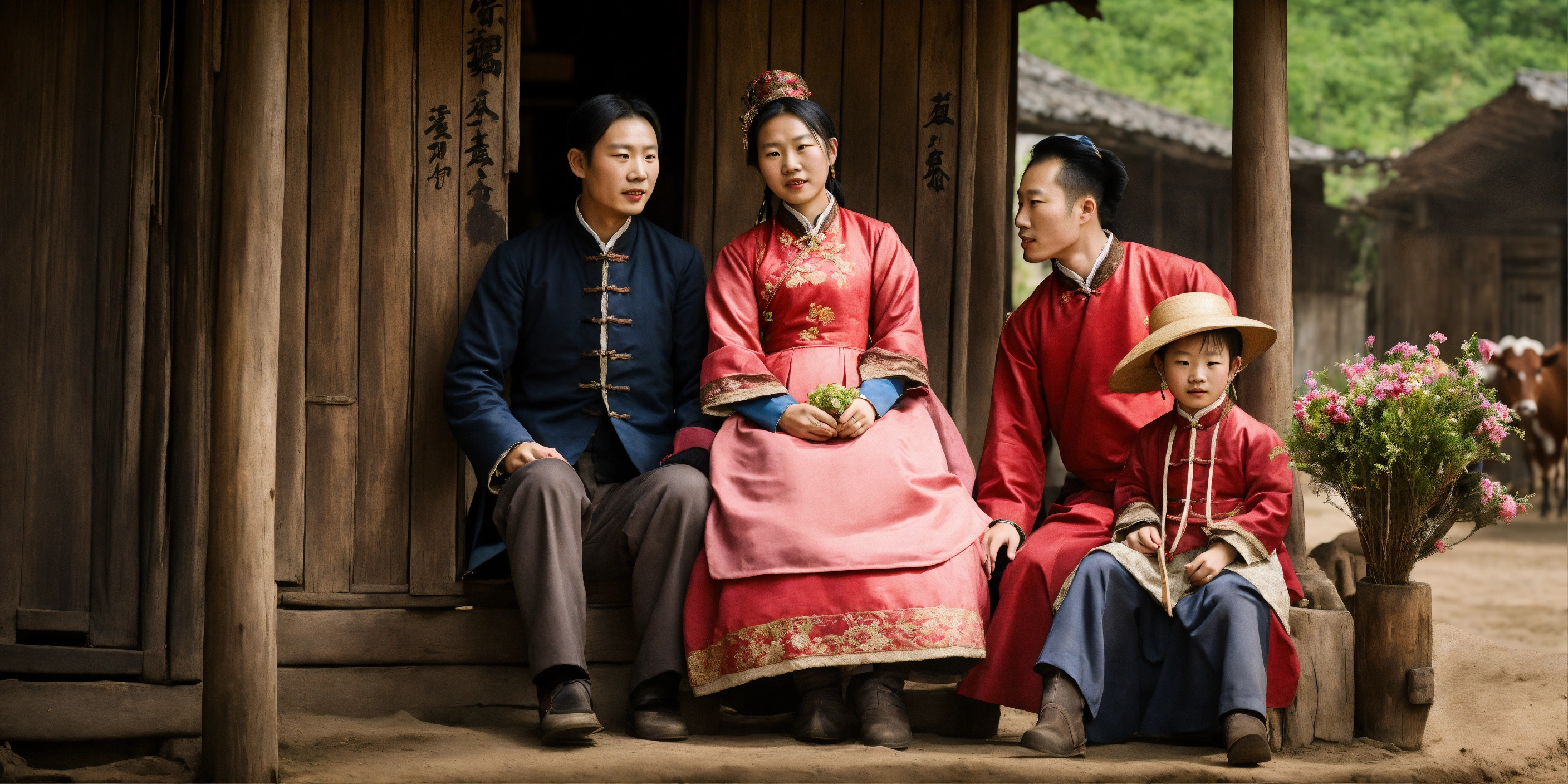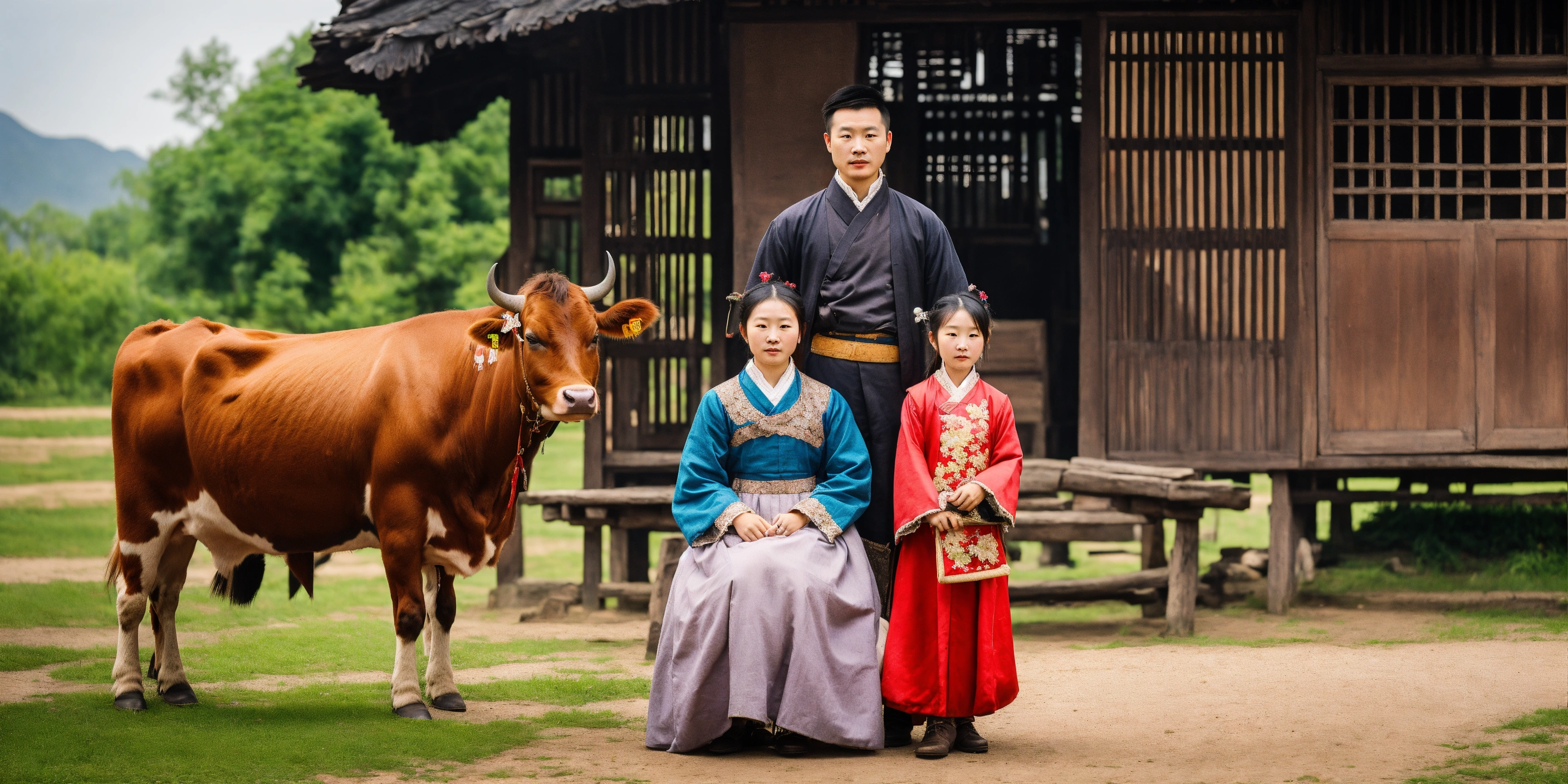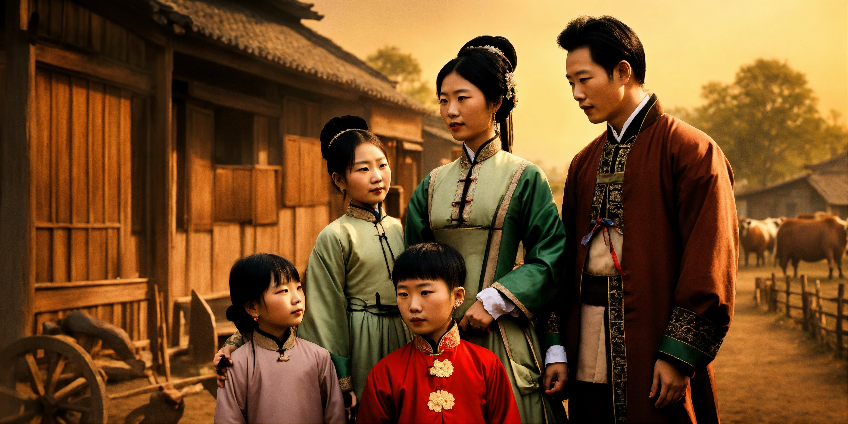 Young chinese couple, husband and wife, dressed in 19th century clothing, with three young chinese children. they live in an old farmhouse, and a cow in the corral
