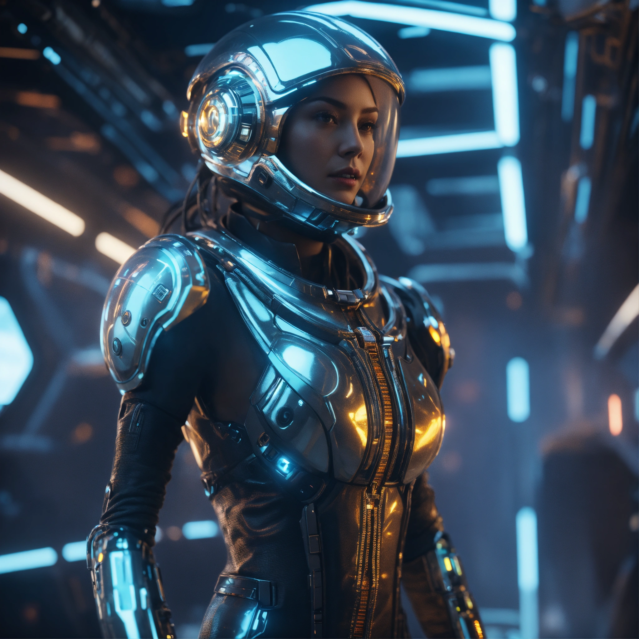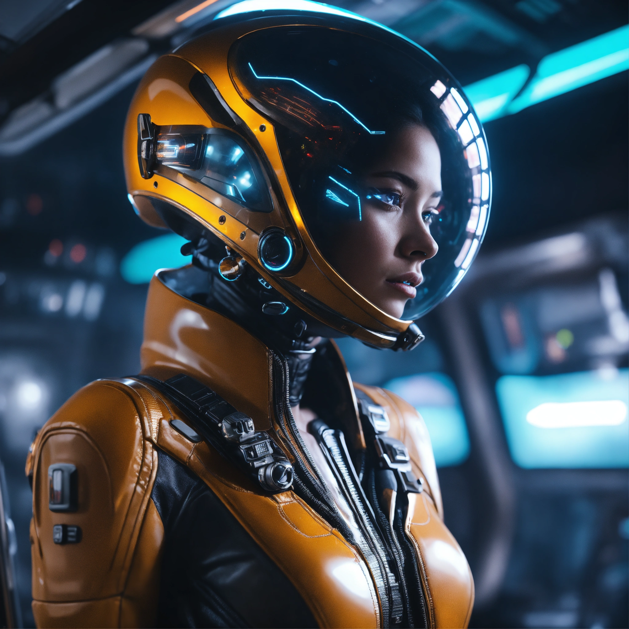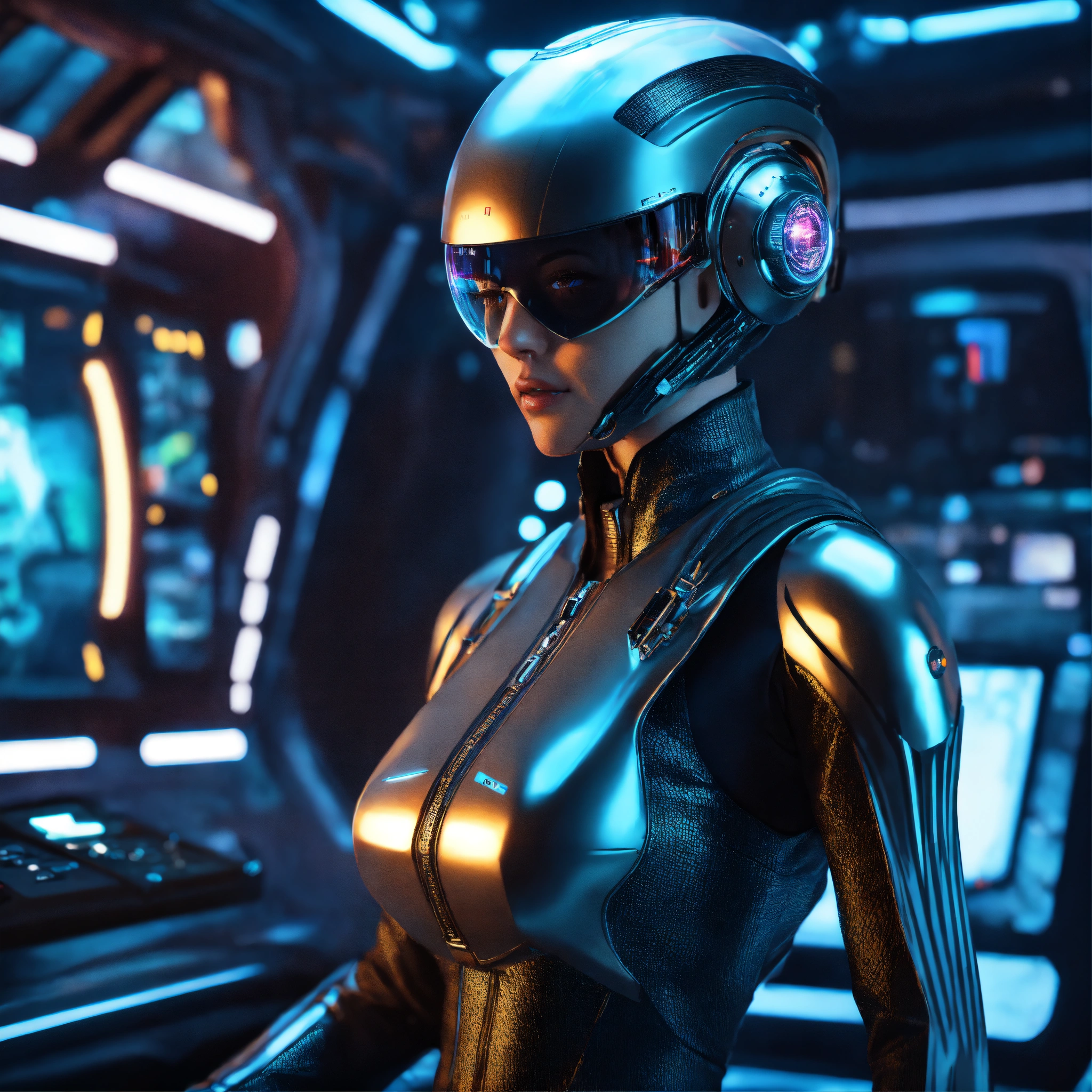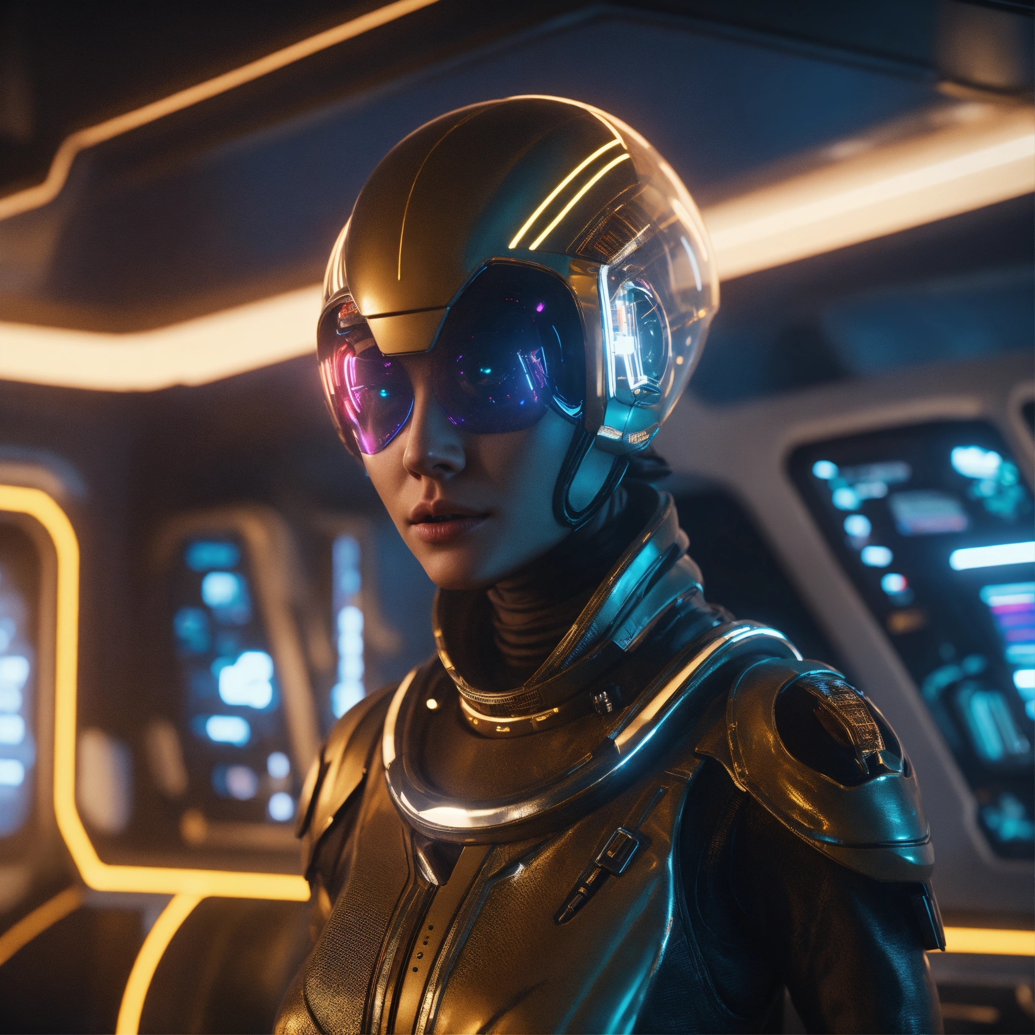 Zoom out from a cool alien wearing hi tech space fashion and at the controls of futuristic space yacht, realistic, futuristic, sci-fi, 8k, unreal engine