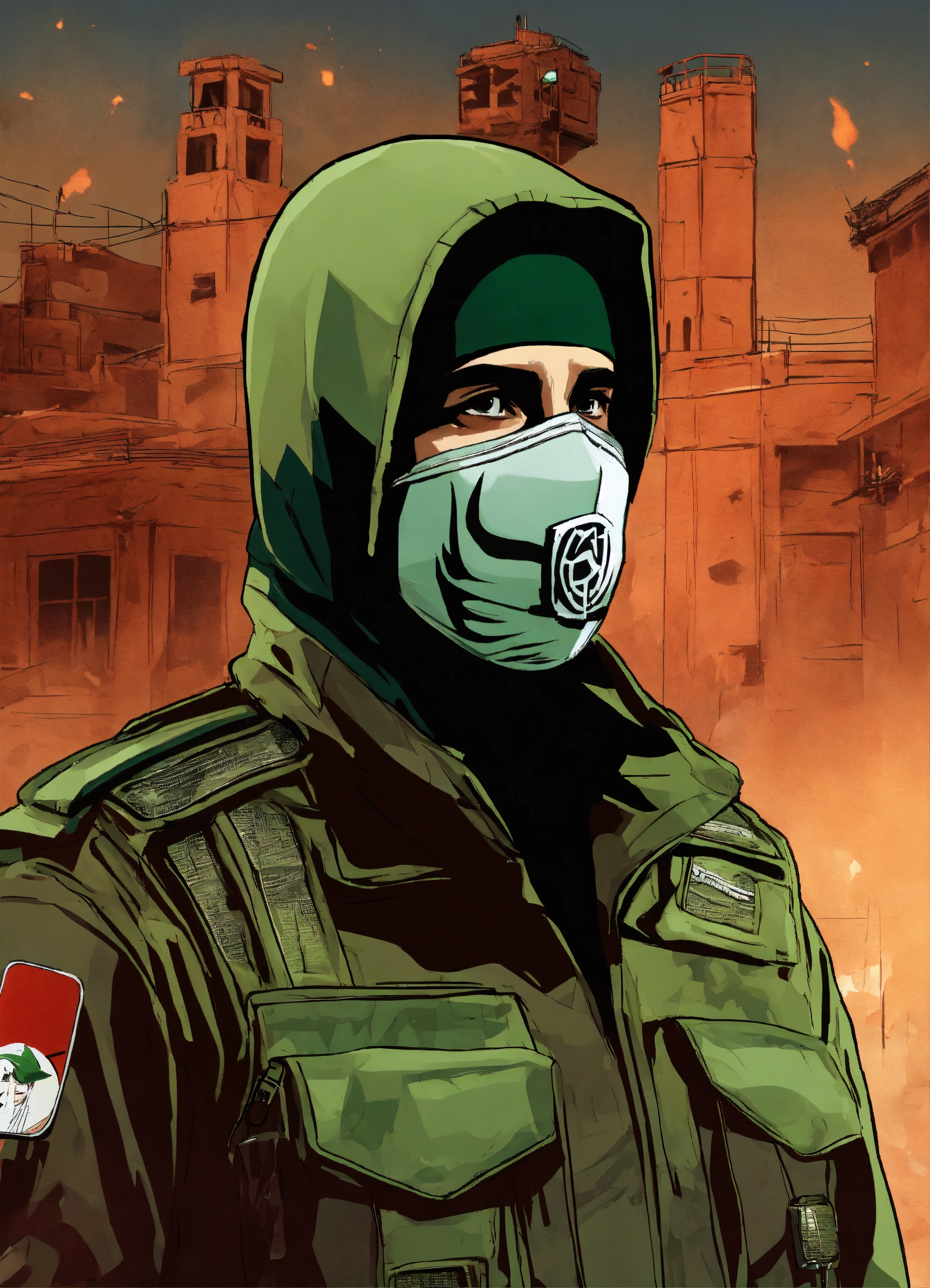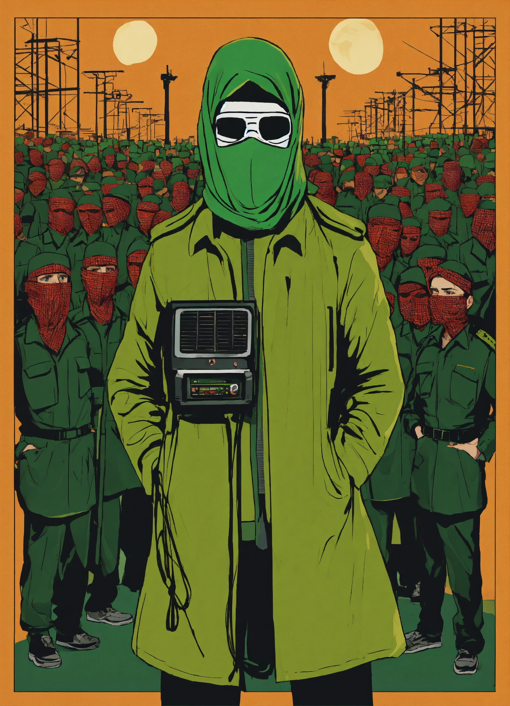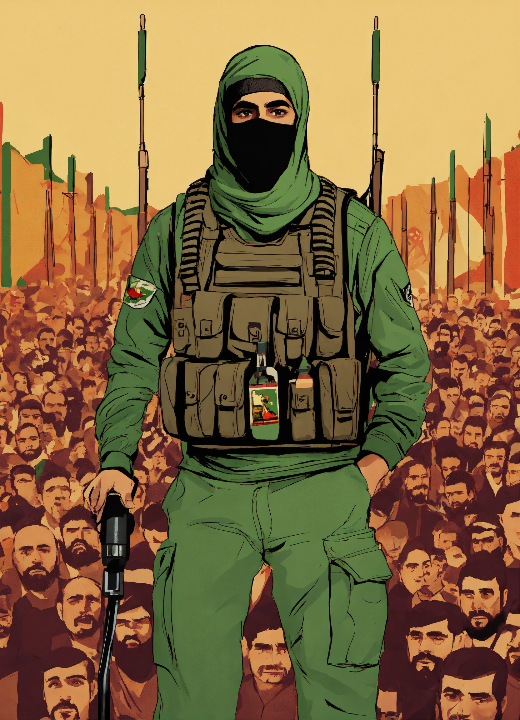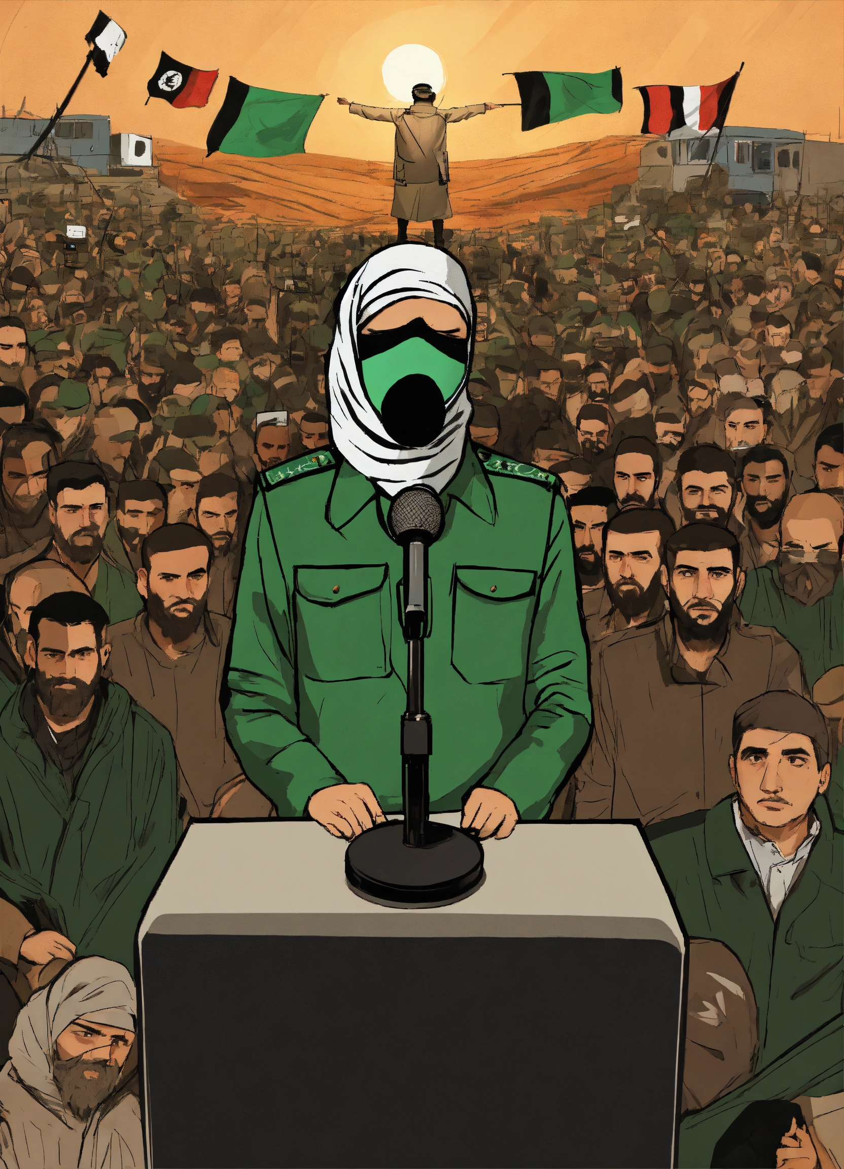 "a design that represents a fighter from hamas, masked, standing in front of numerous microphones and appearing on a television screen, where he is the official spokesperson for the resistance movement."
