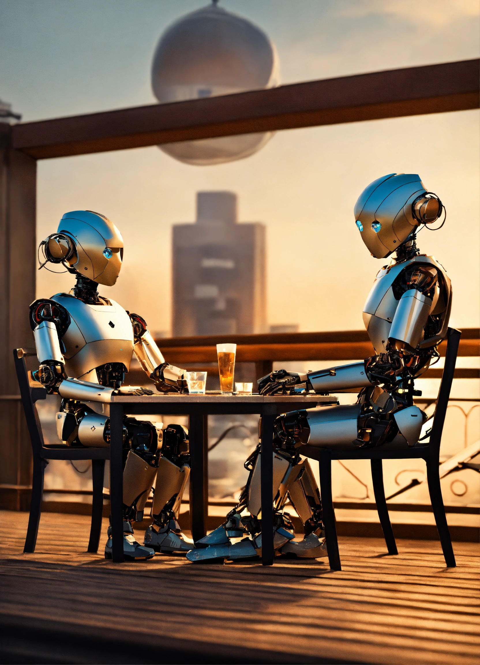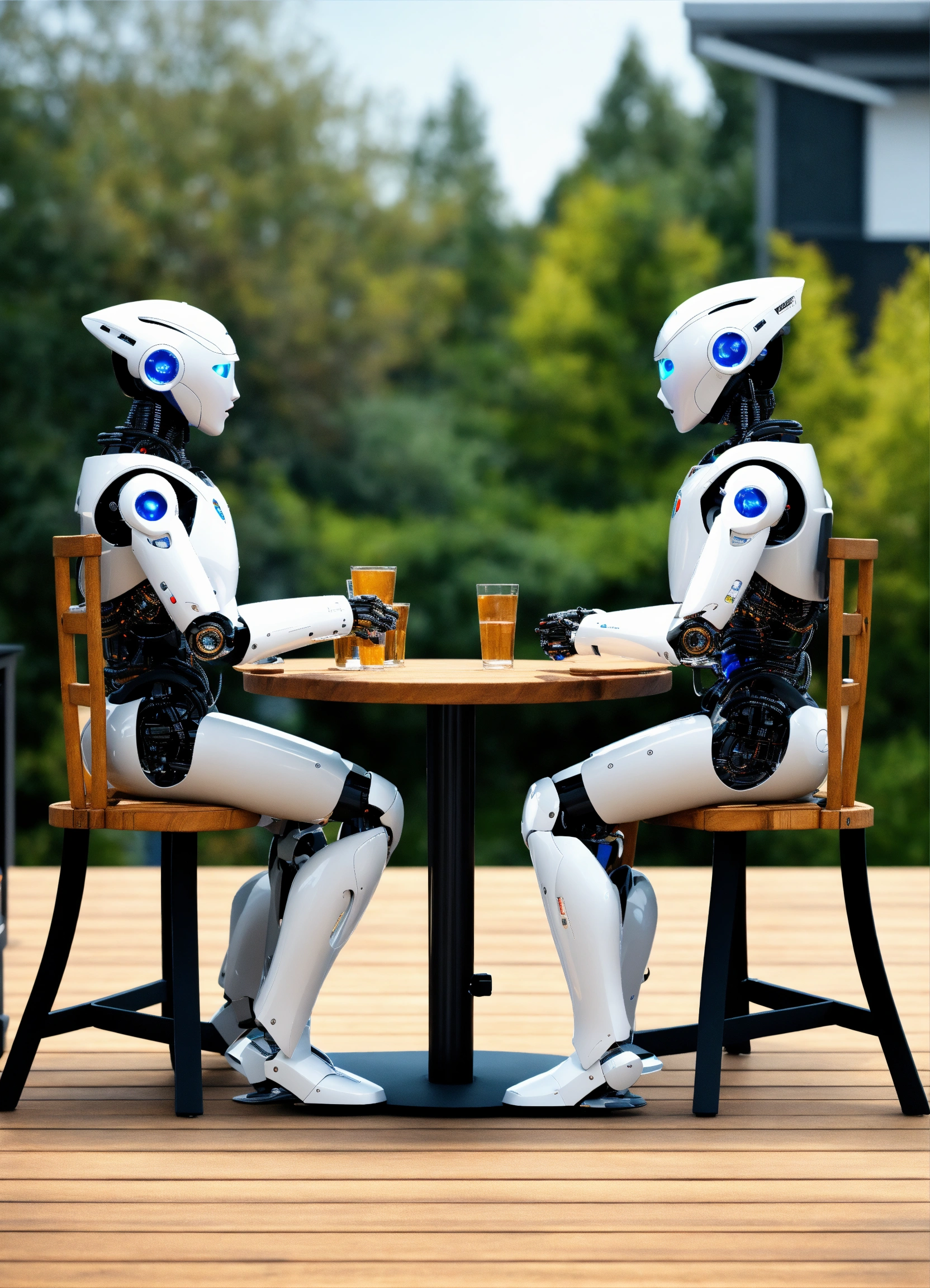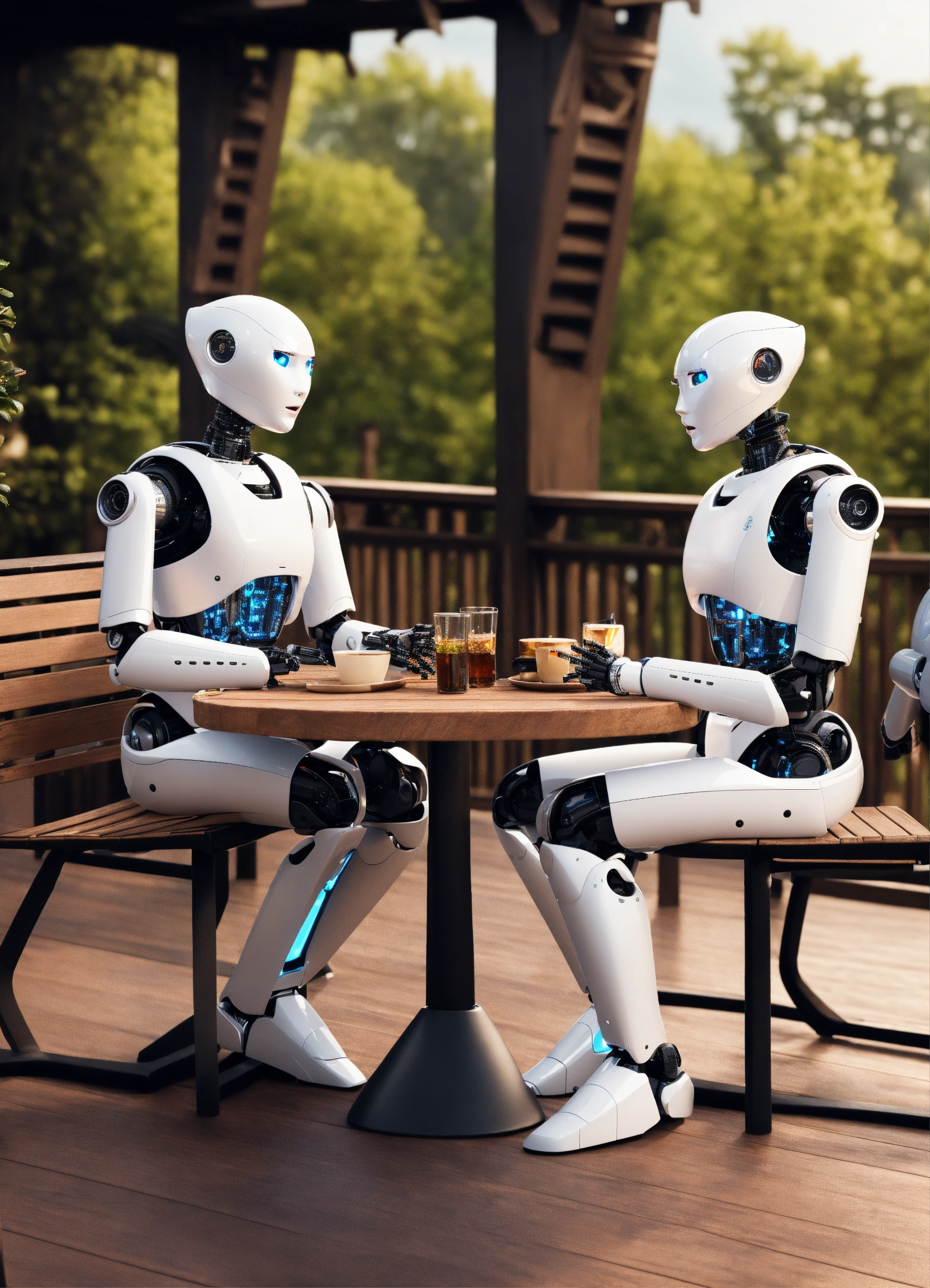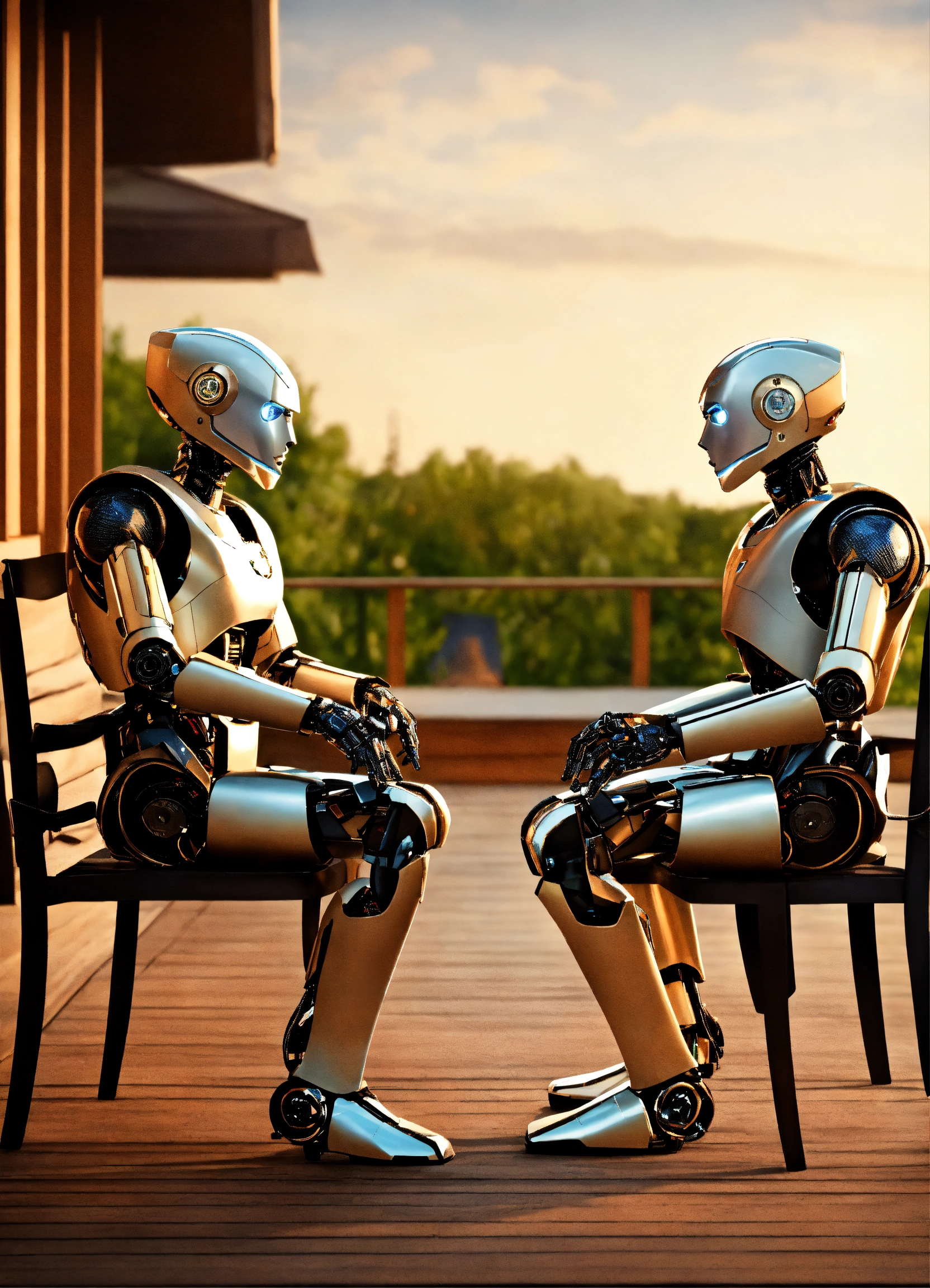 Create a hyper-realistic 4k image showcasing two humanoid robots sitting on chairs on a deck, having a conversation