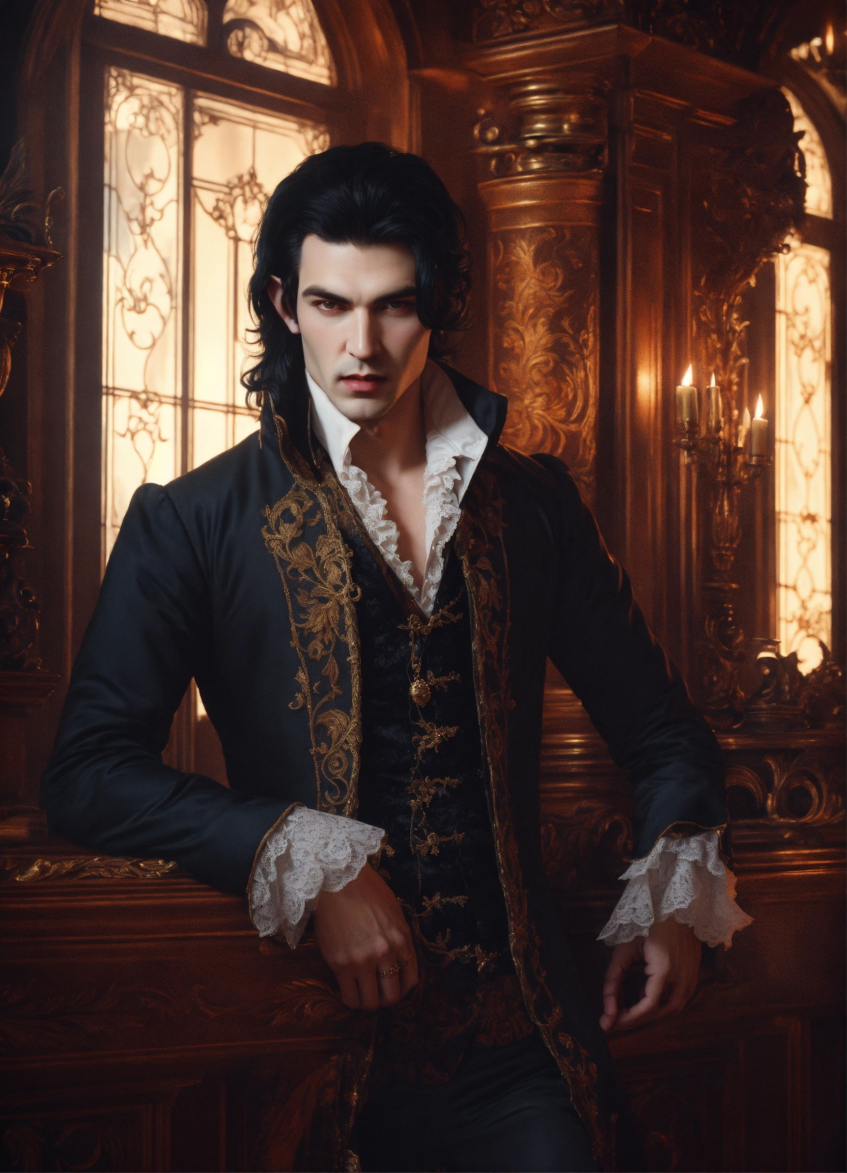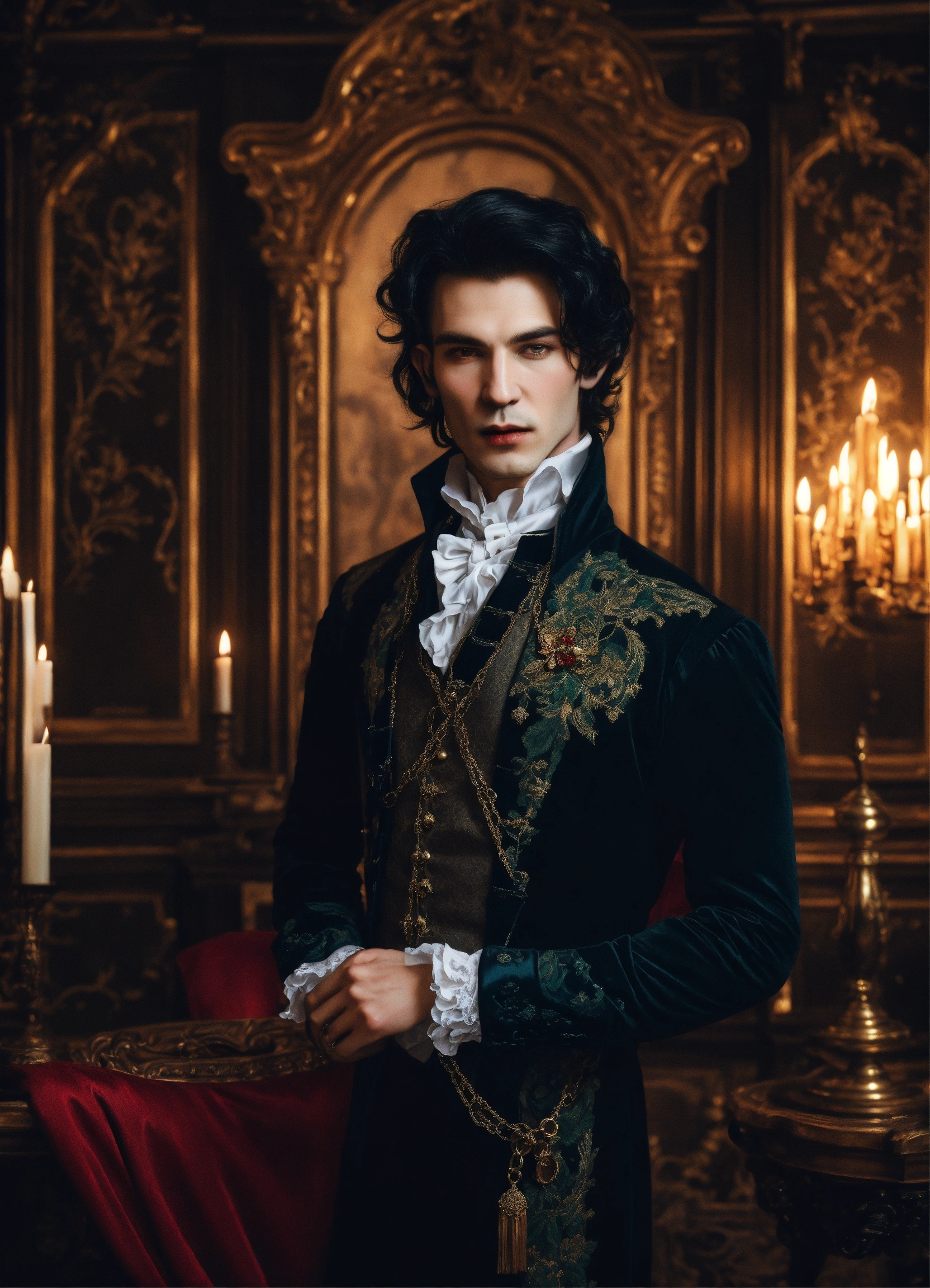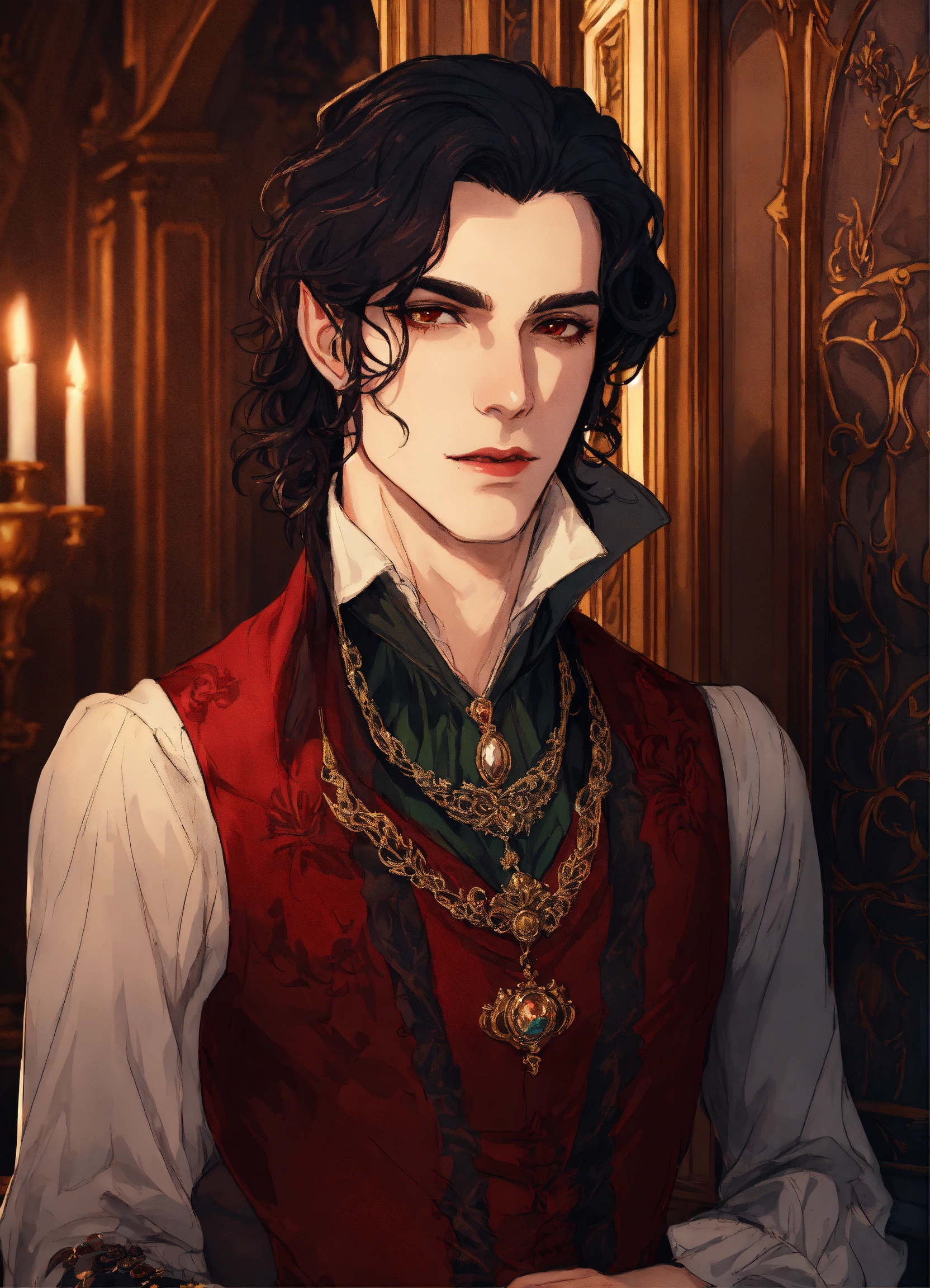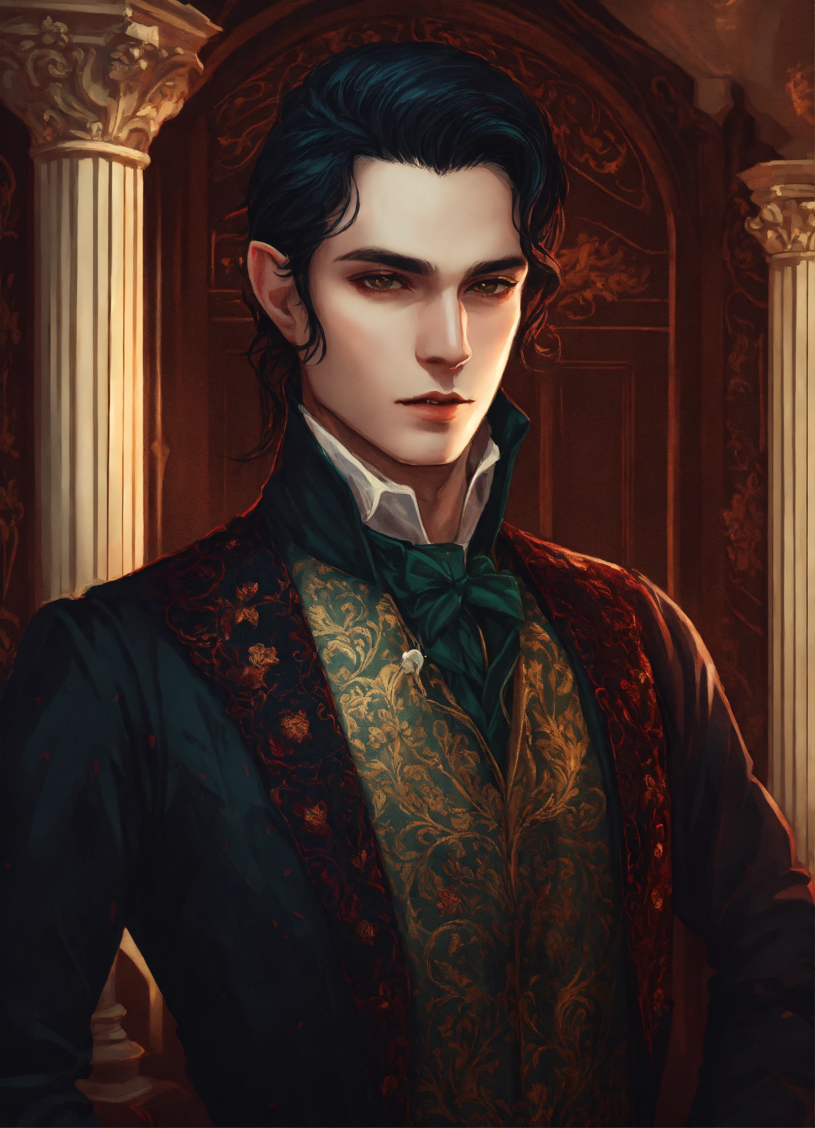 Close up portrait of a beautiful elf male vampire nobleman in an opulent vampire mansion, black hair and pale skin, elegant victorian attire, drawn art style