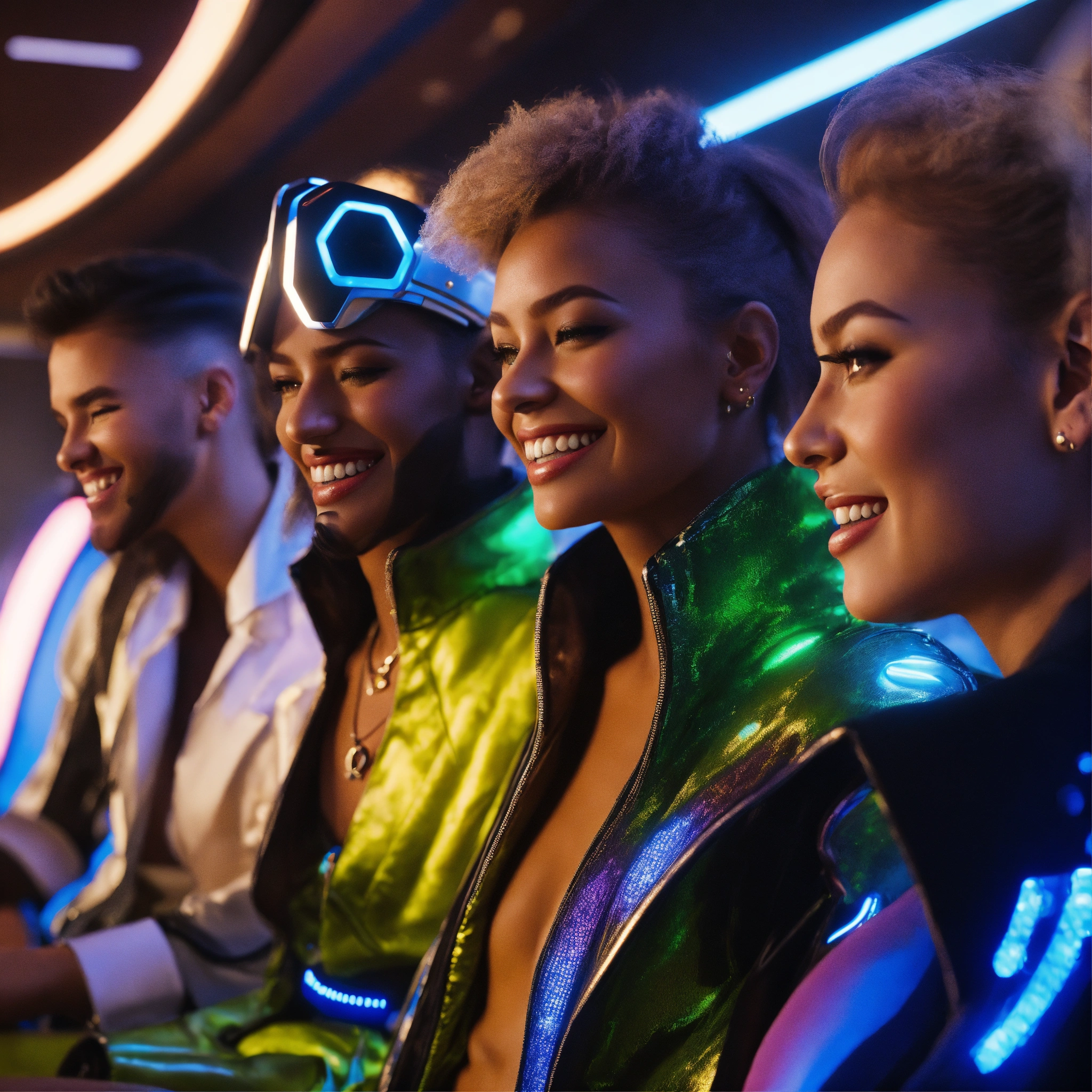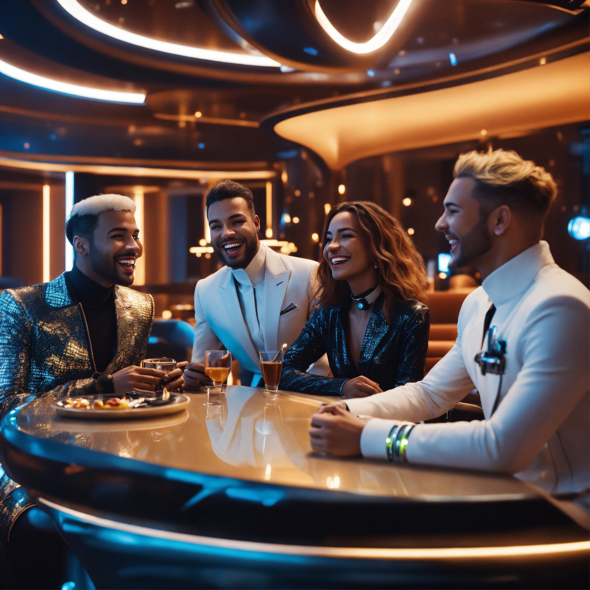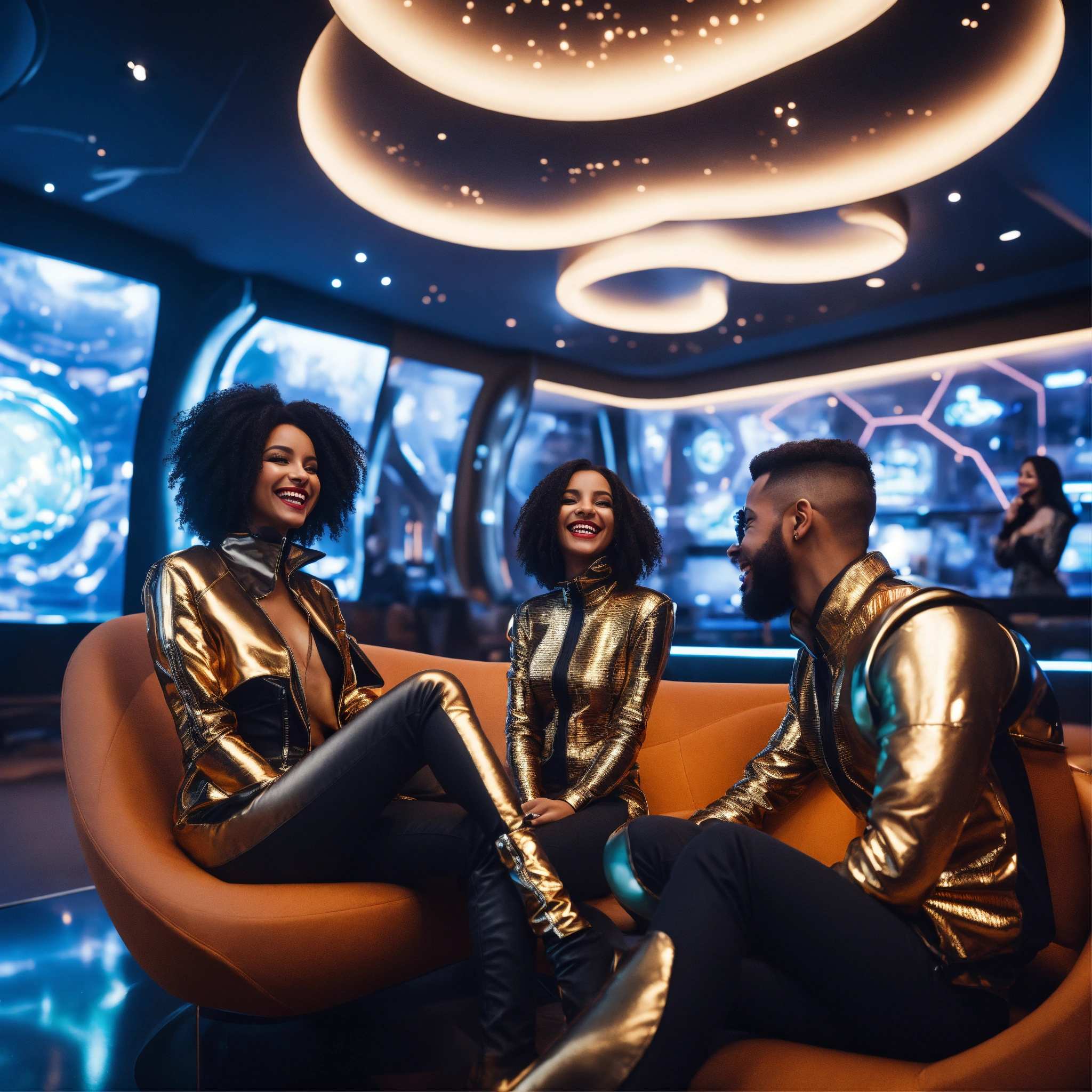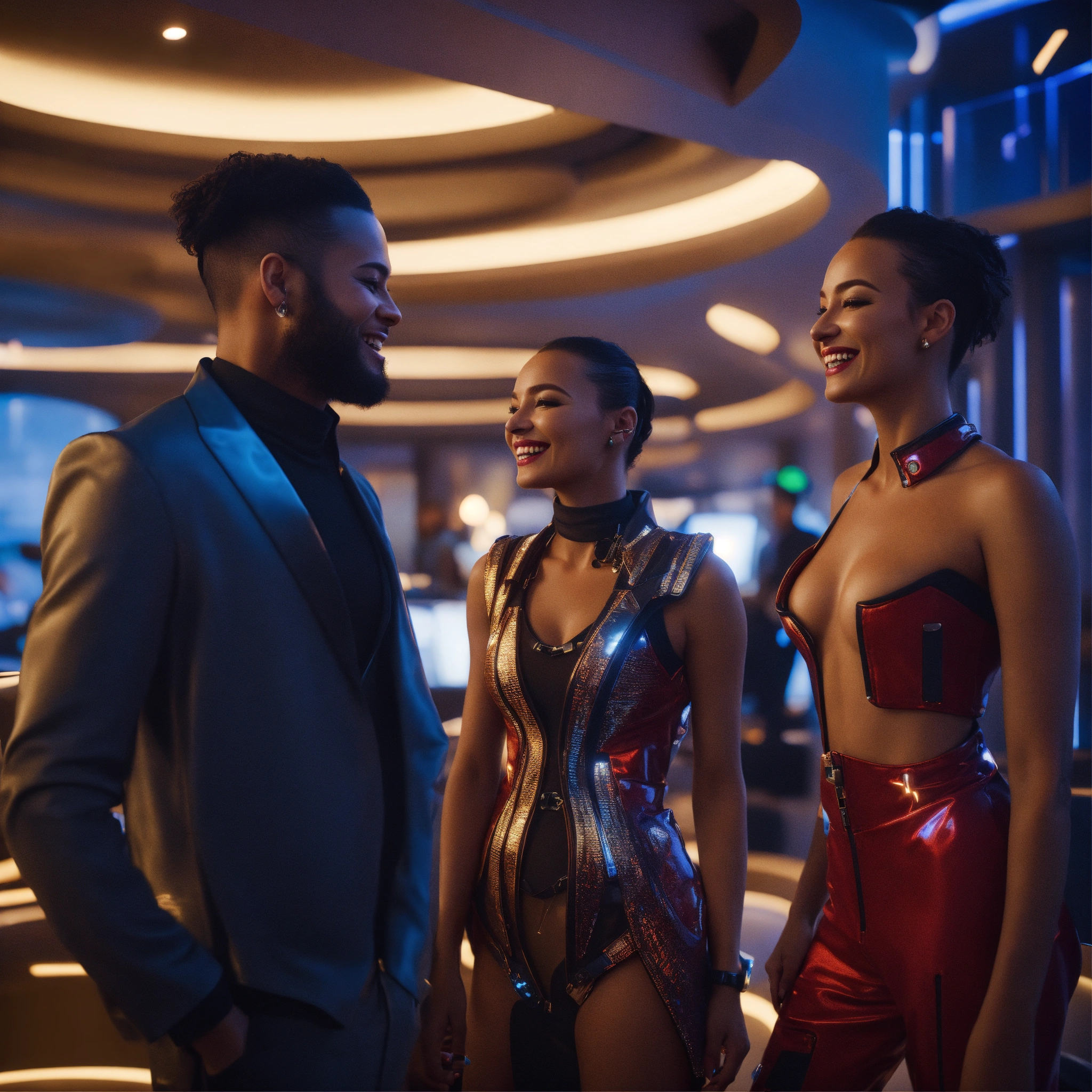 Close up of 3 beautiful male and female travelers wearing stylish futuristic clothes that are laughing and havinga good time relaxing in a luxurious space port hotel lounge reception area, realistic, futuristic, sci-fi, 8k, unreal engine, pixar, disney, zaha hadid