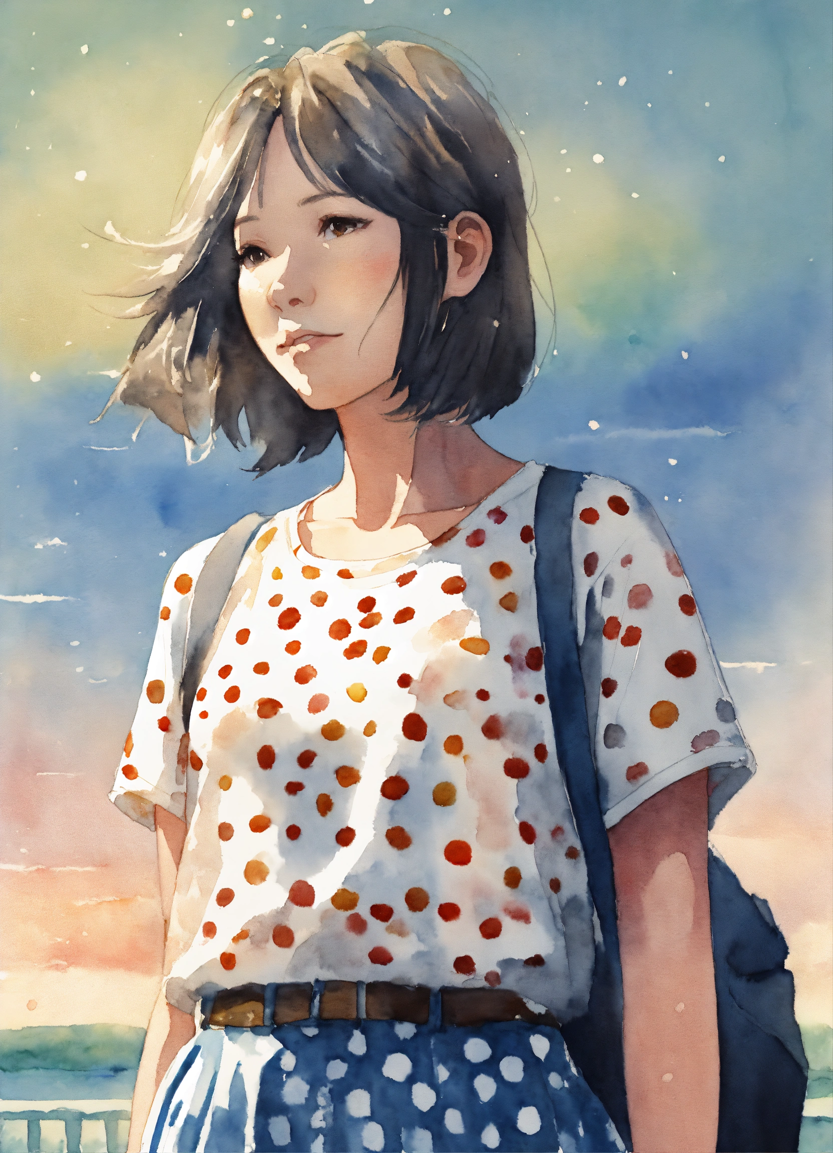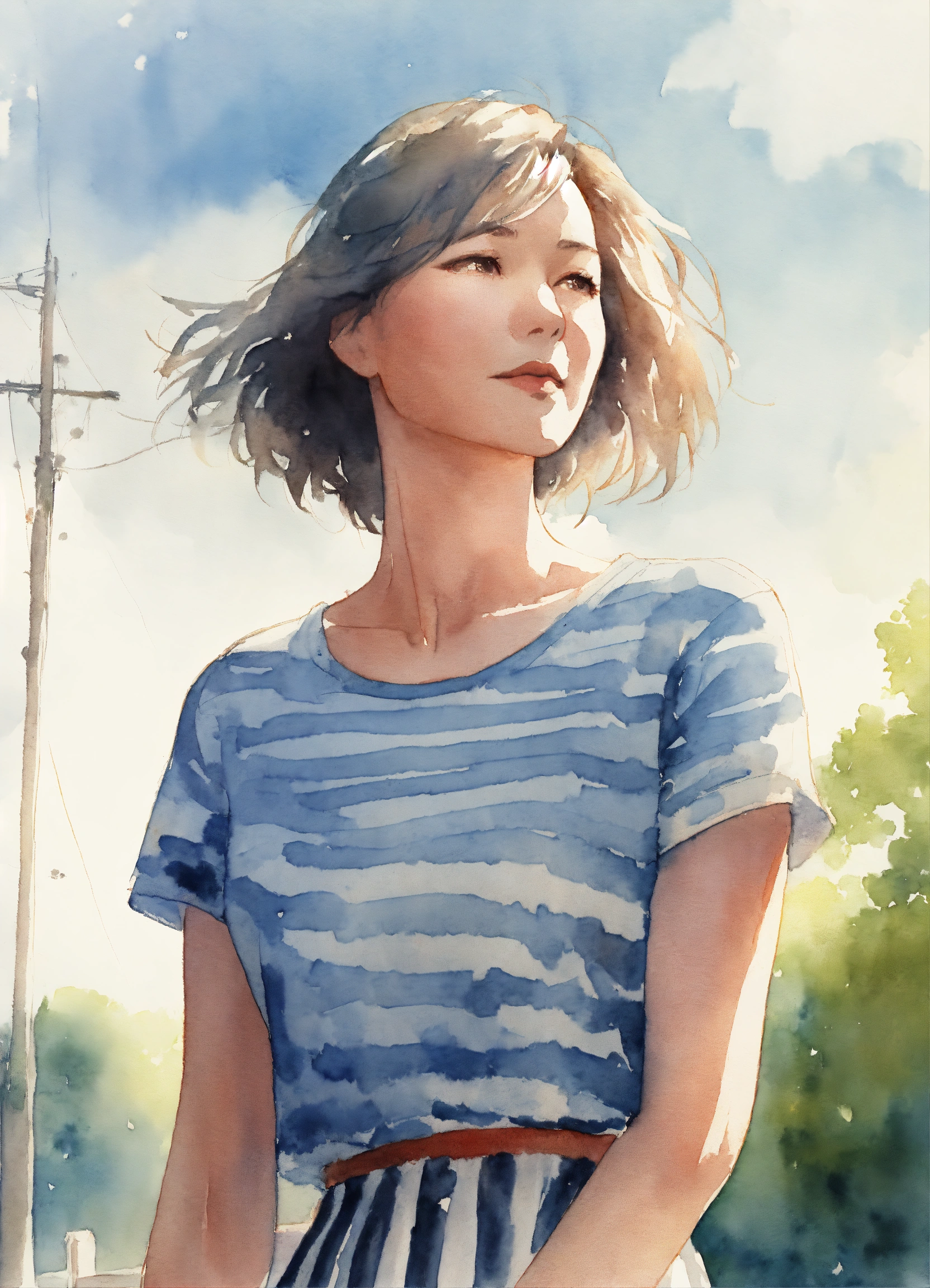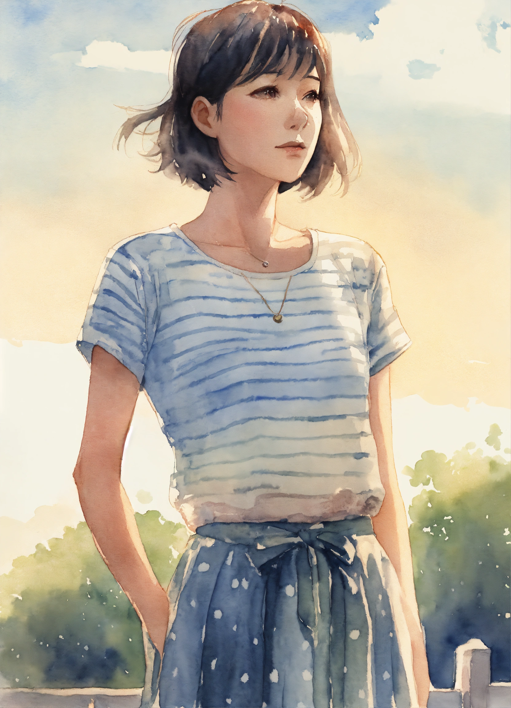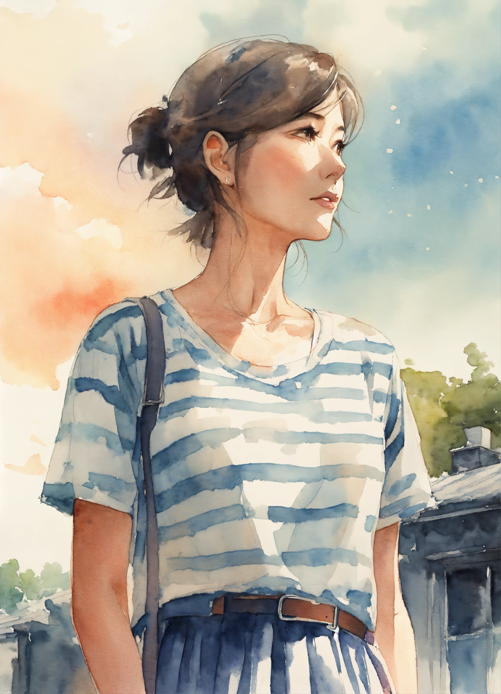 Half body watercolor illustration of an 45 years old adult woman looking to the front, wearing a polka dots t-shirt and a loose striped skirt, comfortable, stylish, chic, no makeup, effortless, relaxed, casual, laid-back, frontal facing, beautiful light sky, low saturation, muted colors, animation, fantasy art, by makoto shinkai