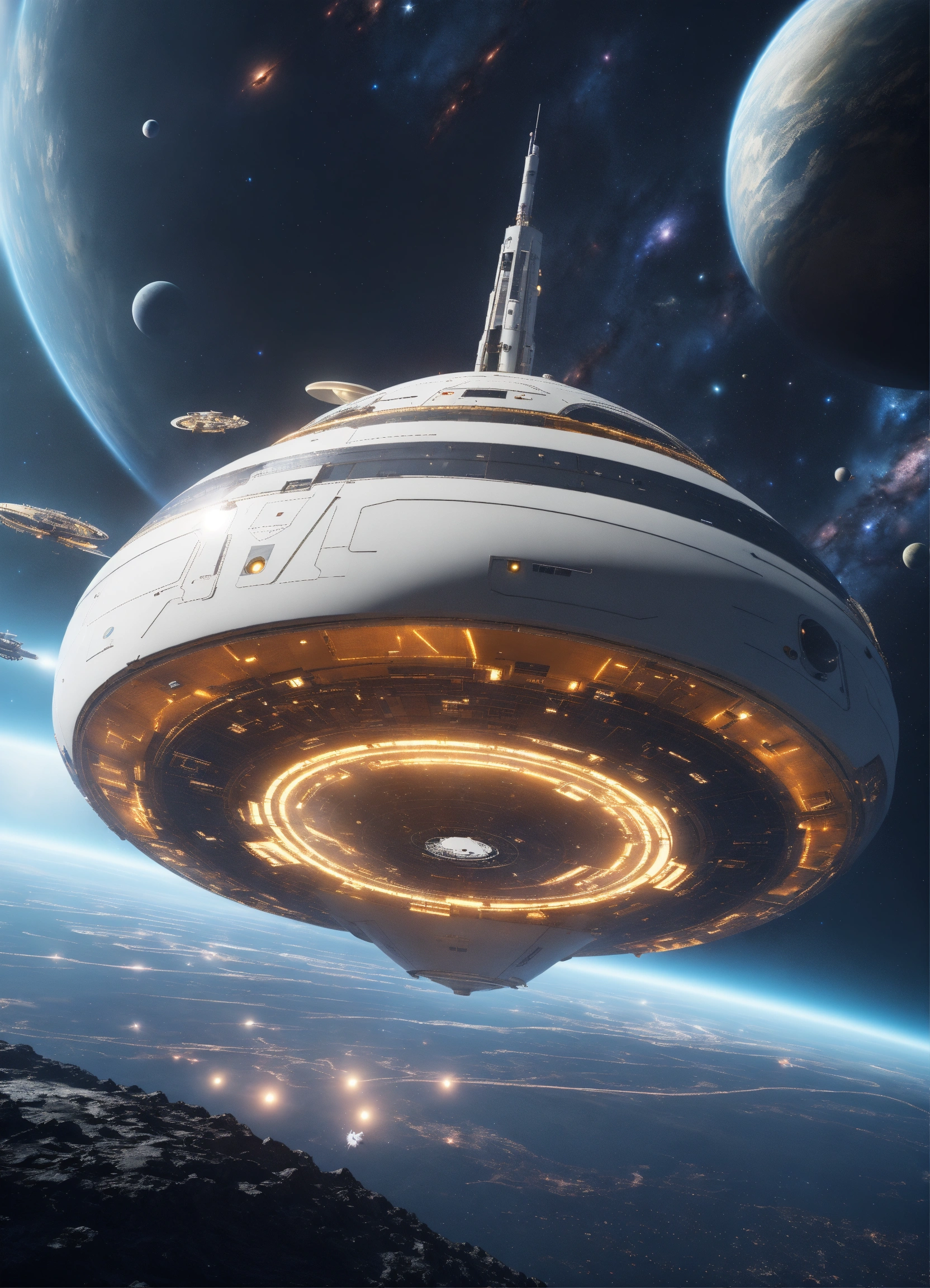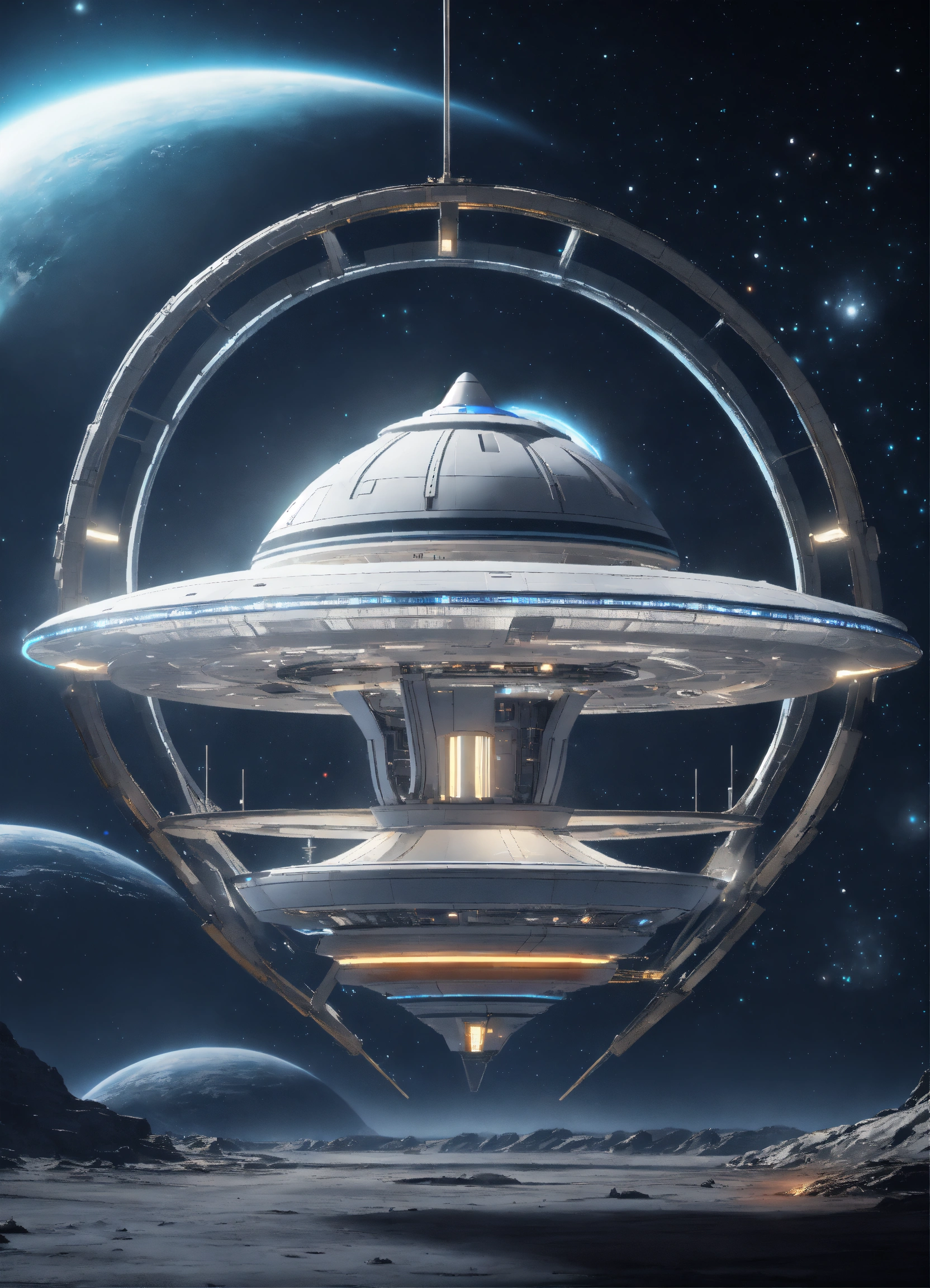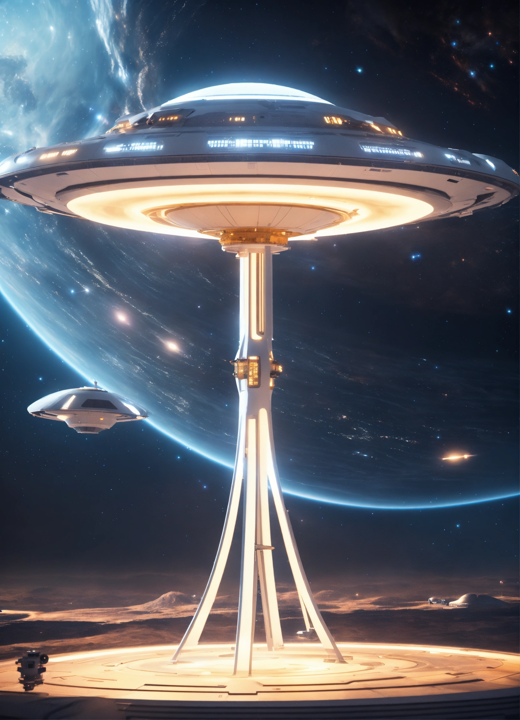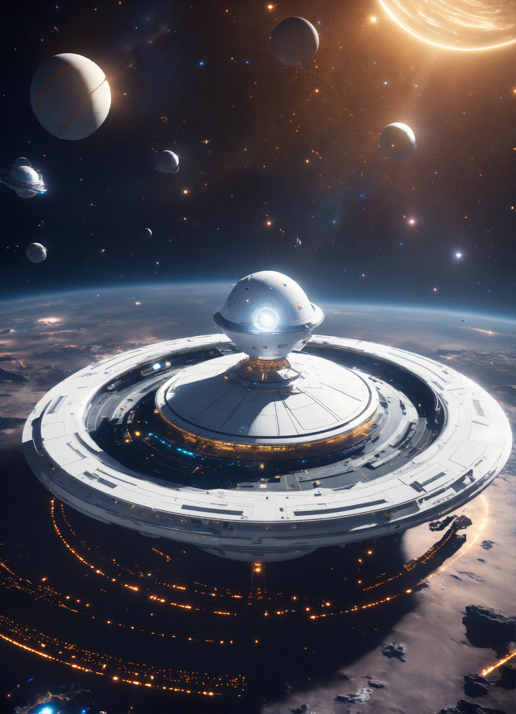Beautiful white spinning top shaped spaceport flying floating in deep space, artificial star, futuristic, sci-fi, 8k, unreal engine, pixar