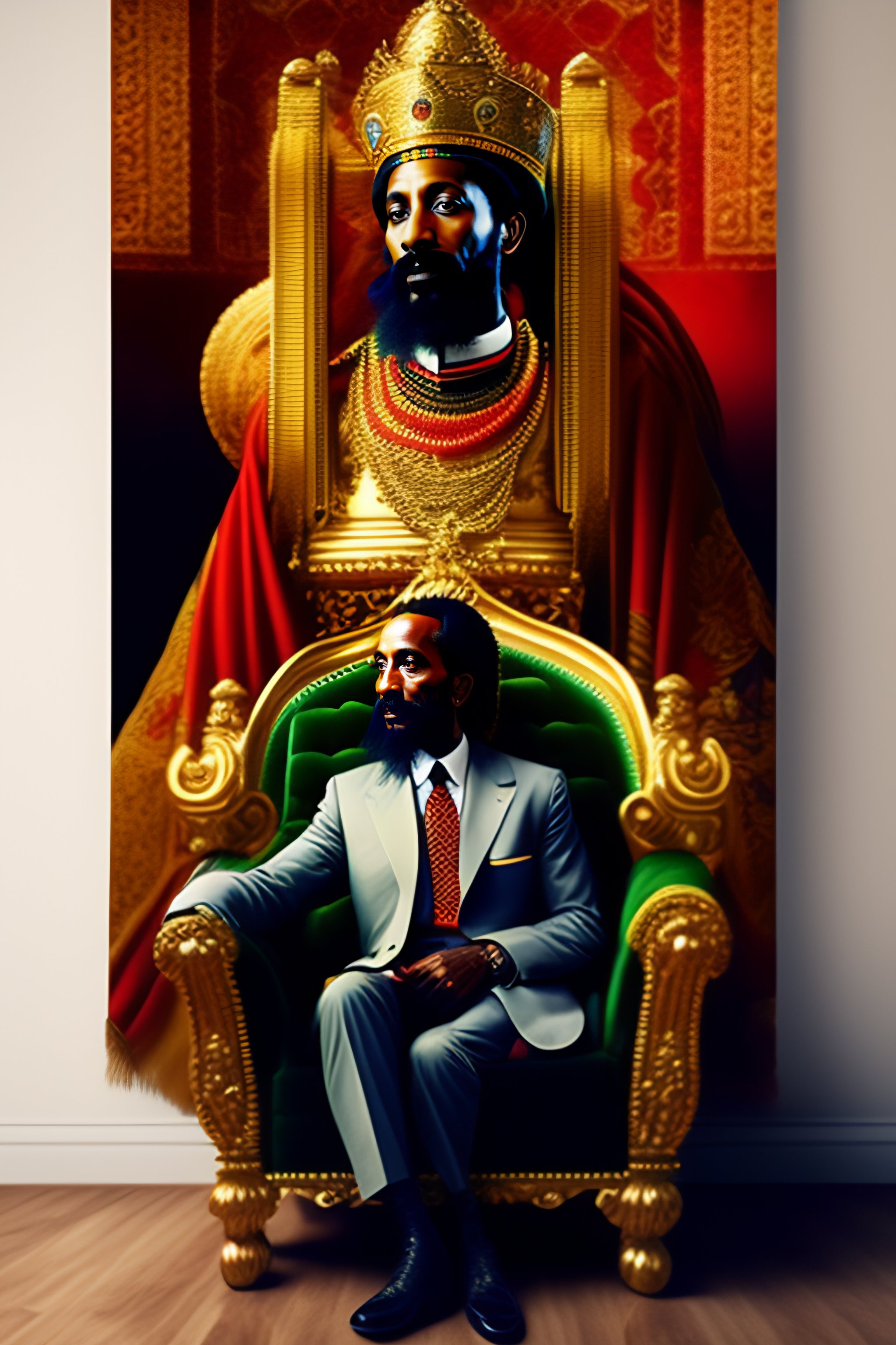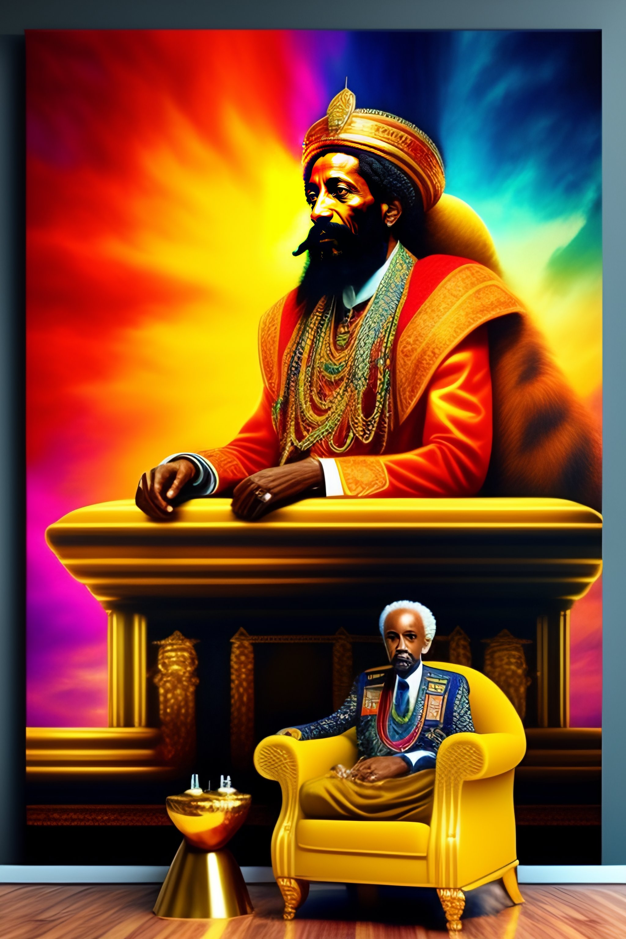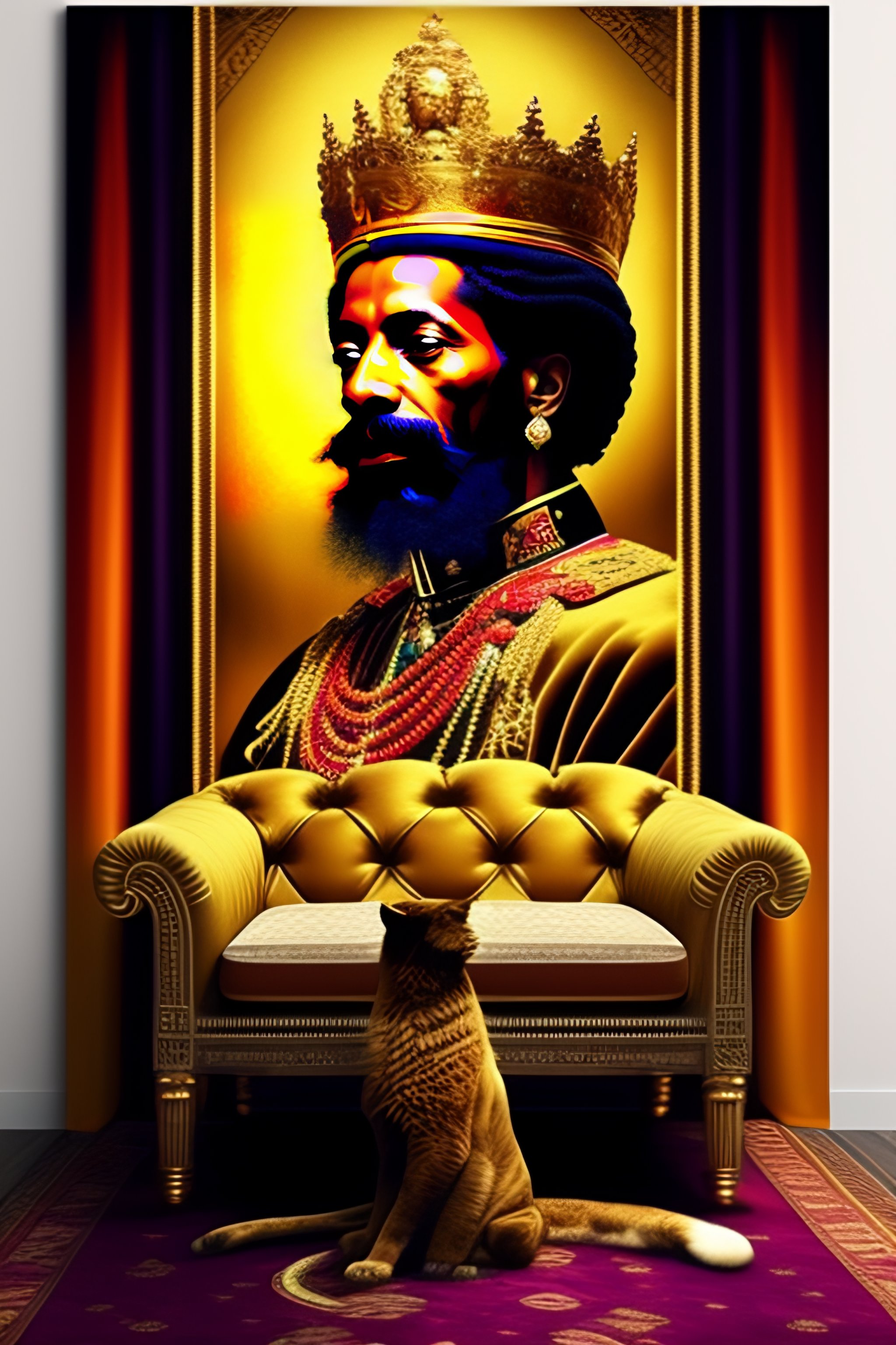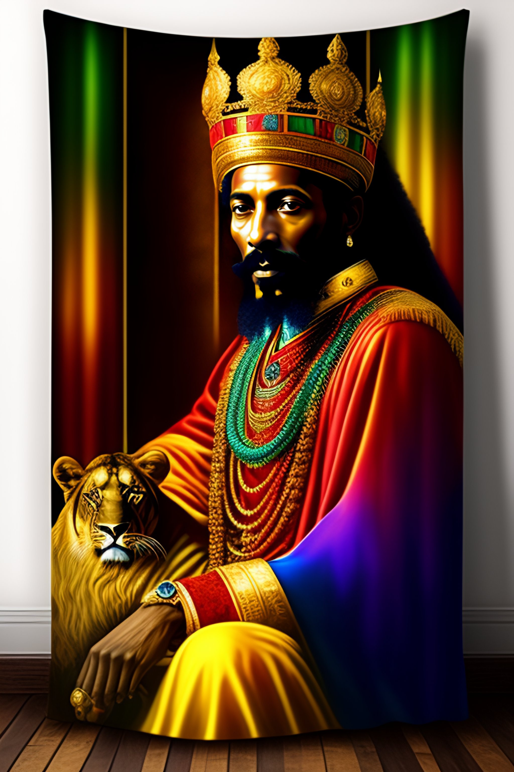 Haile selassie sitting on golden throne, petting a lion, realistic, vibrant, colorful, textiles hanging on the wall