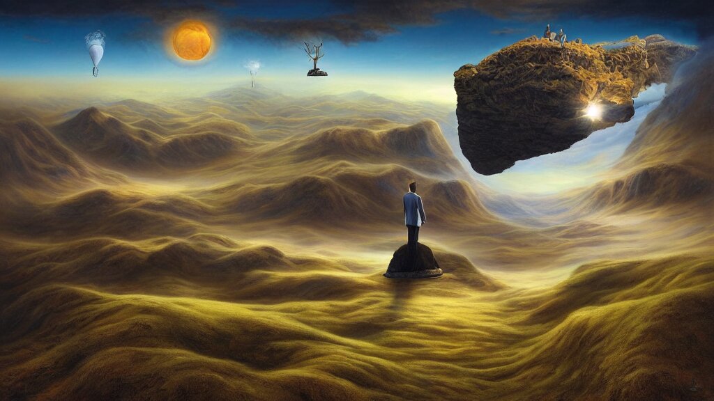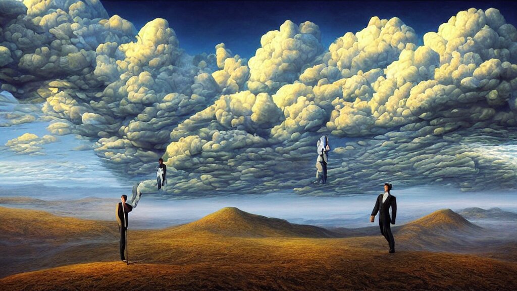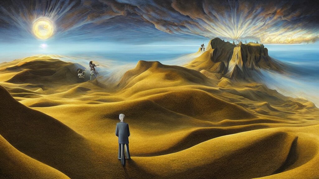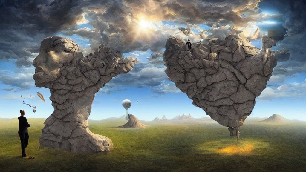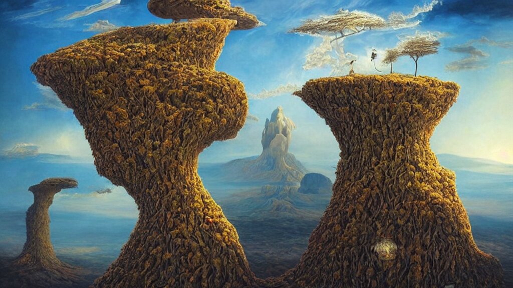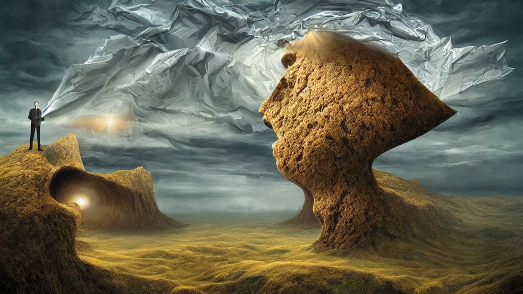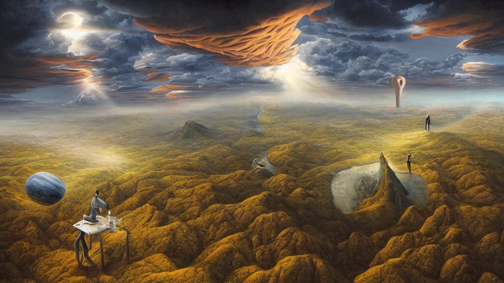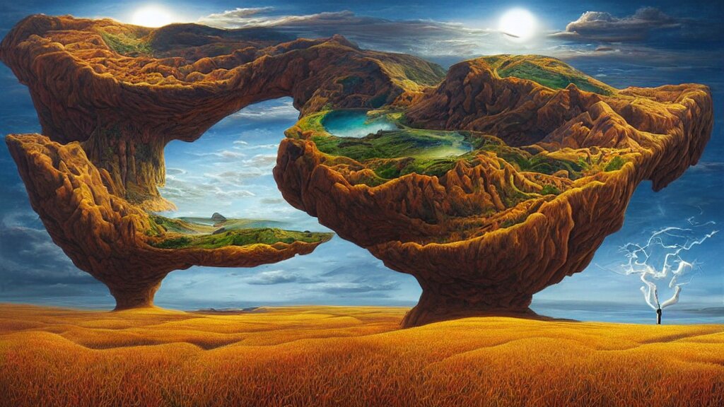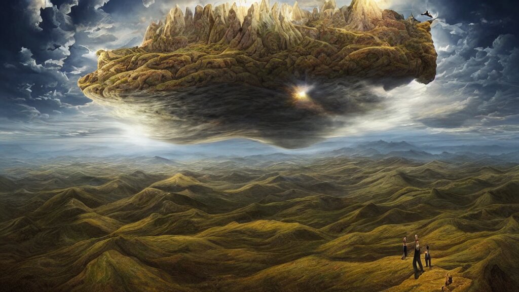 Surreal landscape with anthropomorphic!!! terrain!!! in the styles of igor morski, jim warren, and rob gonsalves, intricate, hyperrealistic, volumetric lighting, big sky, distinct horizon